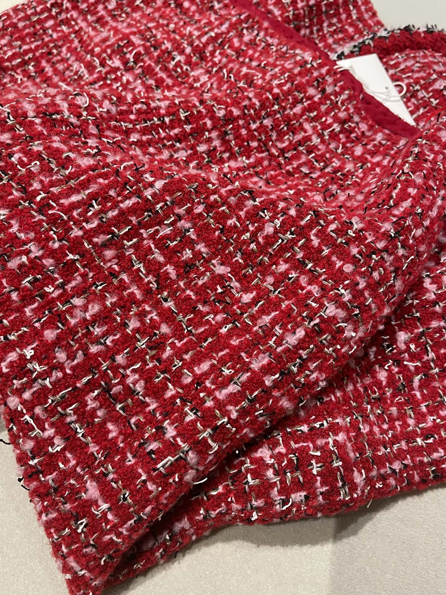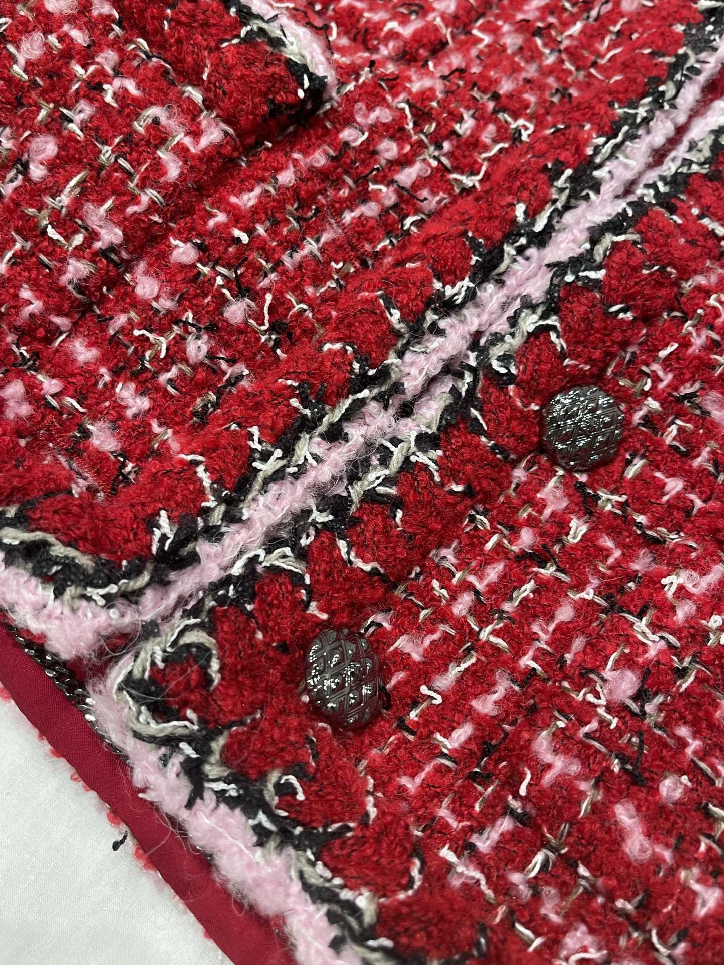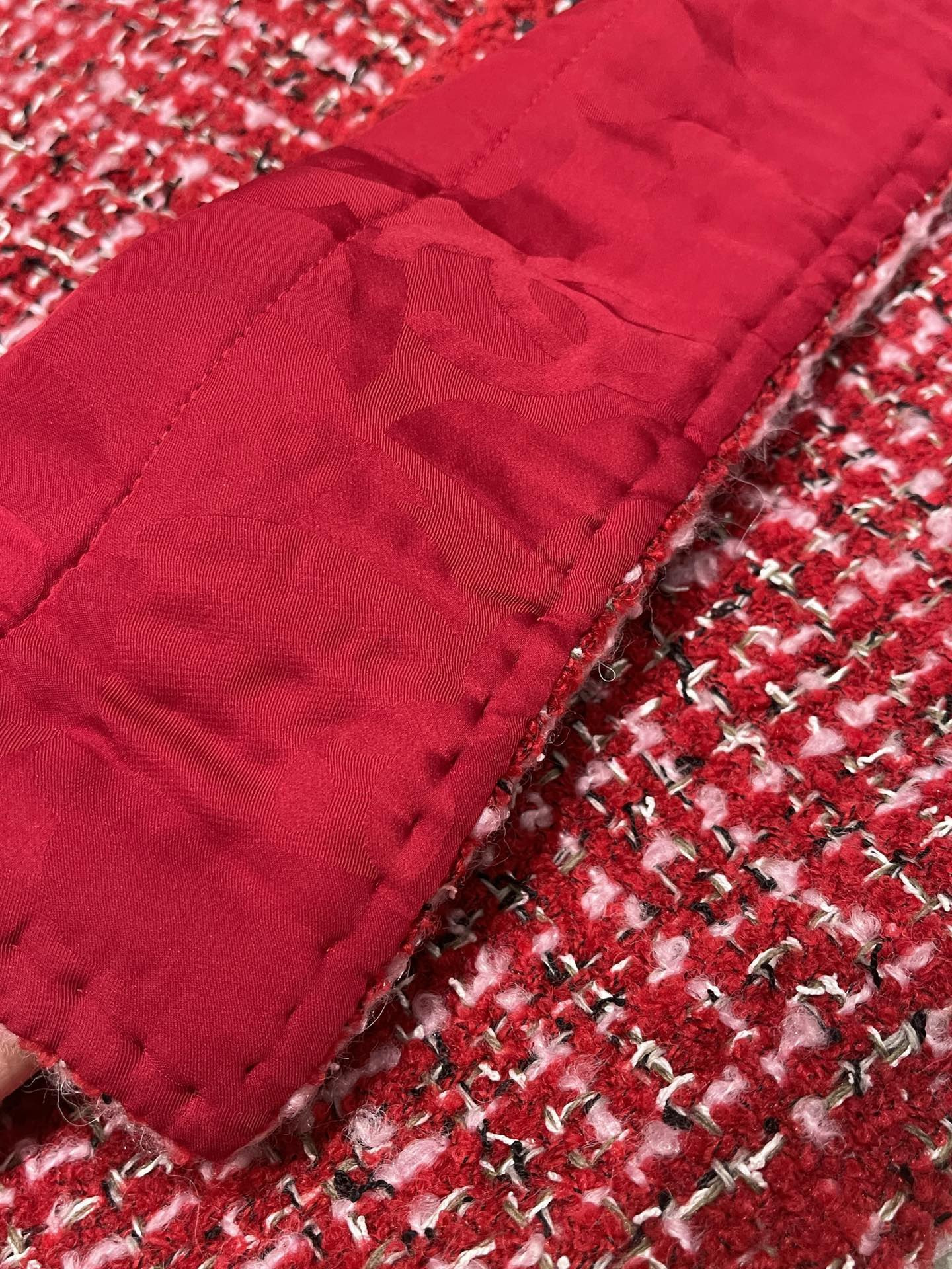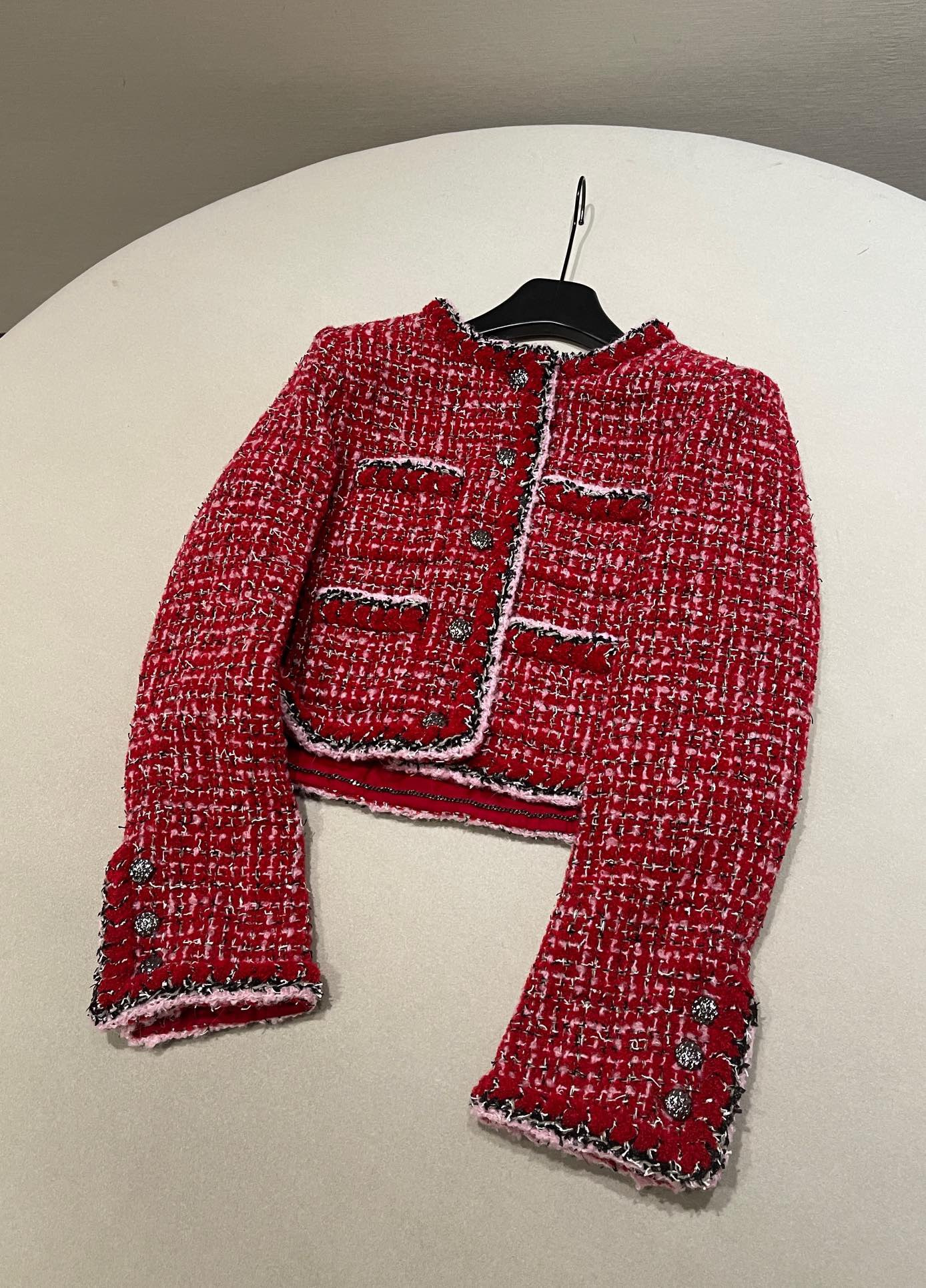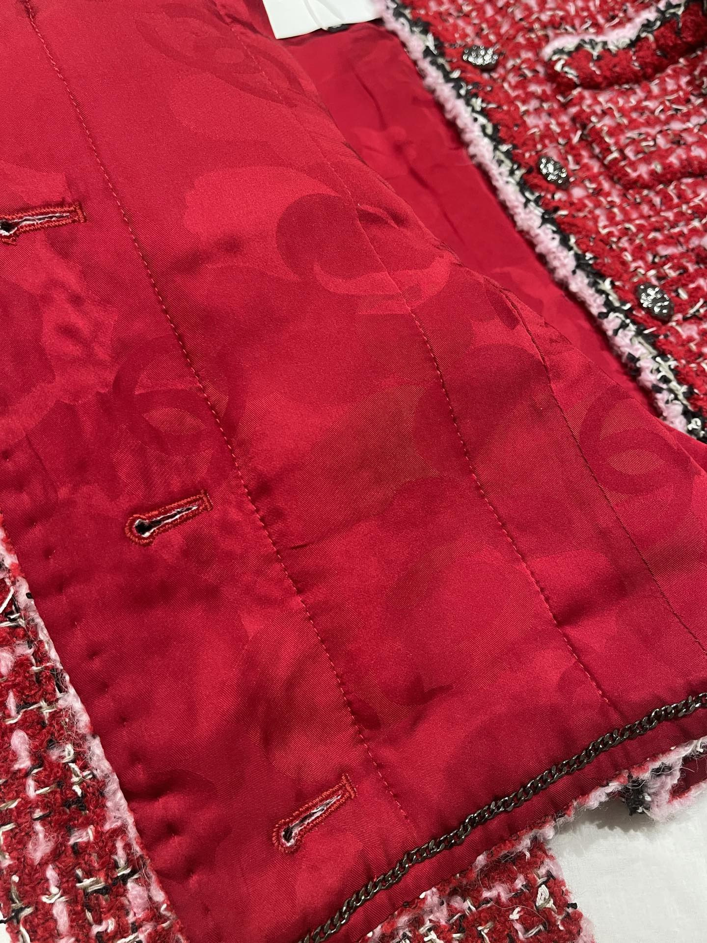 This Chanel clothing showcases the brand's exceptional craftsmanship and attention to detail. Crafted from premium tweed, in a stunning red colorway, this piece combines timeless luxury with modern style.