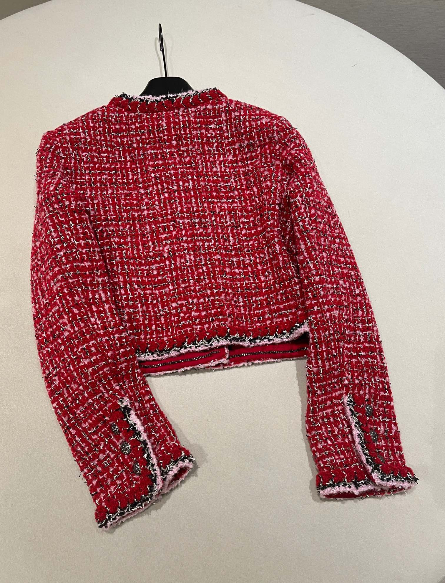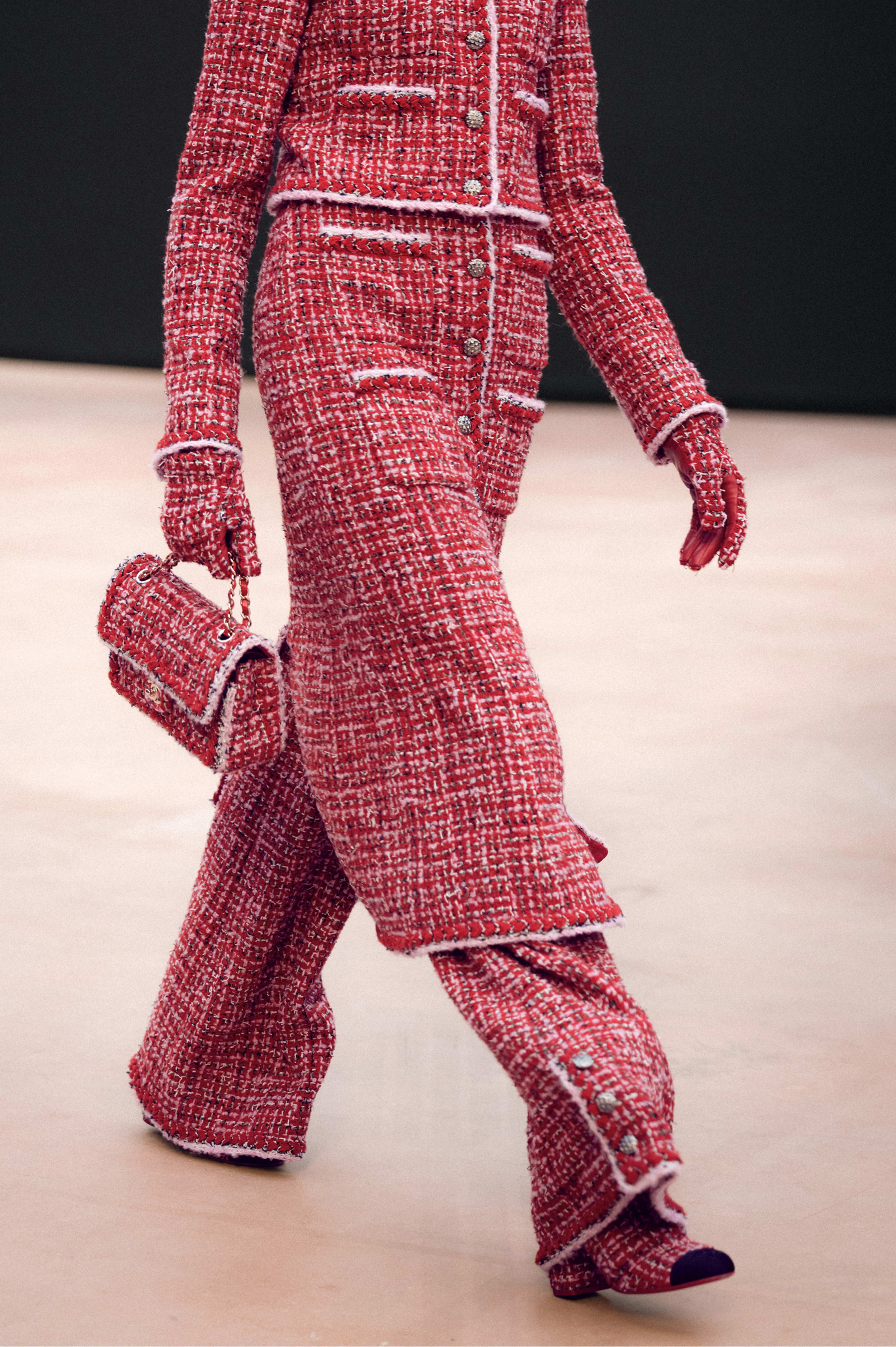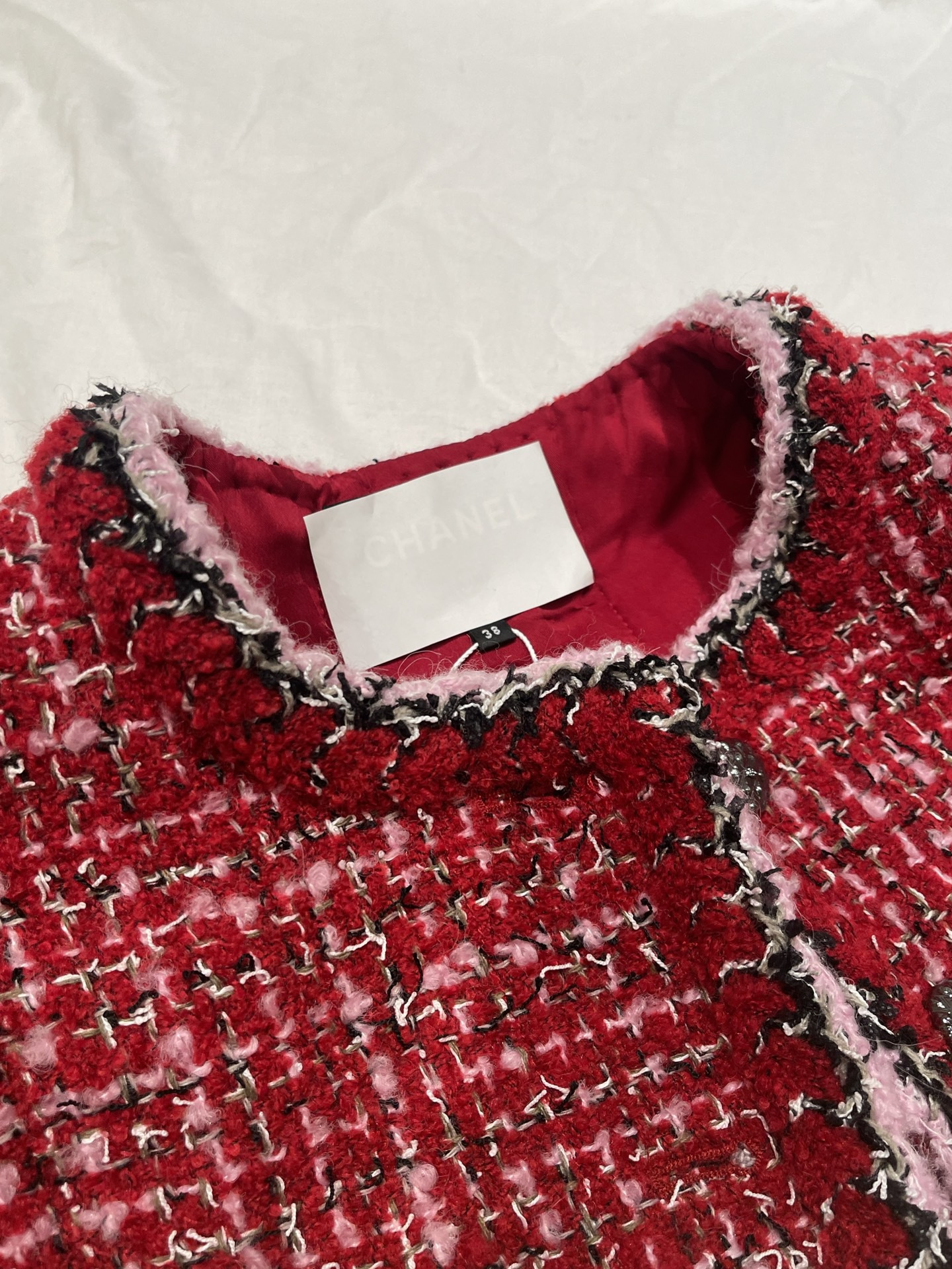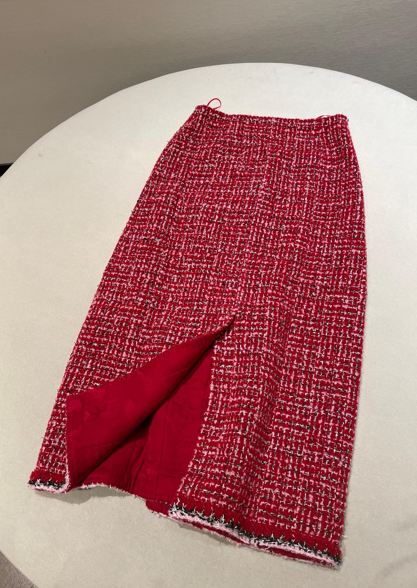 This Chanel clothing showcases the brand's exceptional craftsmanship and attention to detail. Crafted from premium tweed, in a stunning red colorway, this piece combines timeless luxury with modern style.