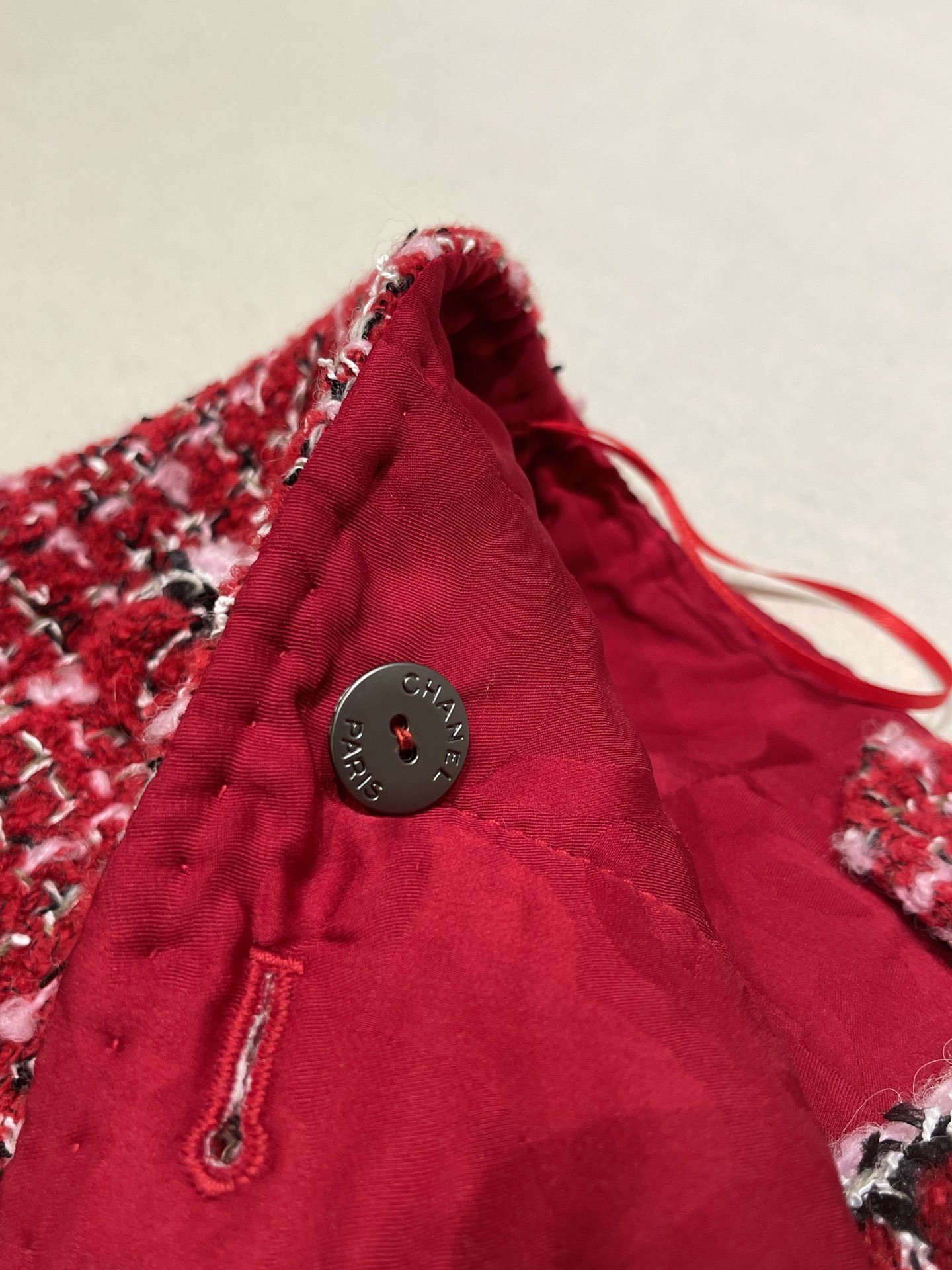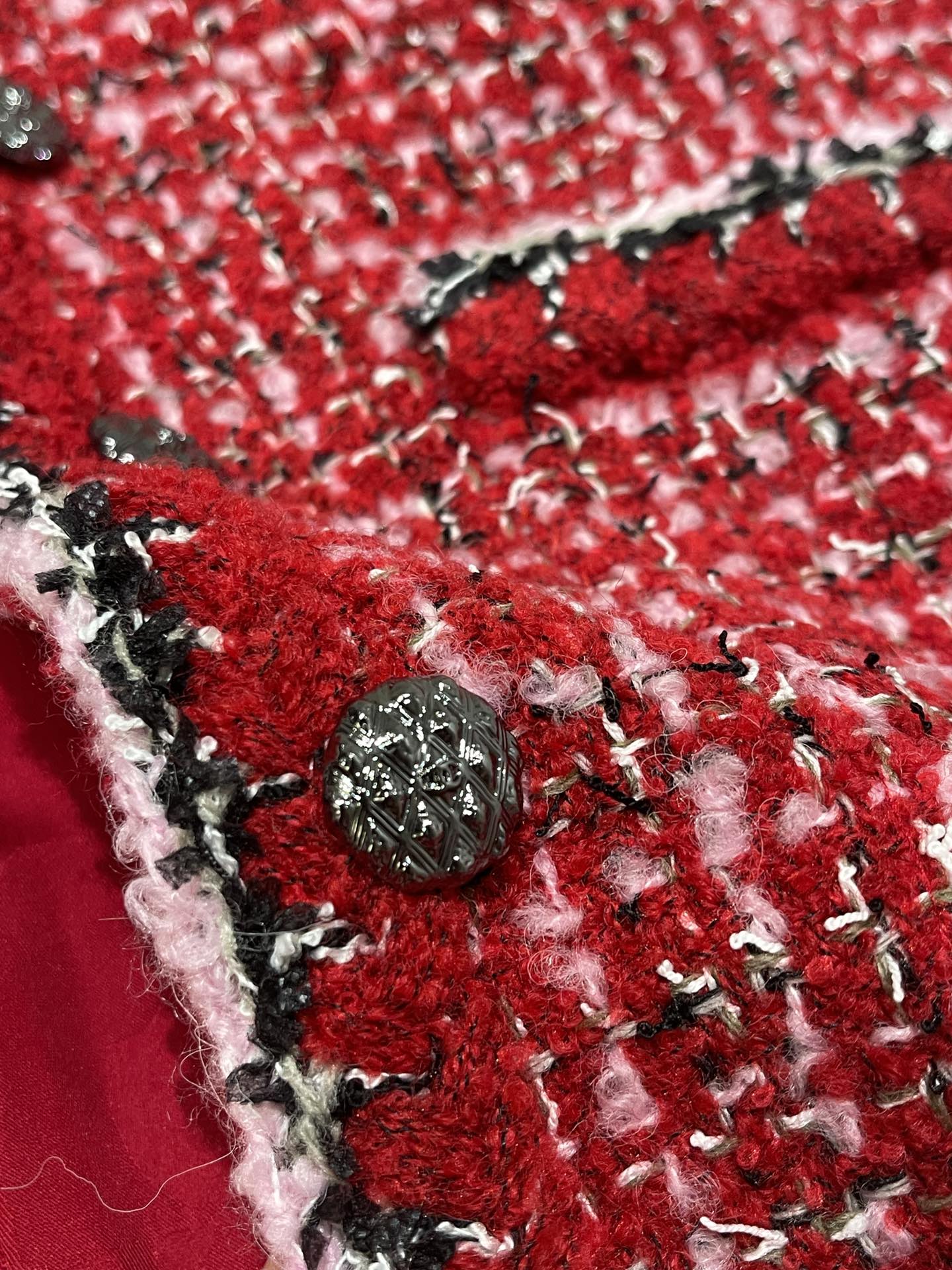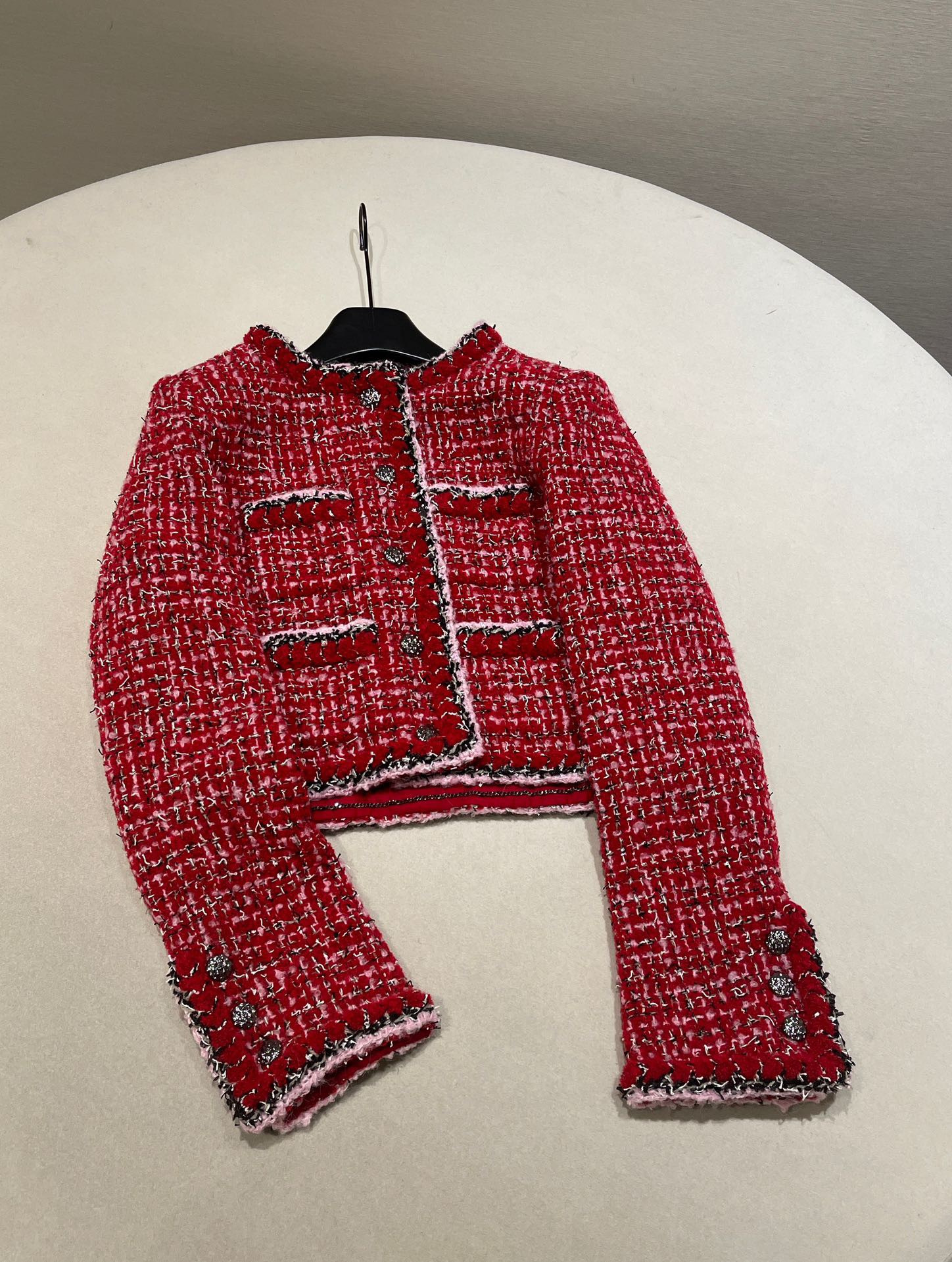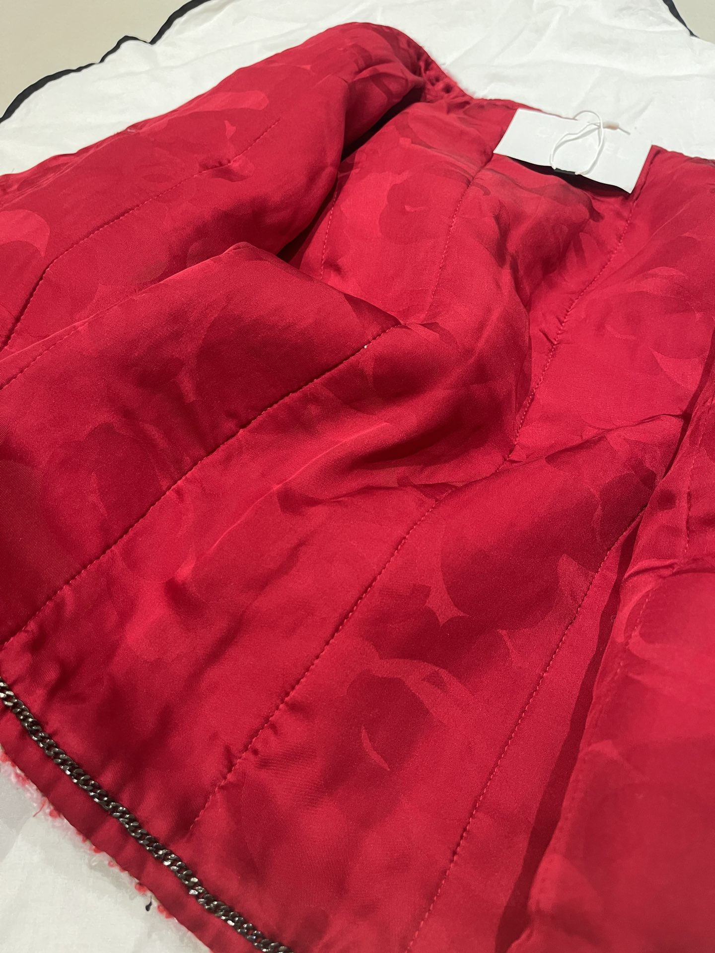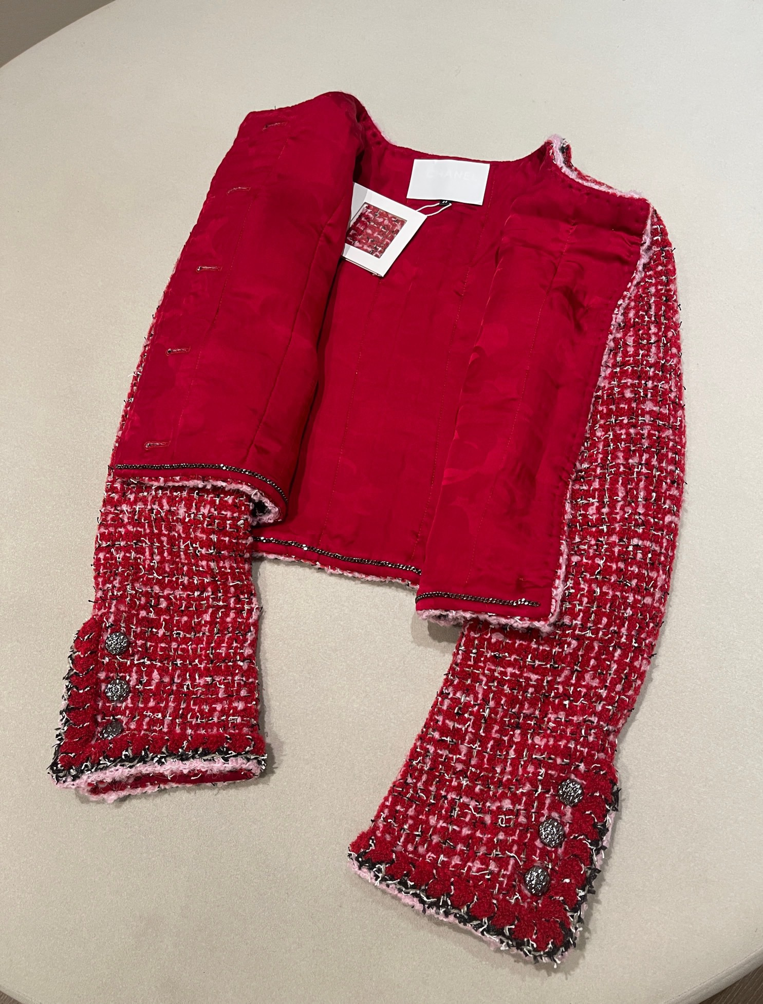 This Chanel clothing showcases the brand's exceptional craftsmanship and attention to detail. Crafted from premium tweed, in a stunning red colorway, this piece combines timeless luxury with modern style.