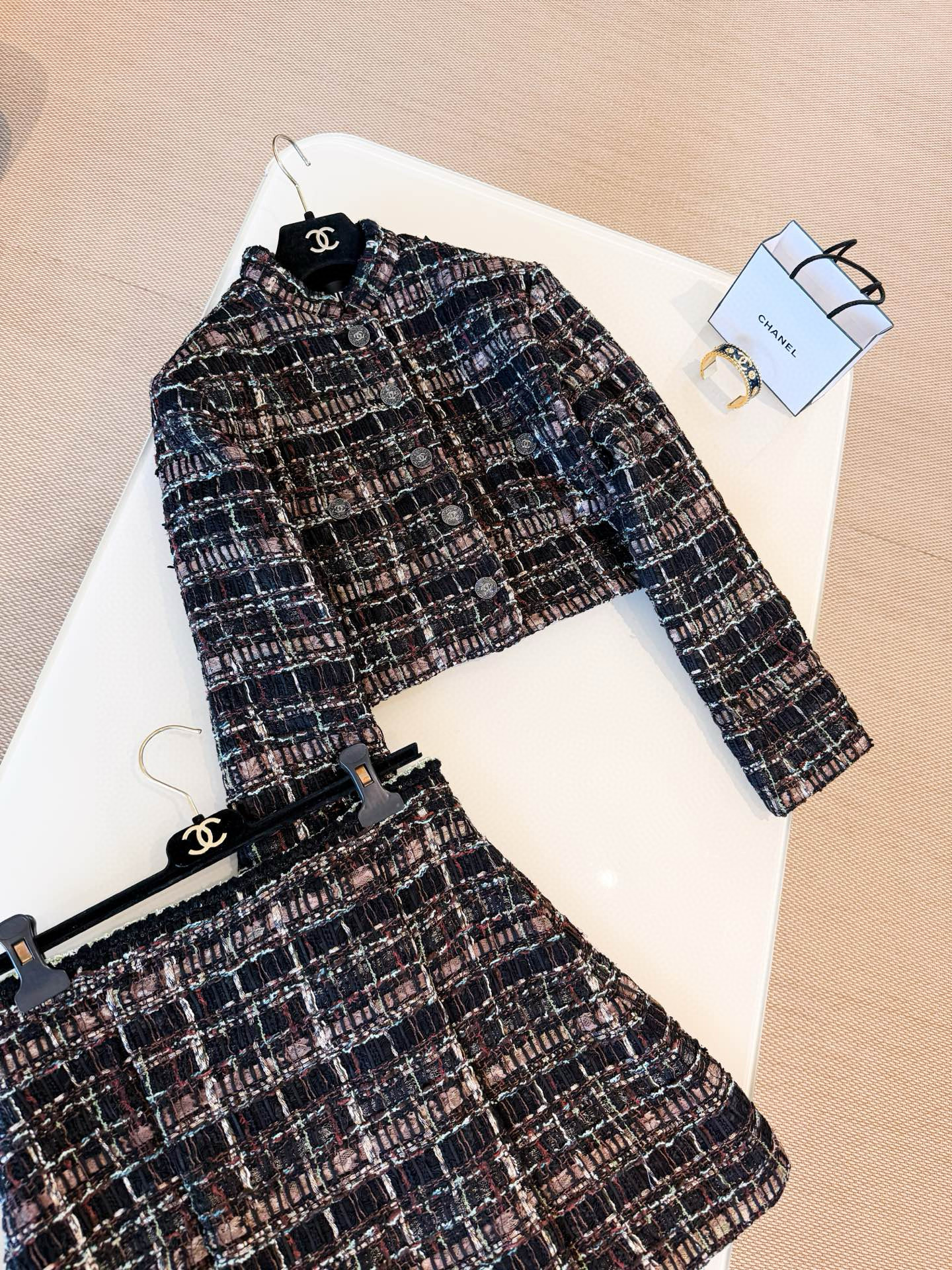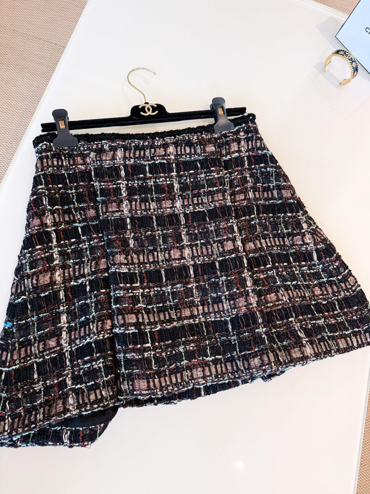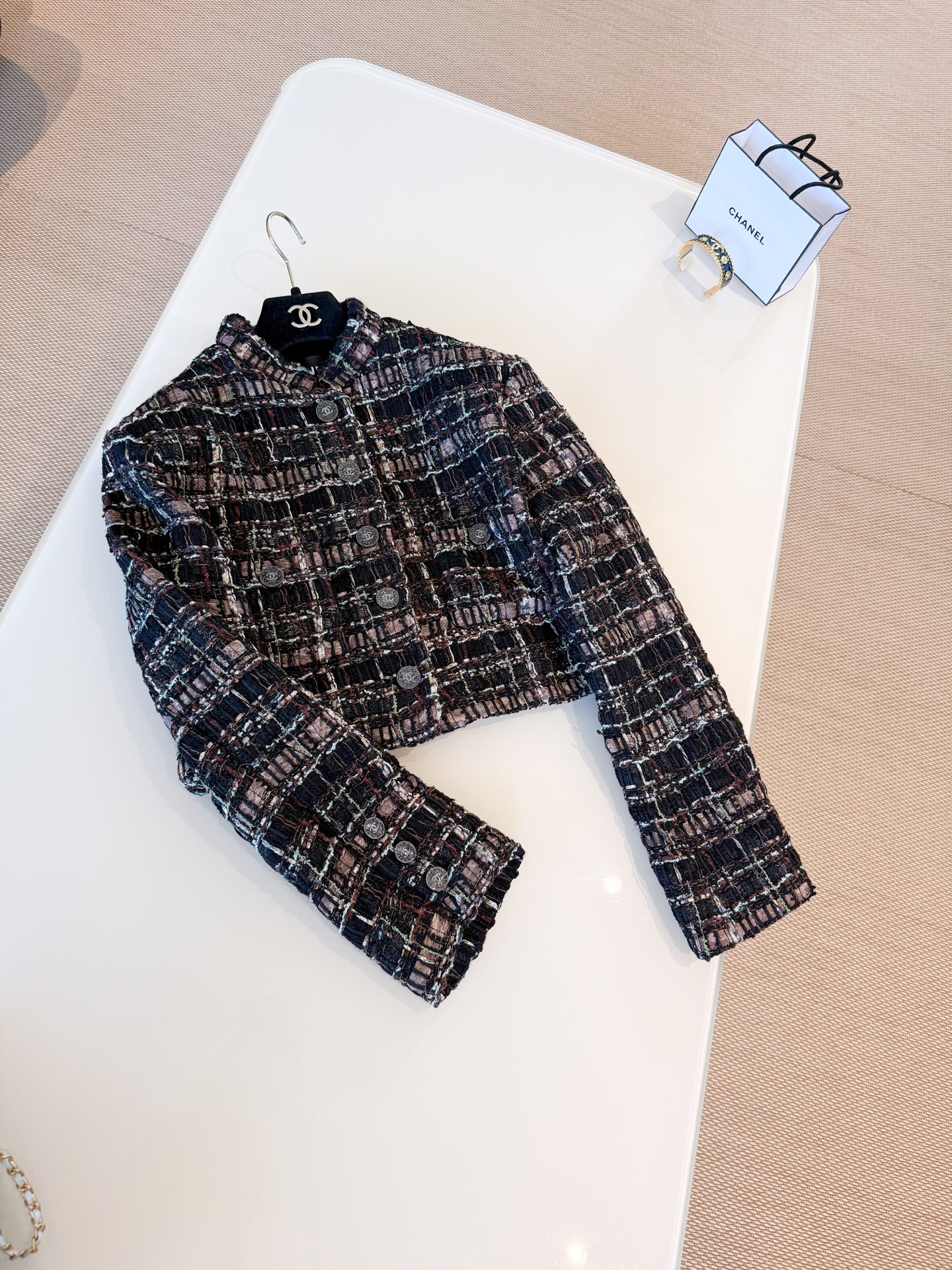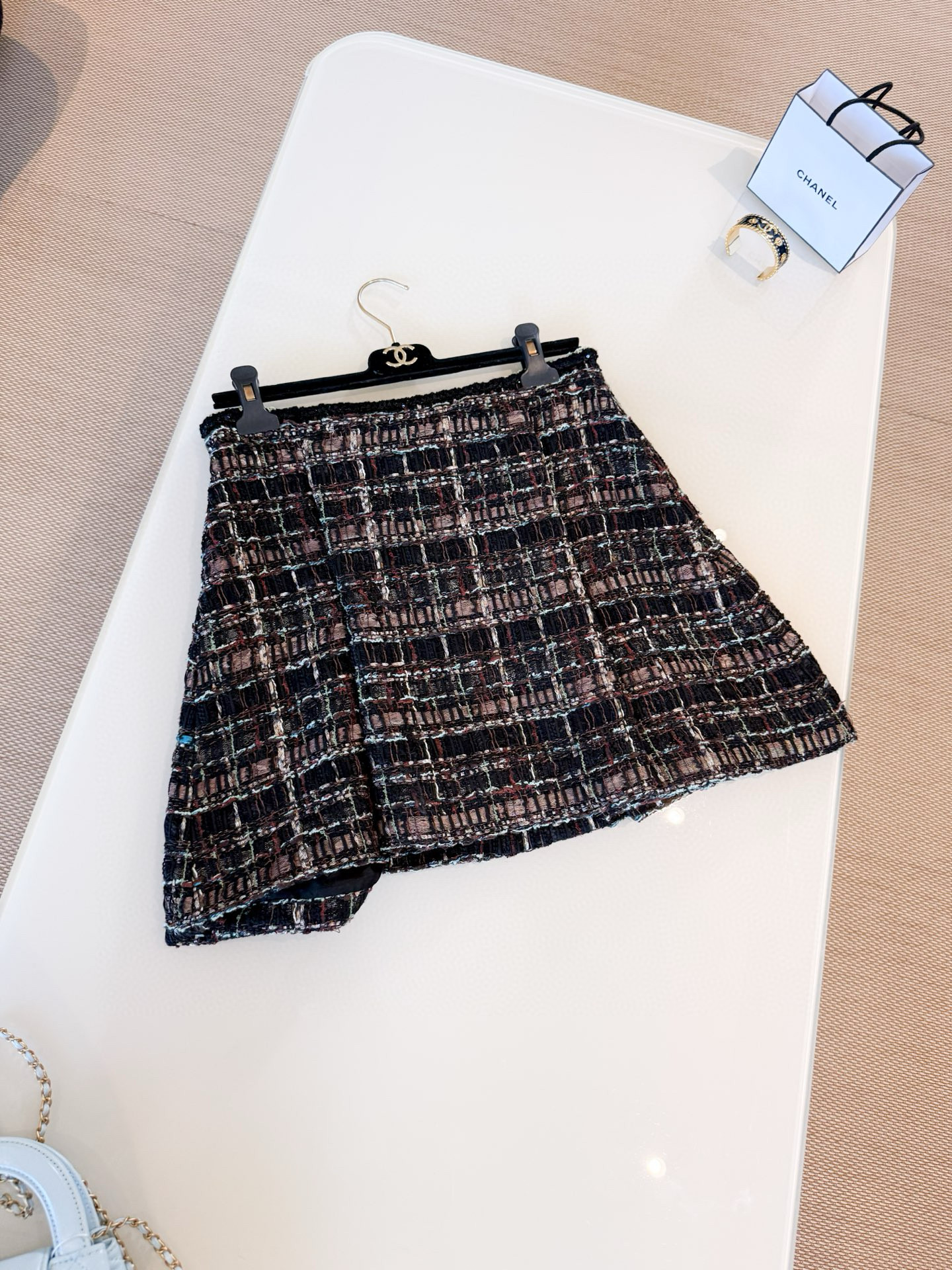 This Chanel jewelry showcases the brand's exceptional craftsmanship and attention to detail. Crafted from premium tweed, in a stunning tan colorway, this piece combines timeless luxury with modern style.