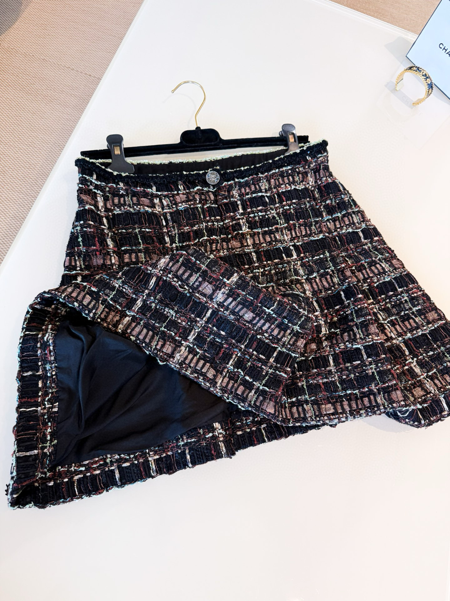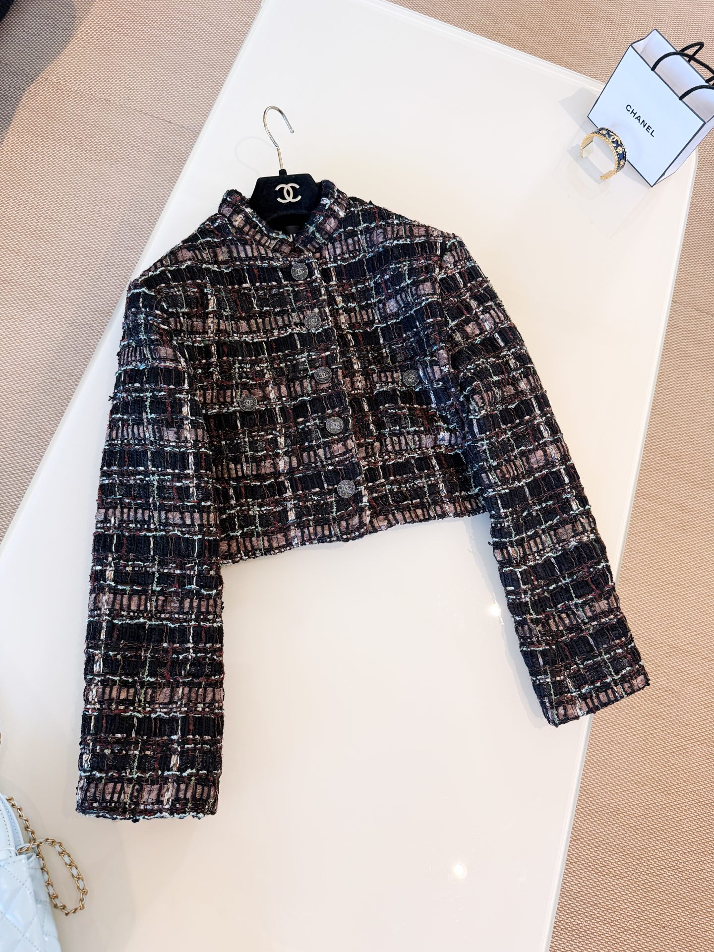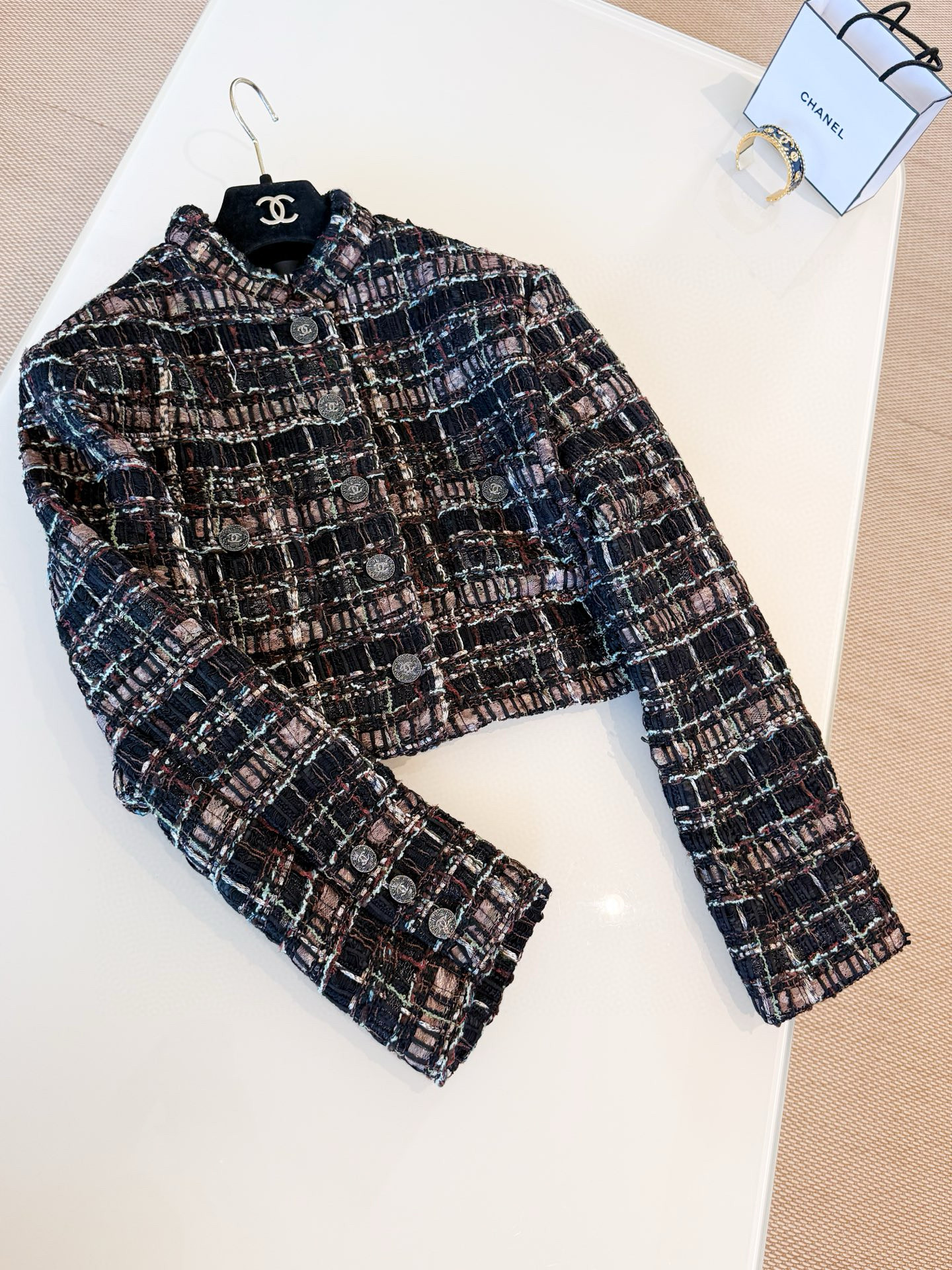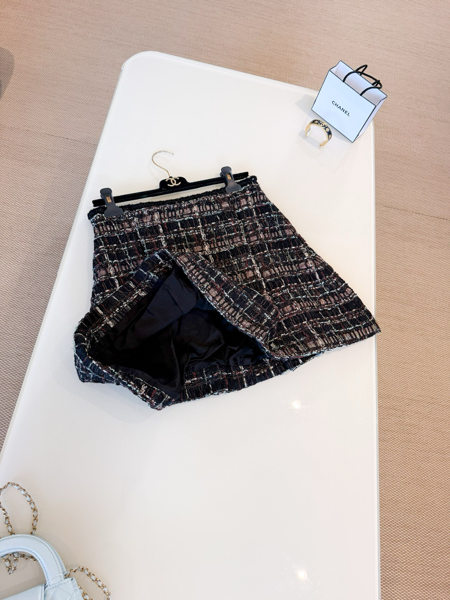 This Chanel jewelry showcases the brand's exceptional craftsmanship and attention to detail. Crafted from premium tweed, in a stunning tan colorway, this piece combines timeless luxury with modern style.