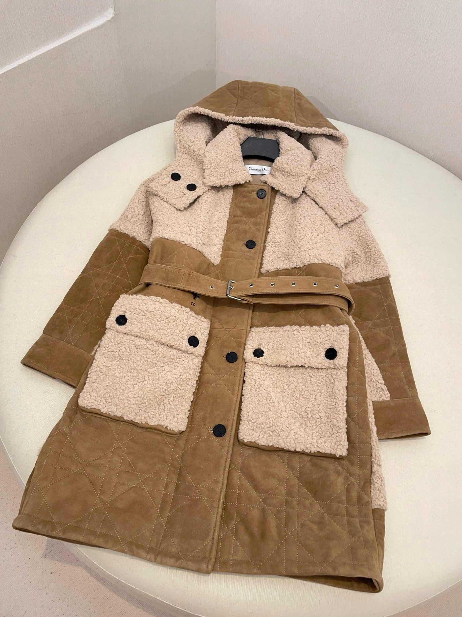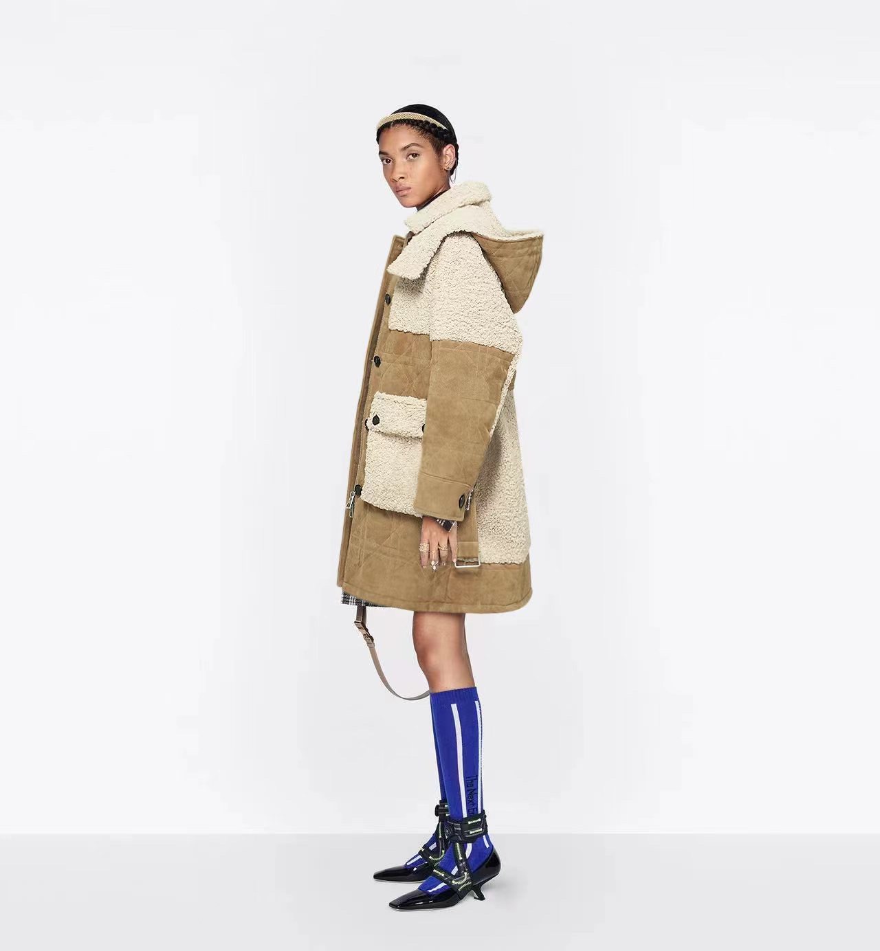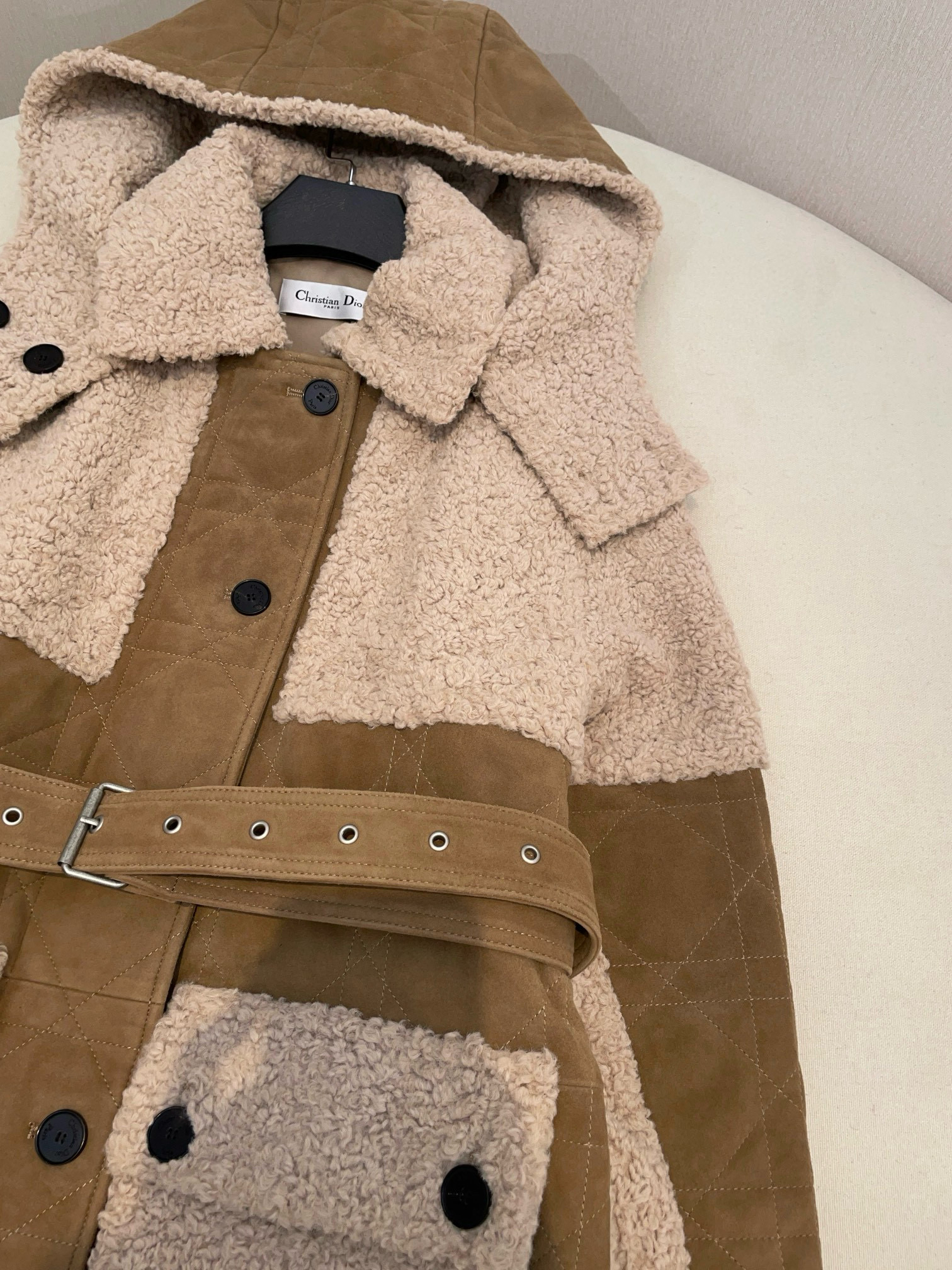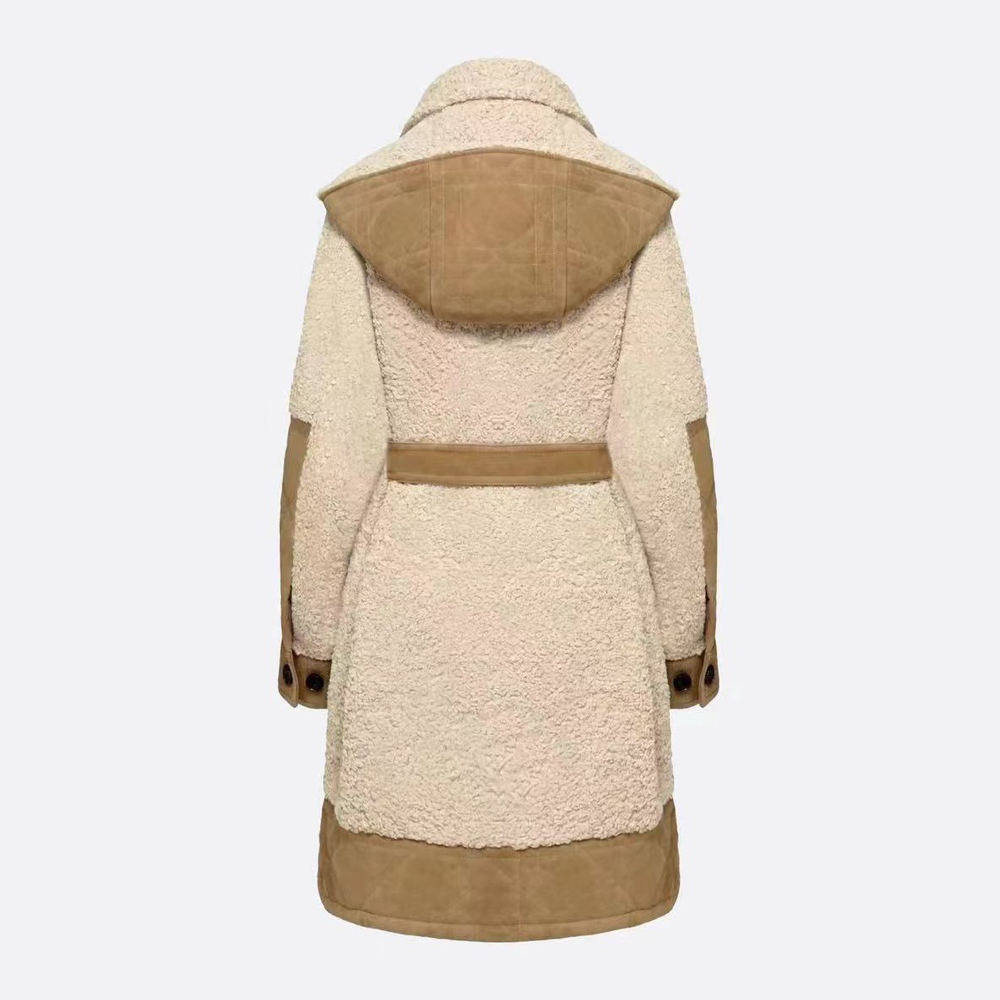 NIGO Dior Women's Autumn and Winter Colorblocking Lamb's Wool Patchwork Suede Long Drawstring Single-Breasted Hooded Coat Jacket #nigo74847