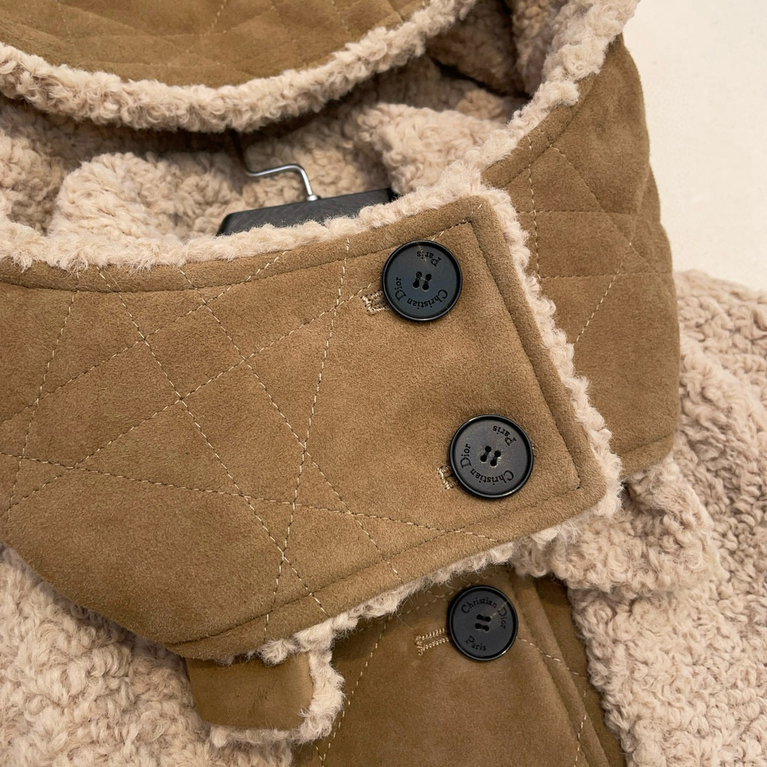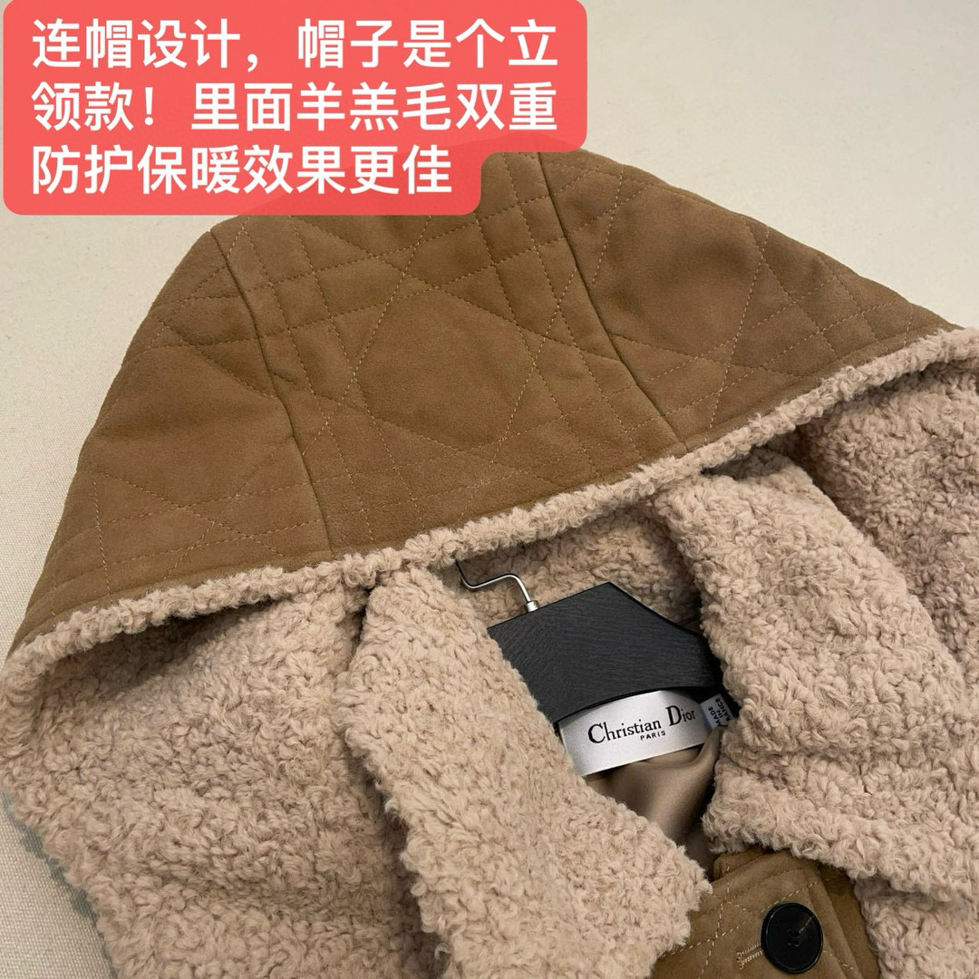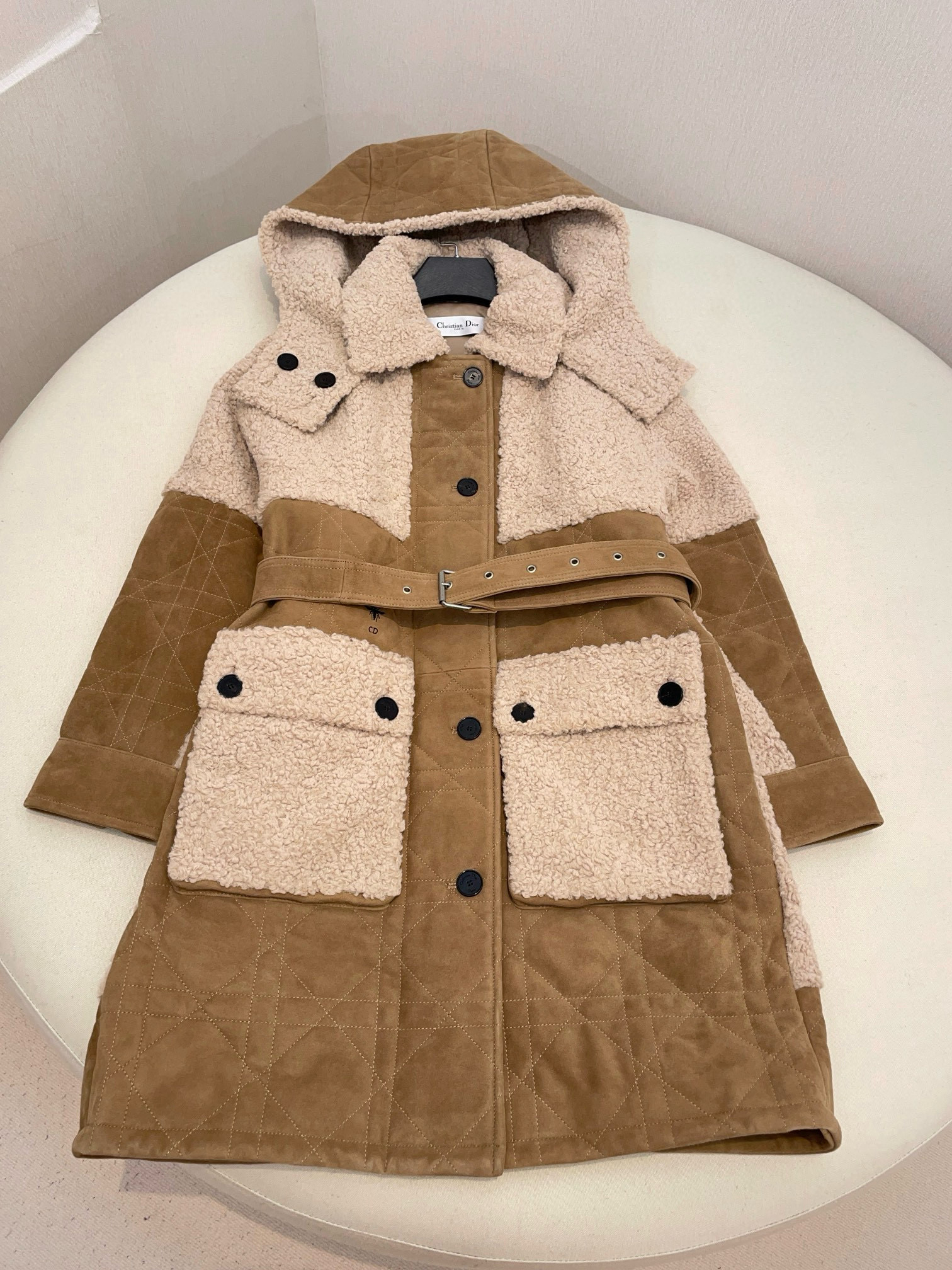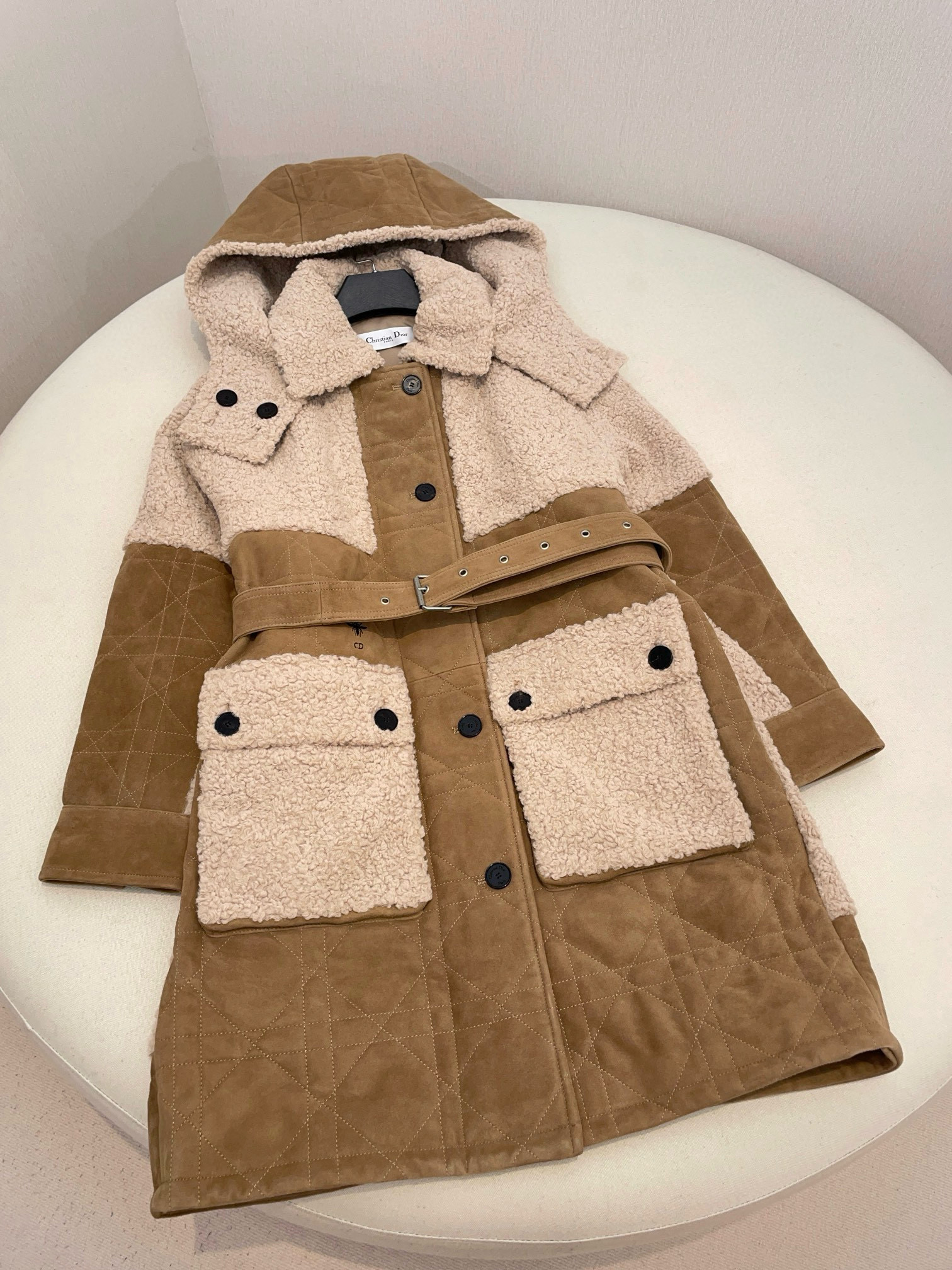 NIGO Dior Women's Autumn and Winter Colorblocking Lamb's Wool Patchwork Suede Long Drawstring Single-Breasted Hooded Coat Jacket #nigo74847