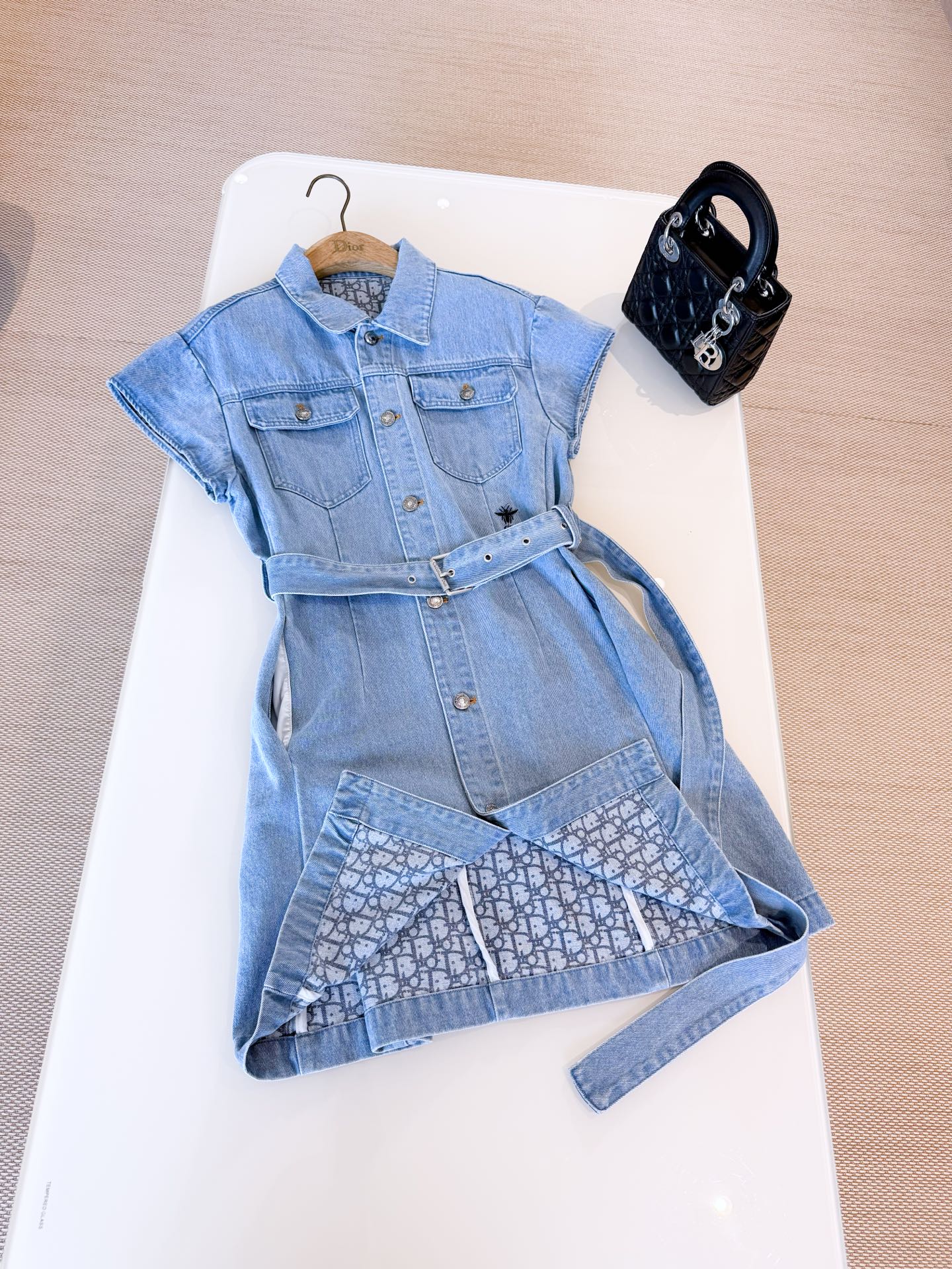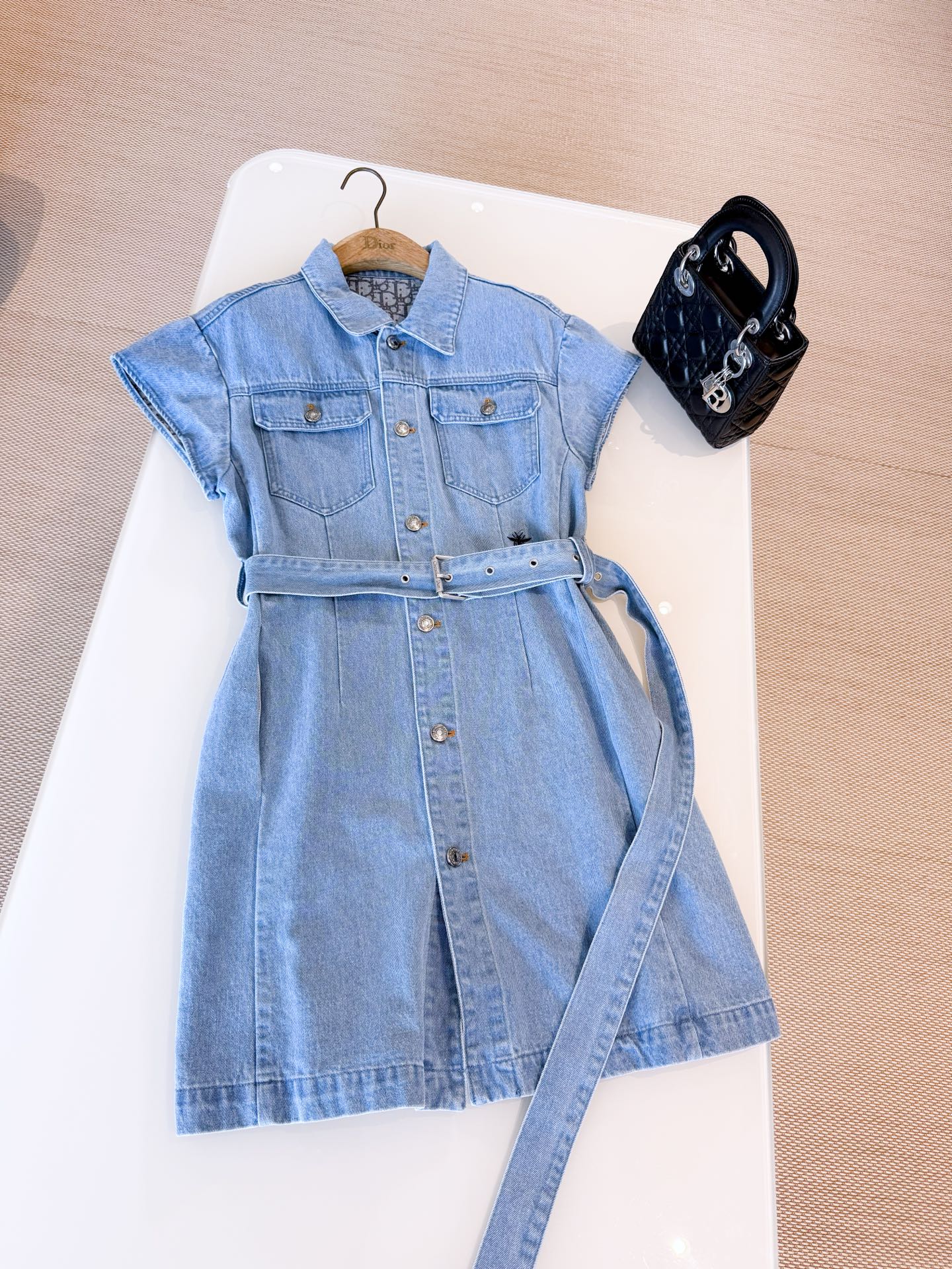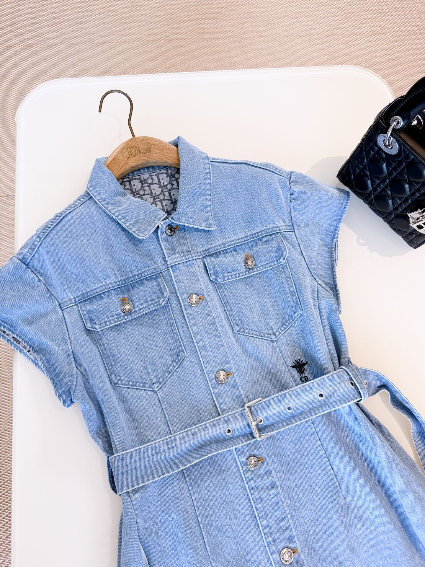 NIGO Dior Women's Summer High Street Denim Solid Color Belt Printed Pocket Button Cotton Short Sleeve Shirtdress Dresses #nigo77854