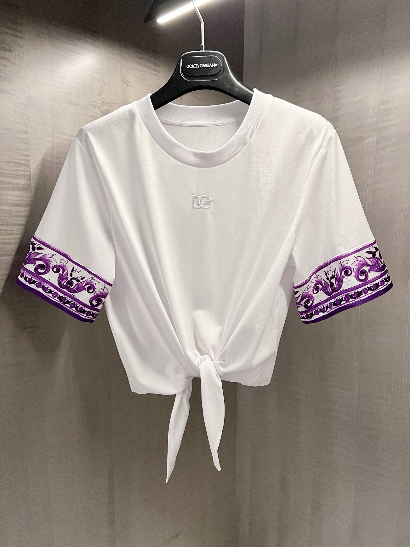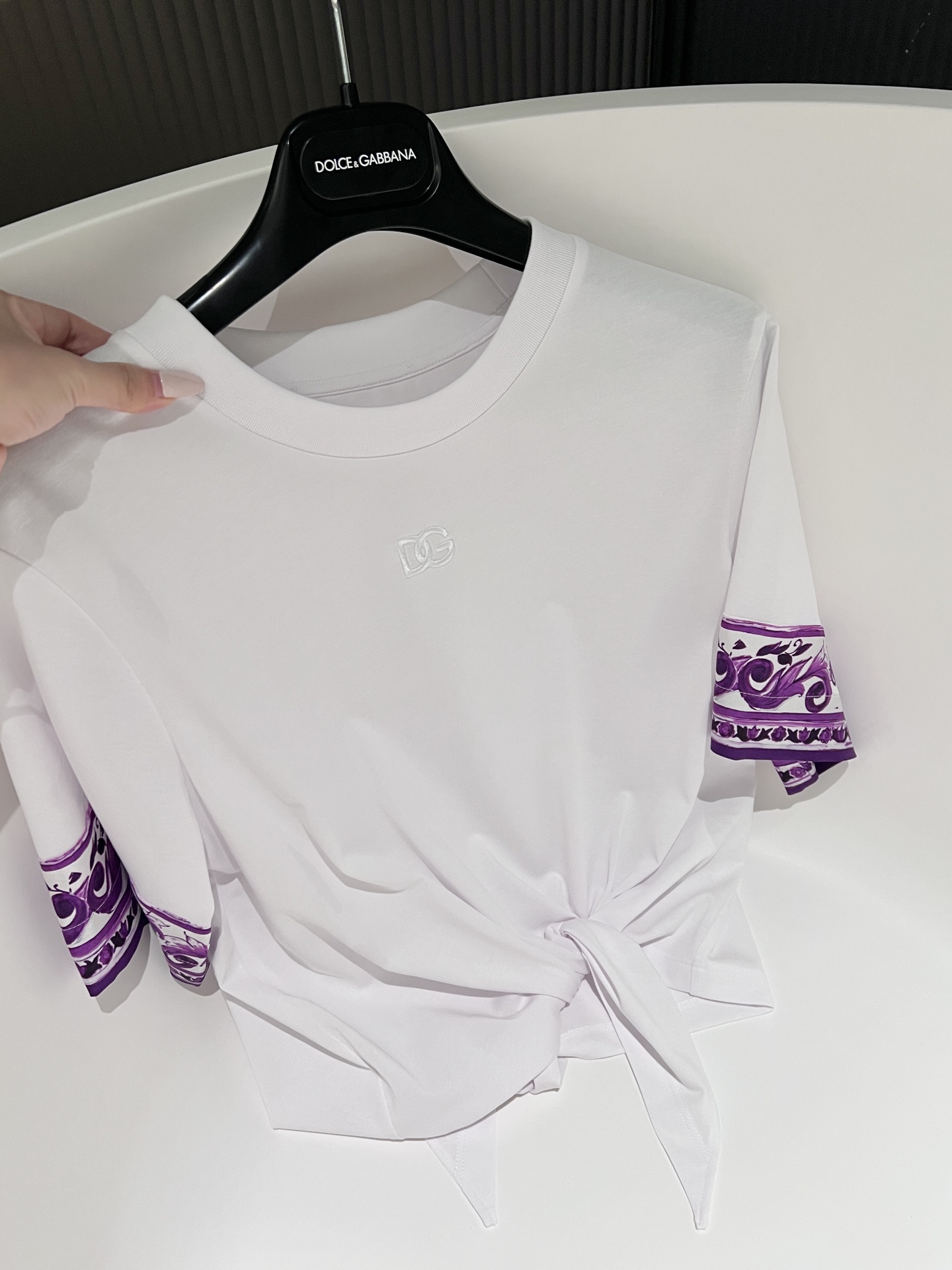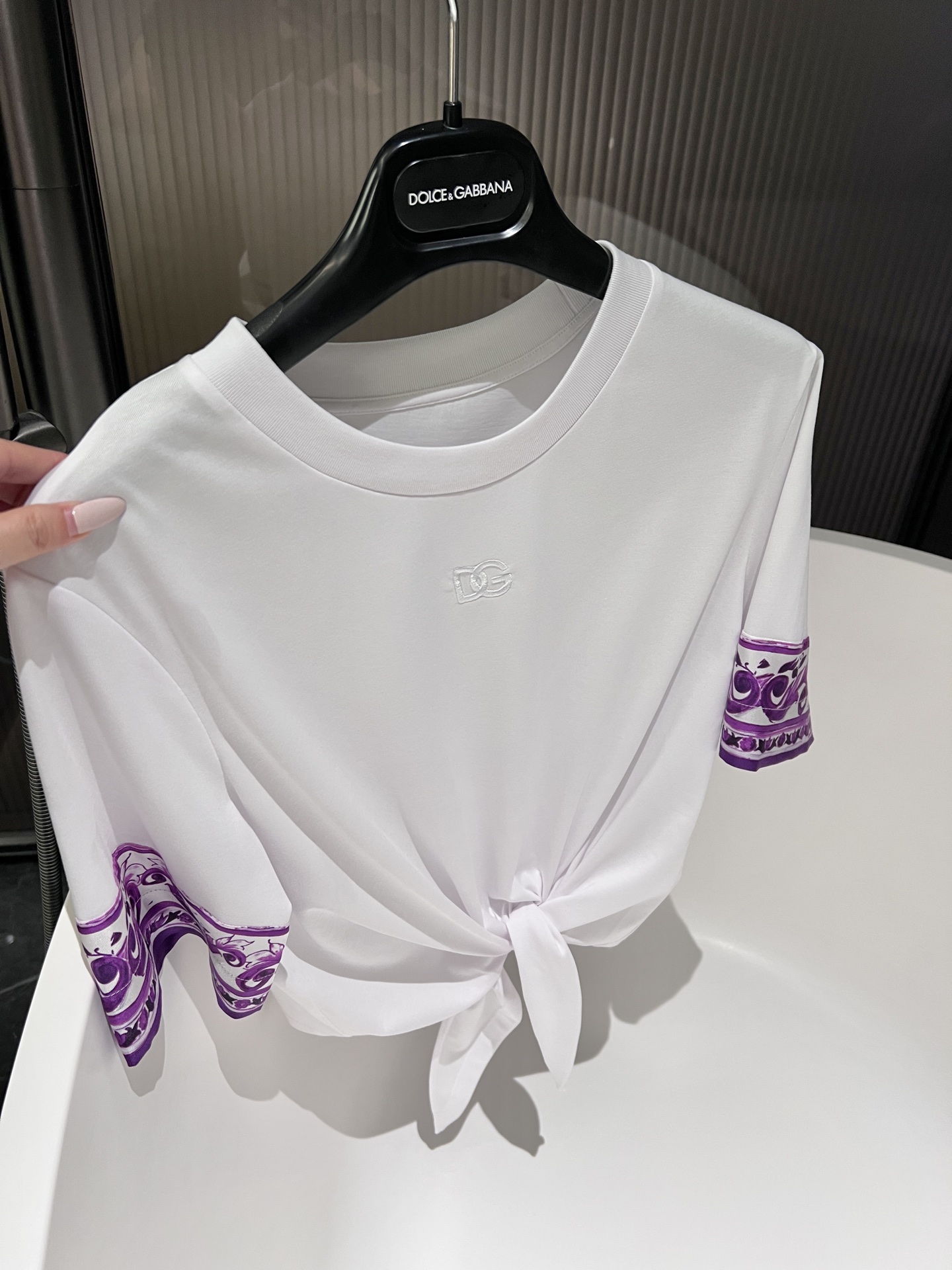 NIGO Dolce&Gabbana Women's Summer Logo Embroidered Tie-Front Round Neck Solid Color Silk Short Sleeve T-Shirt #nigo81493