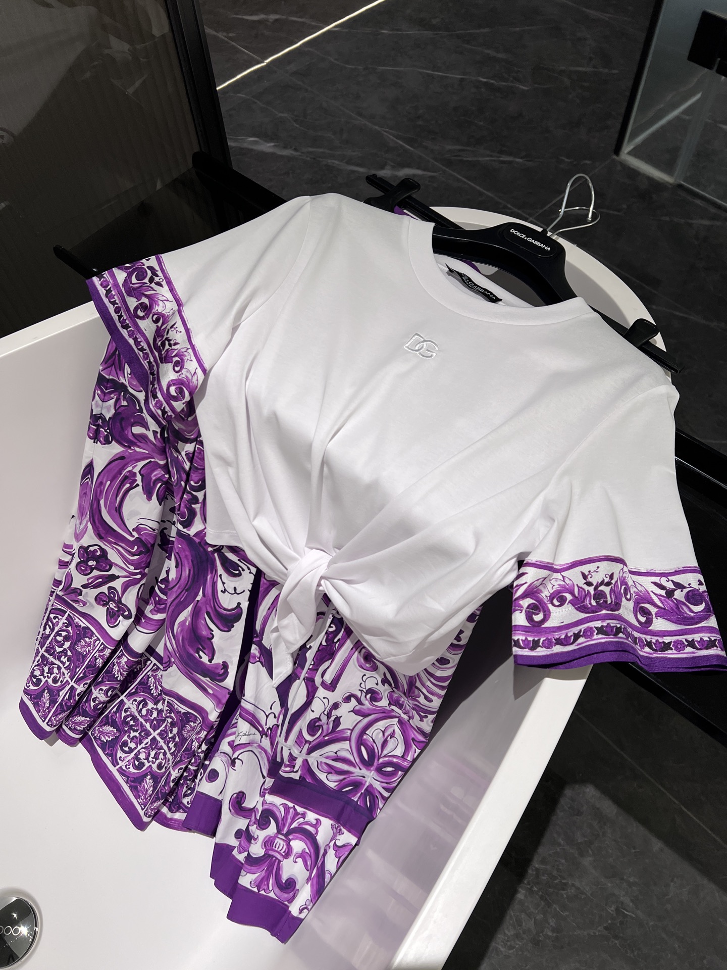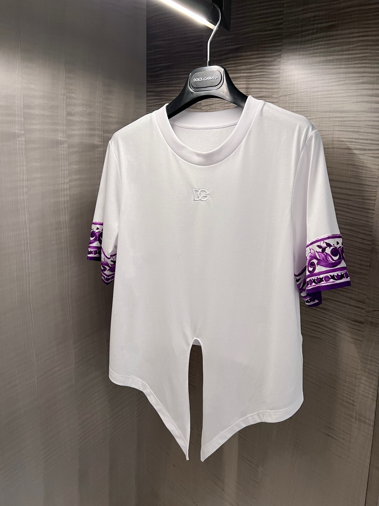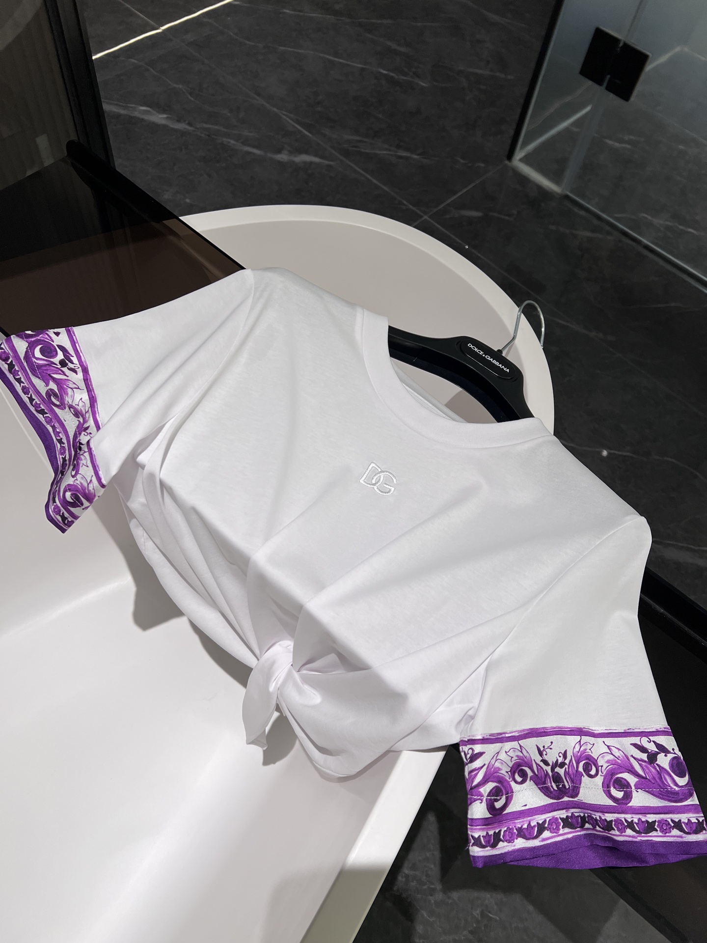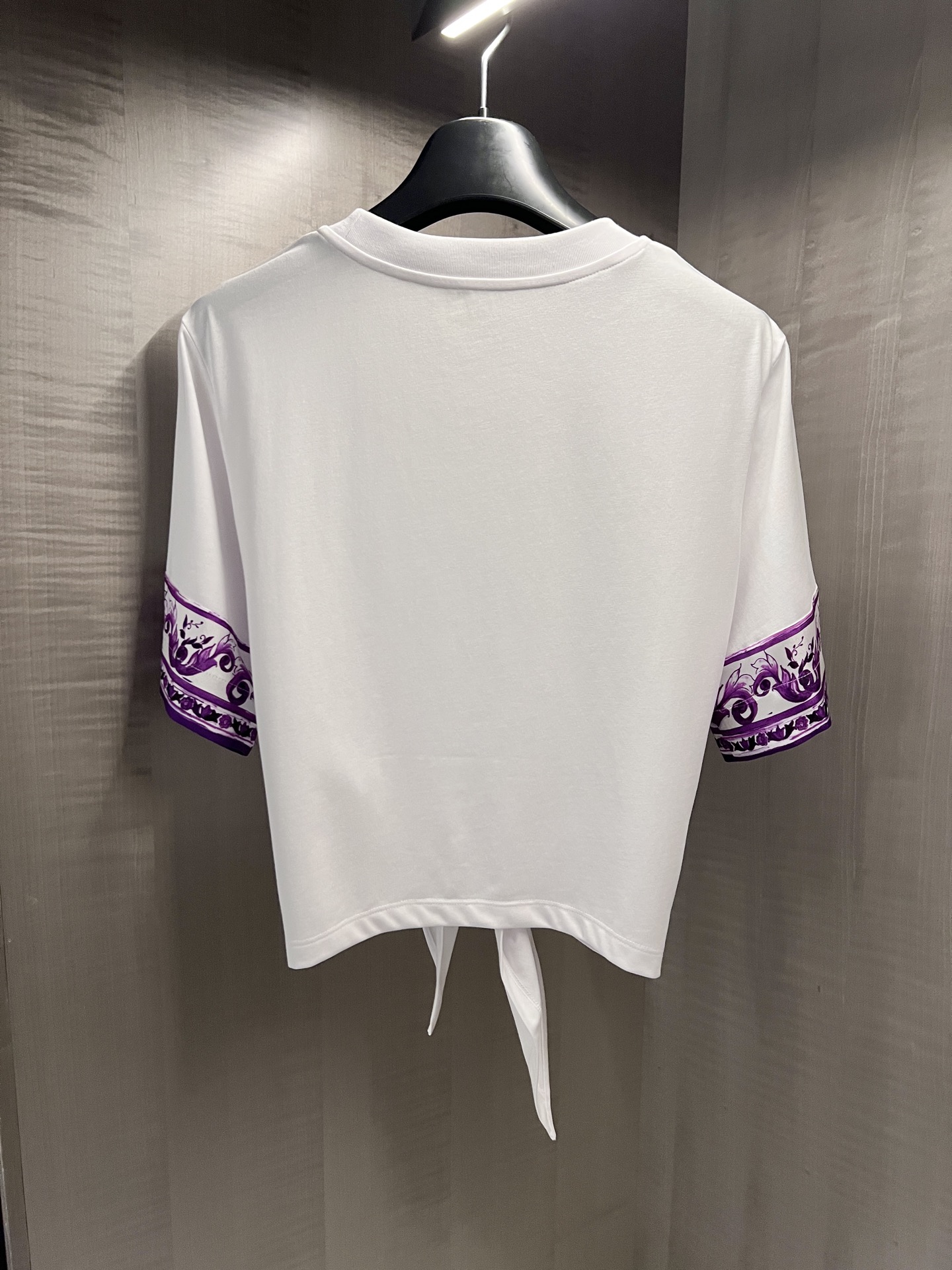 NIGO Dolce&Gabbana Women's Summer Logo Embroidered Tie-Front Round Neck Solid Color Silk Short Sleeve T-Shirt #nigo81493