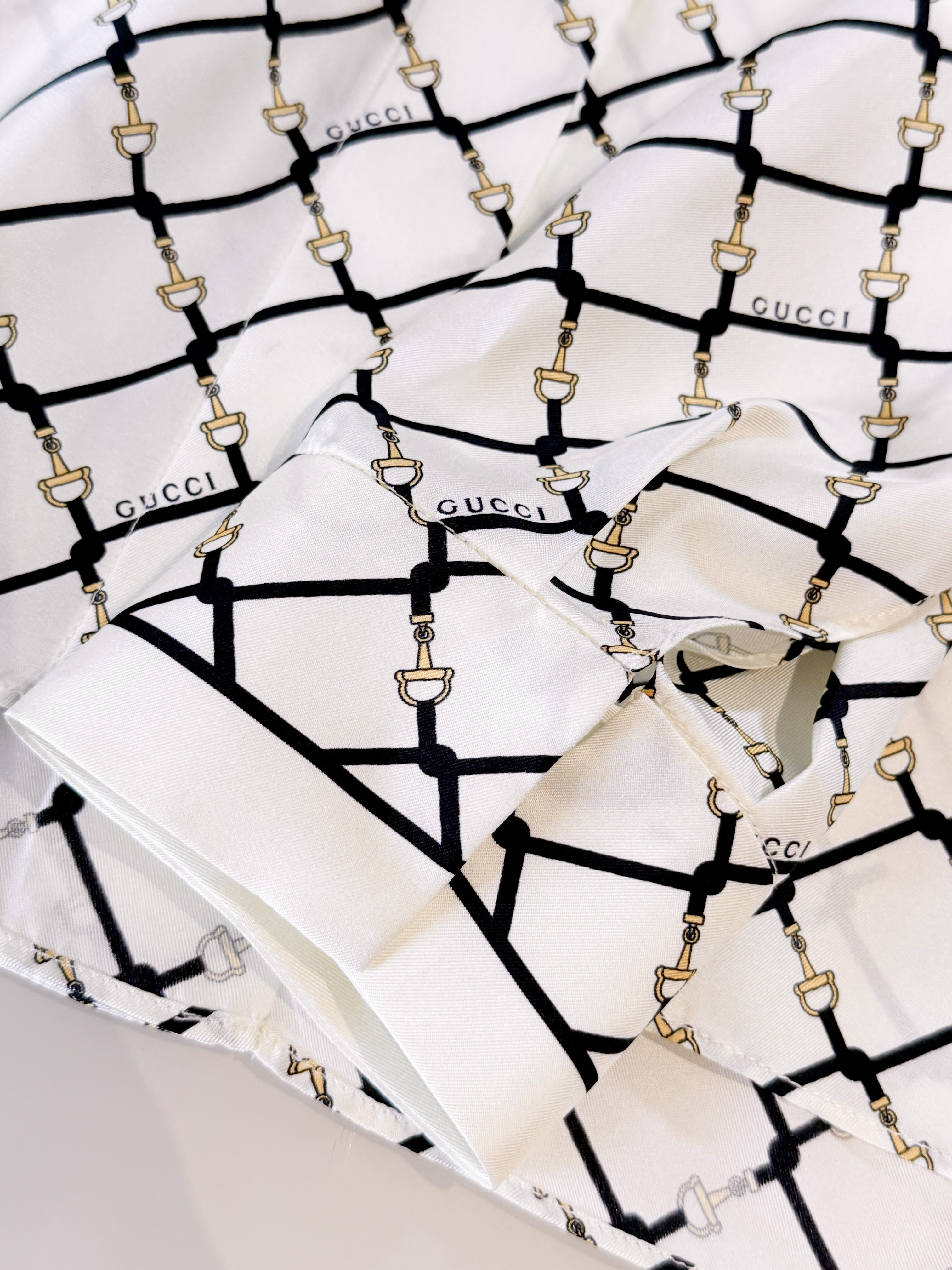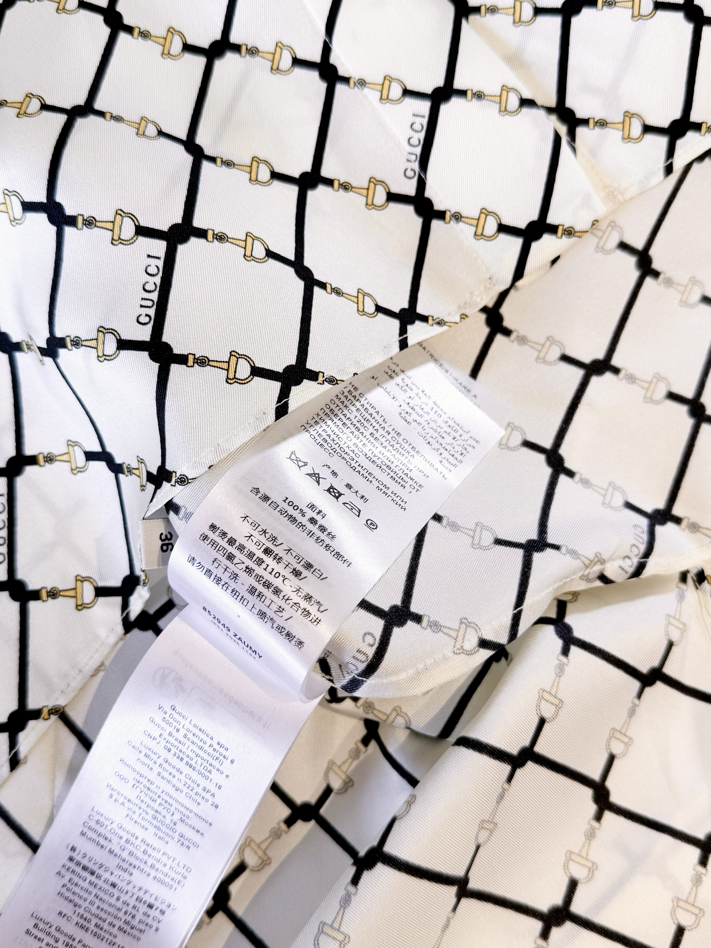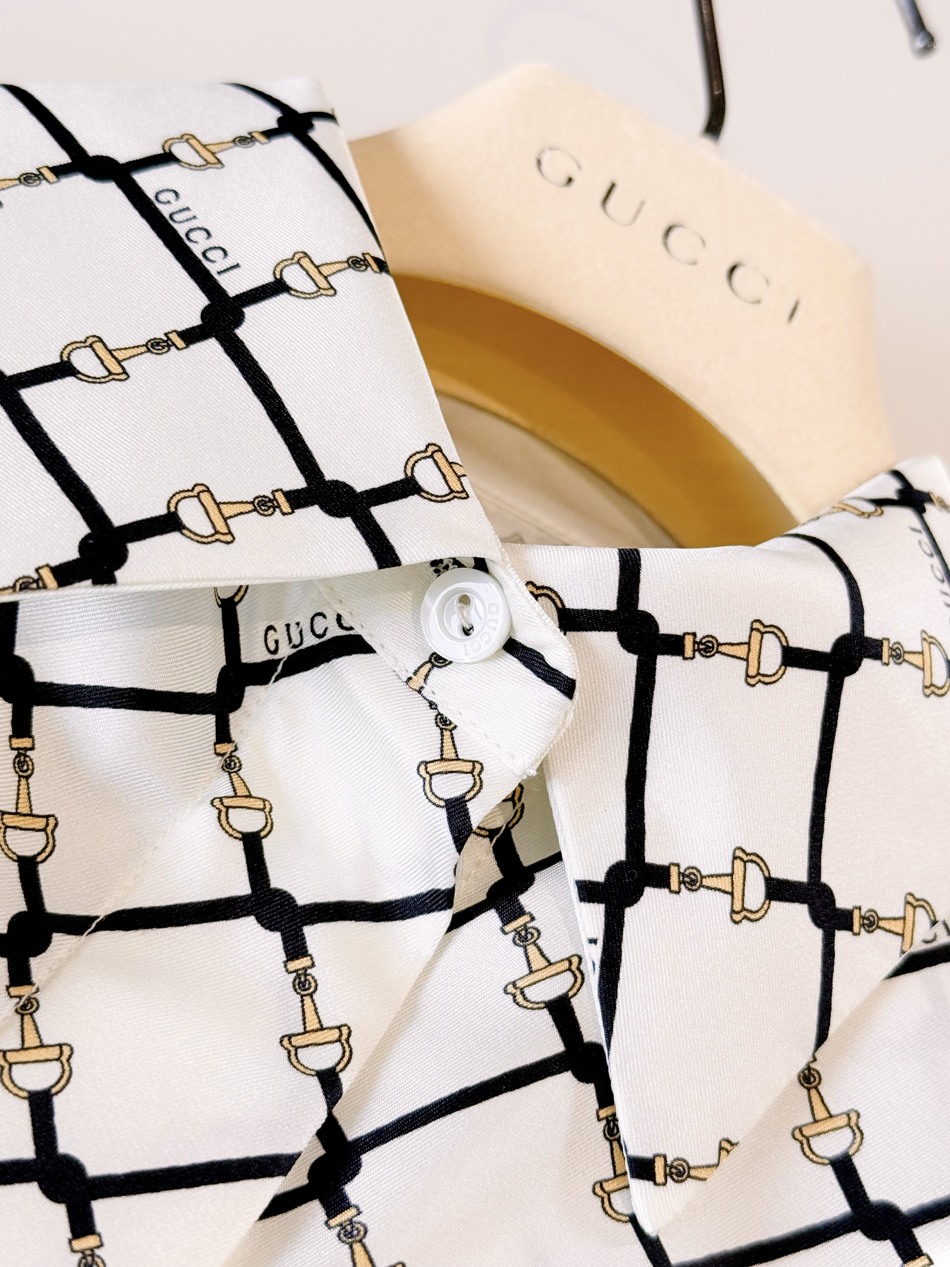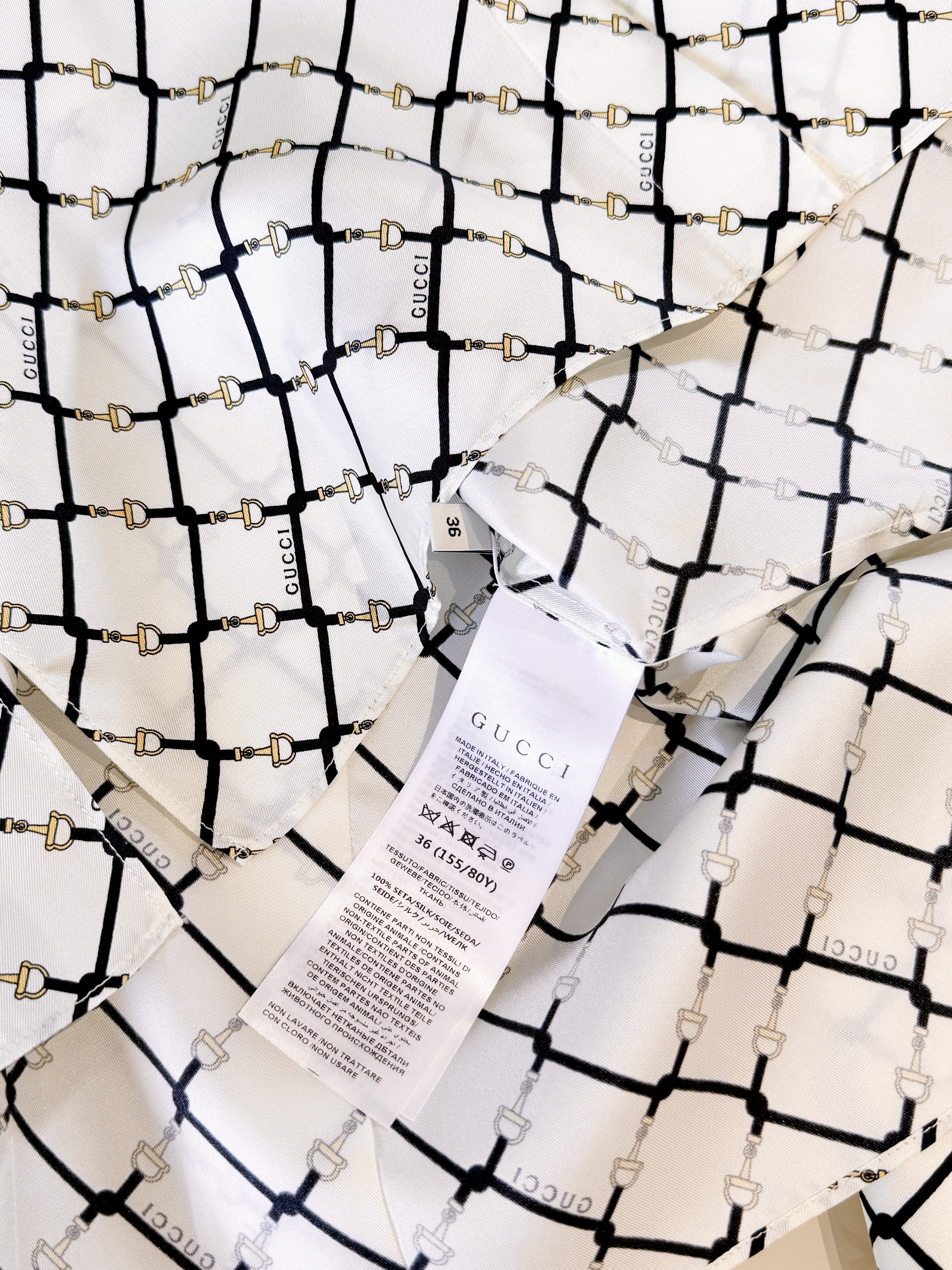 This Gucci clothing showcases the brand's exceptional craftsmanship and attention to detail. Crafted from premium silk, in a stunning white colorway, this piece combines timeless luxury with modern style.