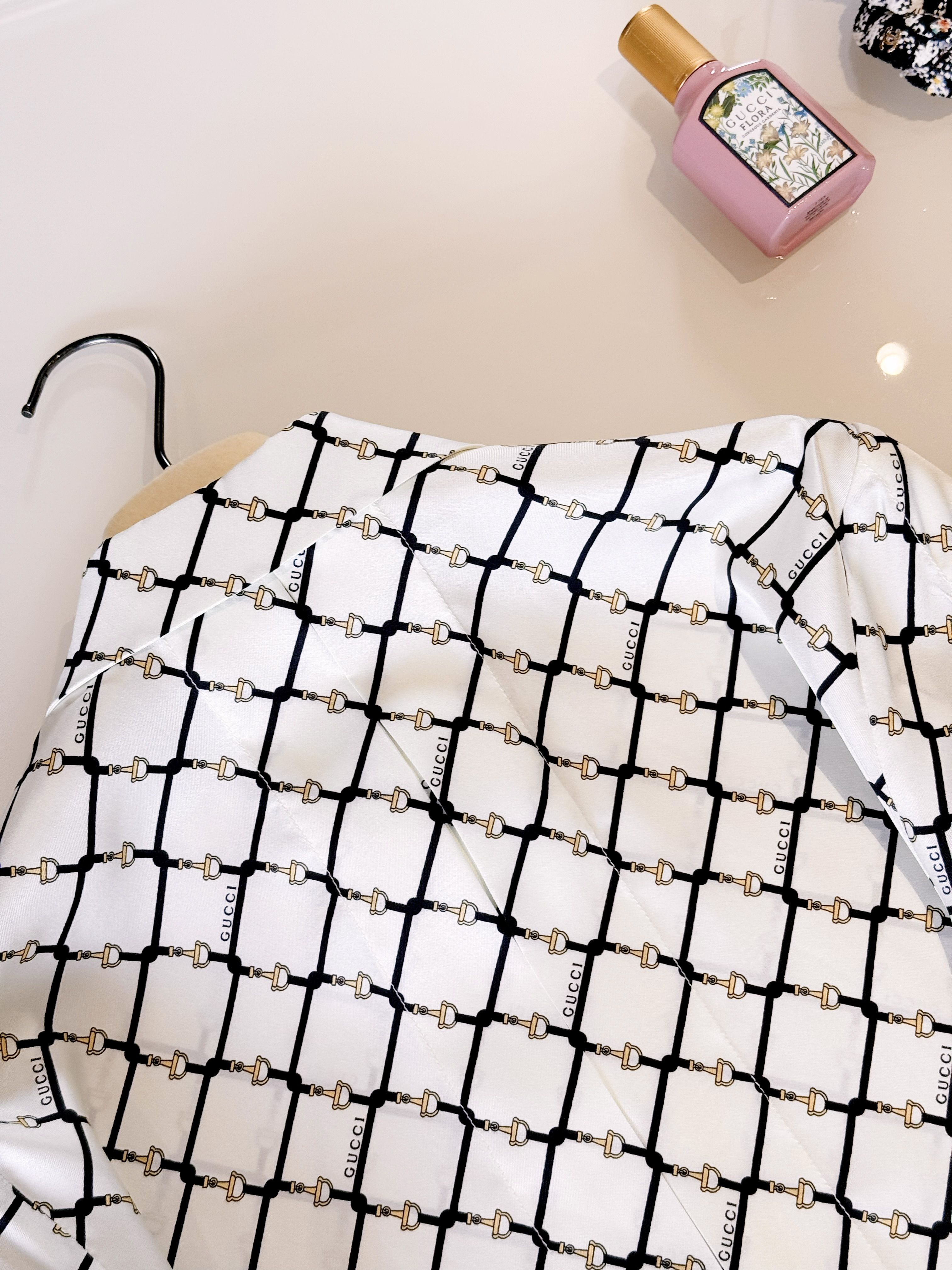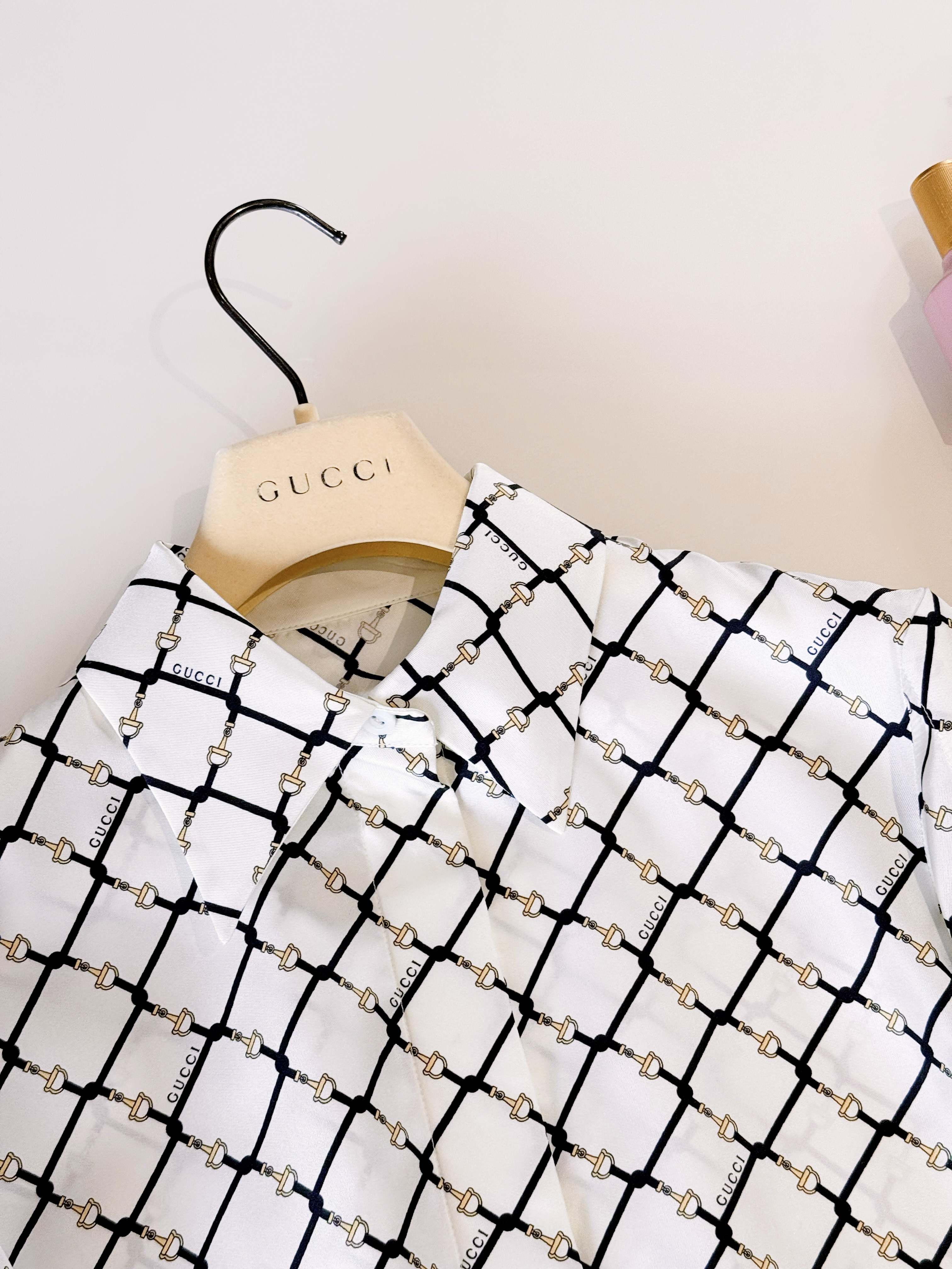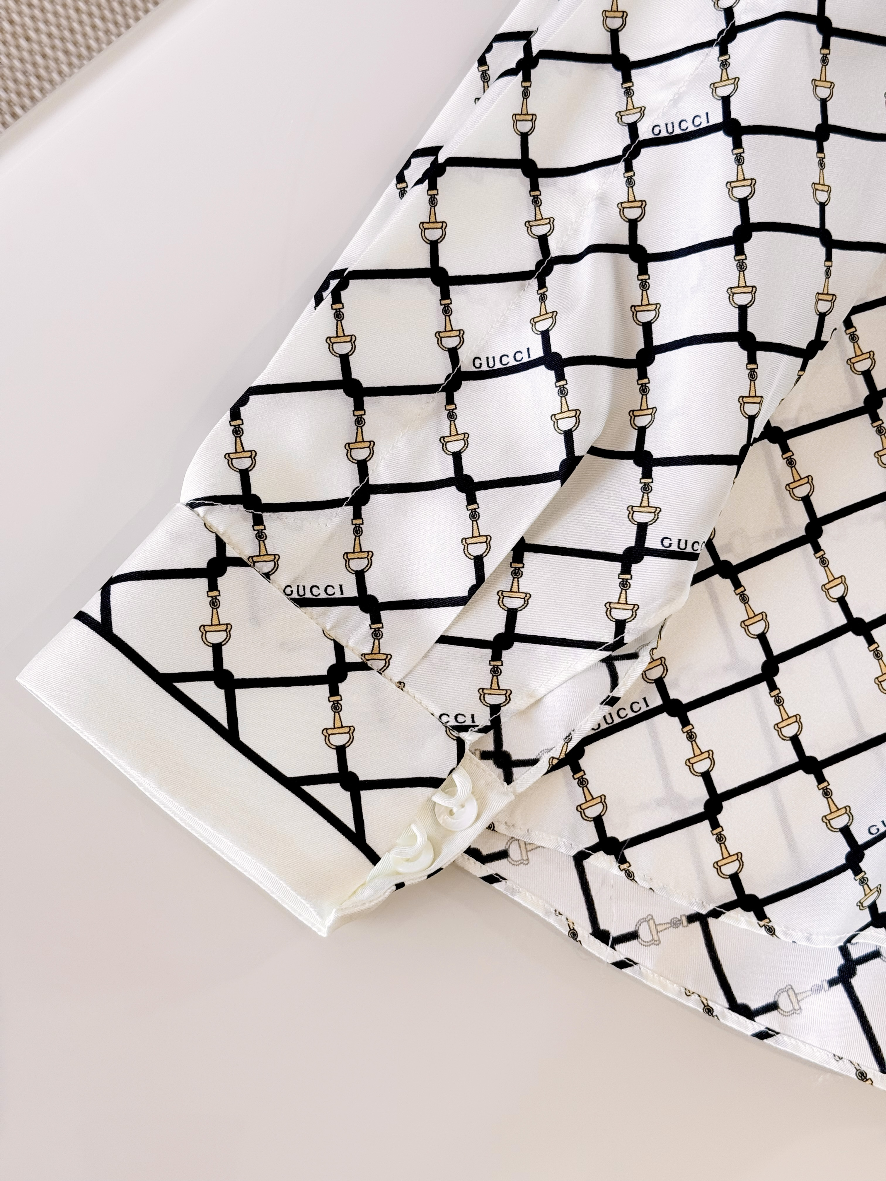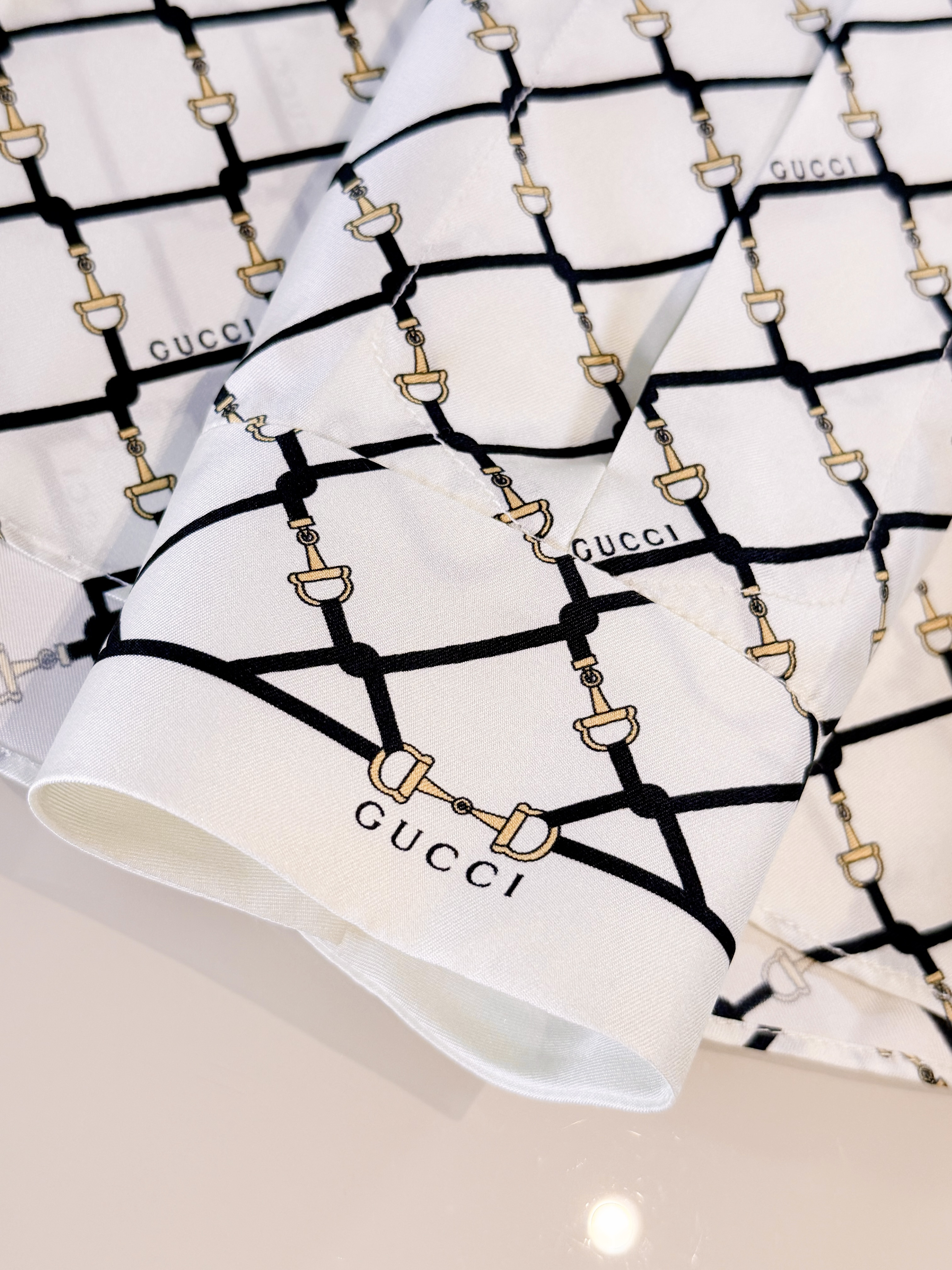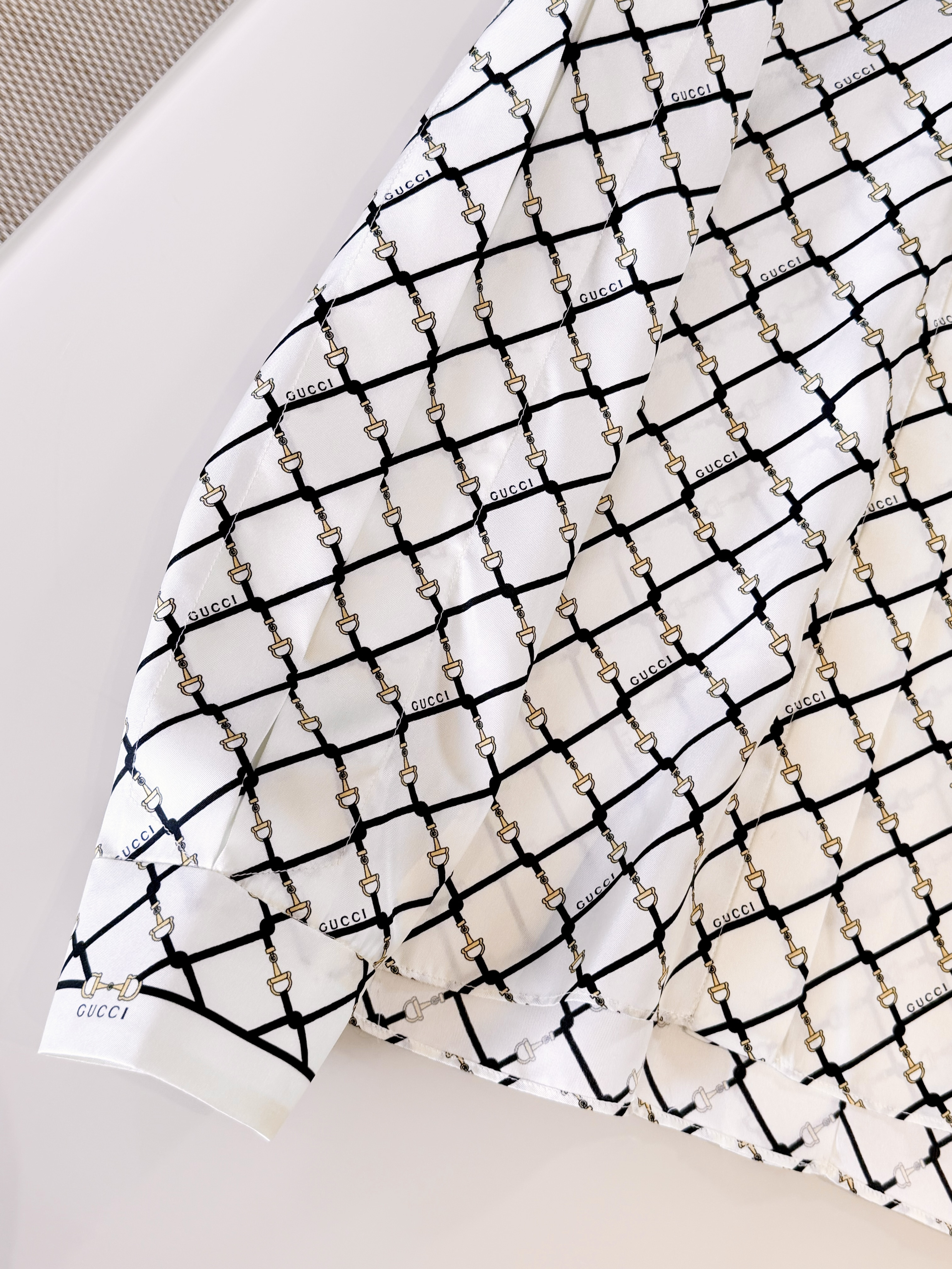 This Gucci clothing showcases the brand's exceptional craftsmanship and attention to detail. Crafted from premium silk, in a stunning white colorway, this piece combines timeless luxury with modern style.