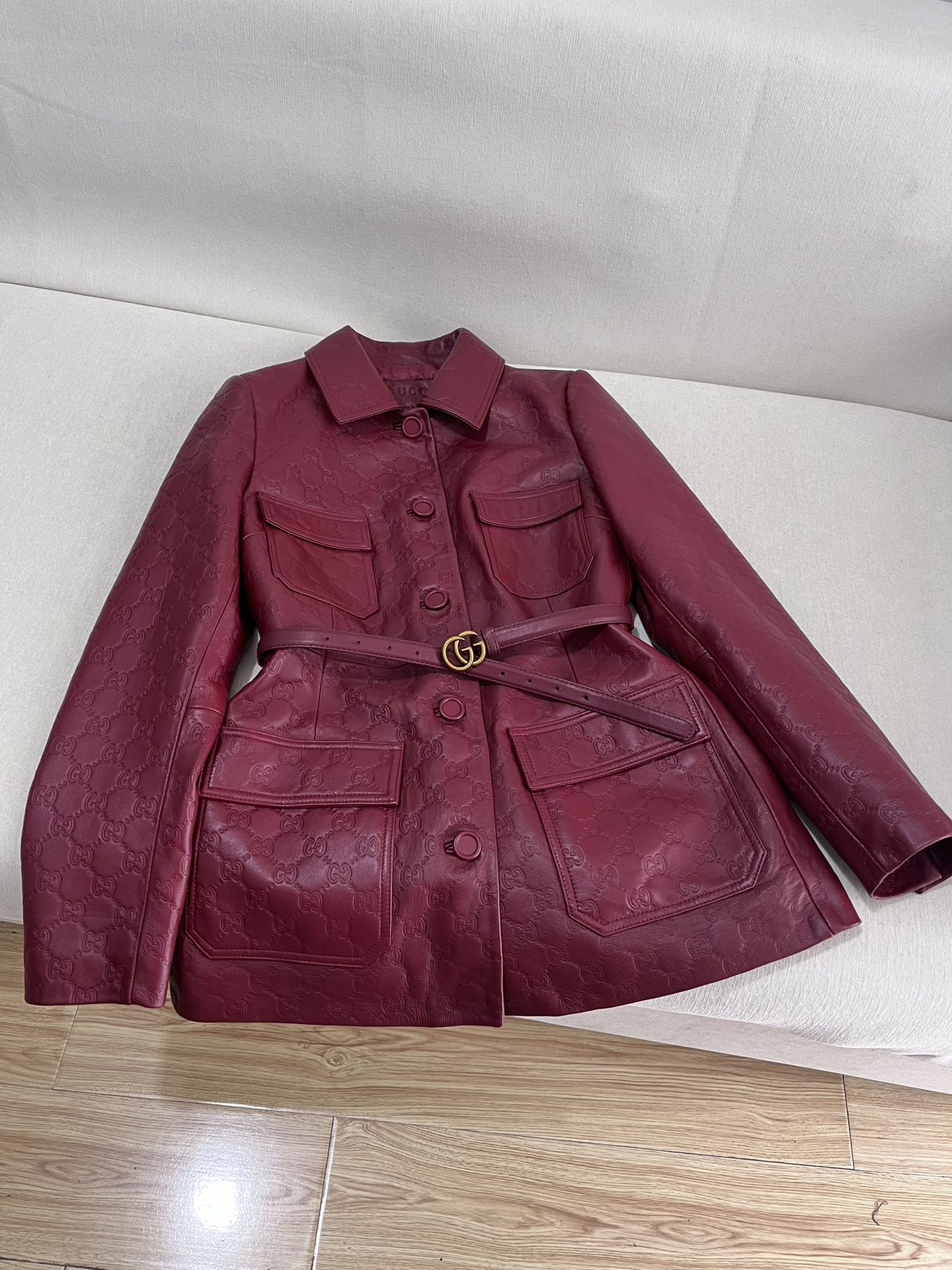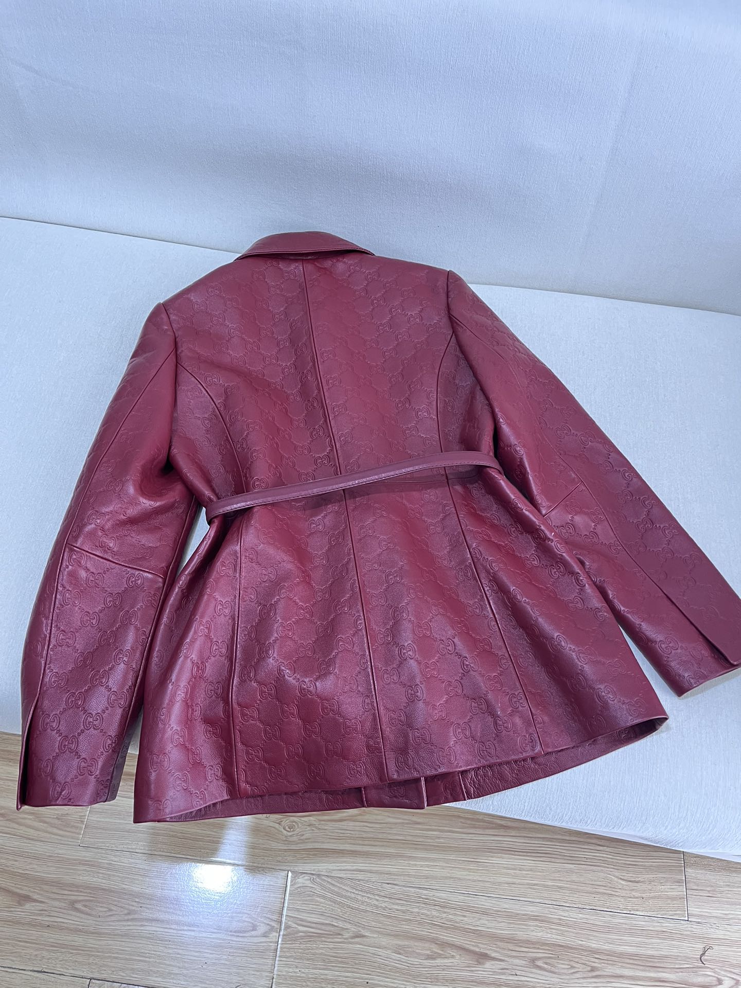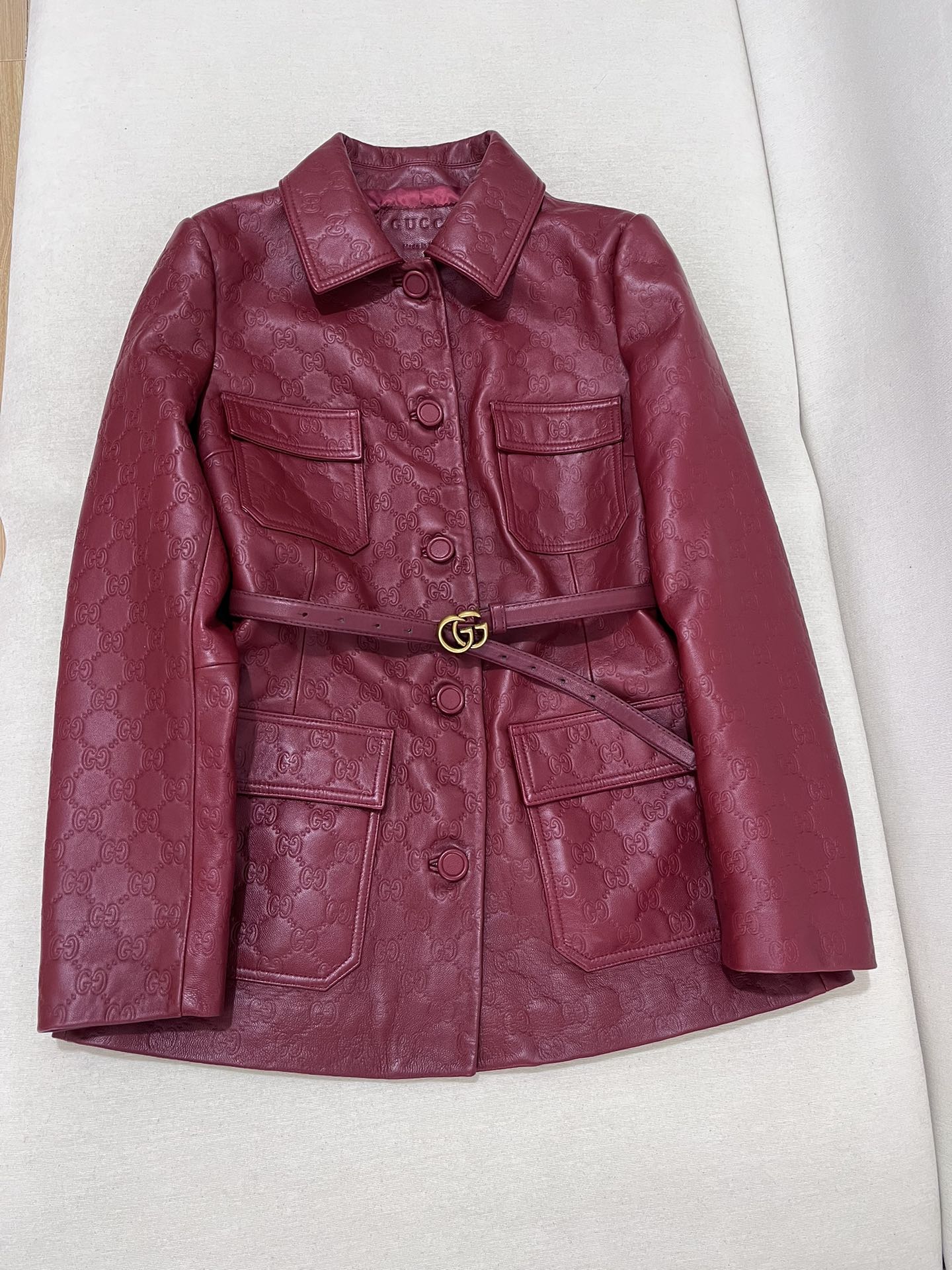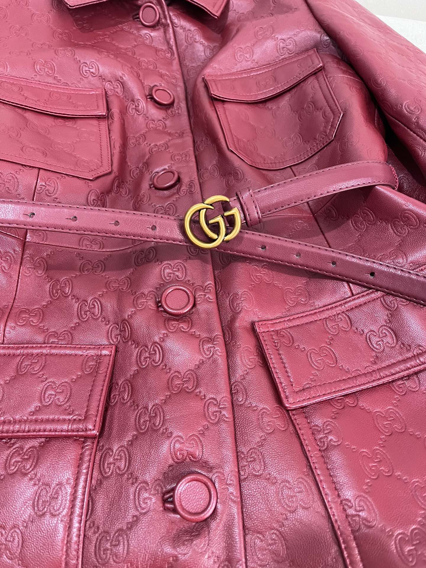 NIGO Gucci Women's Autumn and Winter Solid Color Lapel Embossed Printed Leather Mid-Length Belted Long Sleeve Jacket Coat #nigo74376