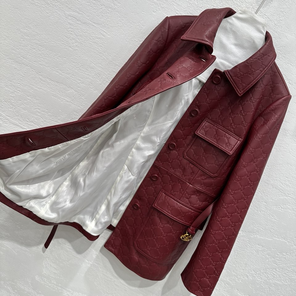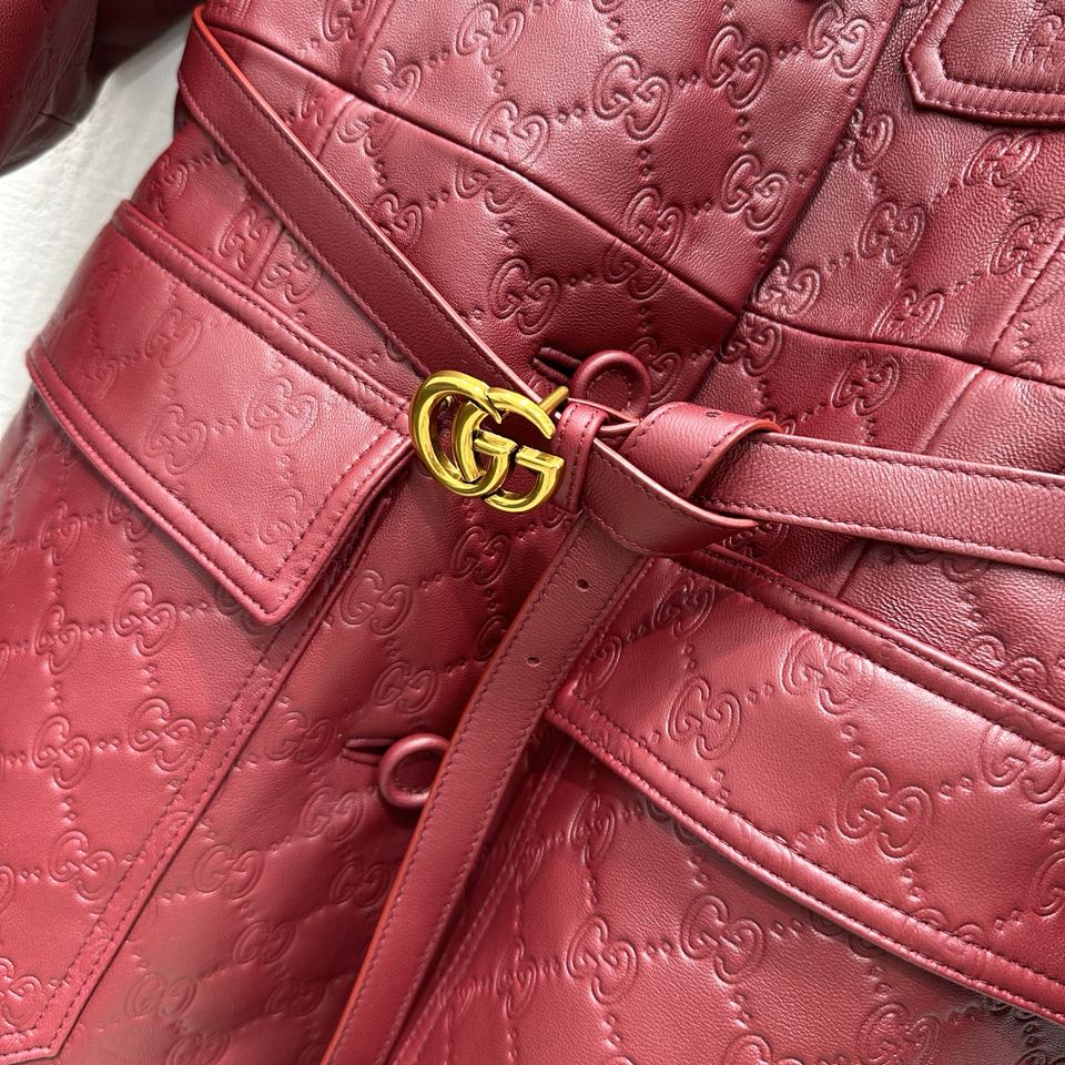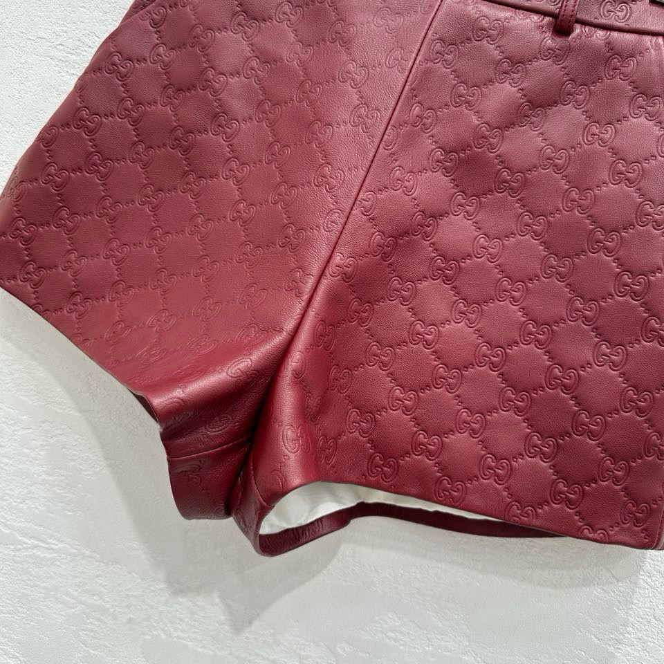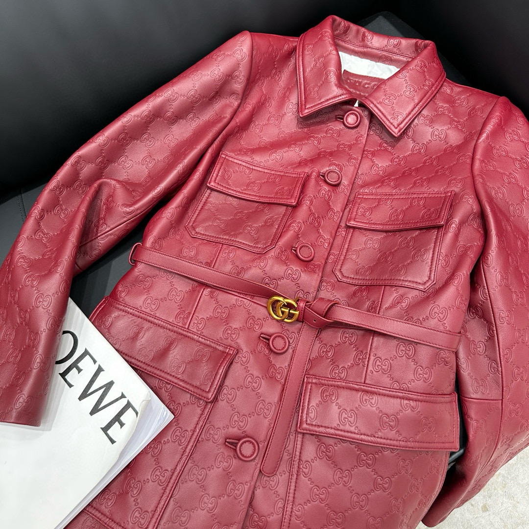 NIGO Gucci Women's Autumn and Winter Solid Color Lapel Embossed Printed Leather Mid-Length Drawstring Long Sleeve Jacket Coat Zipper Casual Shorts Set Suit #nigo75286