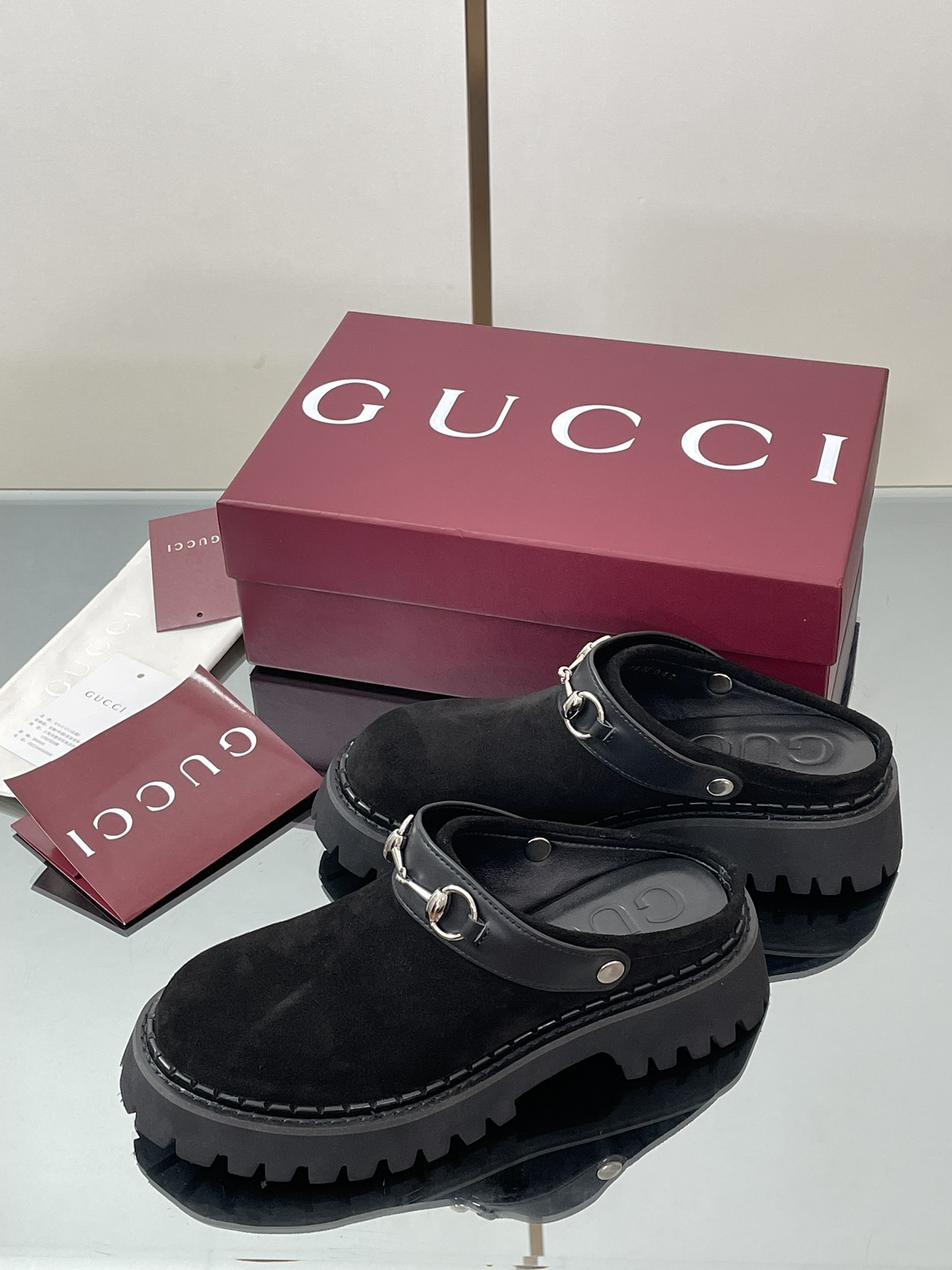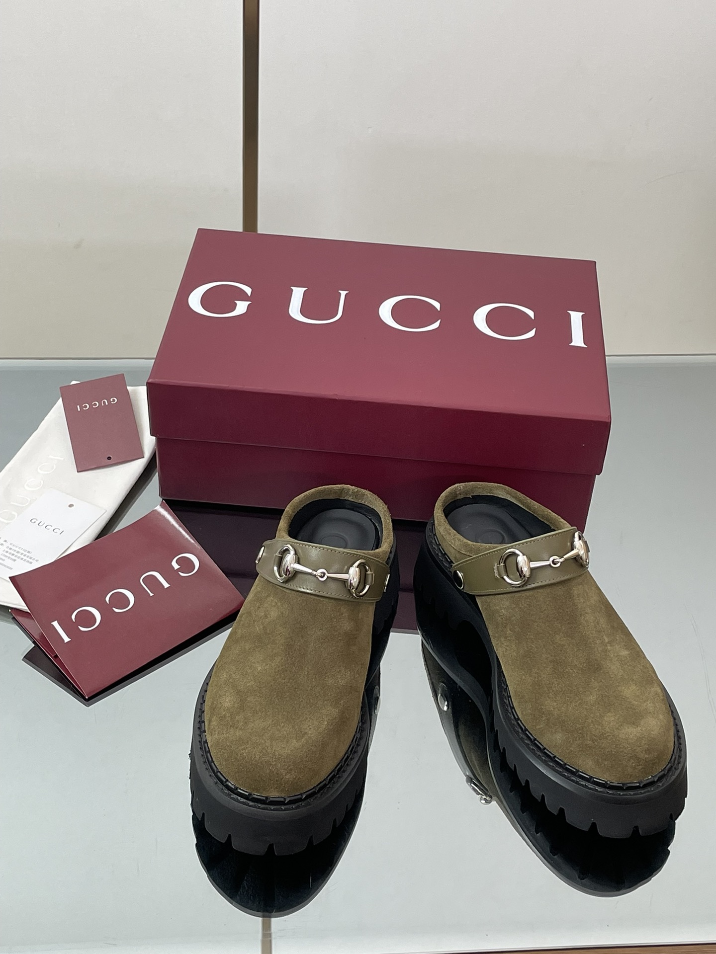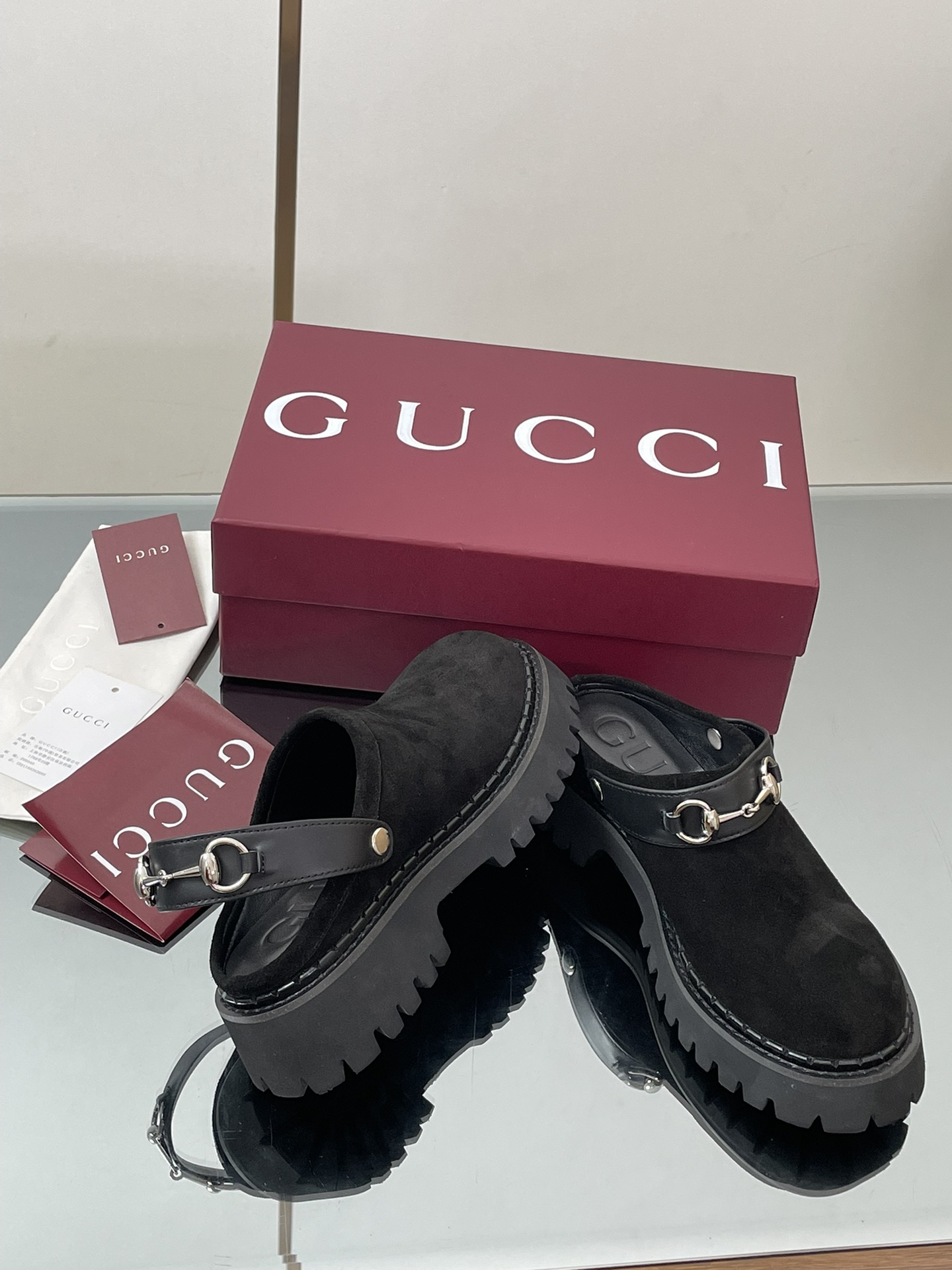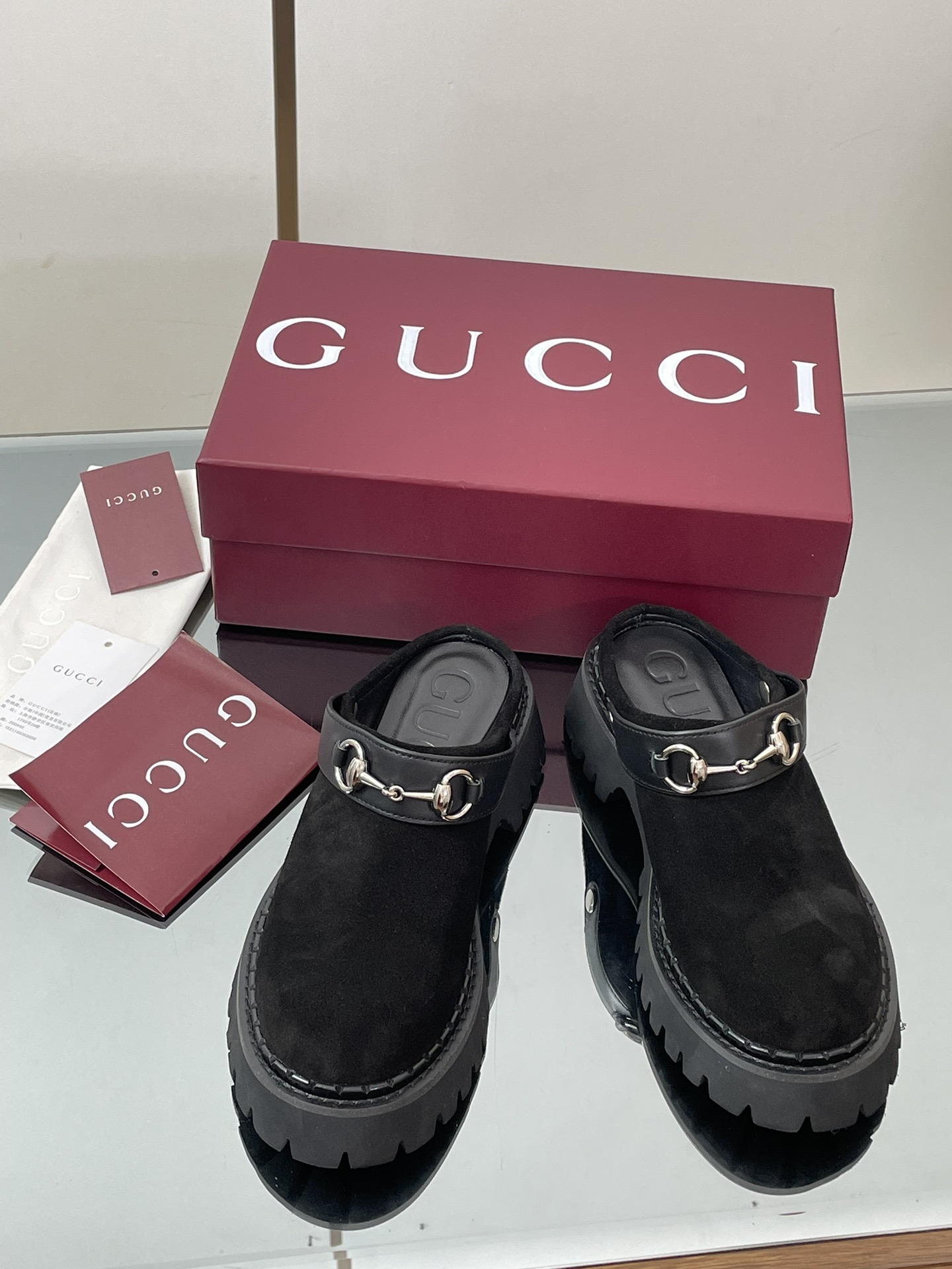 NIGO Gucci Women's Decorated Horsebit Buckle Mule Shoes Suede Leather Half Slippers Fashion Thick Bottom Height Increasing Shoes Heel Height:5cm #nigo81434
