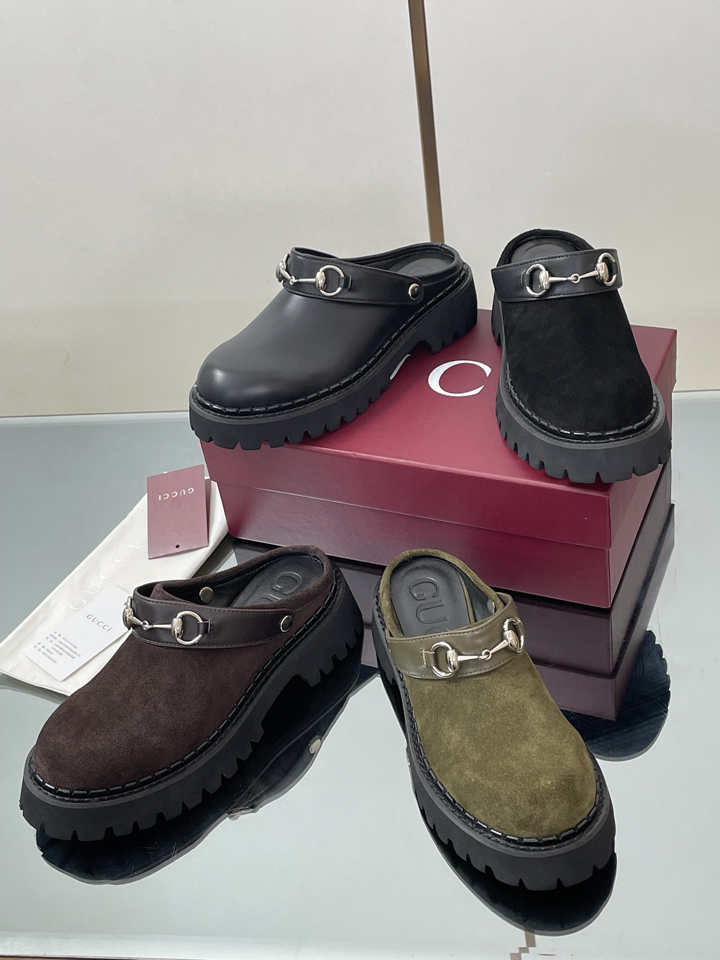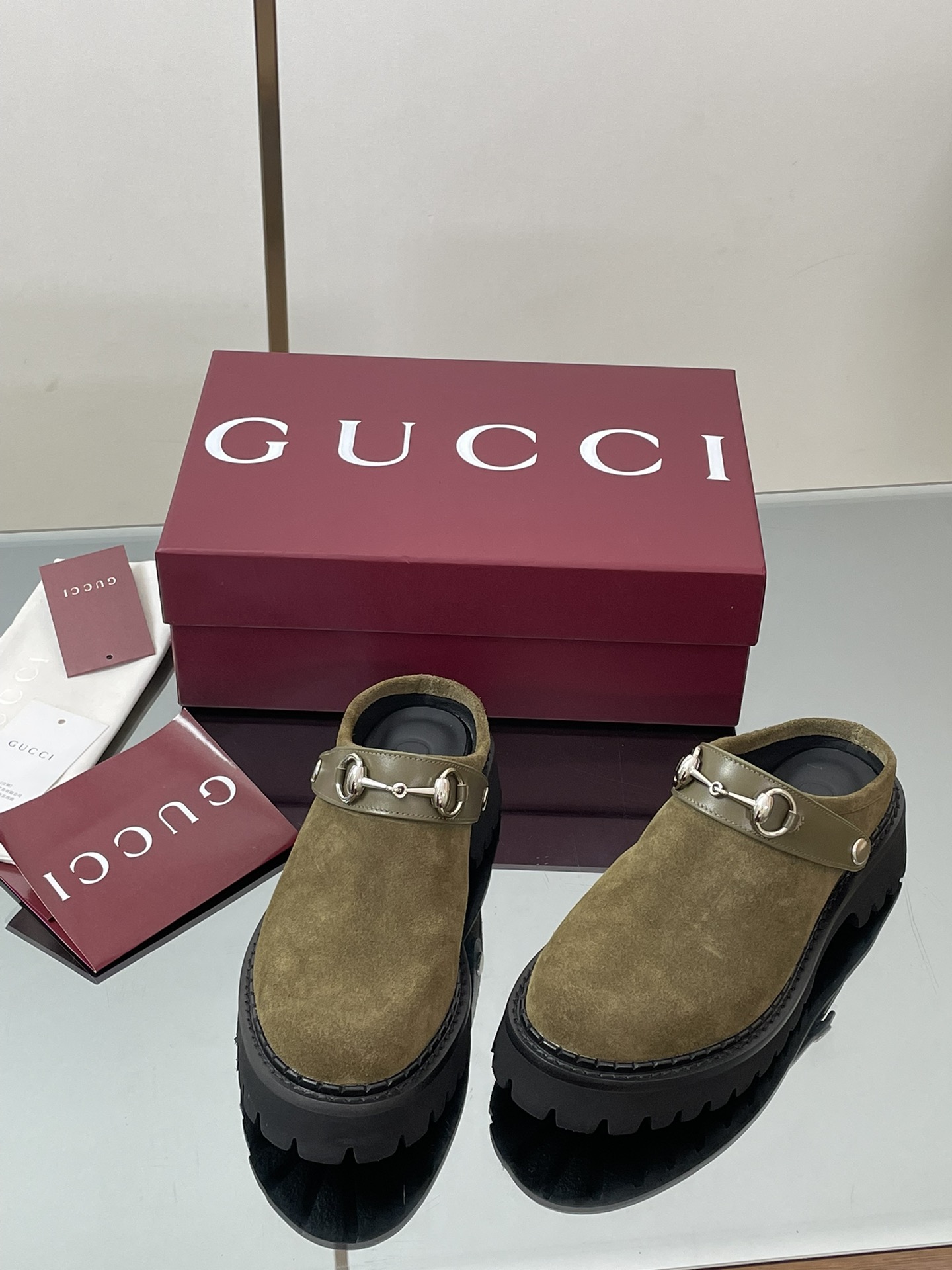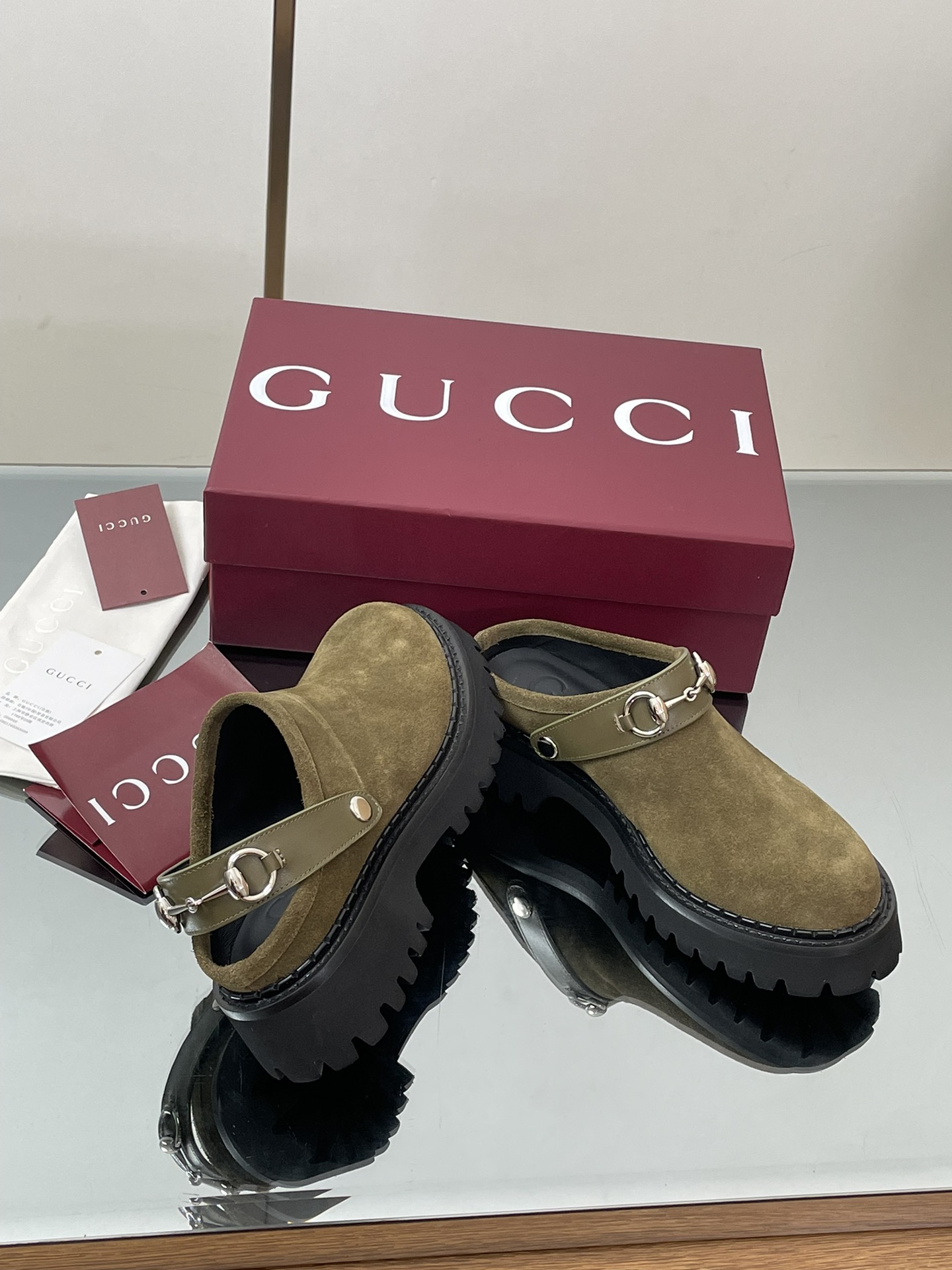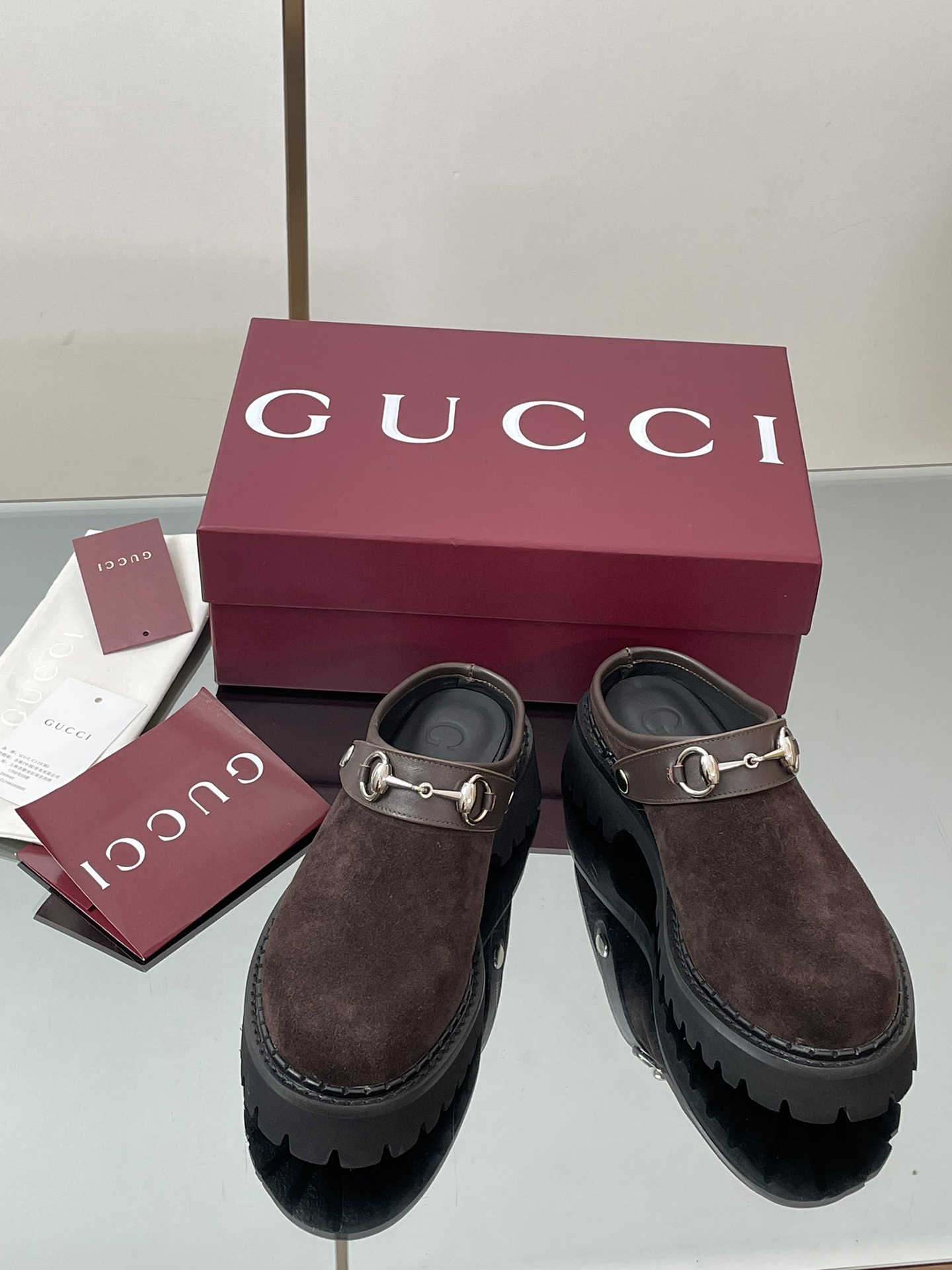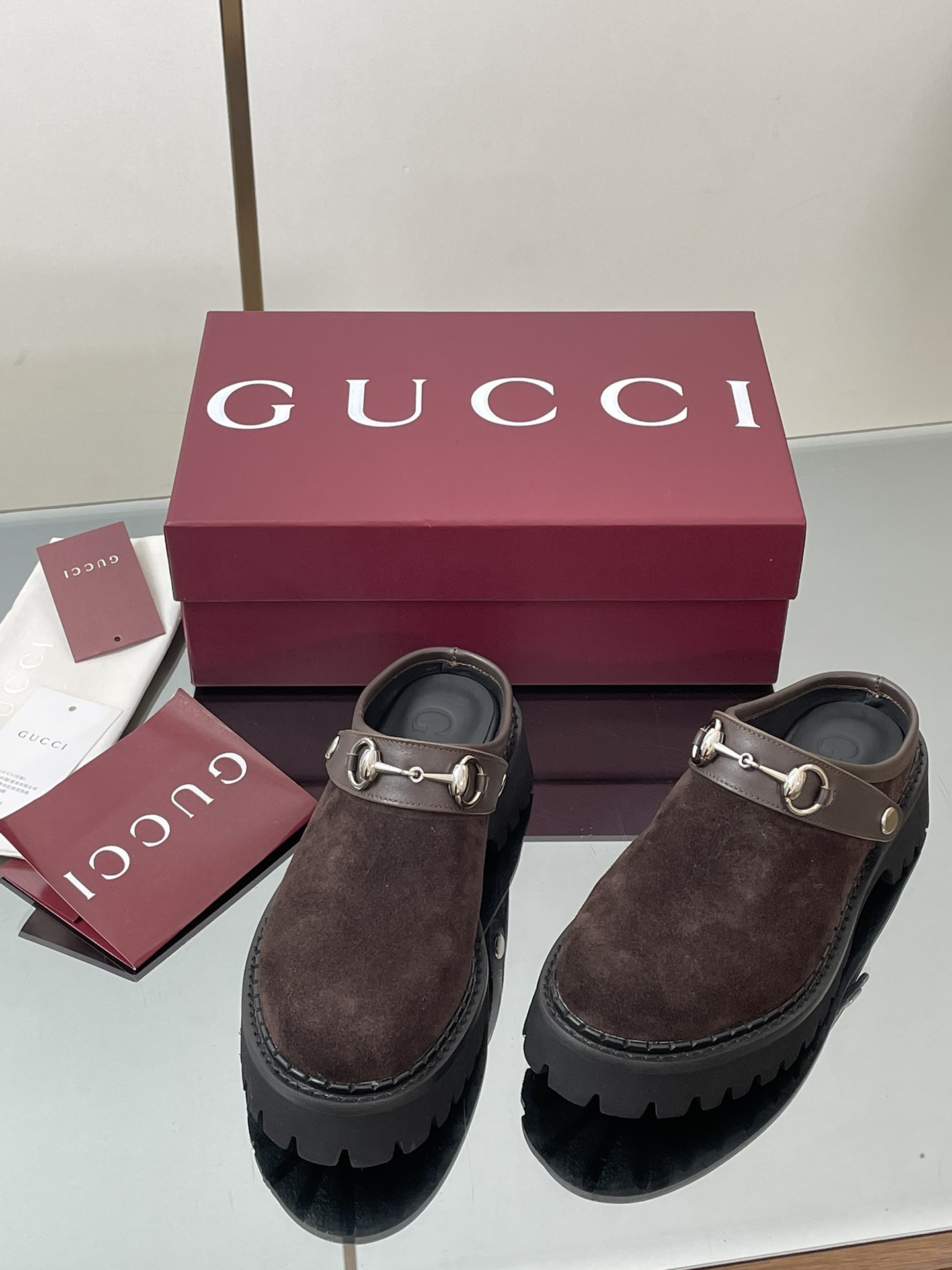 NIGO Gucci Women's Decorated Horsebit Buckle Mule Shoes Suede Leather Half Slippers Fashion Thick Bottom Height Increasing Shoes Heel Height:5cm #nigo81434