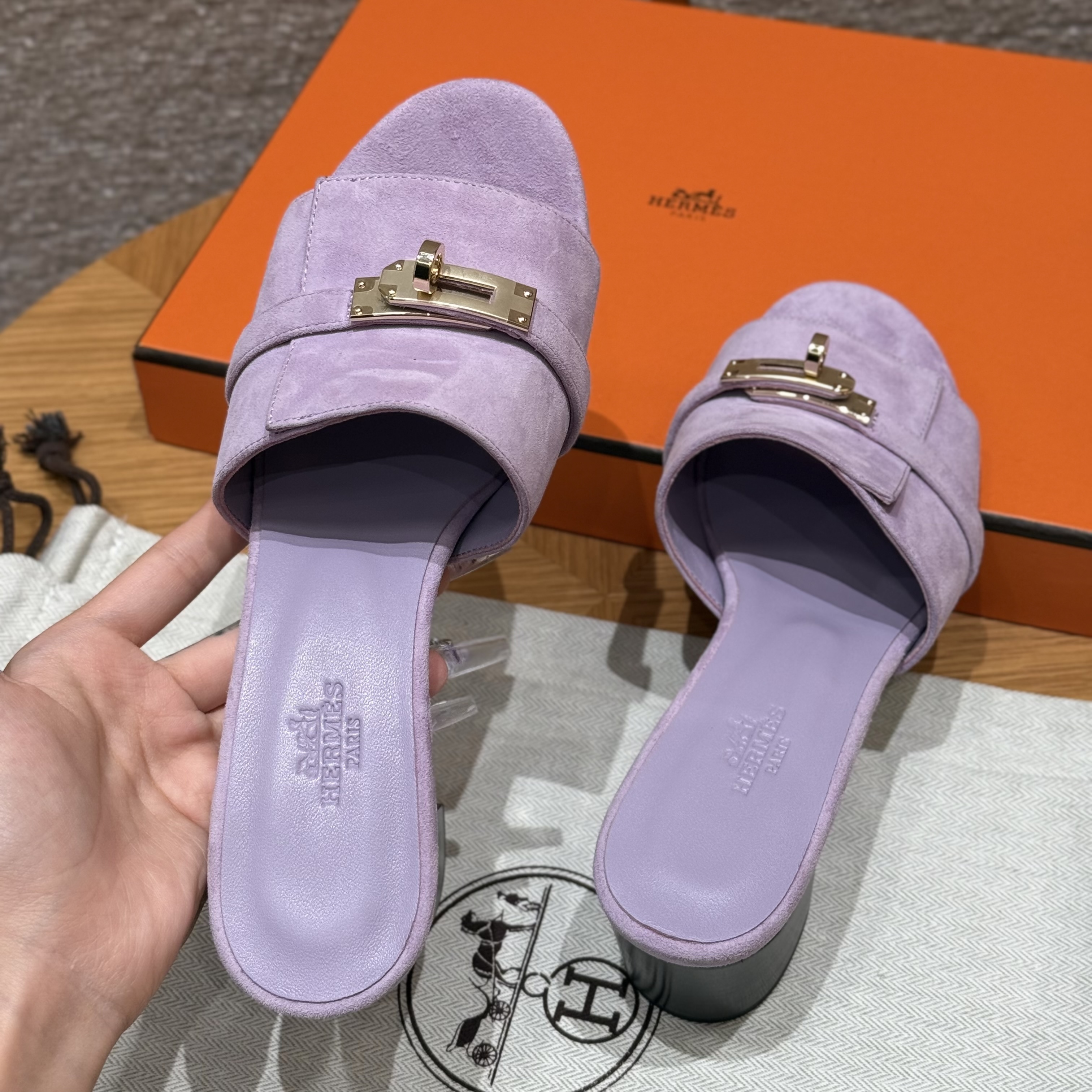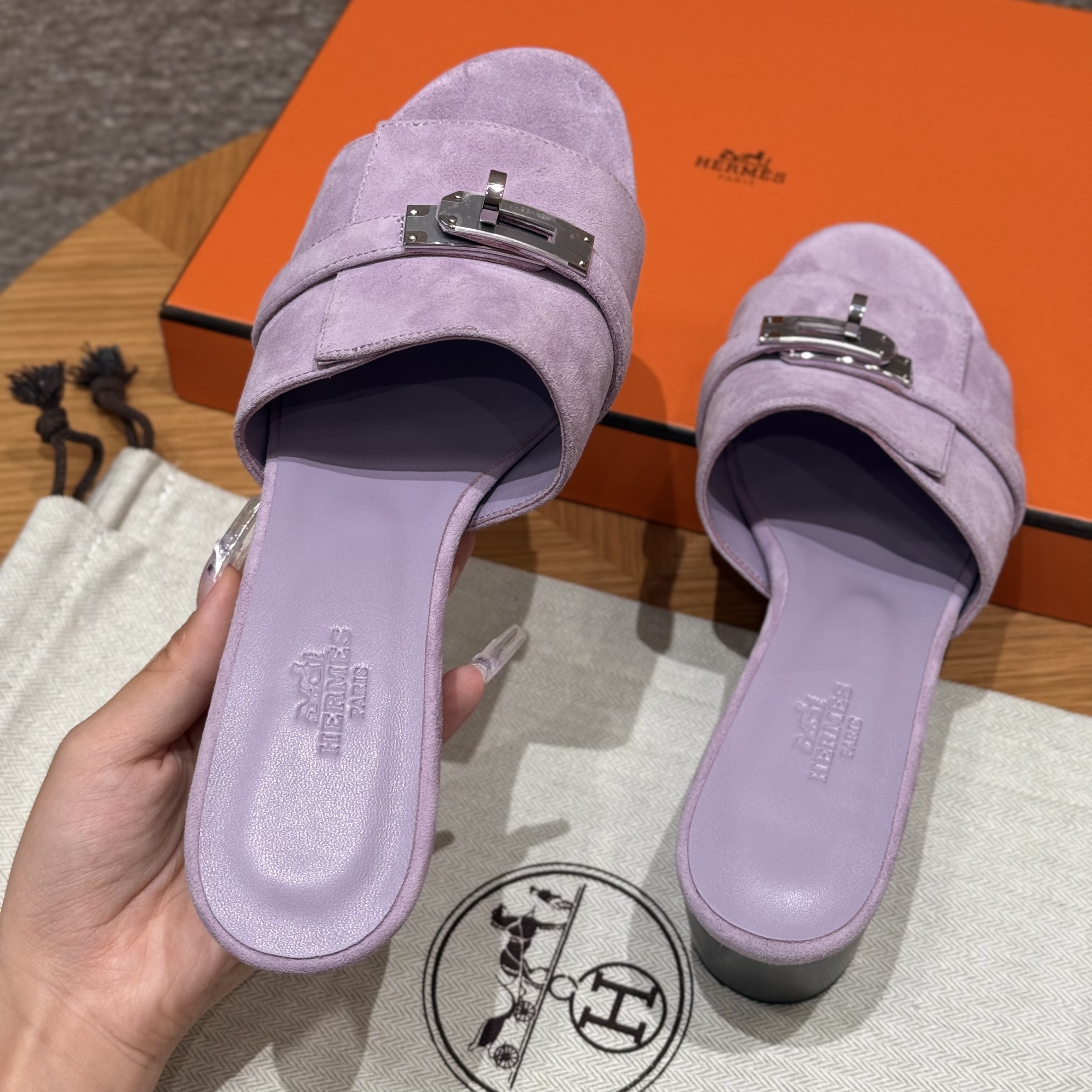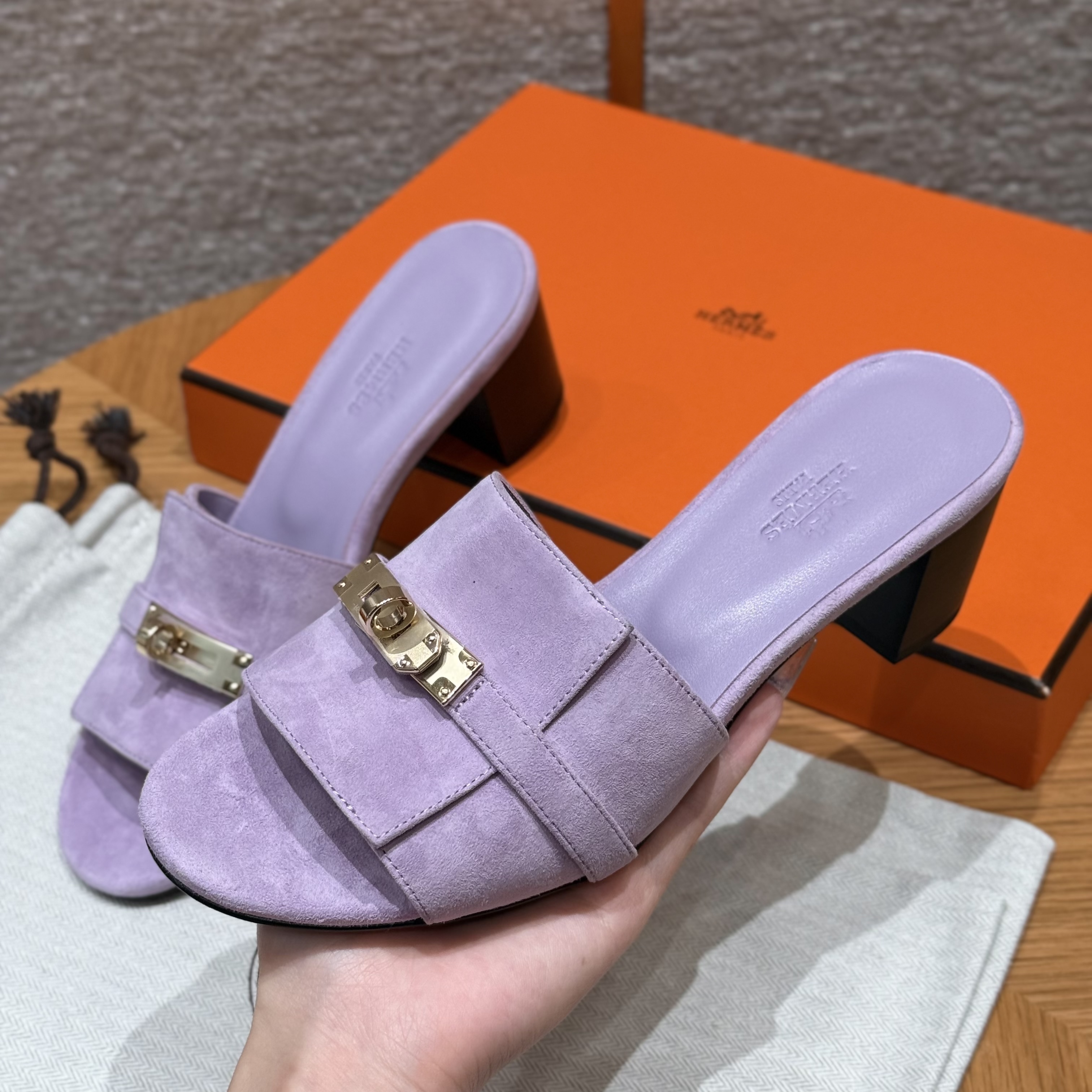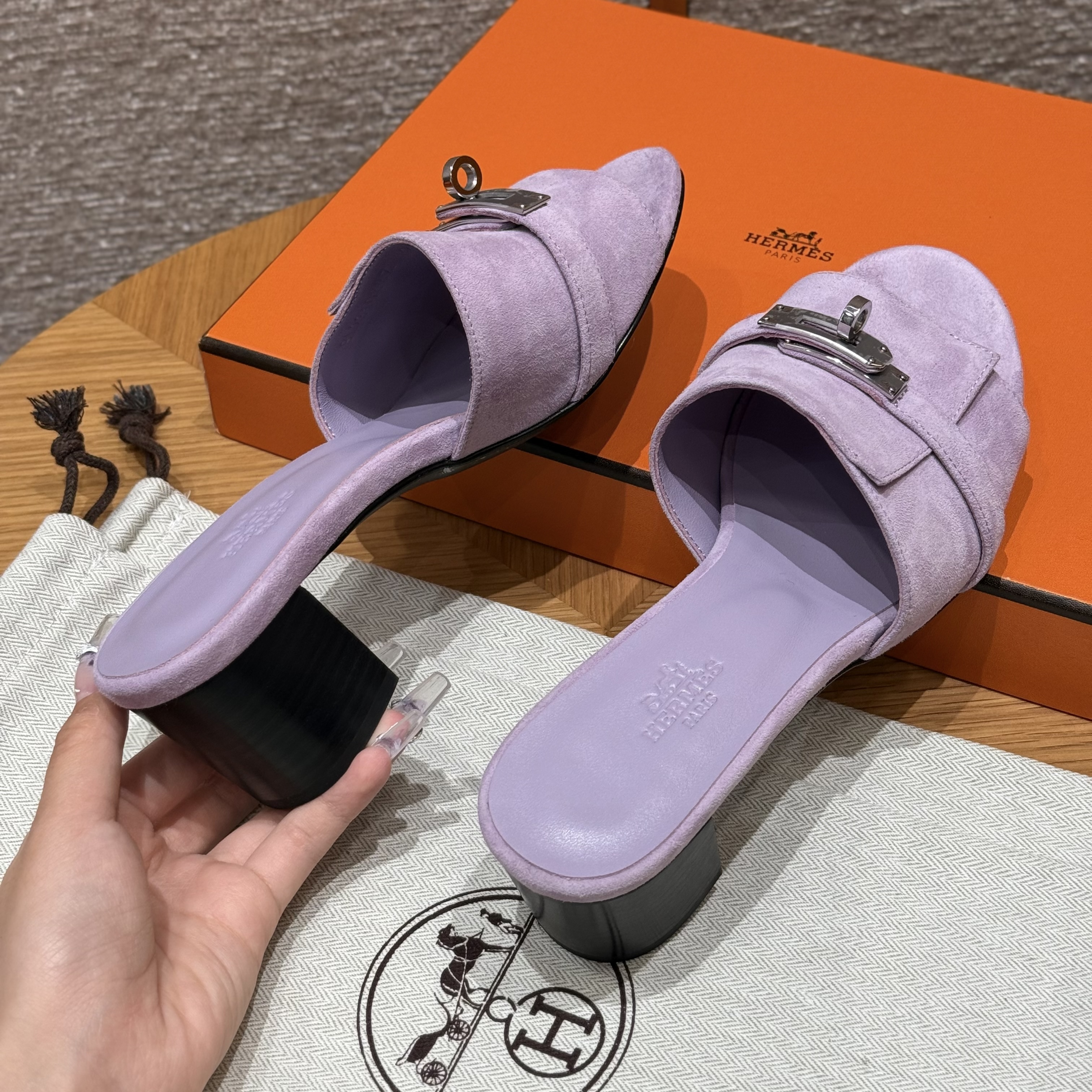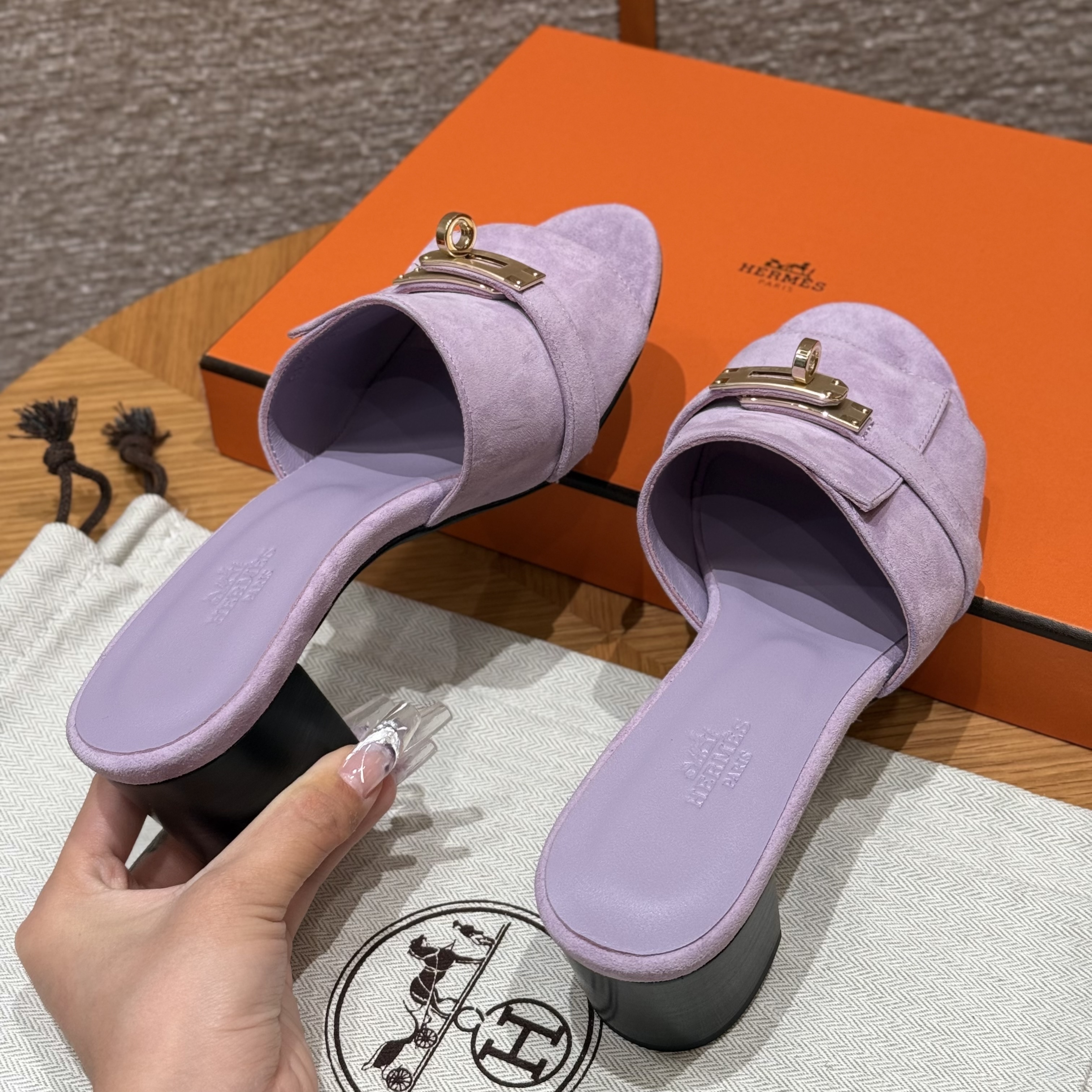 NIGO Hermes Gigi 50 Women's Summer Solid Color Metal Buckle Round Toe Suede Leather High Heel Sandals Shoes #nigo77668
