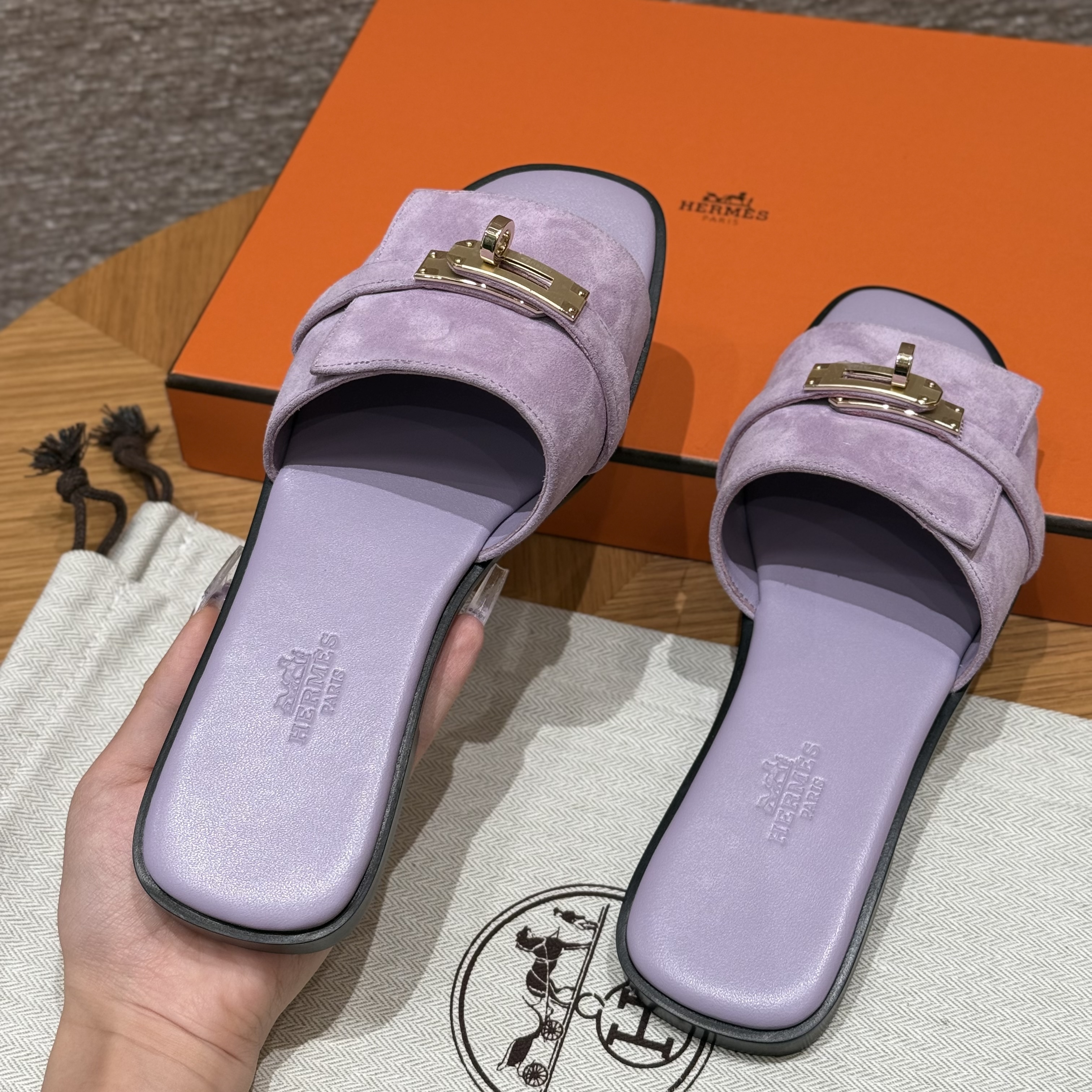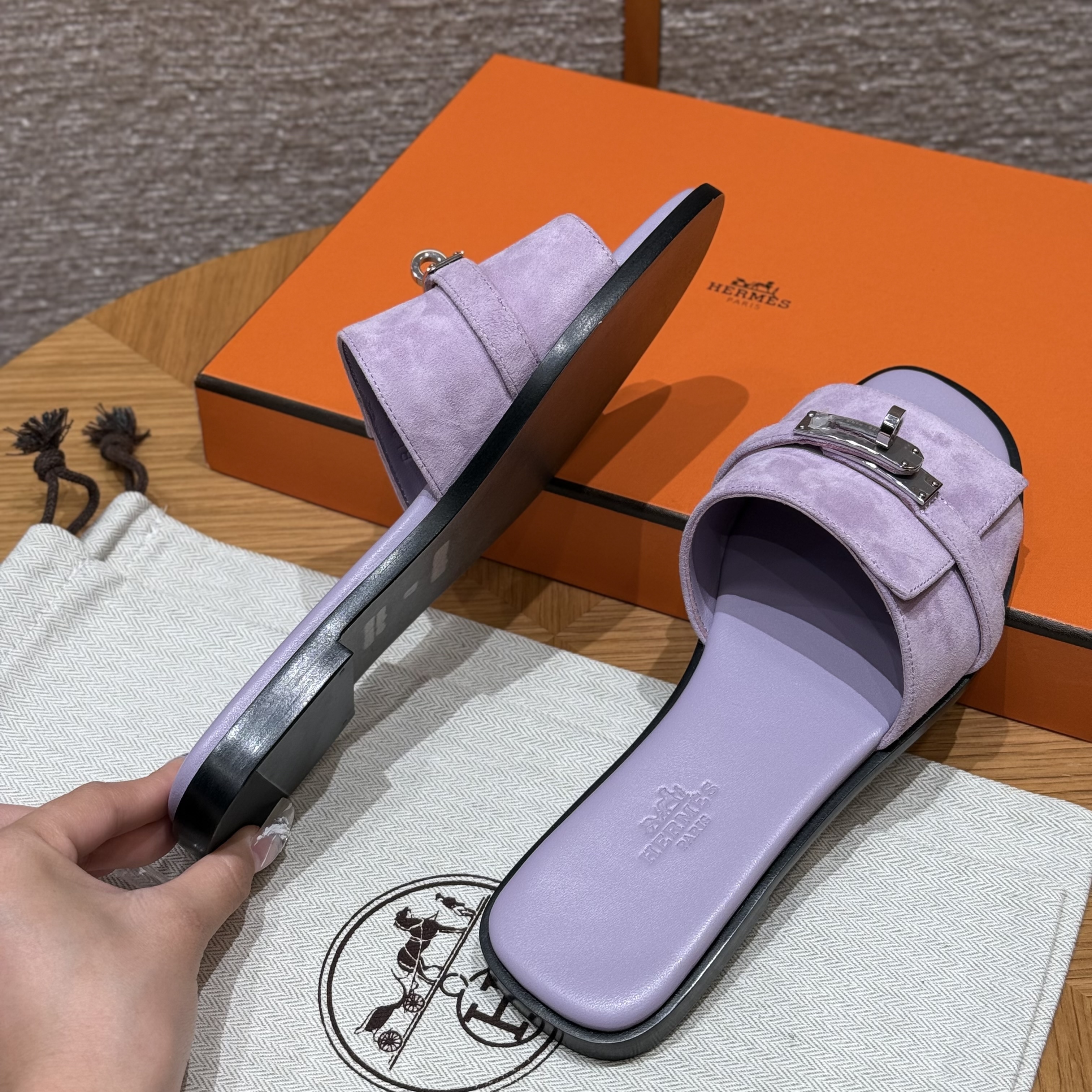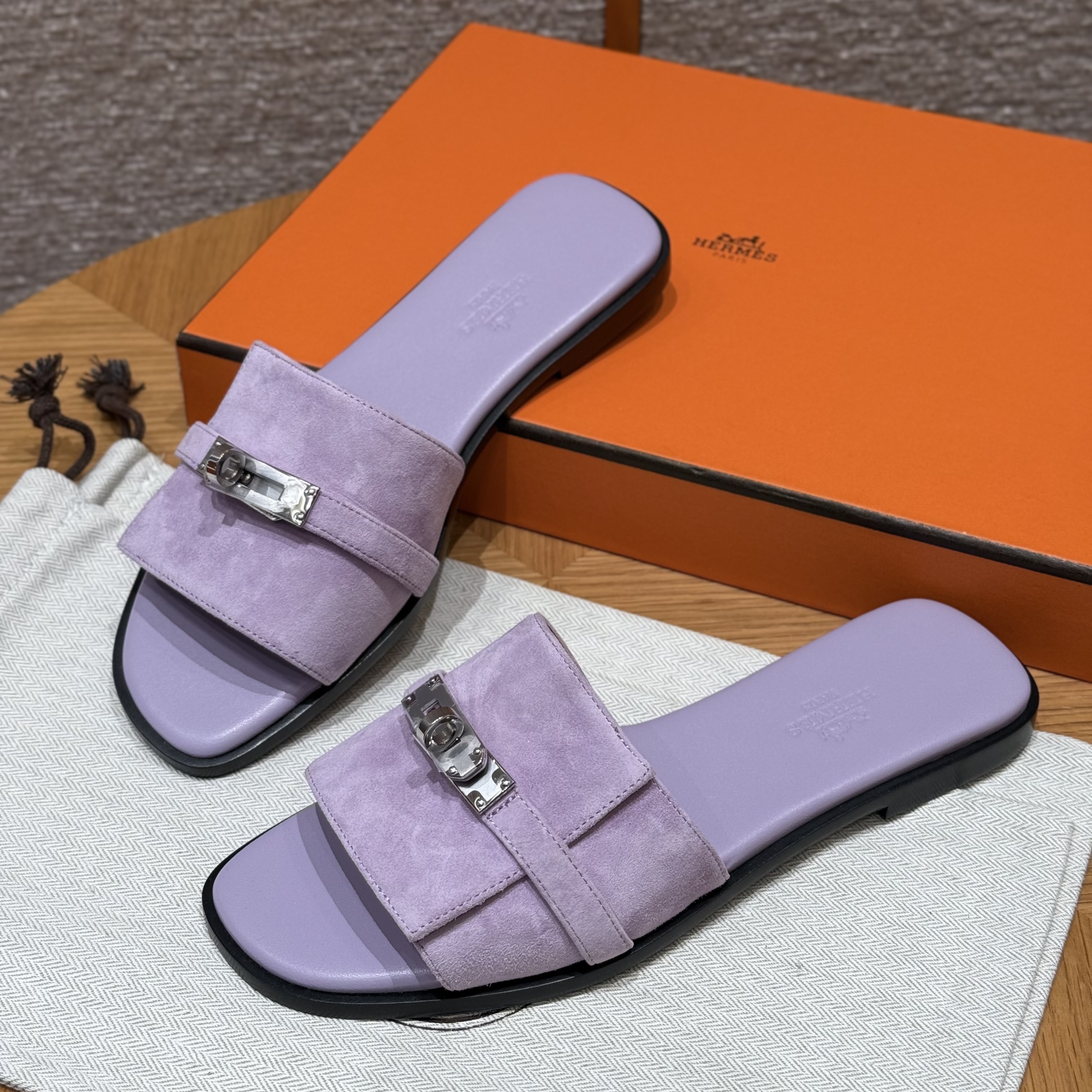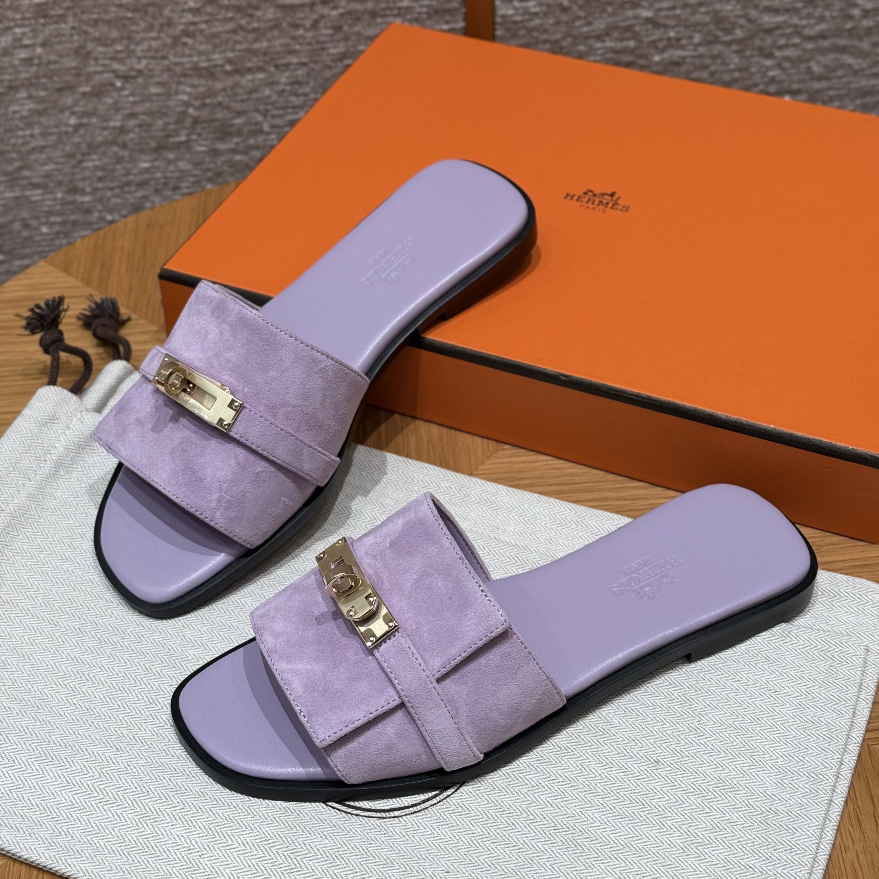 NIGO Hermes Giulia Women's Summer Solid Color Metal Buckle Round Toe Suede Leather Sandals Slippers Shoes #nigo77667