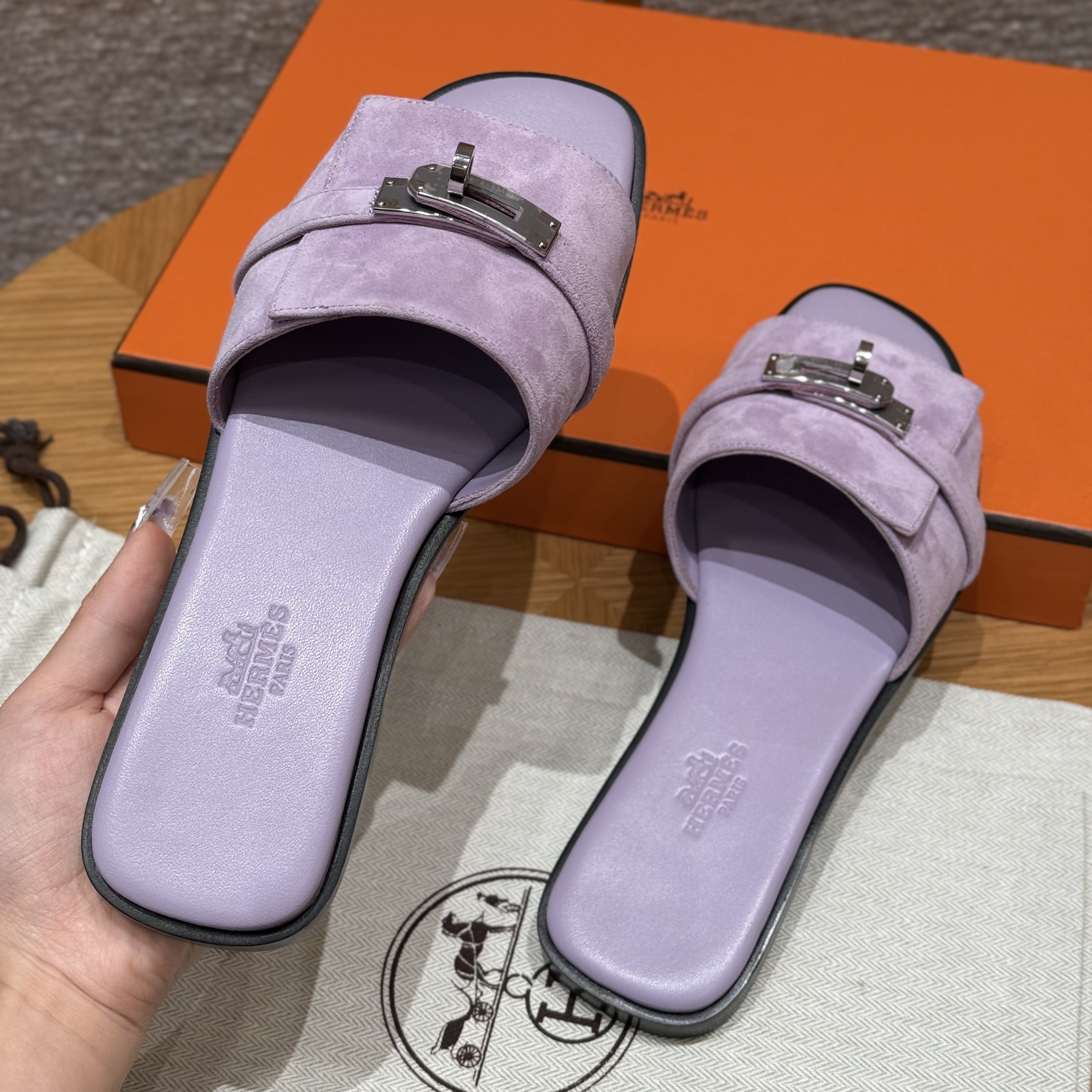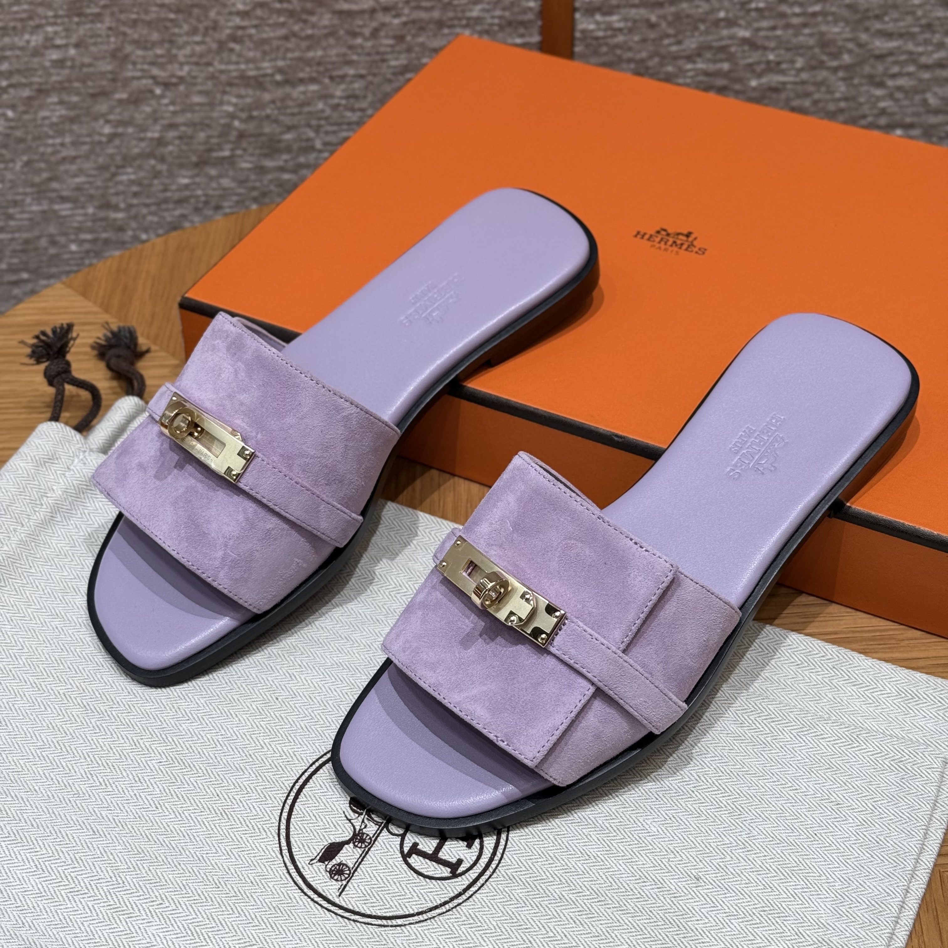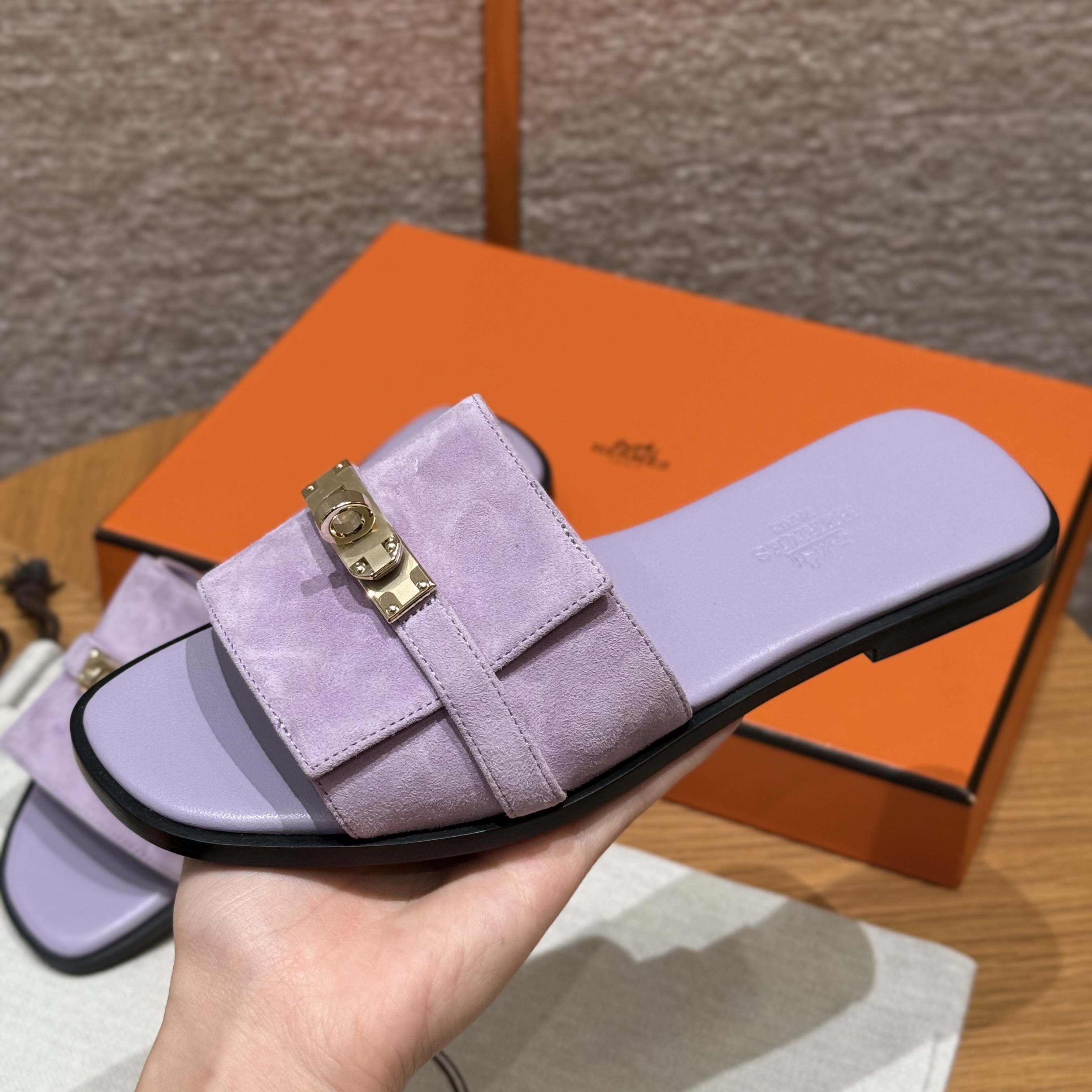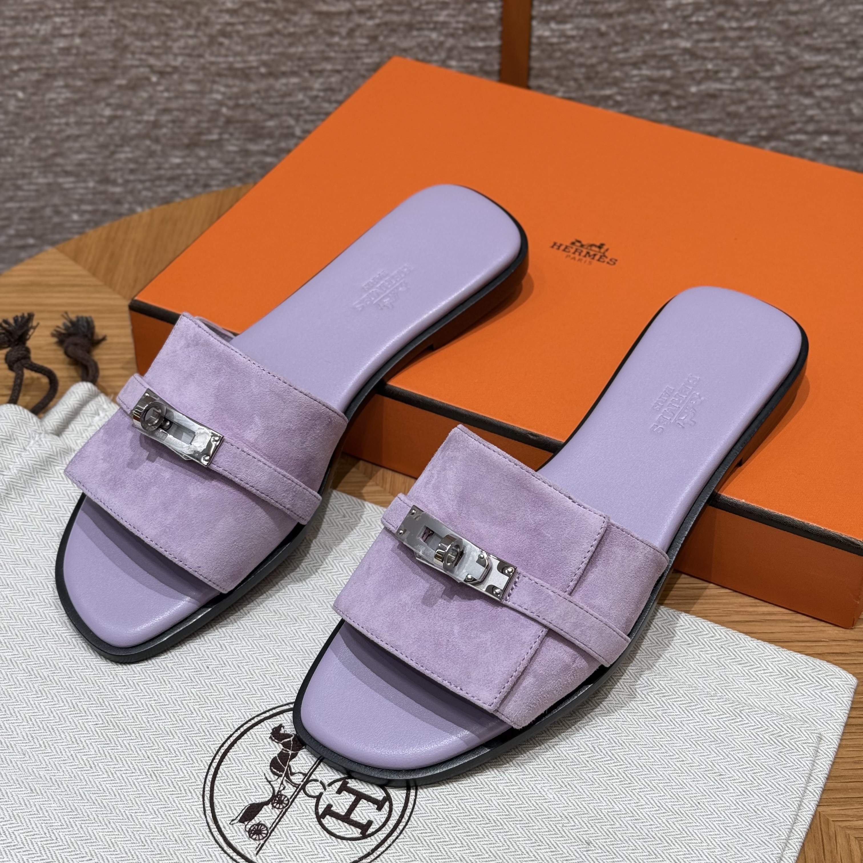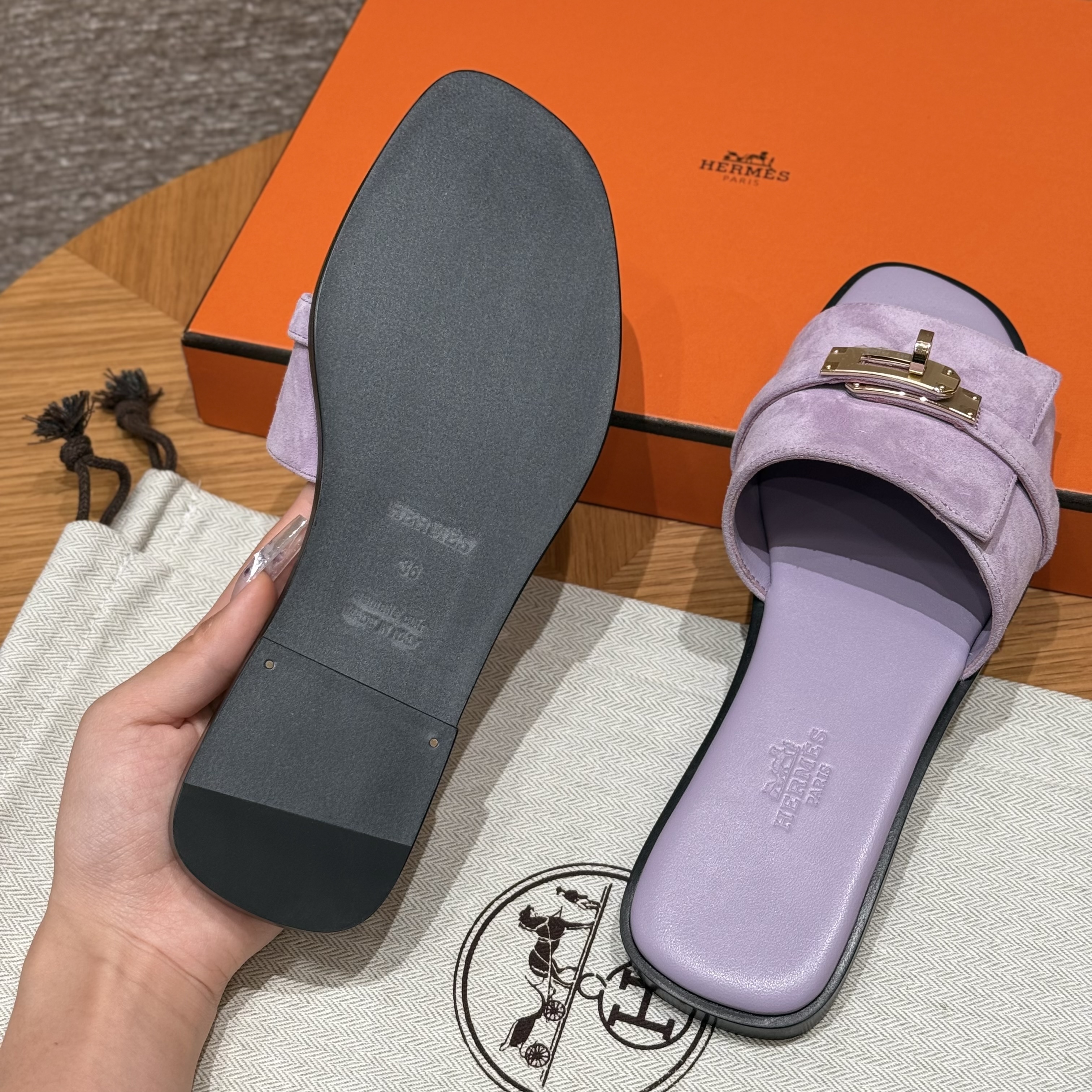 NIGO Hermes Giulia Women's Summer Solid Color Metal Buckle Round Toe Suede Leather Sandals Slippers Shoes #nigo77667