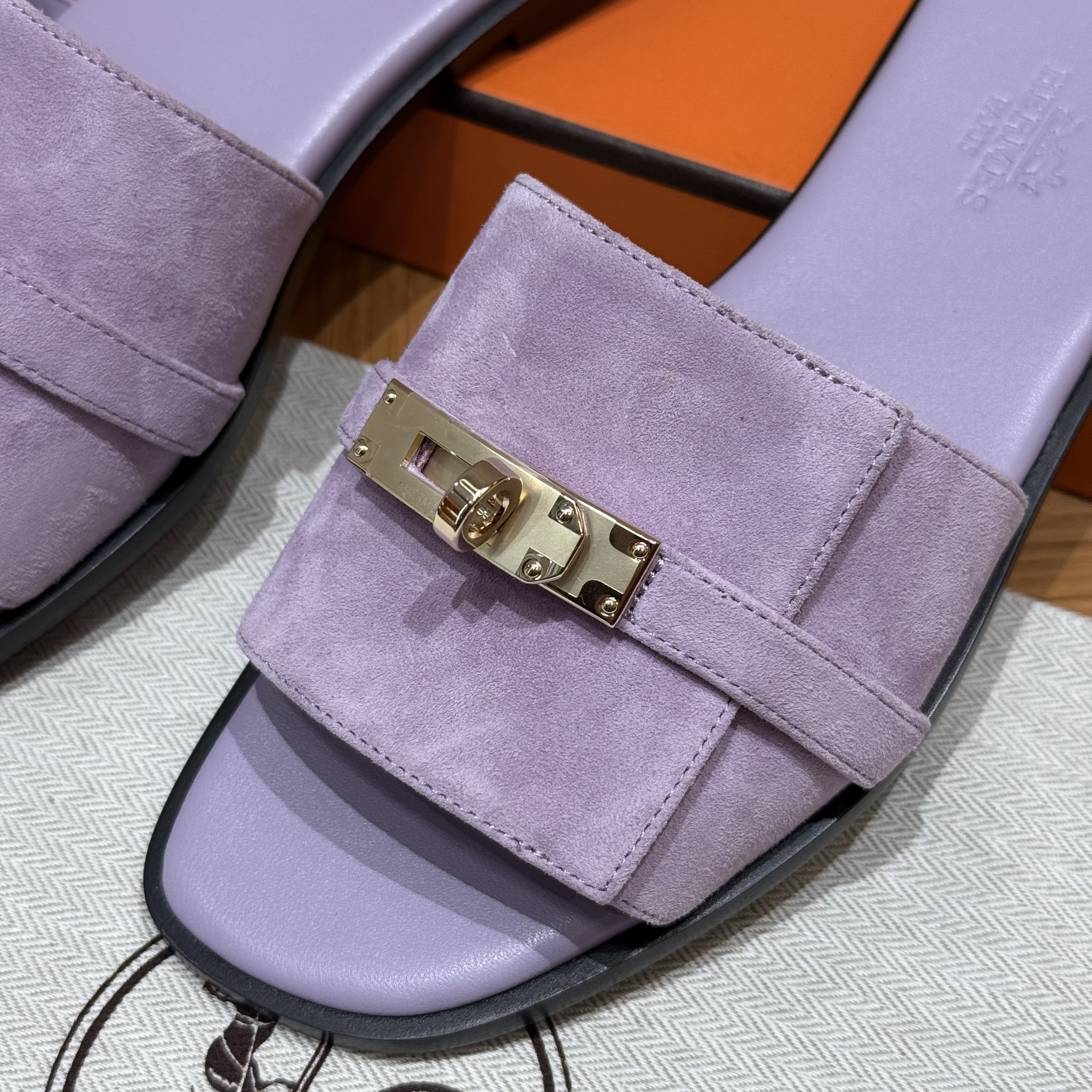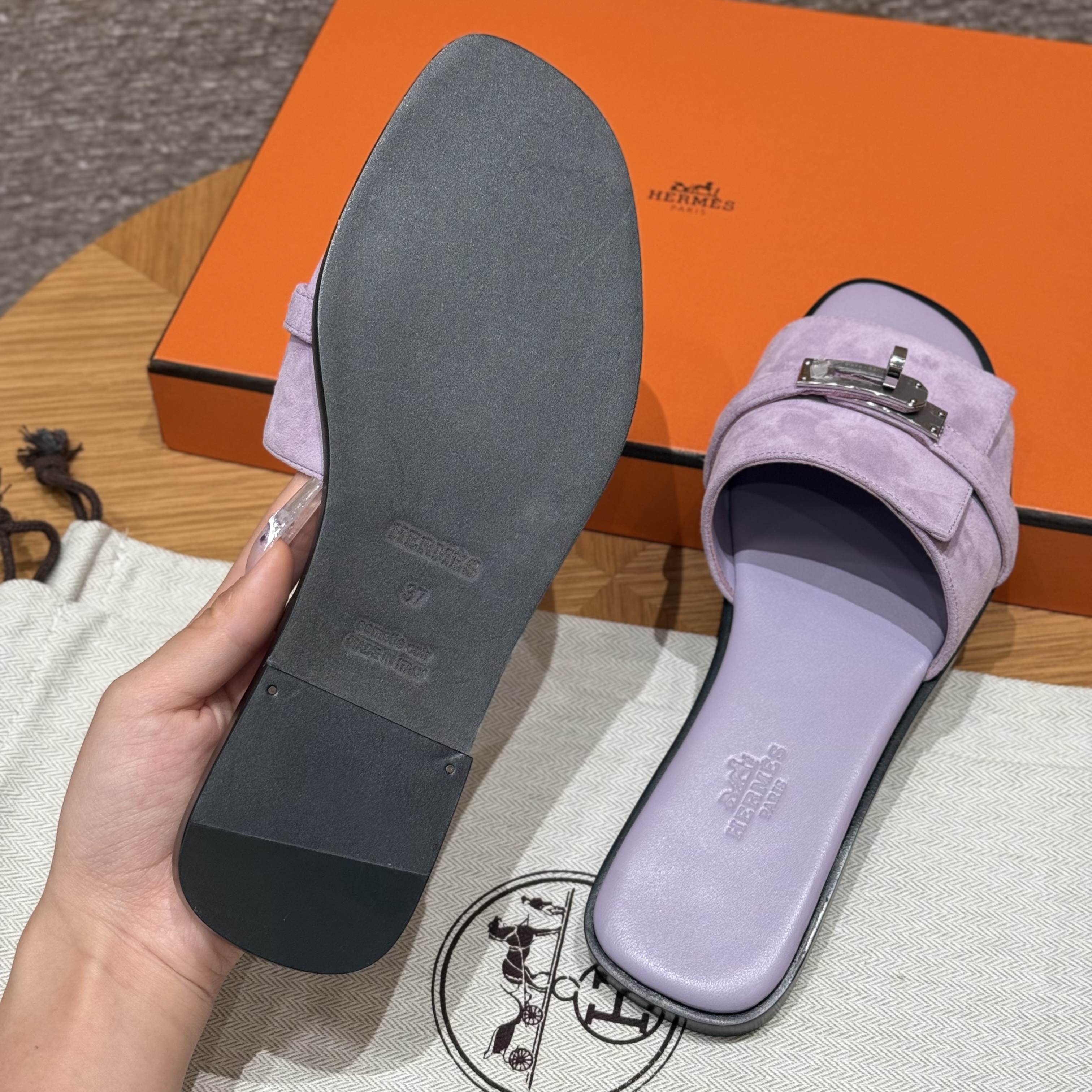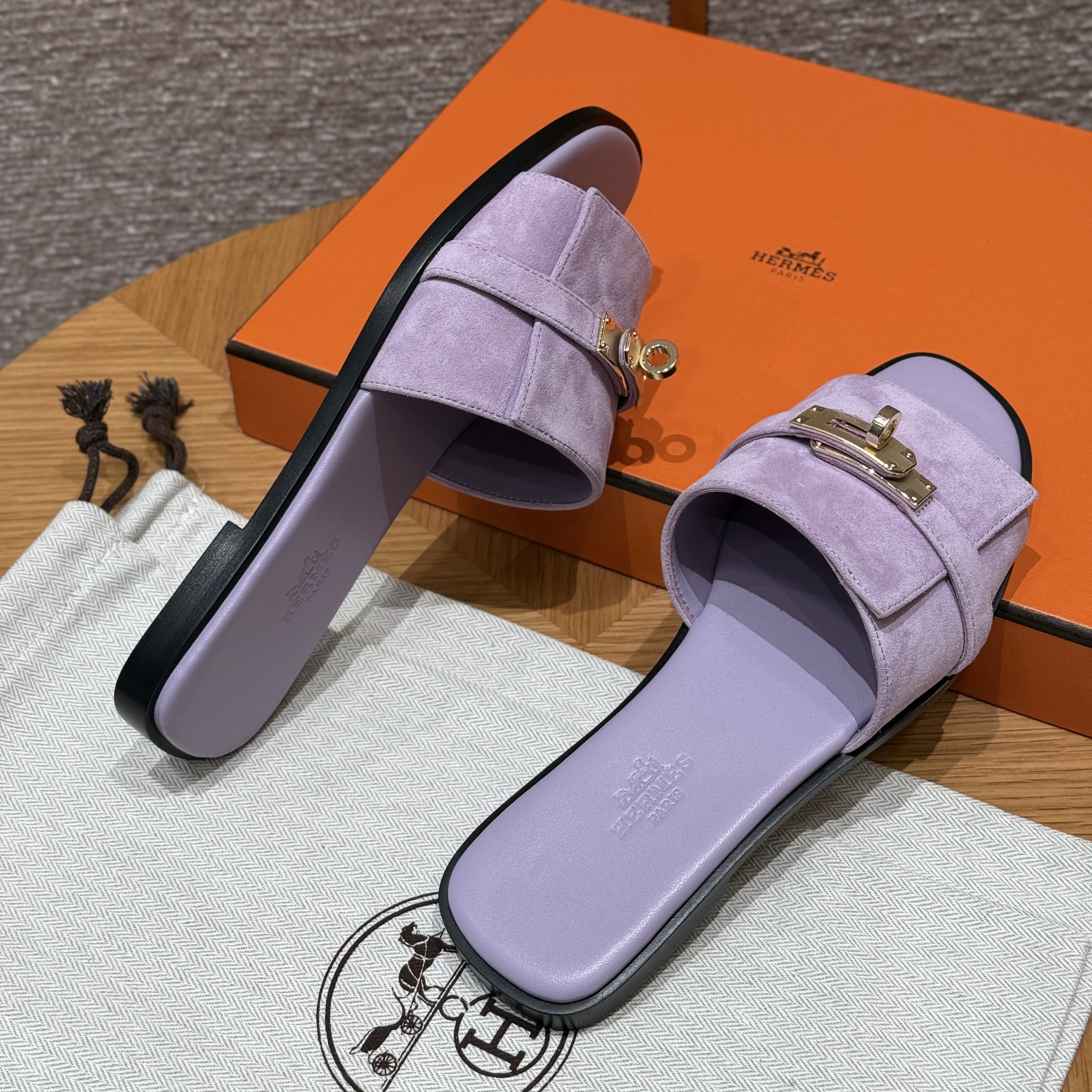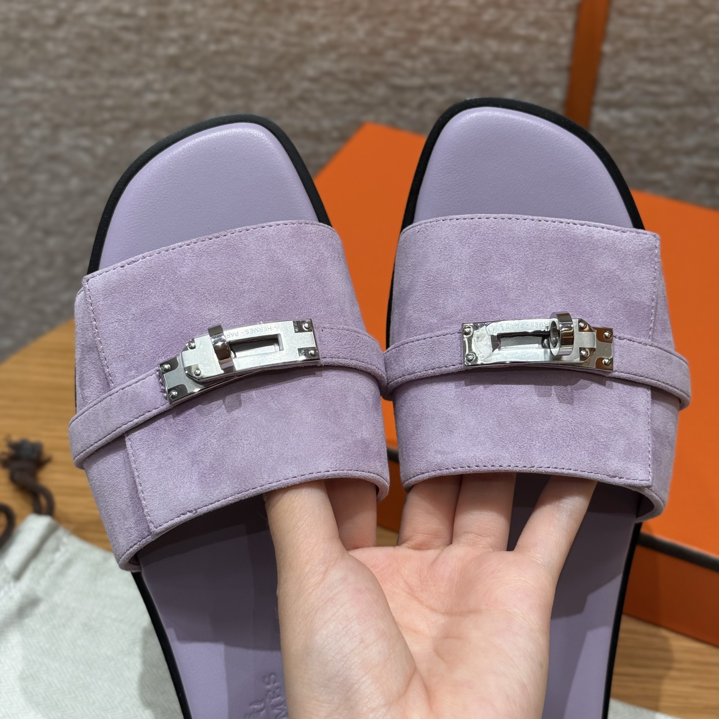 NIGO Hermes Giulia Women's Summer Solid Color Metal Buckle Round Toe Suede Leather Sandals Slippers Shoes #nigo77667