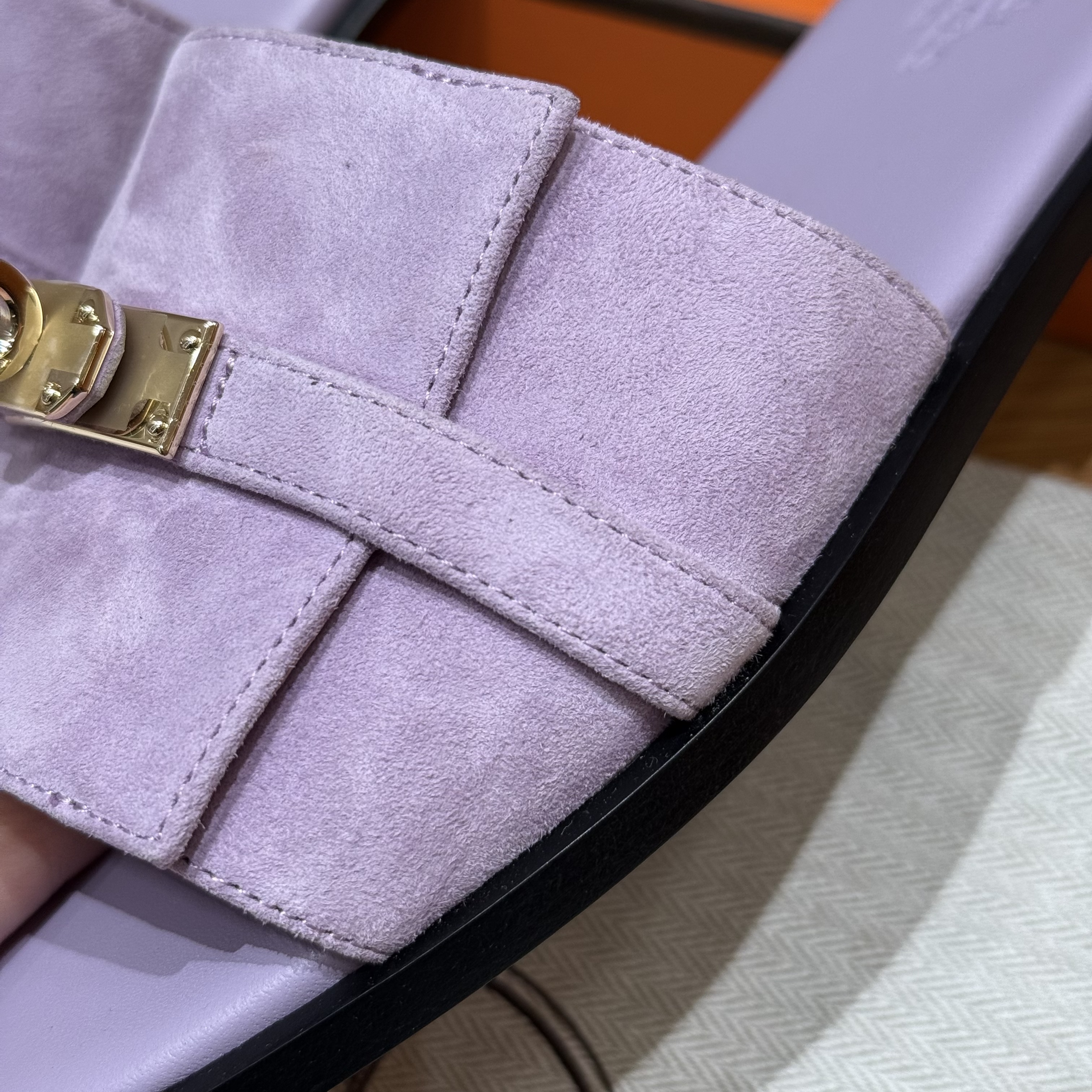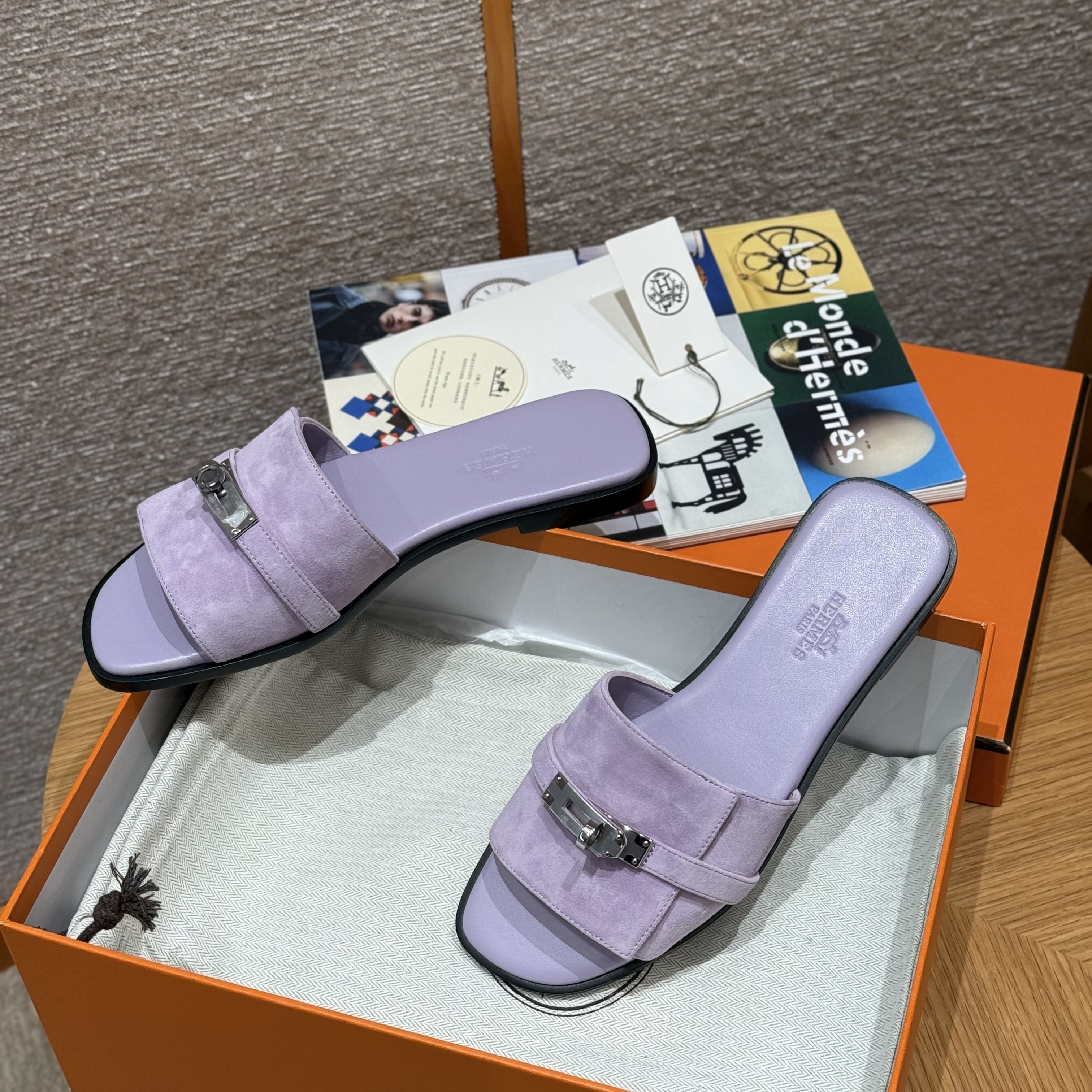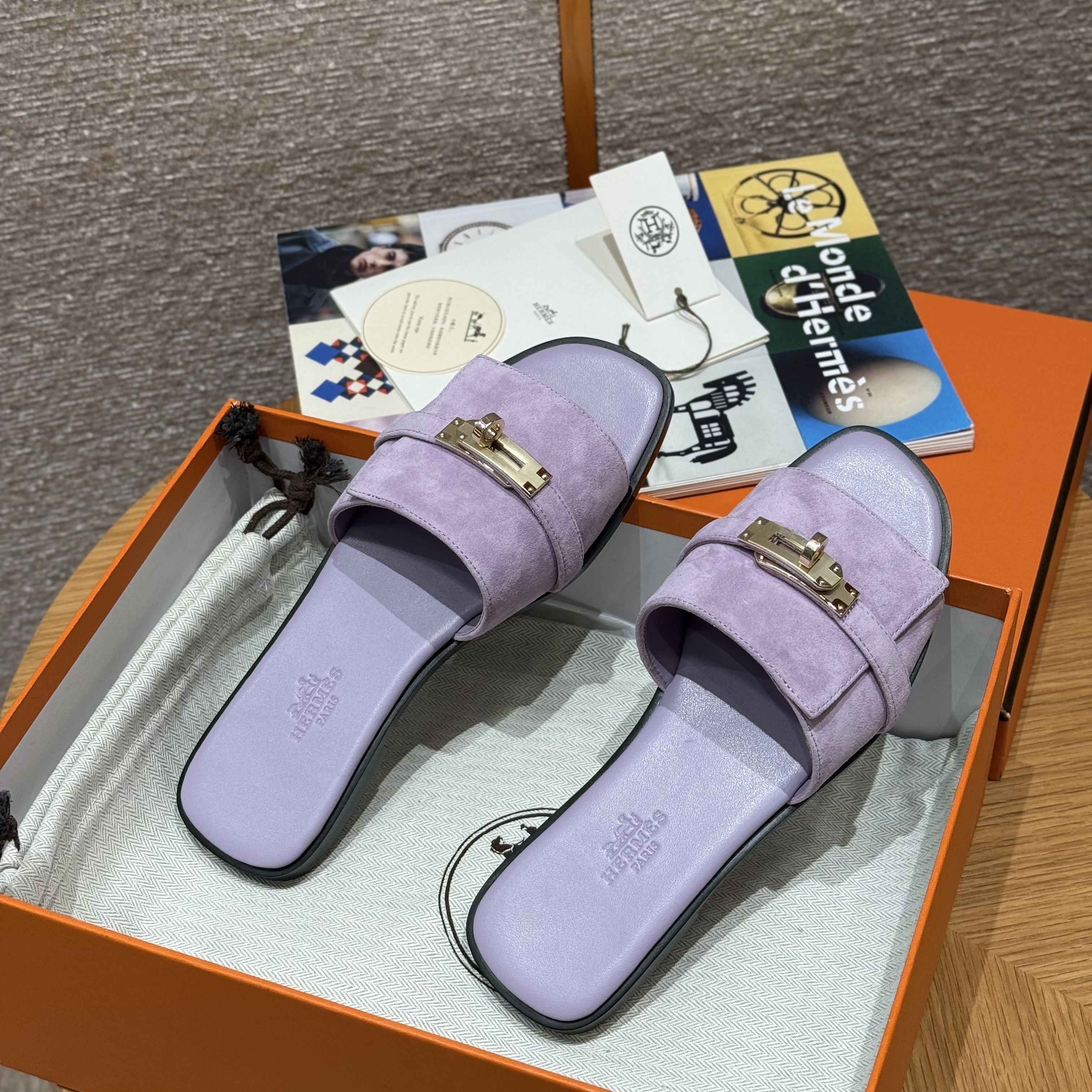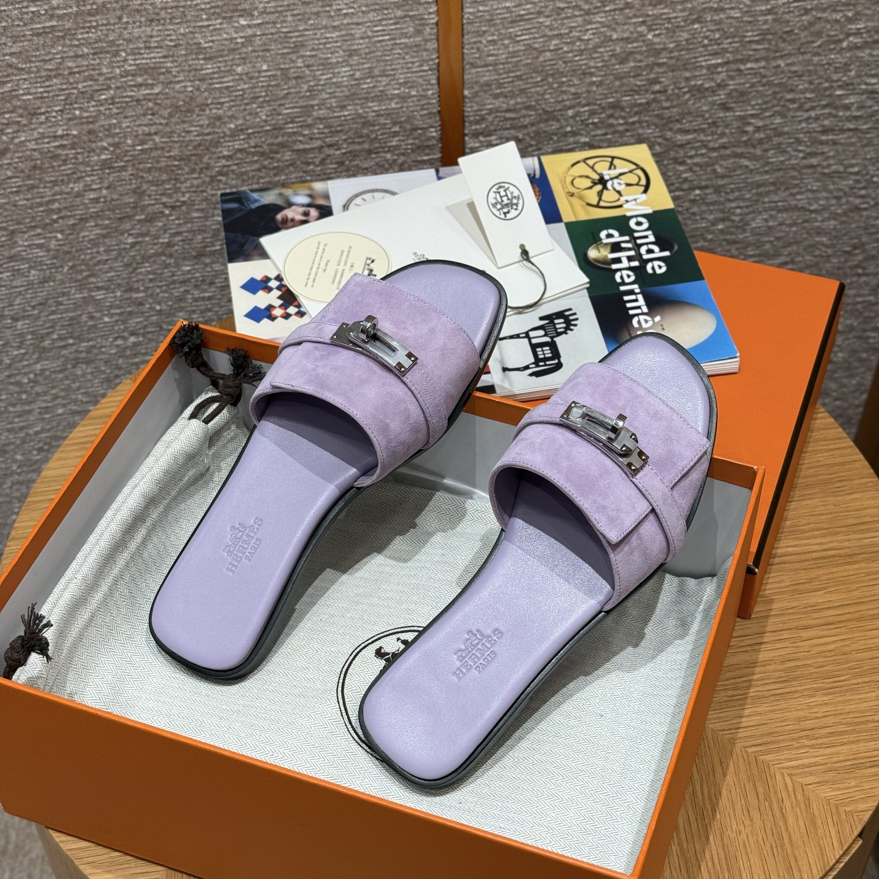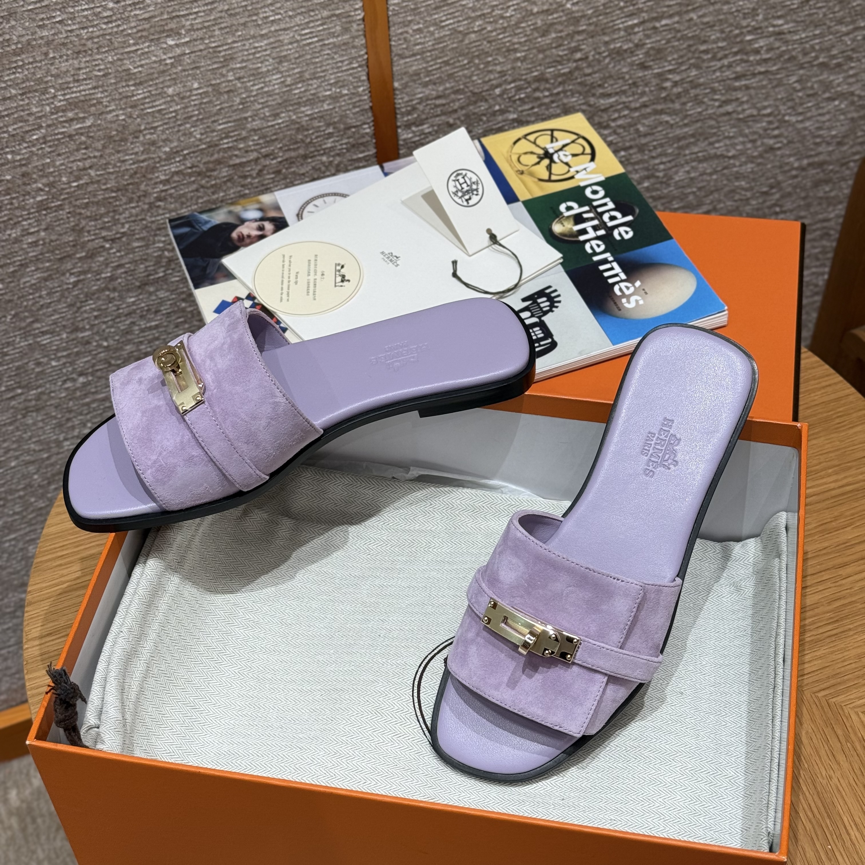 NIGO Hermes Giulia Women's Summer Solid Color Metal Buckle Round Toe Suede Leather Sandals Slippers Shoes #nigo77667