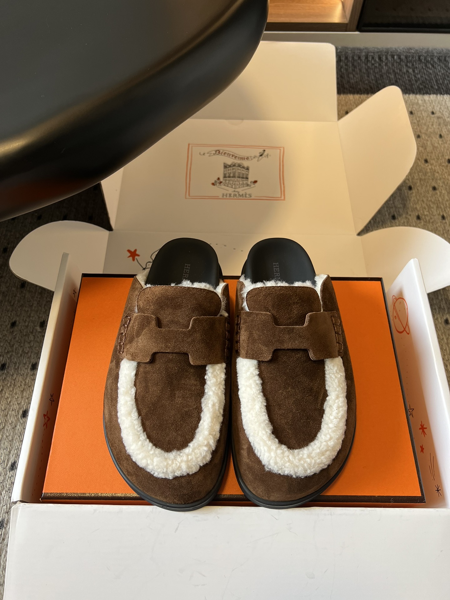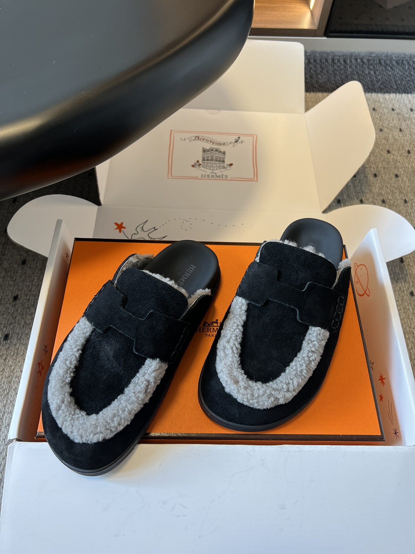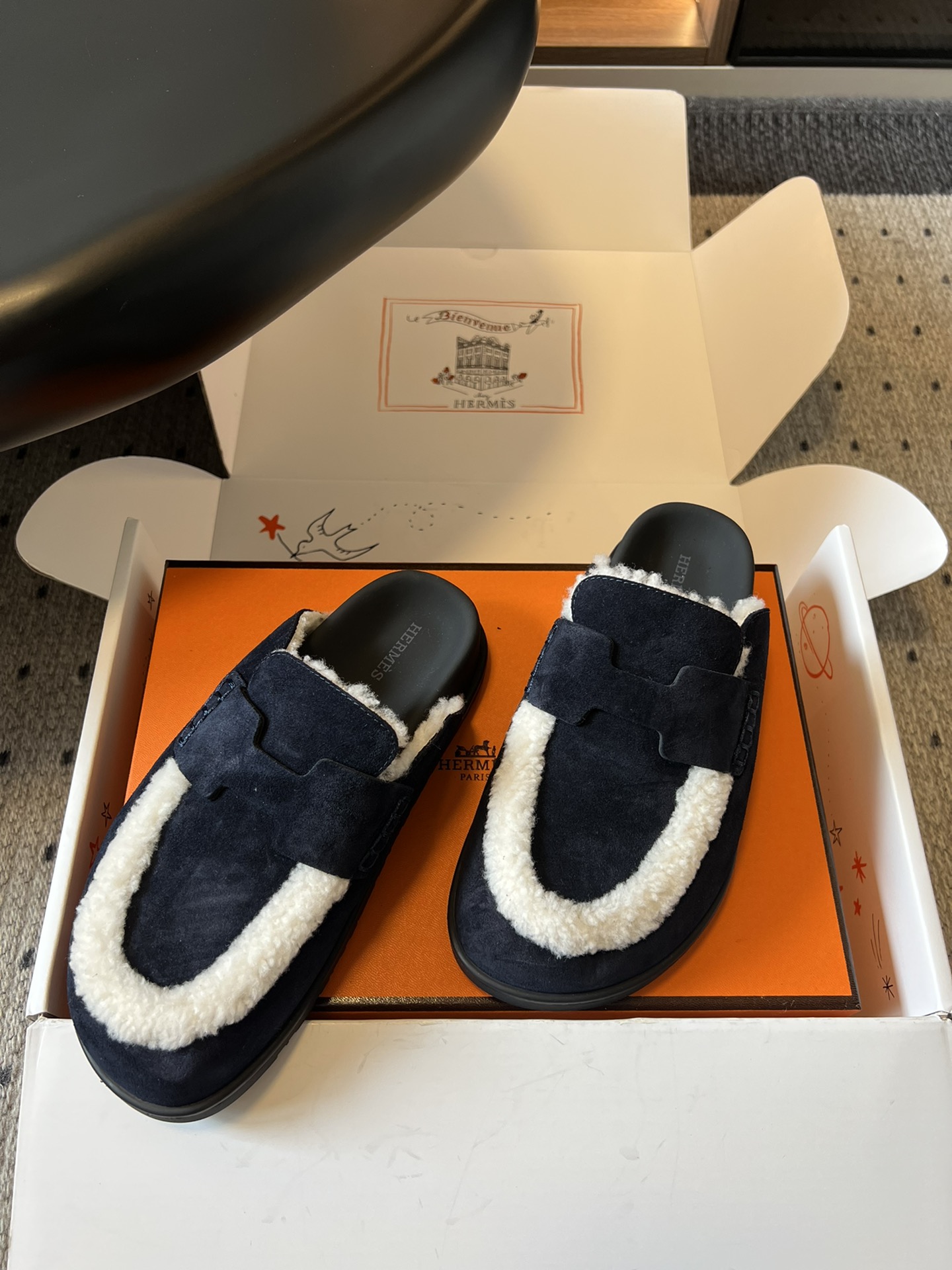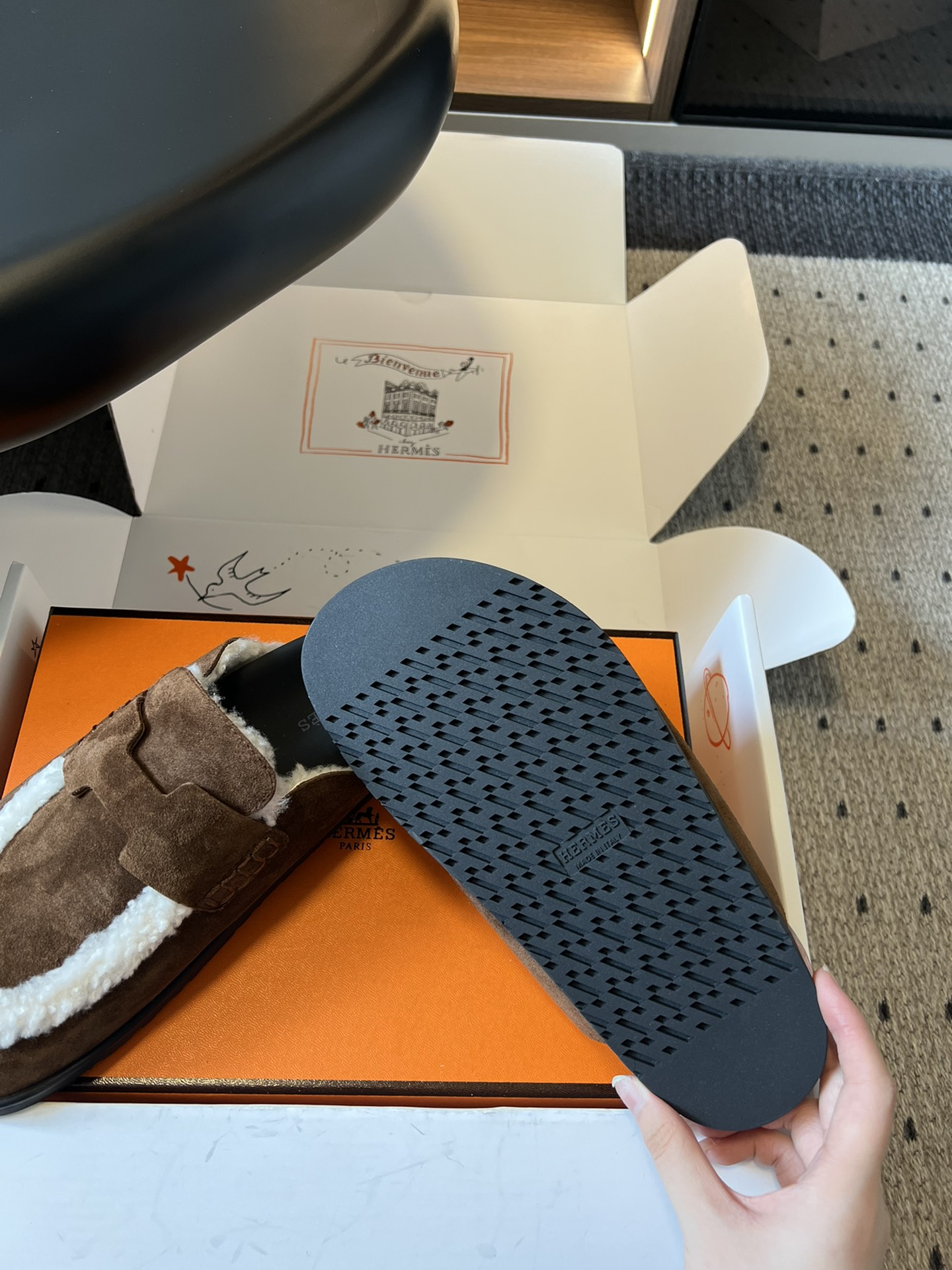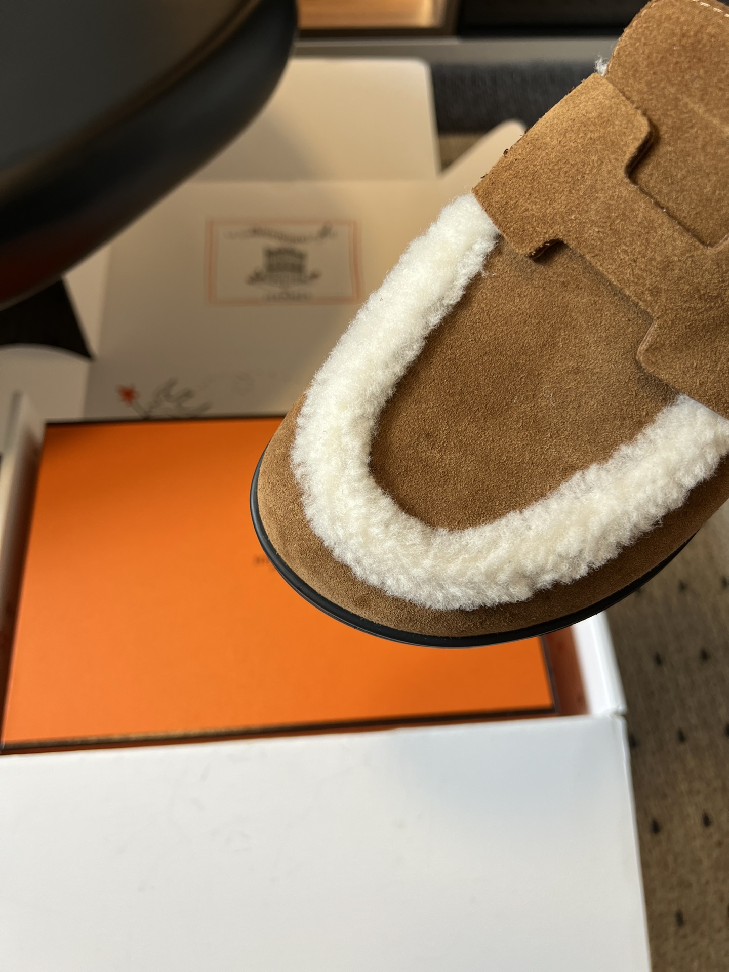NIGO Hermes Men's And Women's Winter Boken Shoes Round Toe Flat Heel Slippers Solid Color Suede Mule Go Shoes #nigo81519