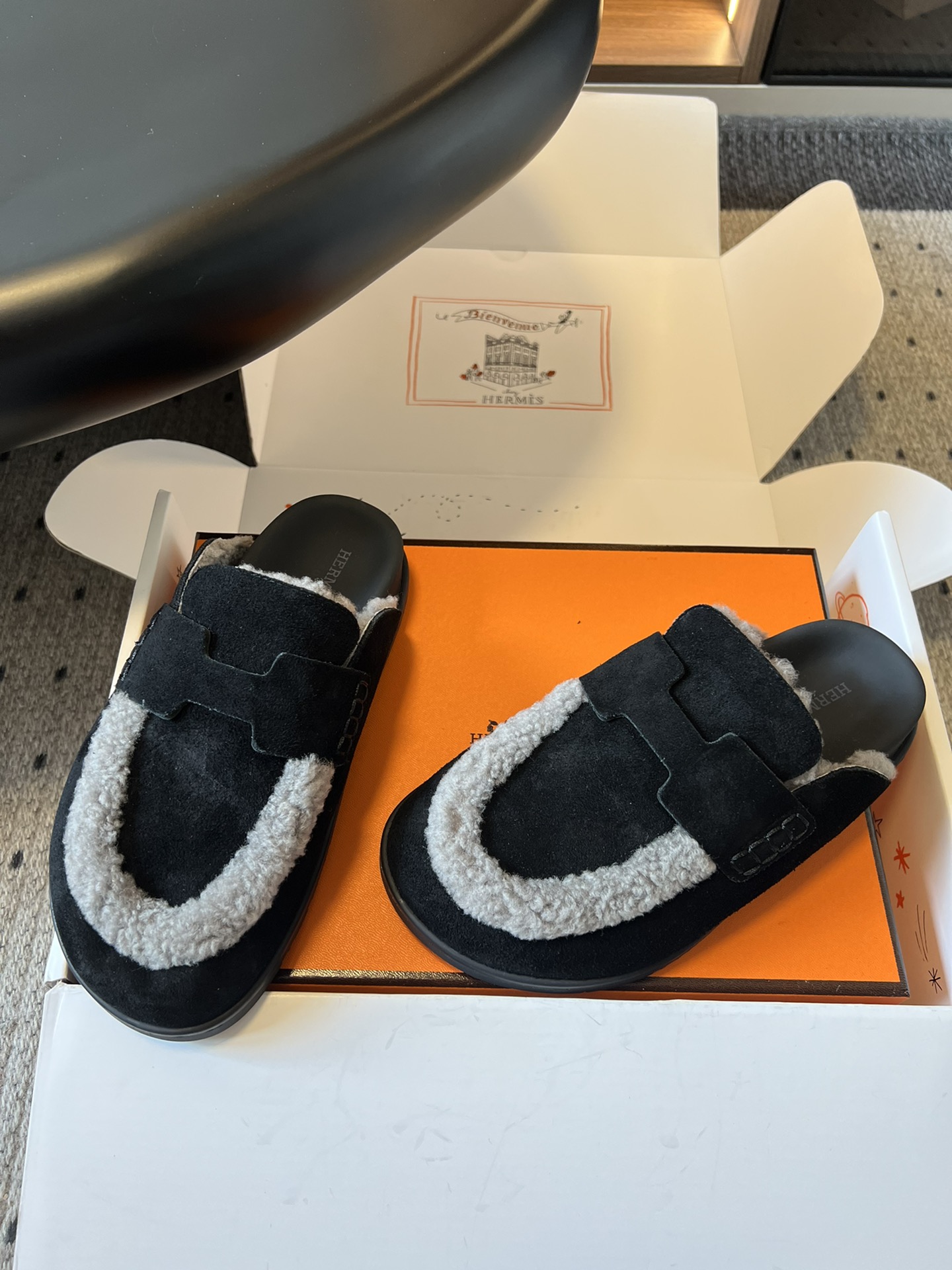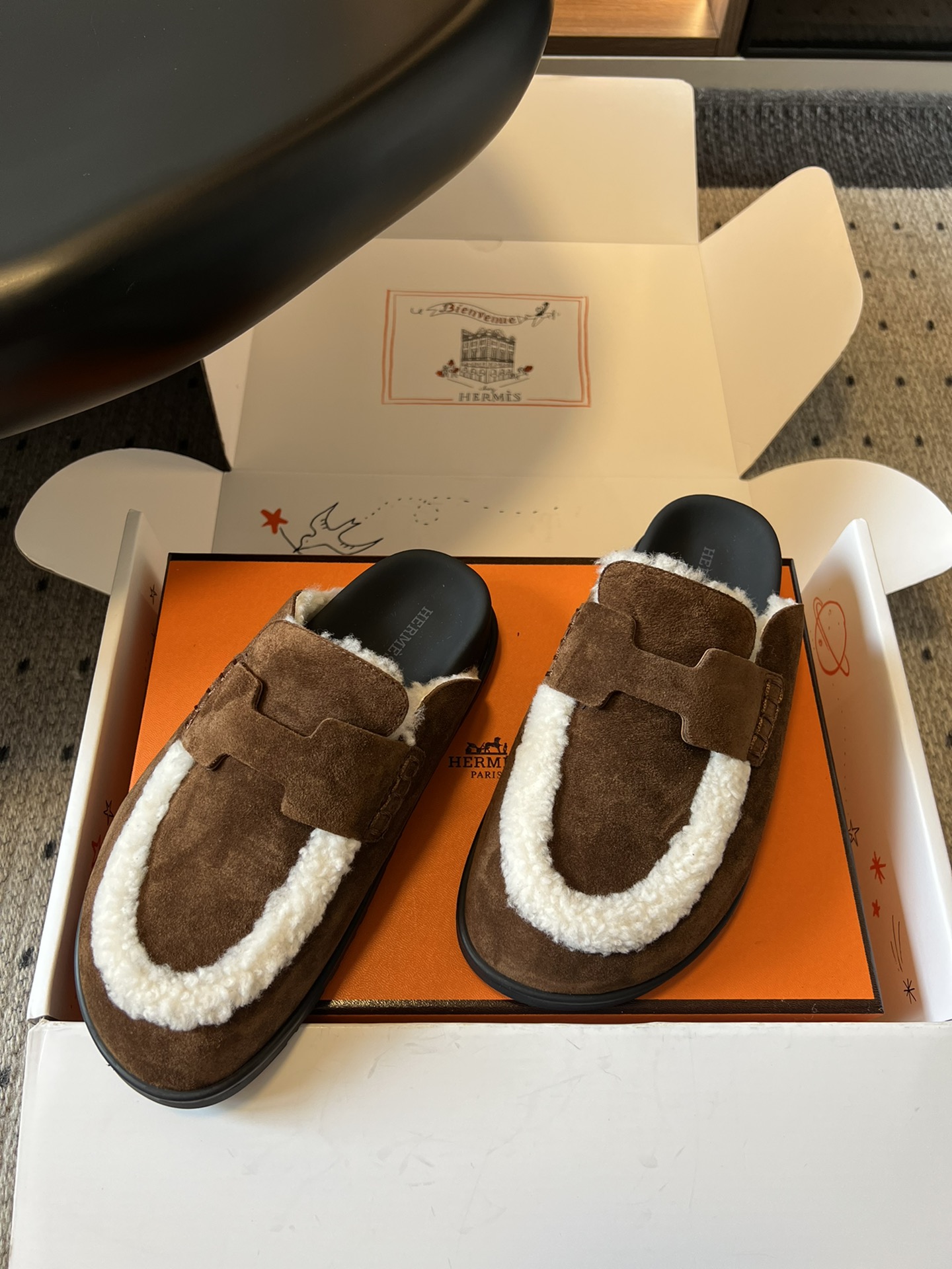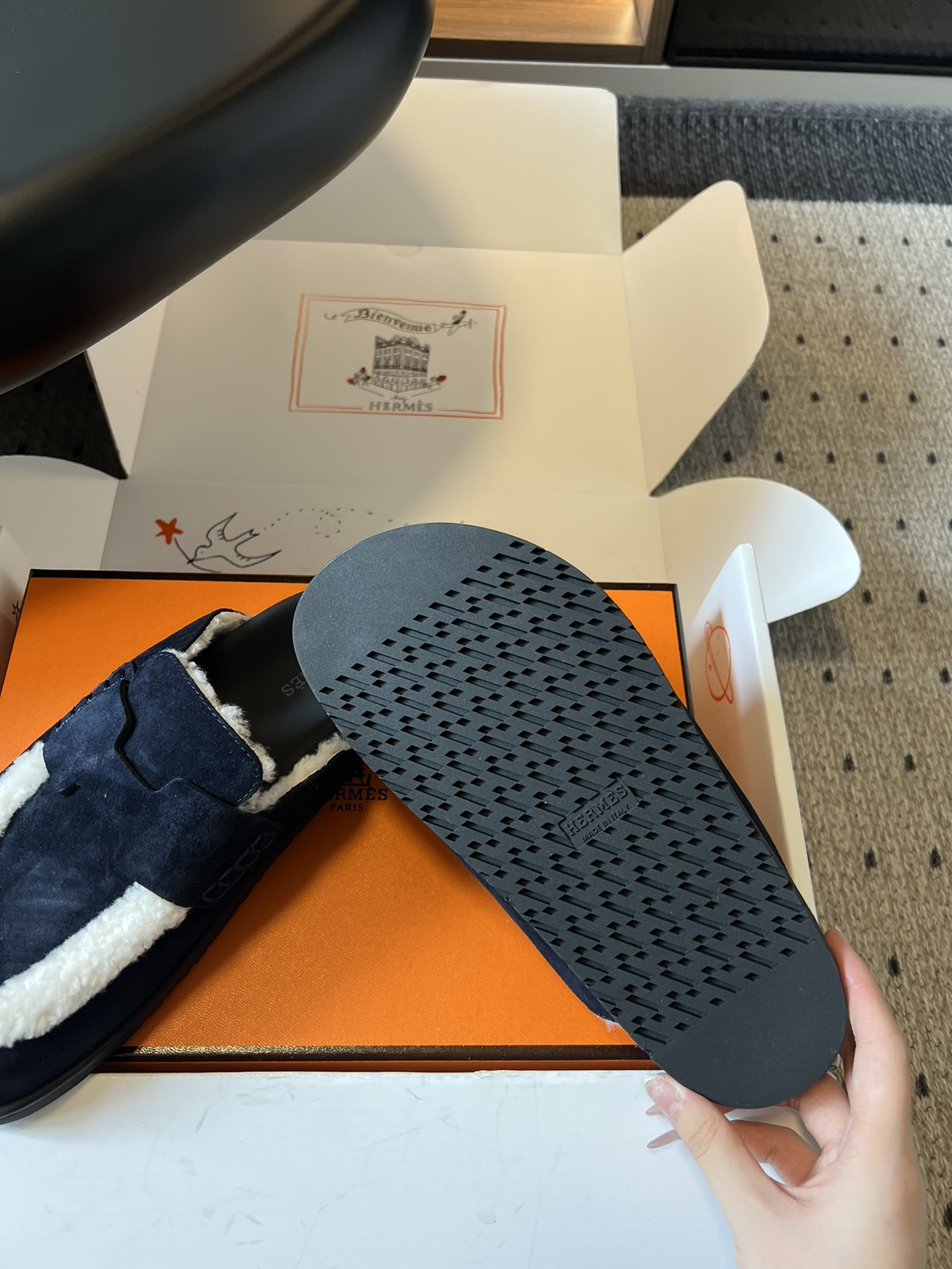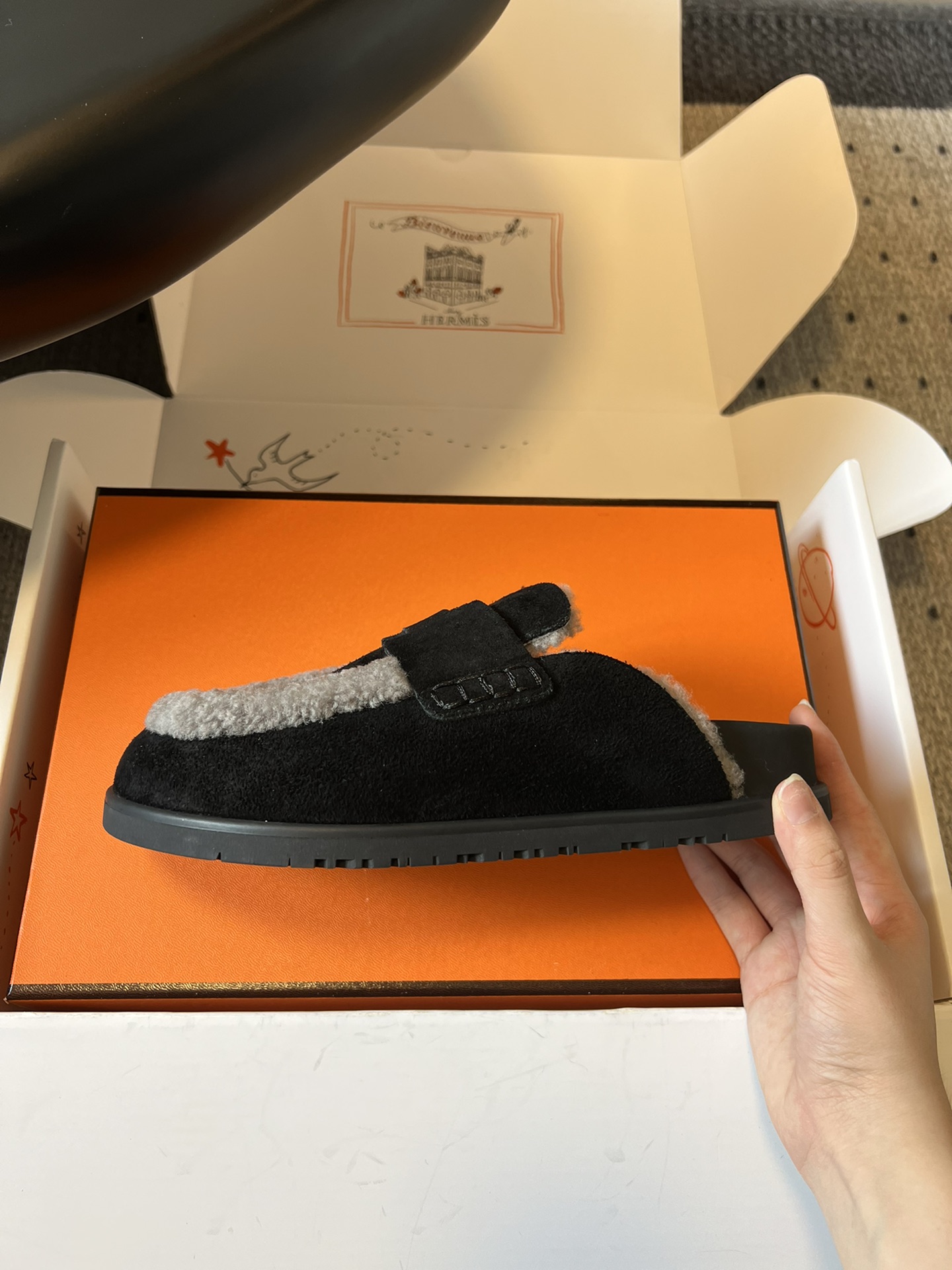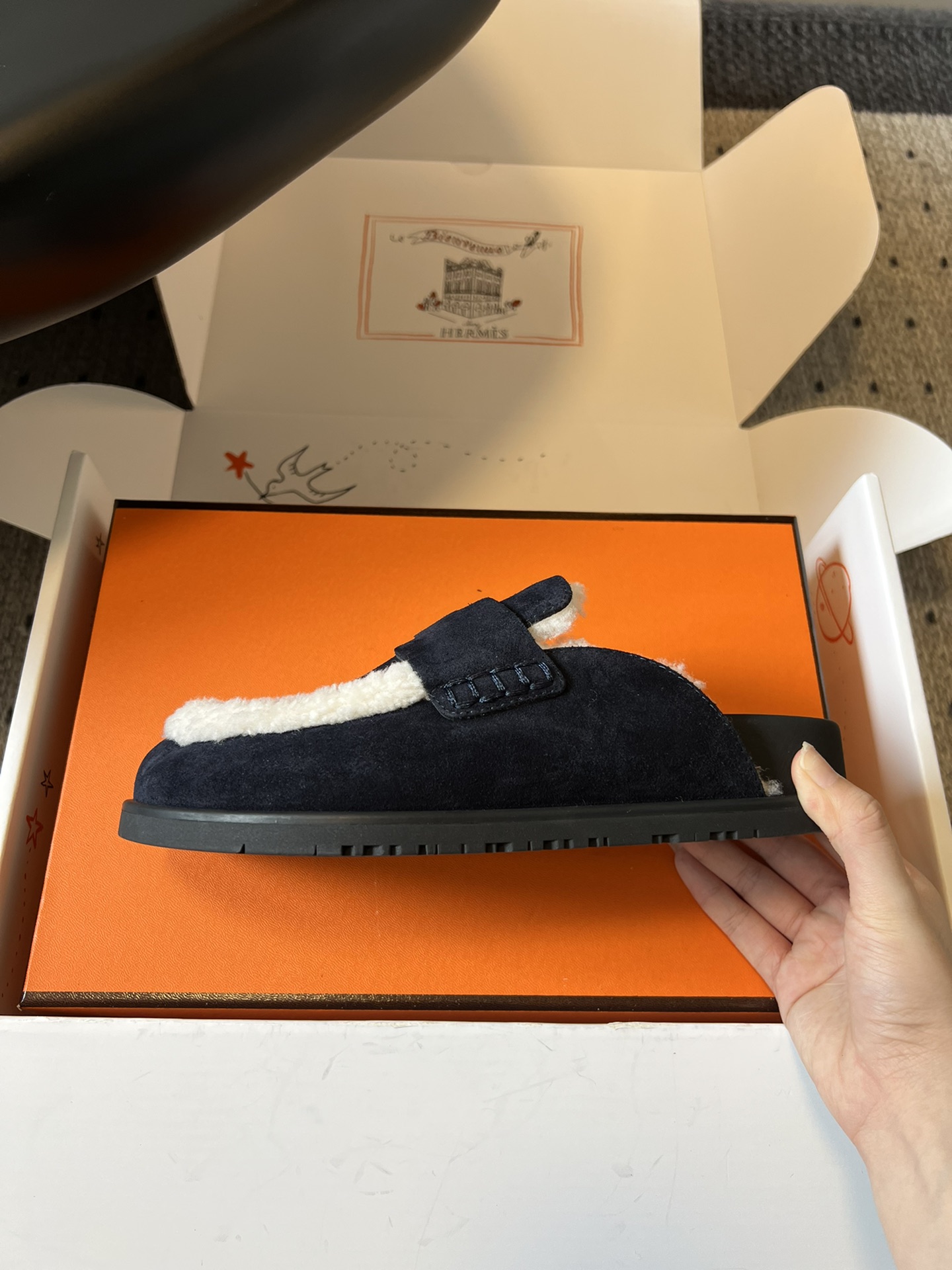 NIGO Hermes Men's And Women's Winter Boken Shoes Round Toe Flat Heel Slippers Solid Color Suede Mule Go Shoes #nigo81519