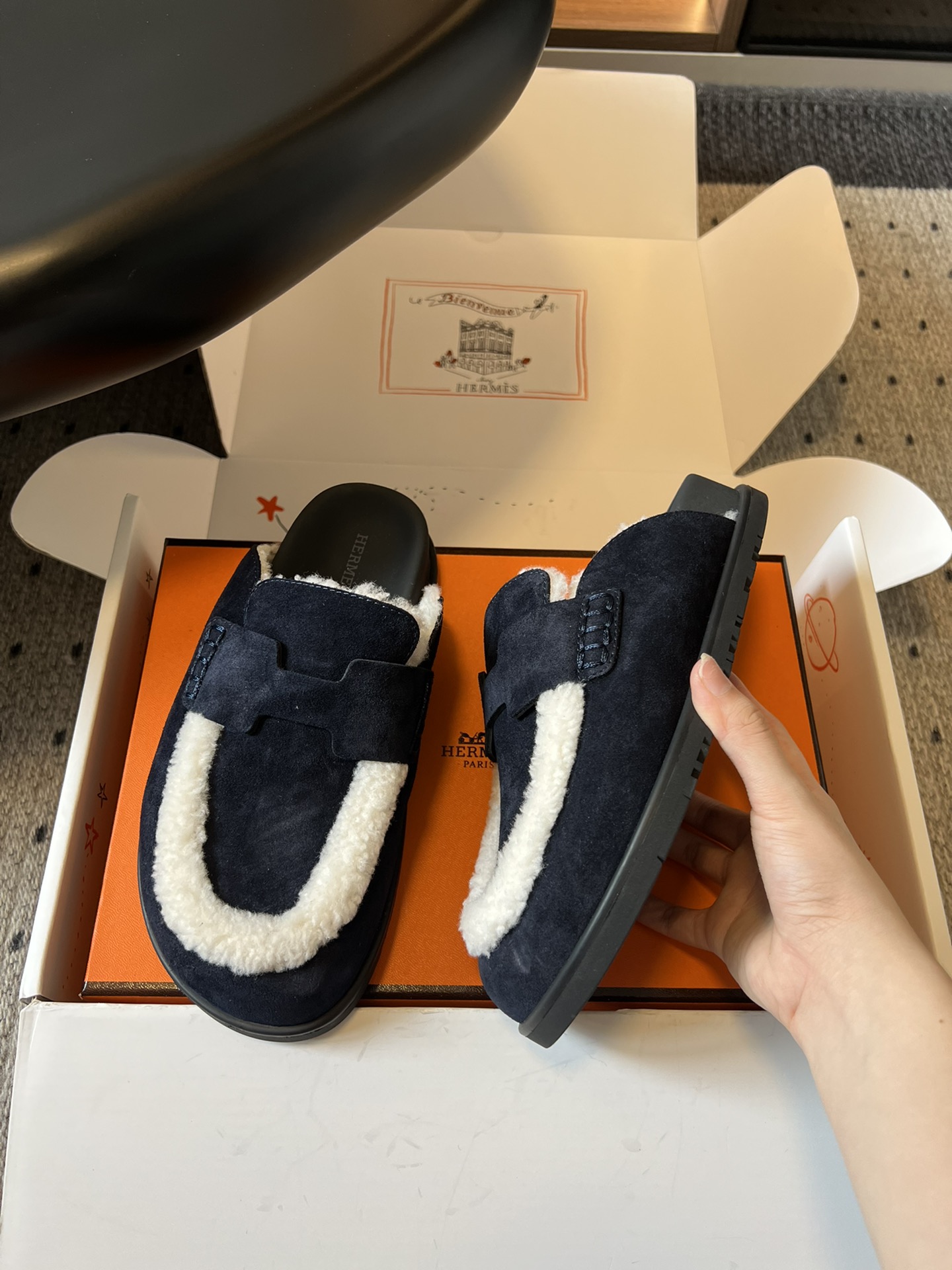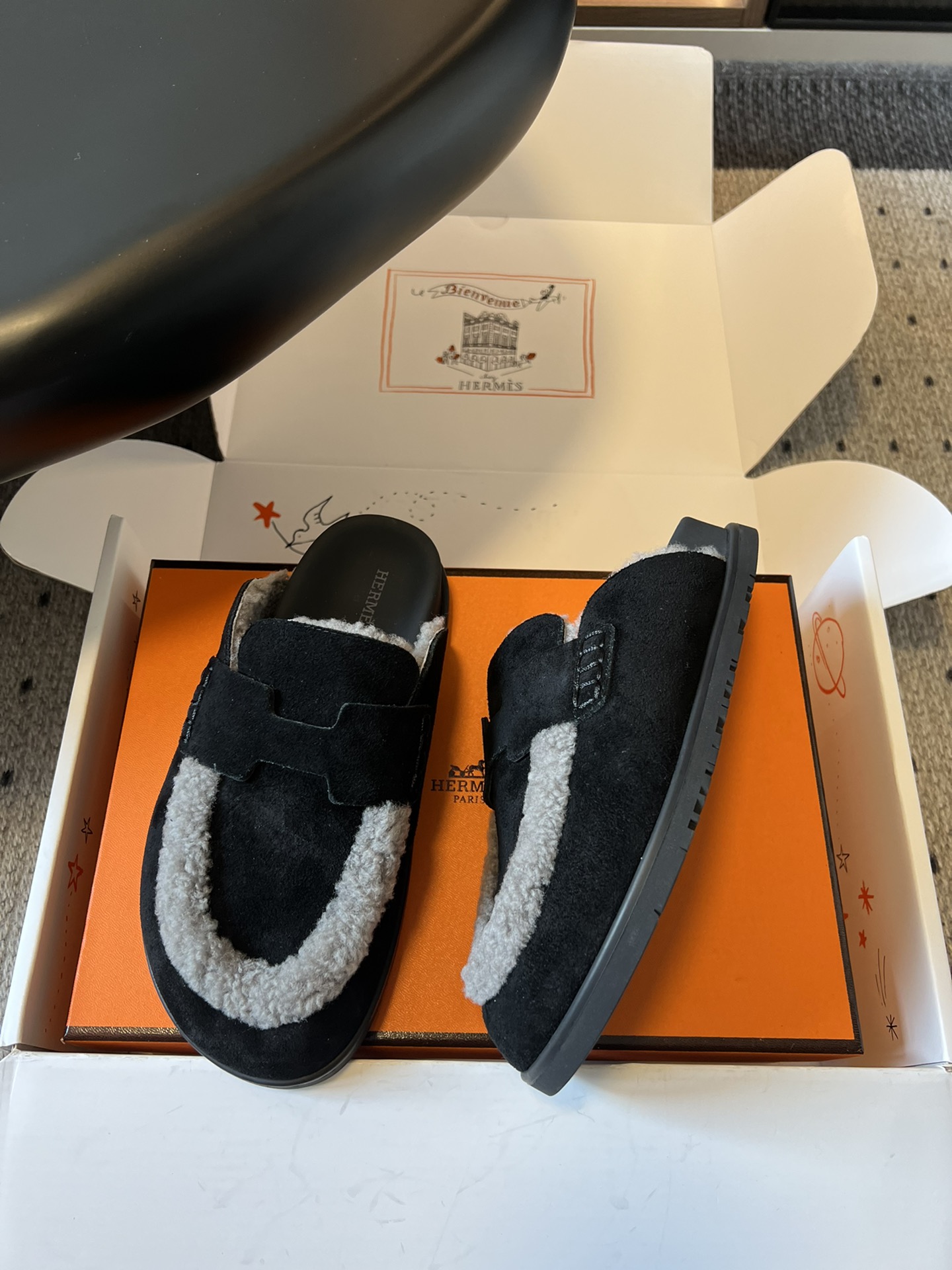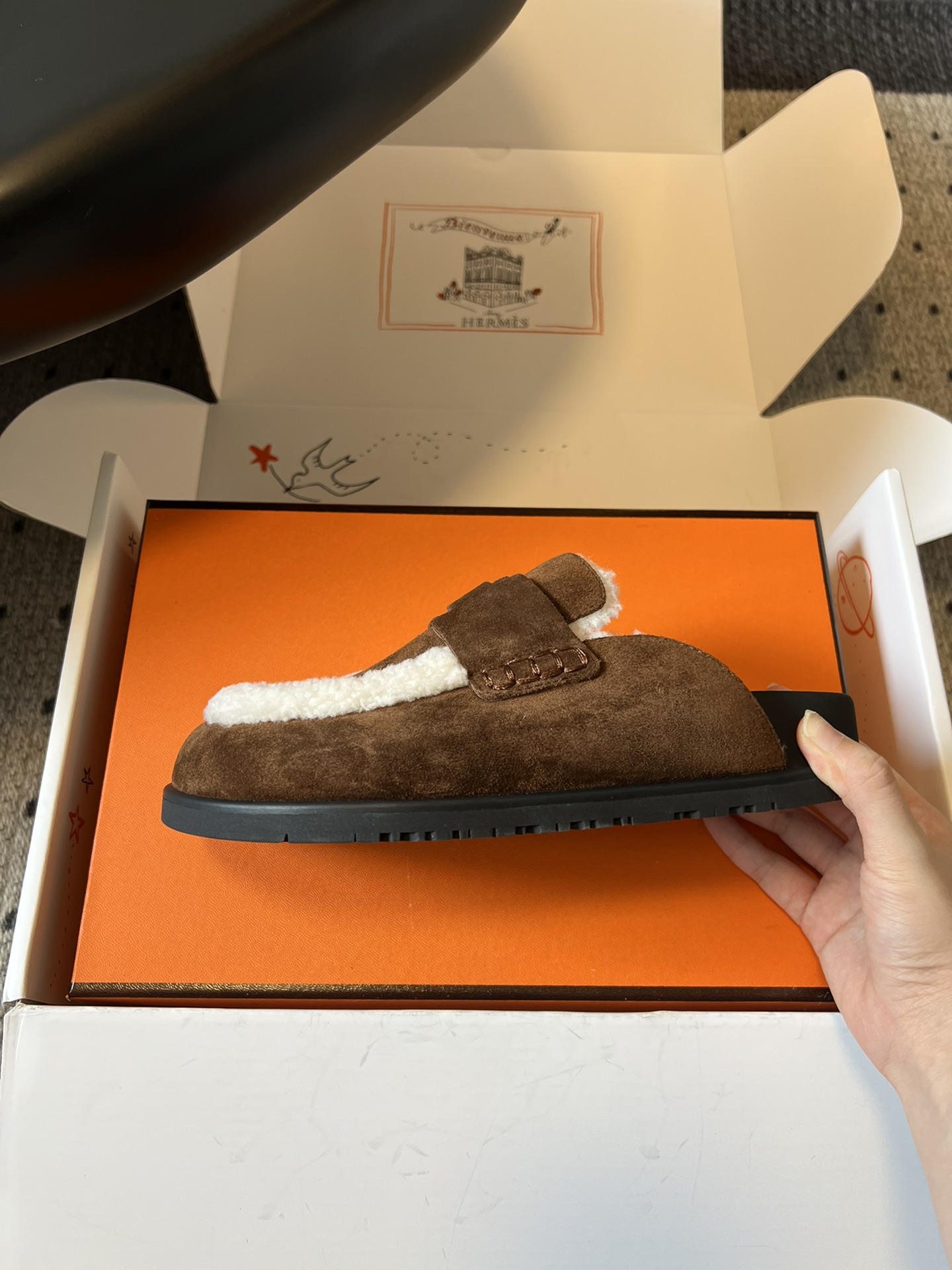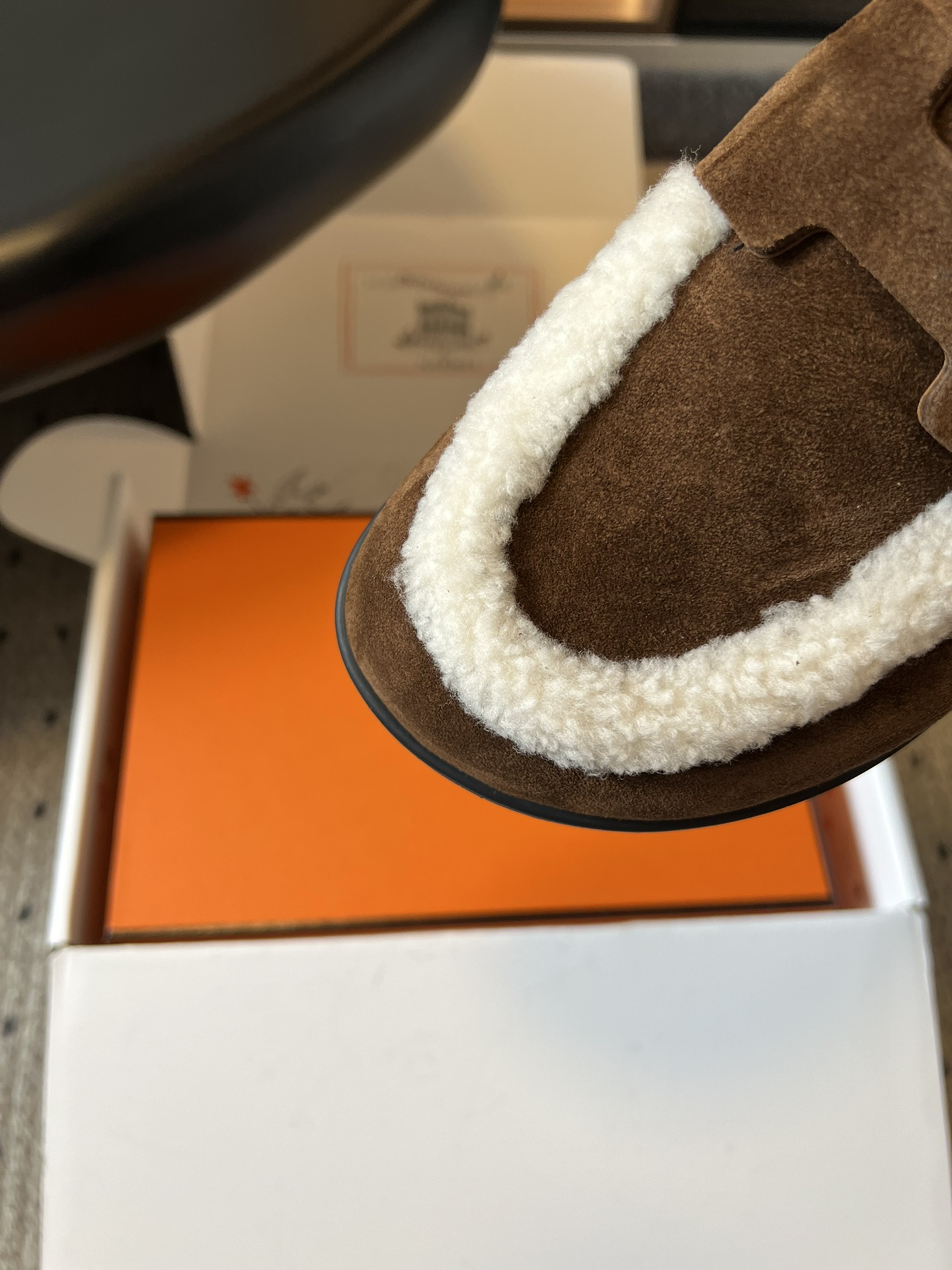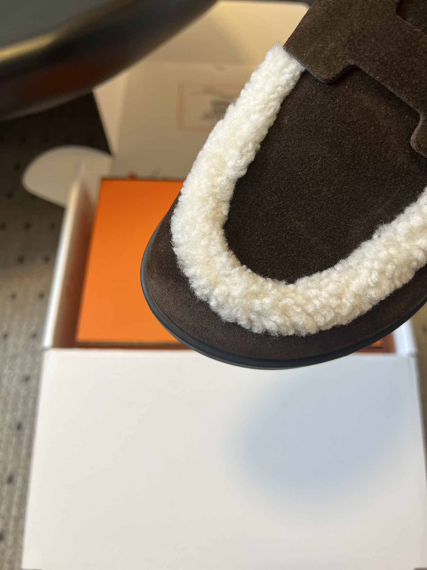 NIGO Hermes Men's And Women's Winter Boken Shoes Round Toe Flat Heel Slippers Solid Color Suede Mule Go Shoes #nigo81519