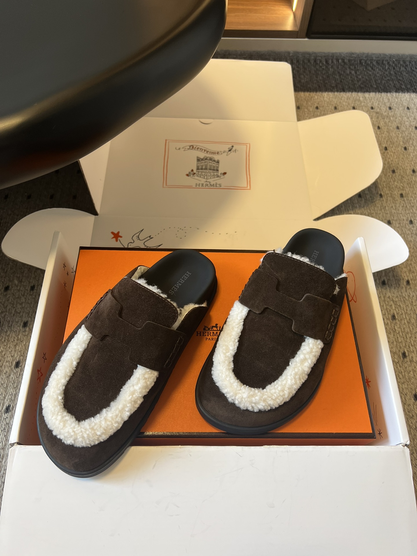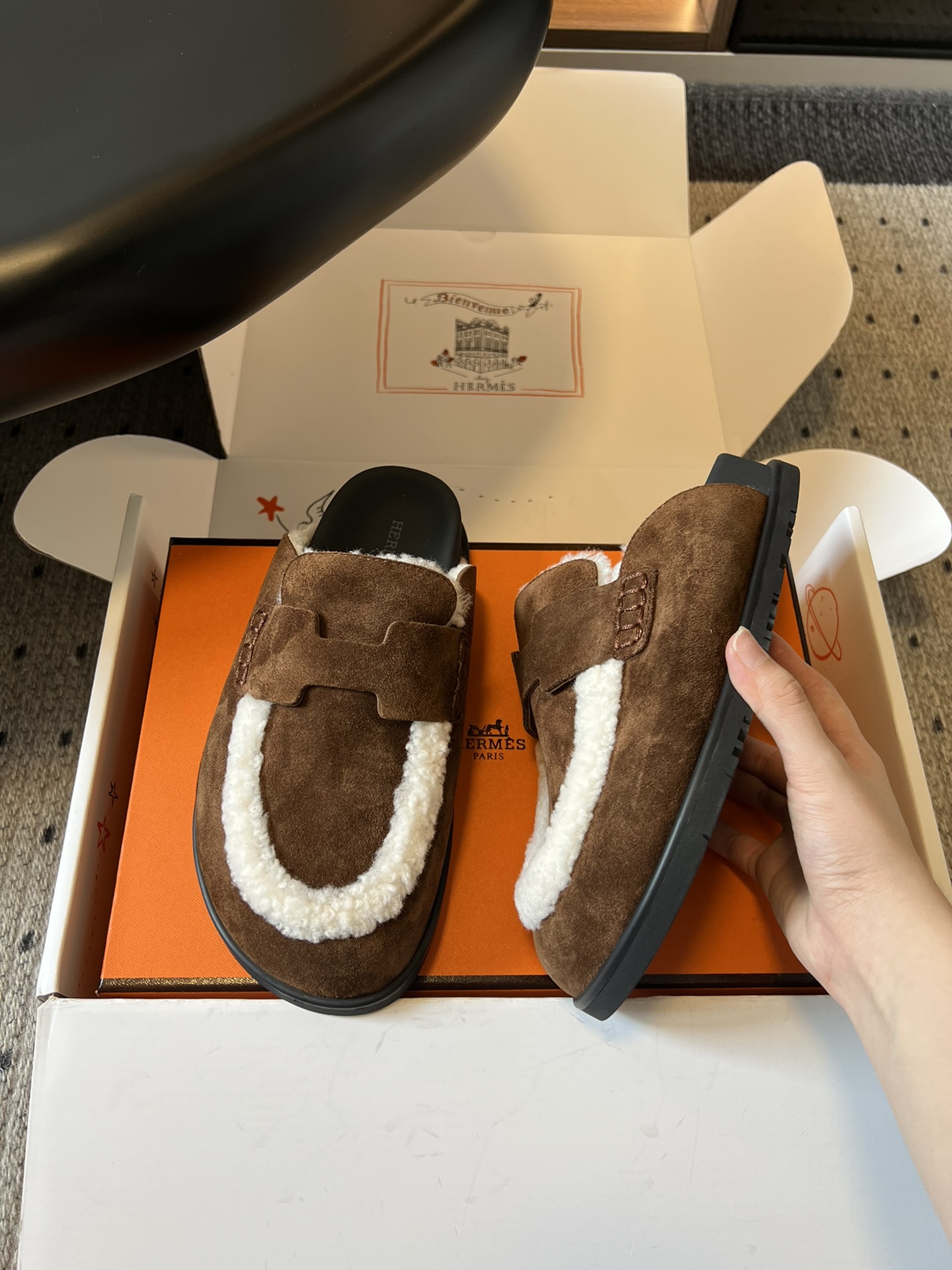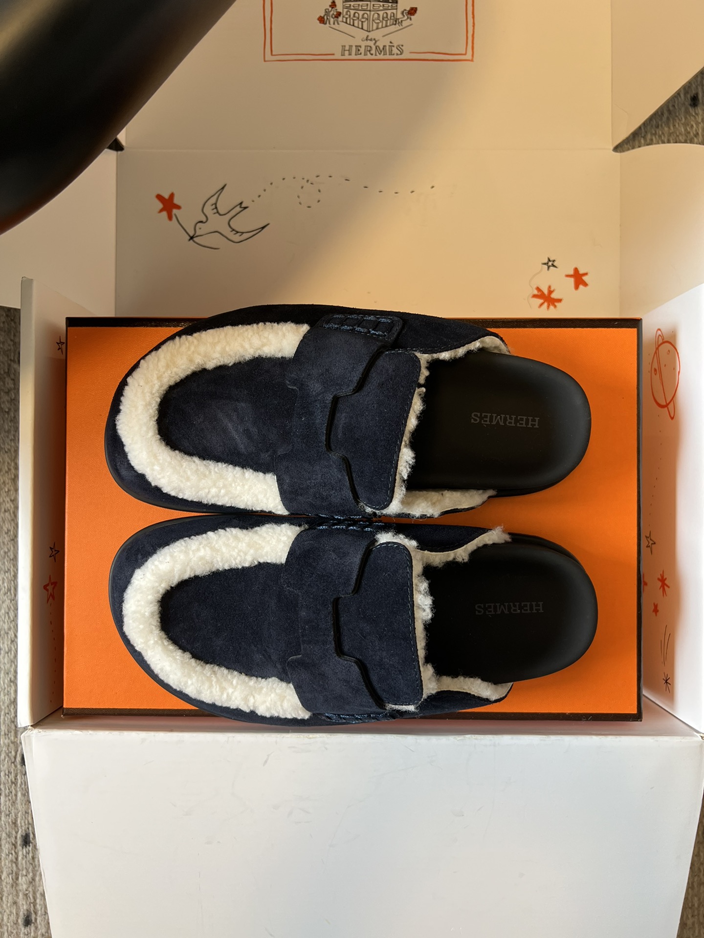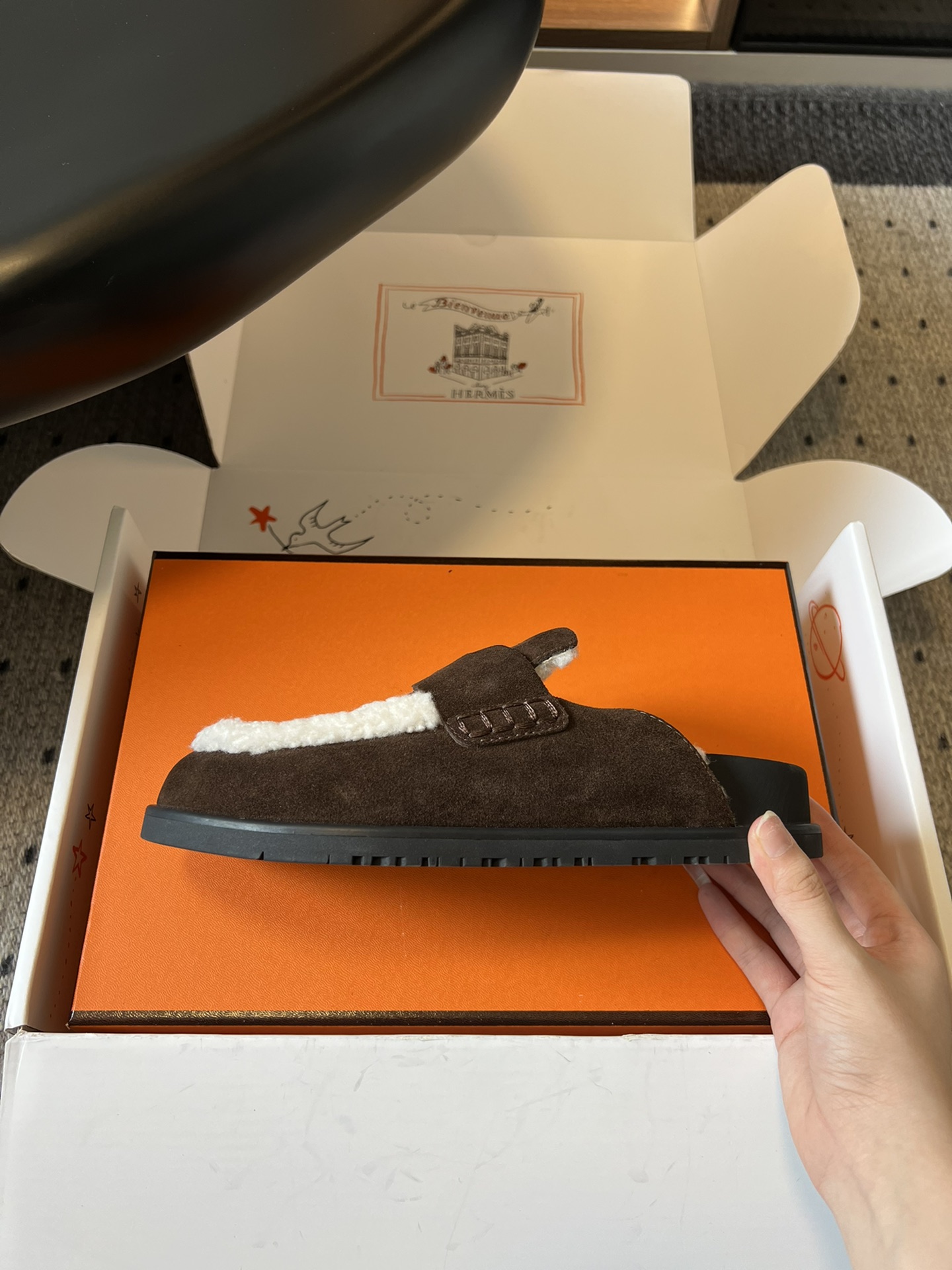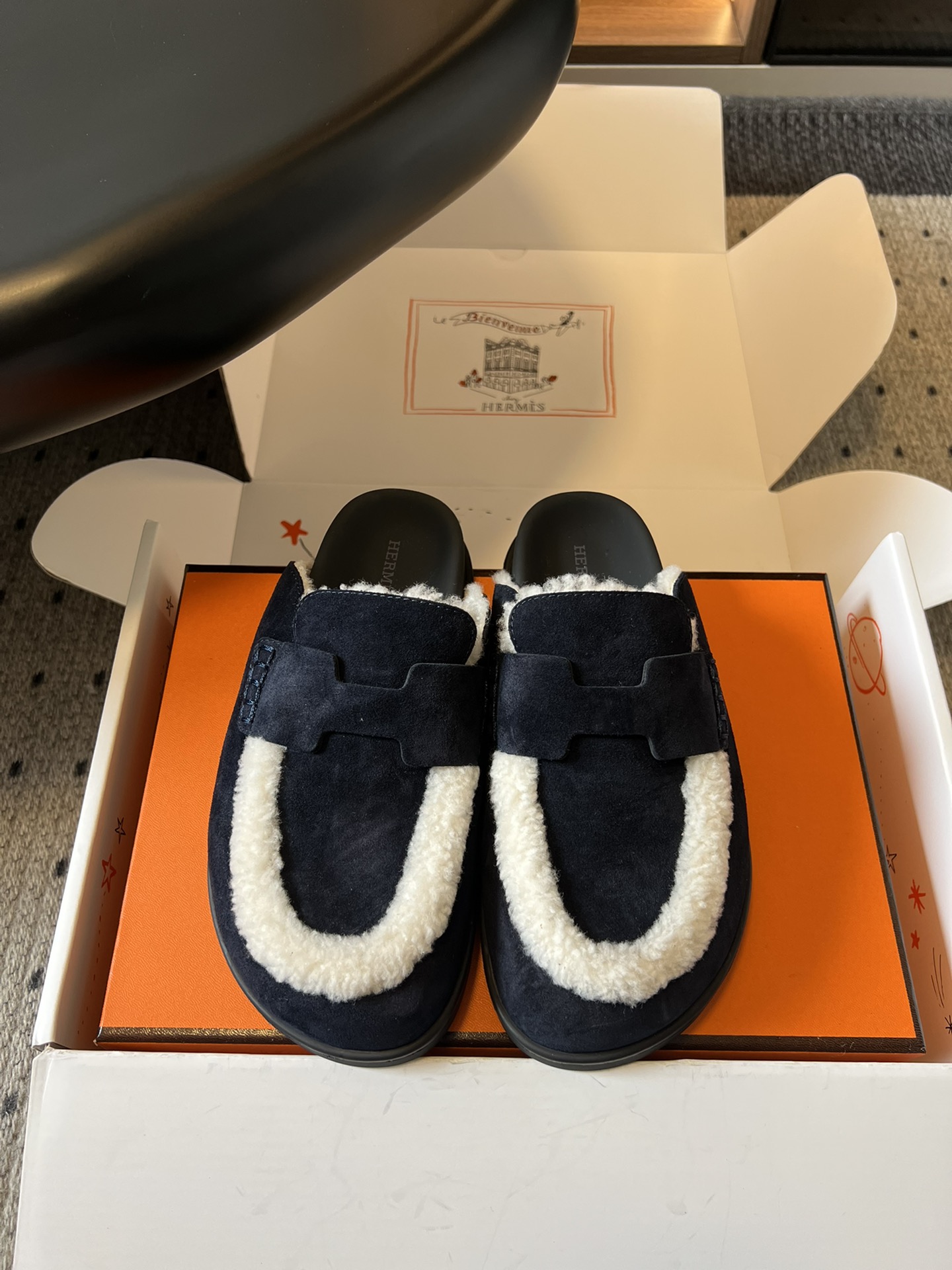 NIGO Hermes Men's And Women's Winter Boken Shoes Round Toe Flat Heel Slippers Solid Color Suede Mule Go Shoes #nigo81519