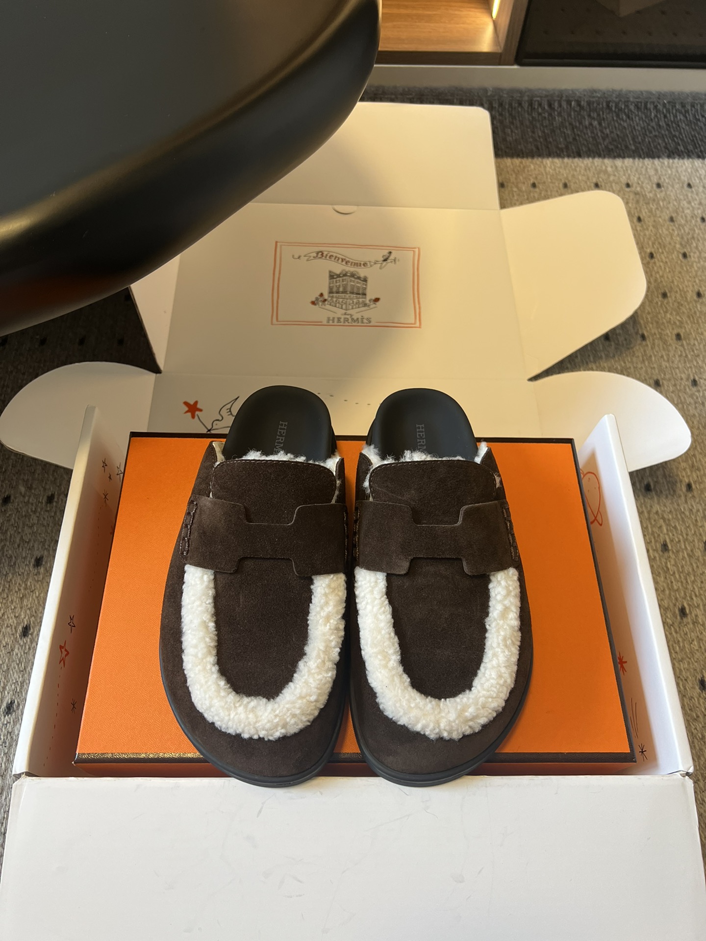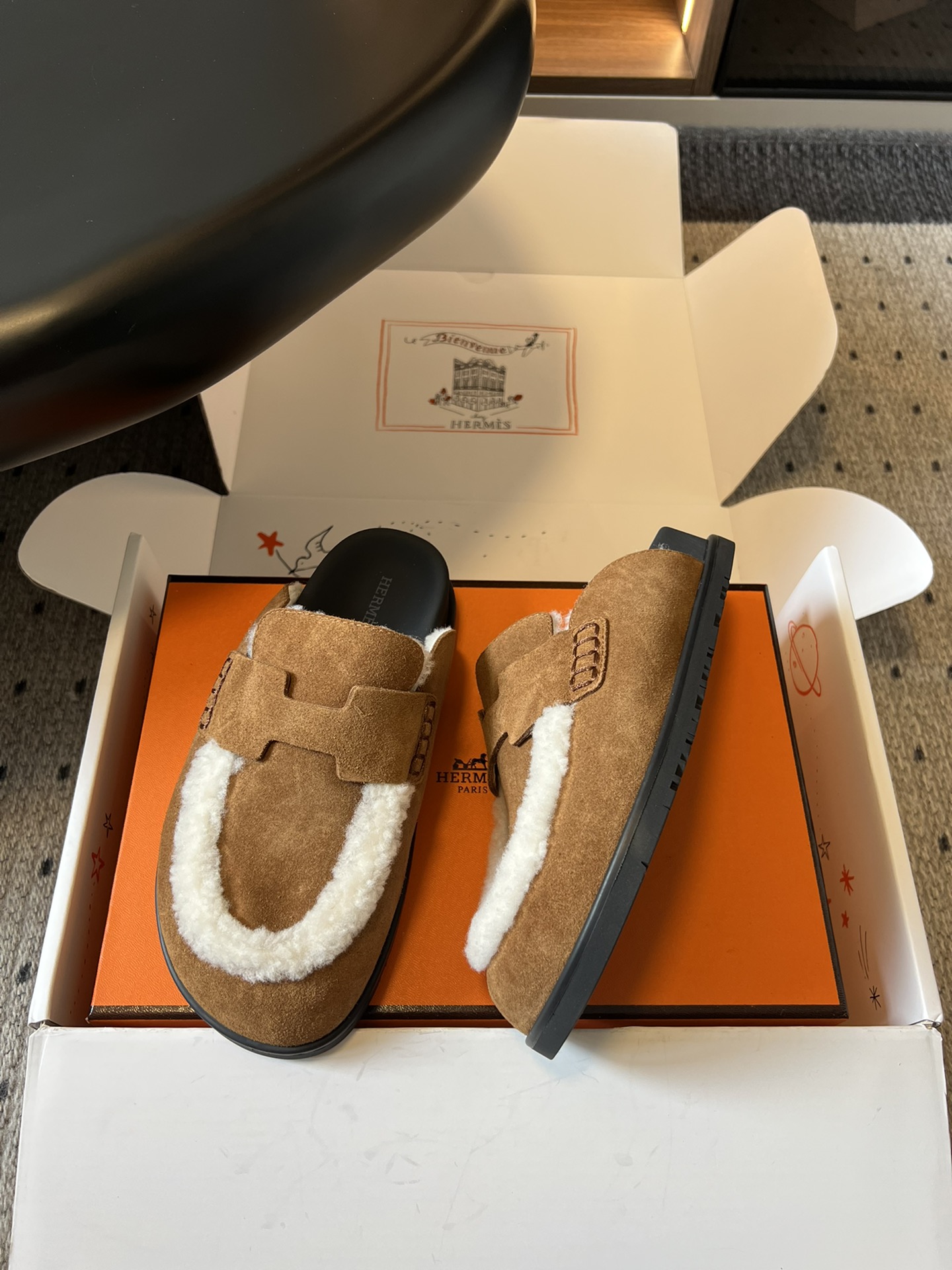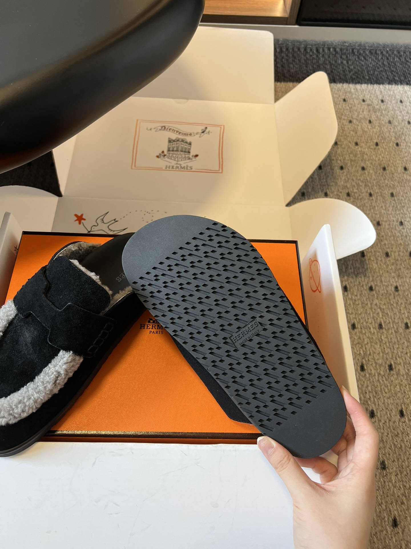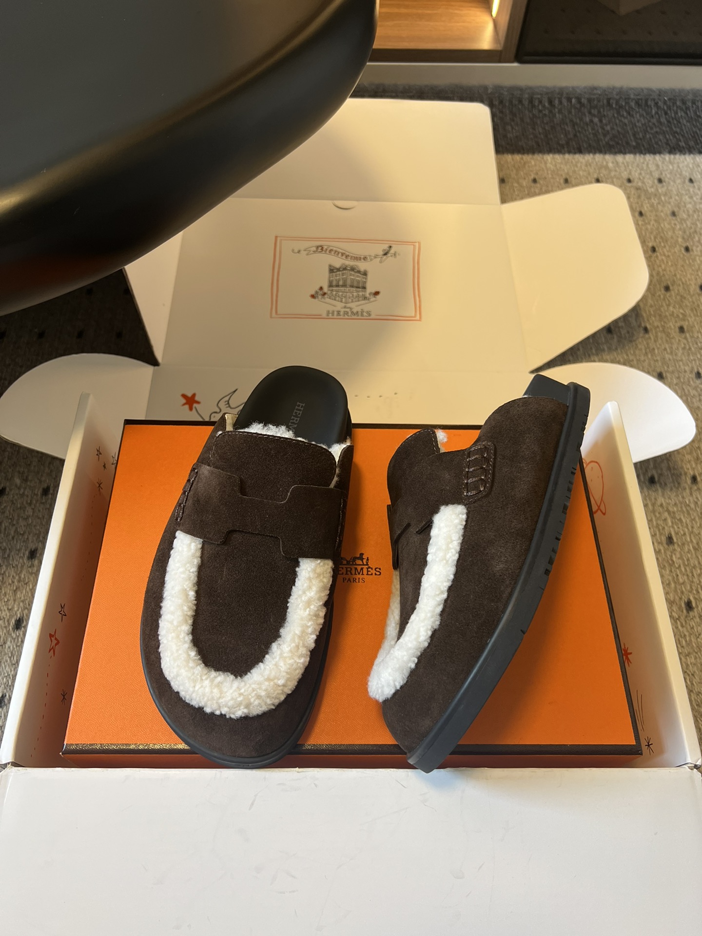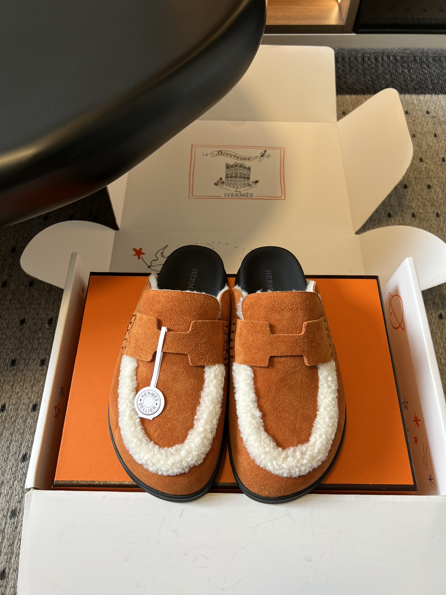 NIGO Hermes Men's And Women's Winter Boken Shoes Round Toe Flat Heel Slippers Solid Color Suede Mule Go Shoes #nigo81519