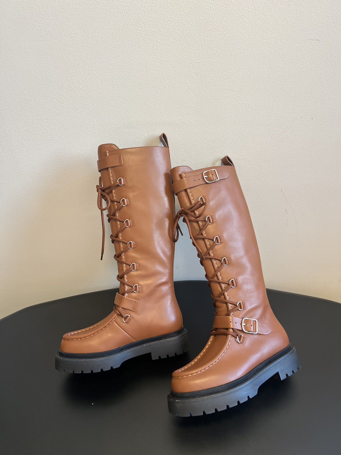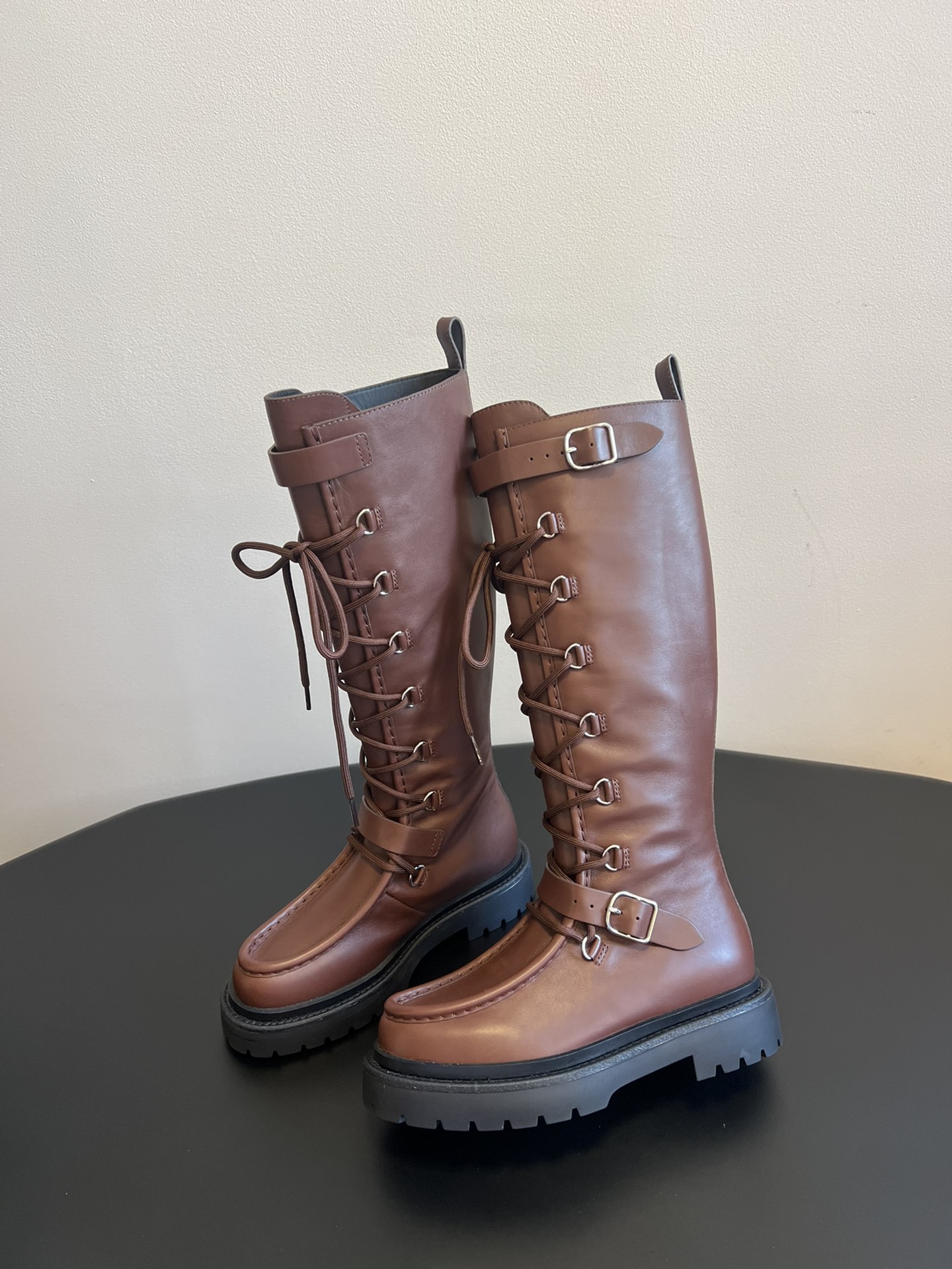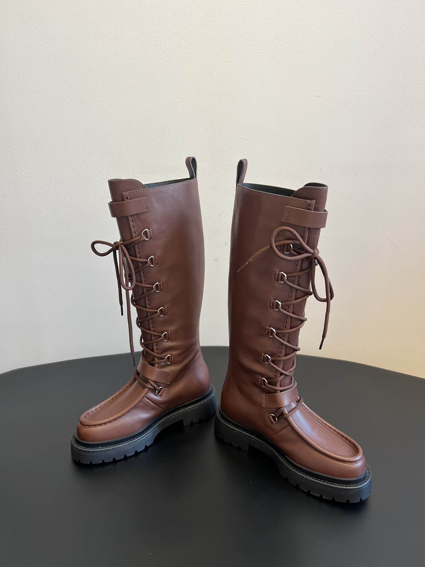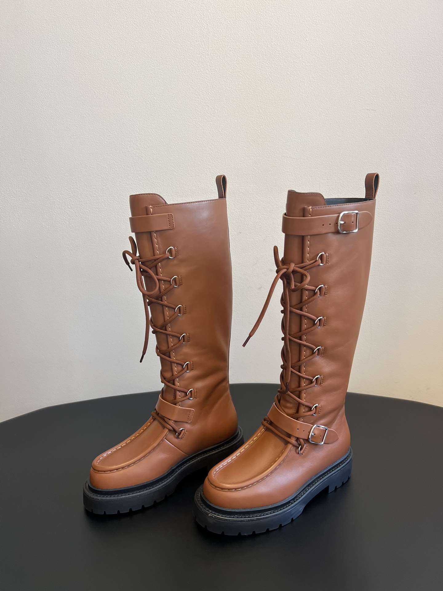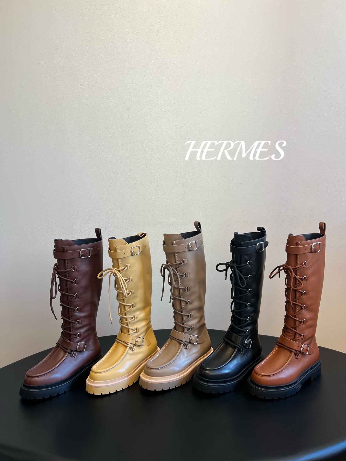 NIGO Hermes Women's Fall/Winter Landscape Boots Lace-Up Round-Toe High-Top Boots Solid-Color Cowhide Casual Shoes Heel Height: 3.5cm Ngvp #nigo2326