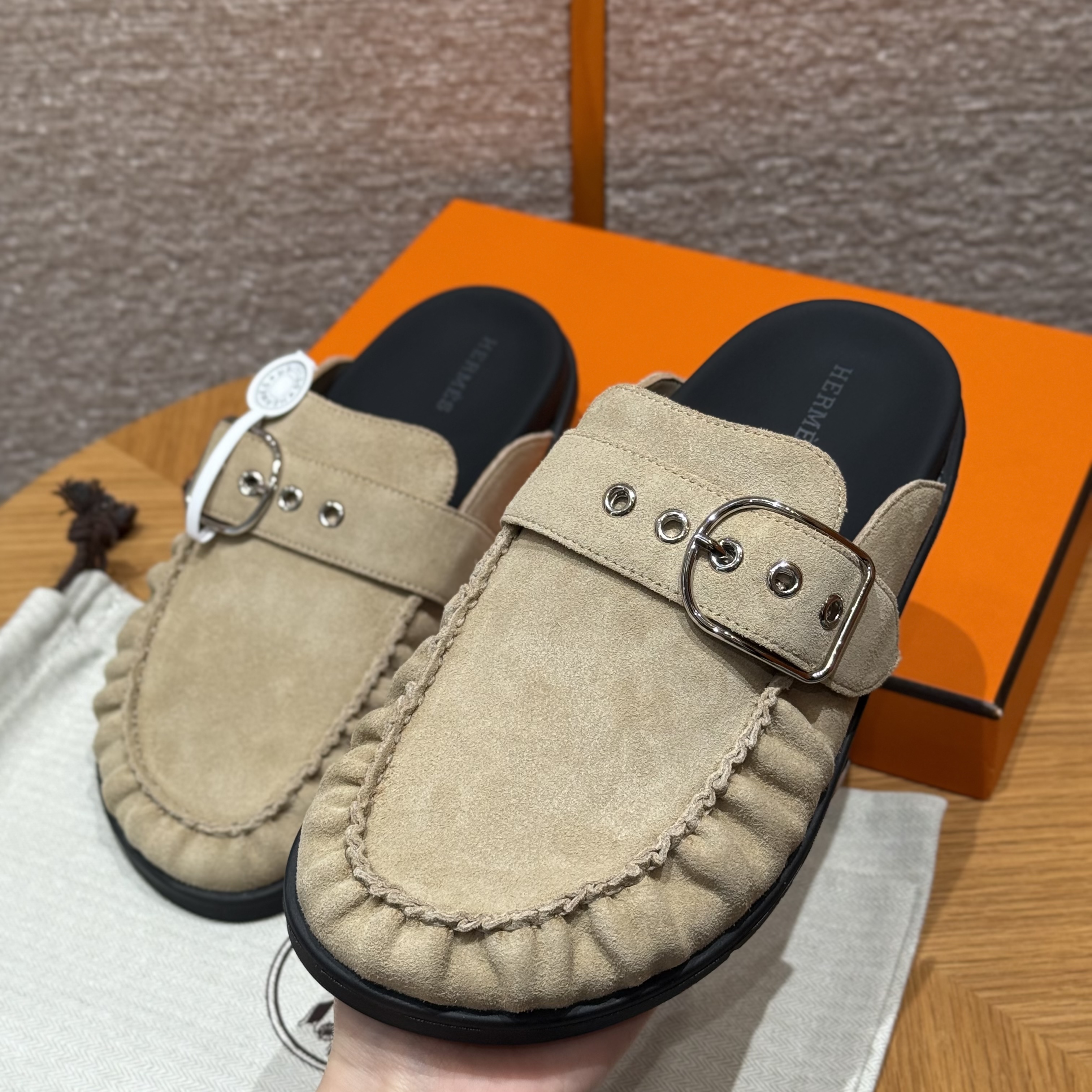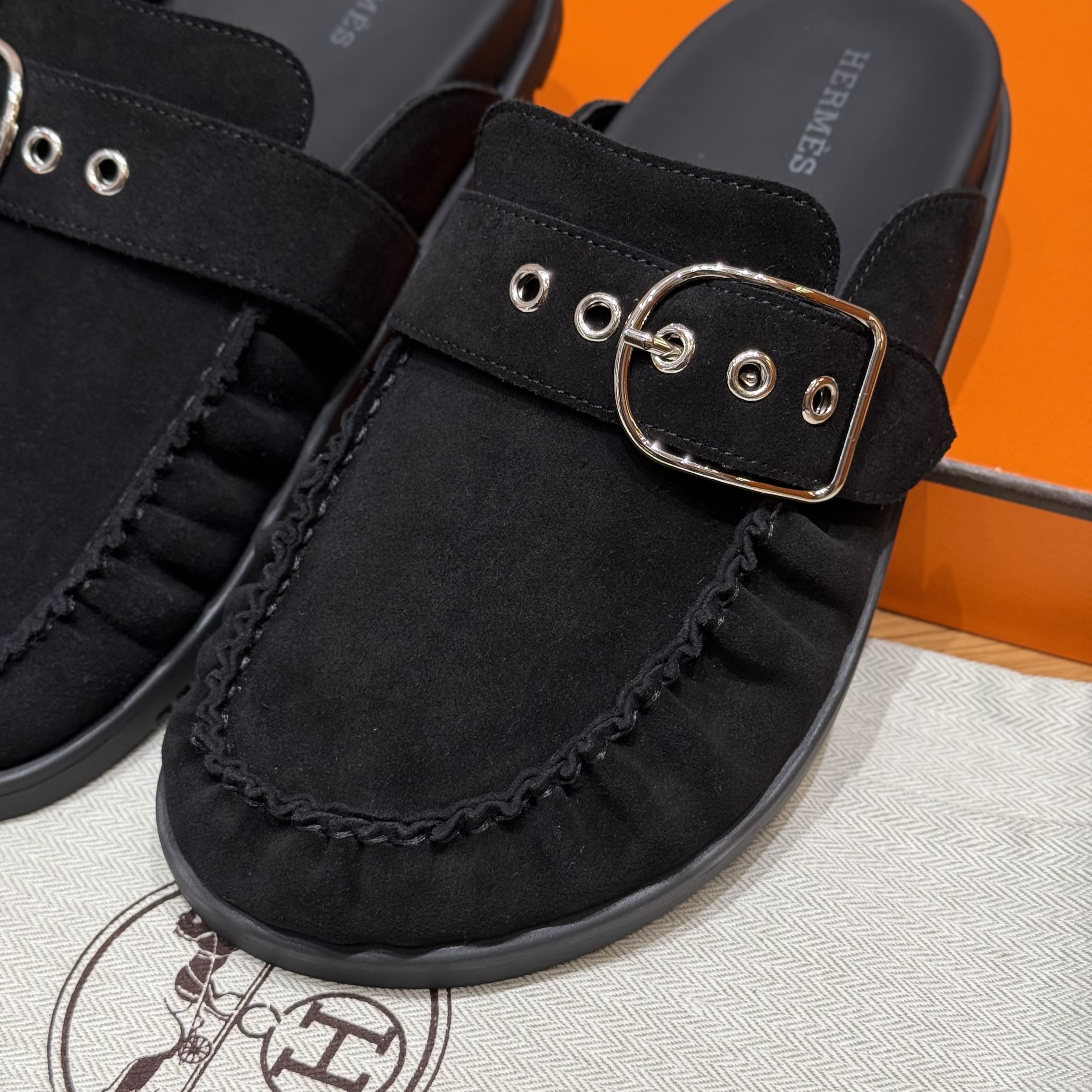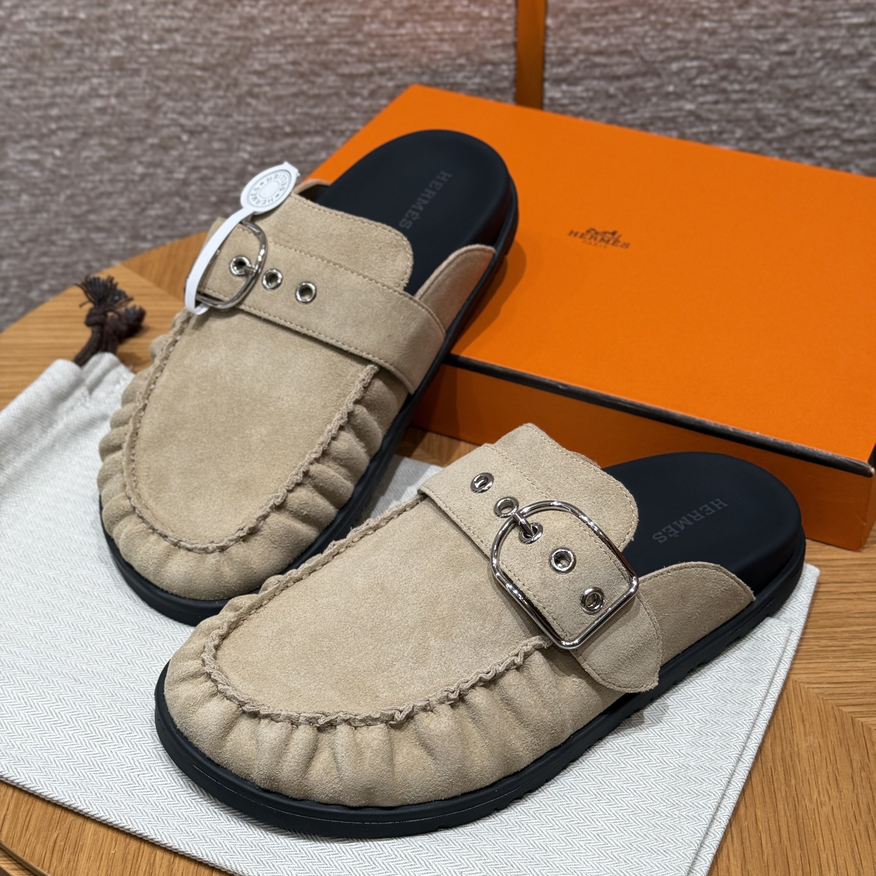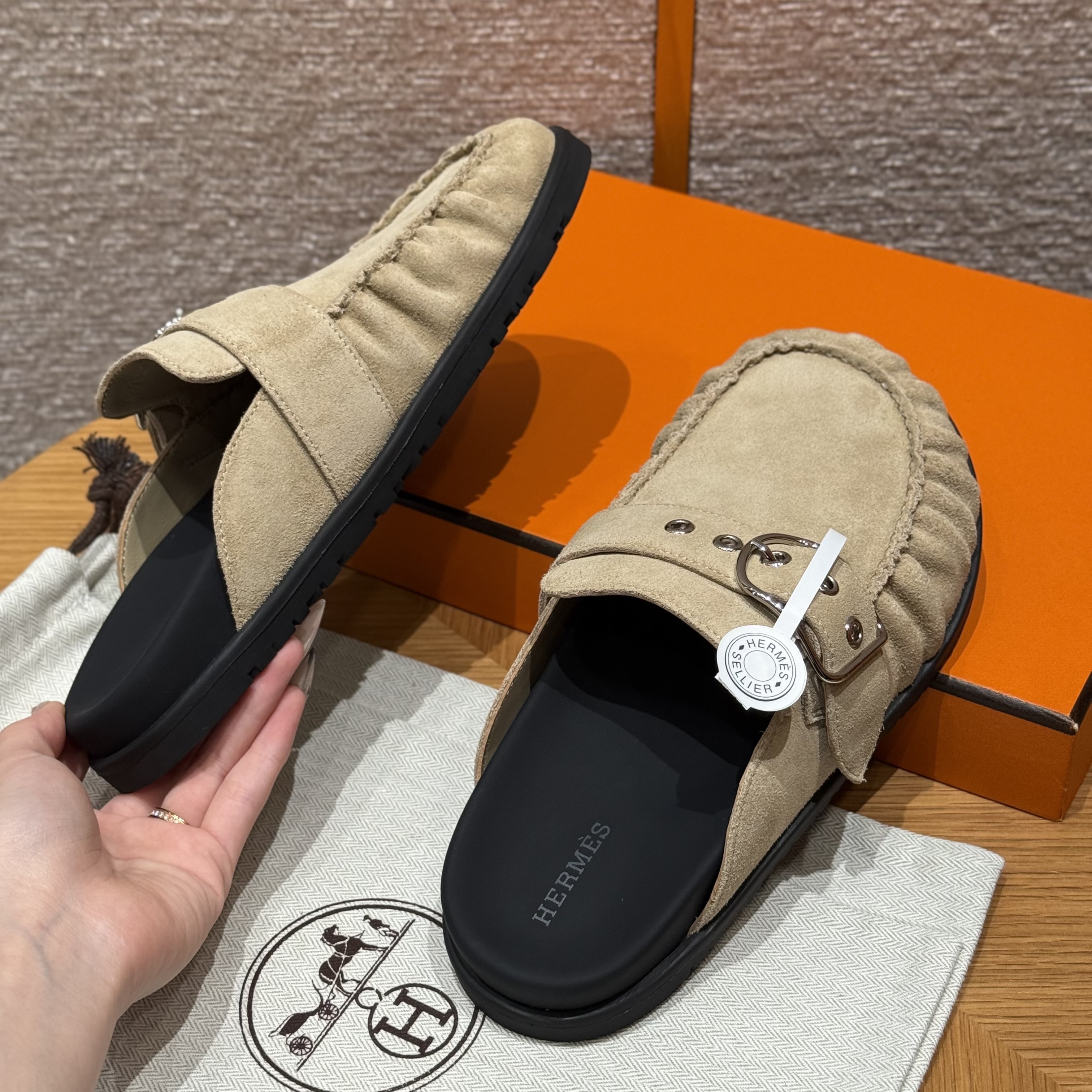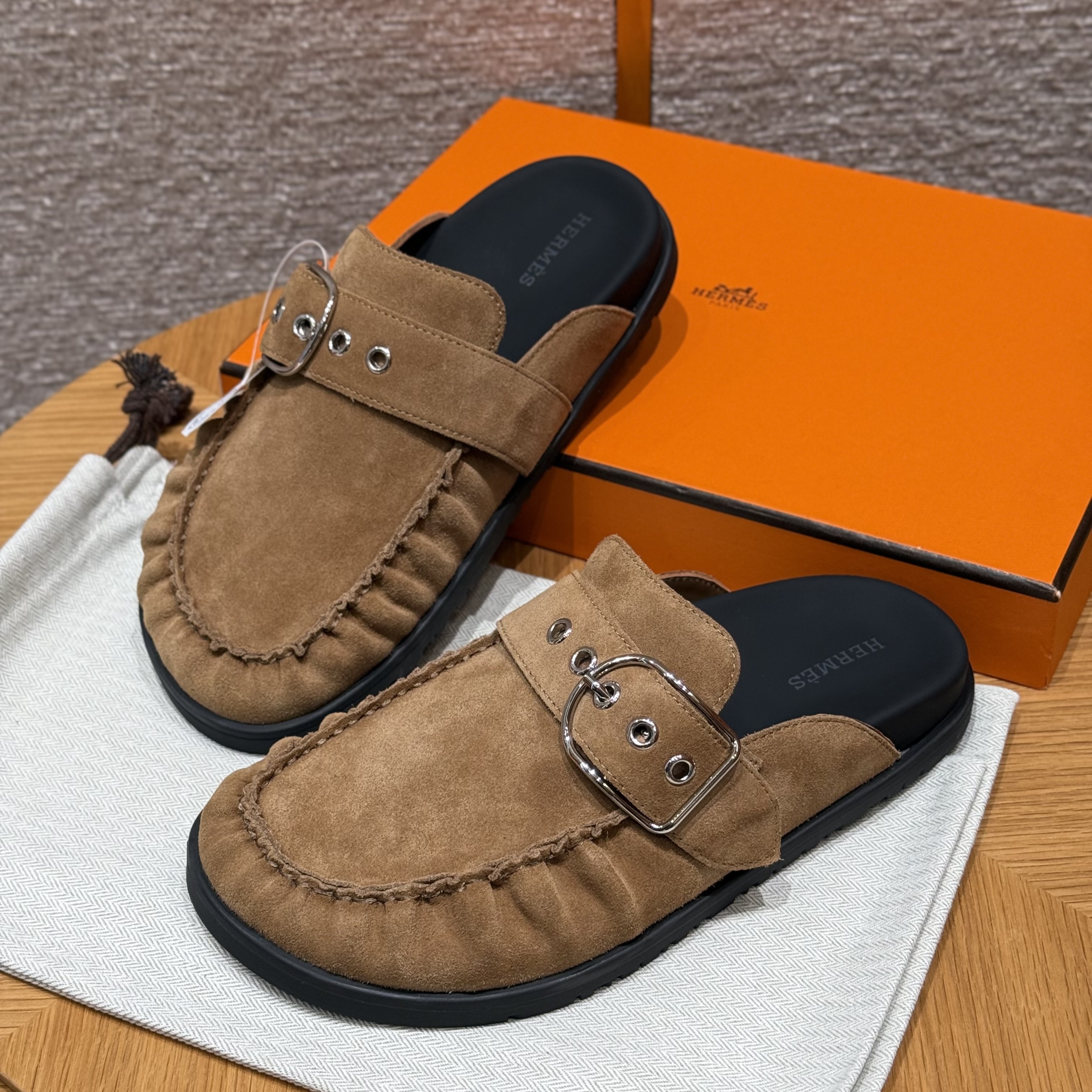 NIGO Hermes Women's Key Mule Shoes Suede Rubber Sole Silver Buckle Round Toe Slippers Summer Solid Color Casual Shoes Ngvp #nigo2129