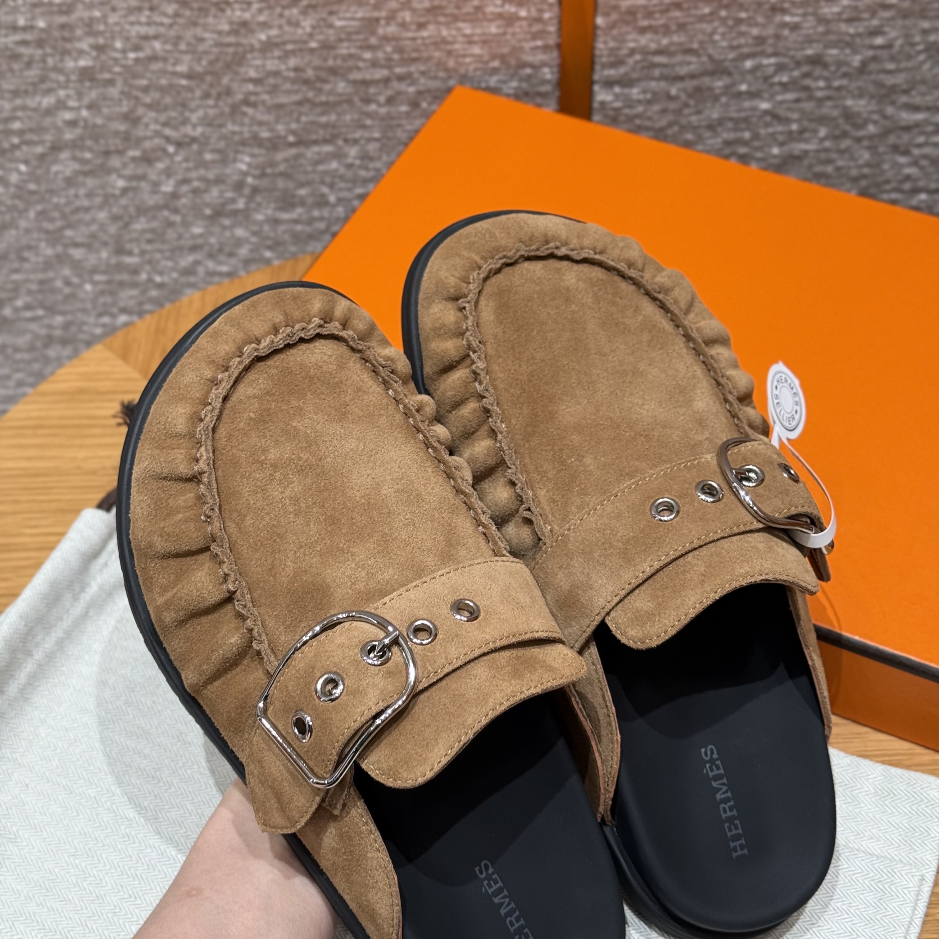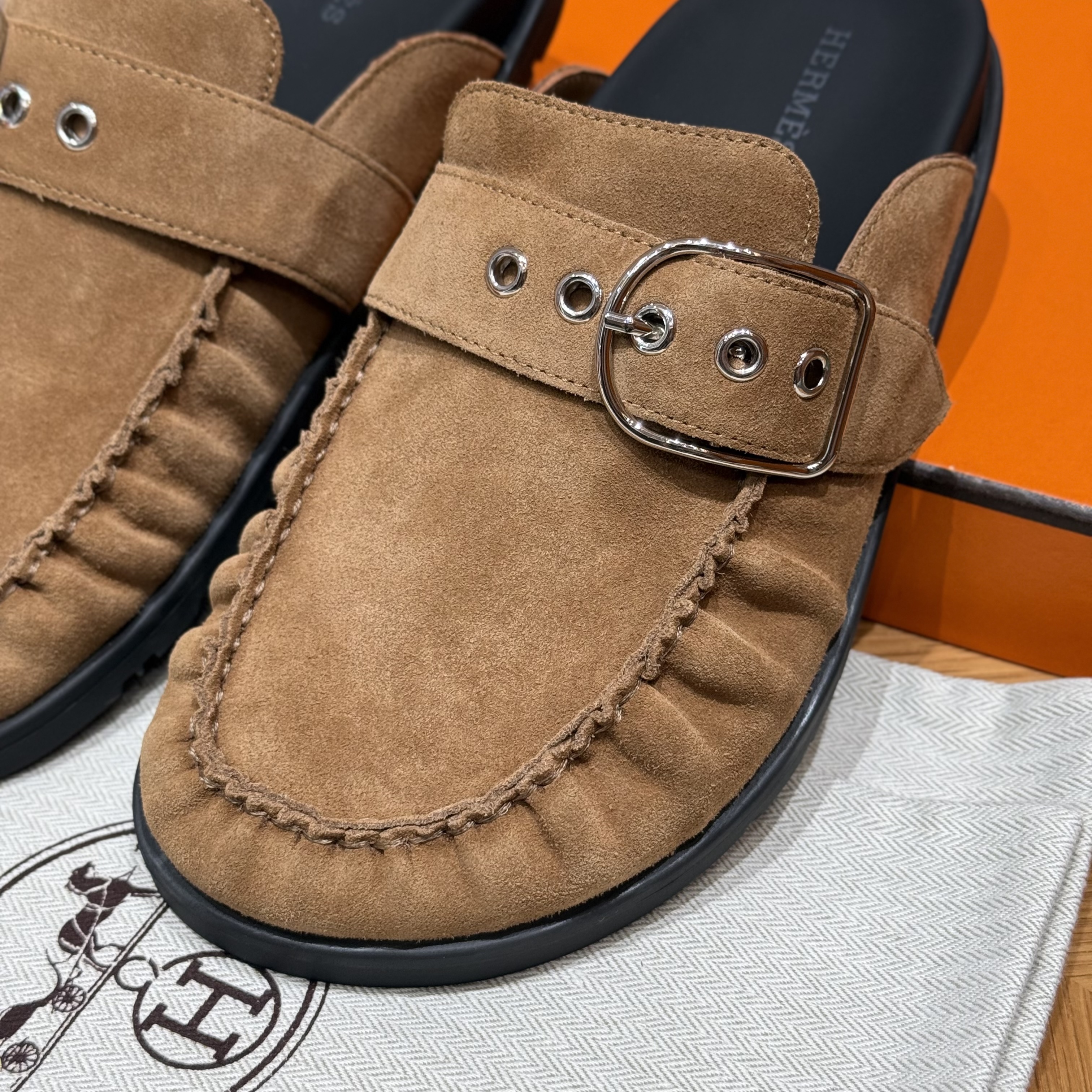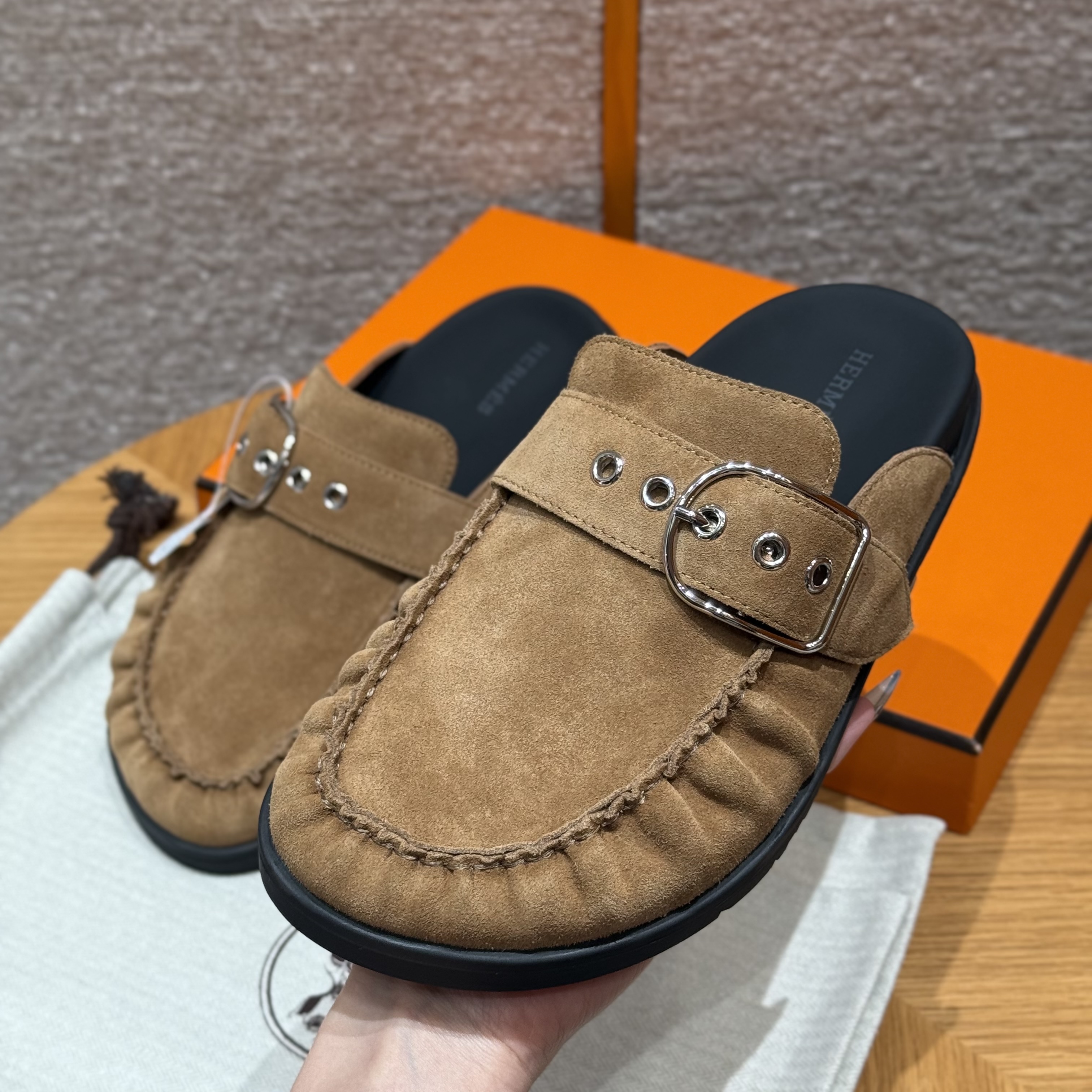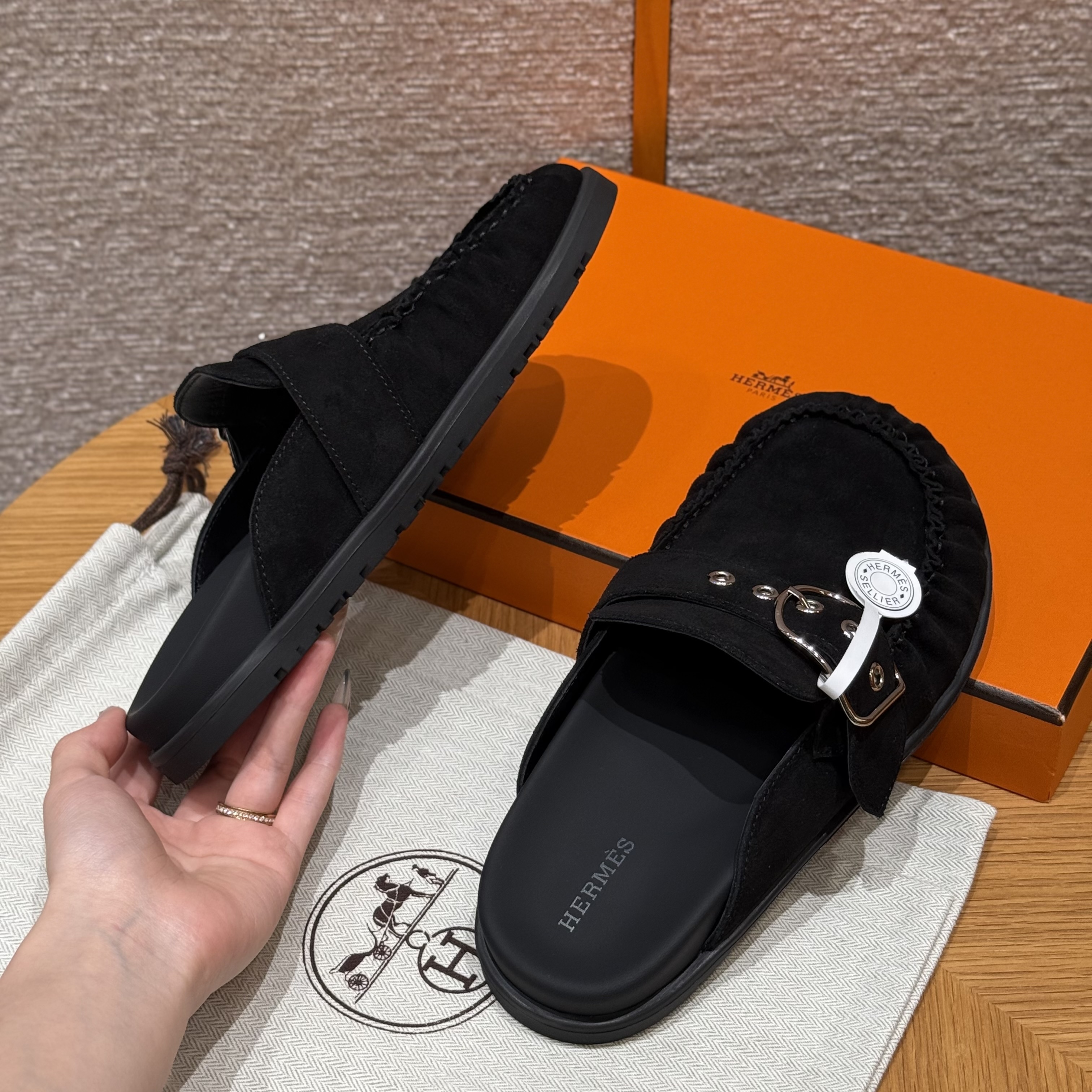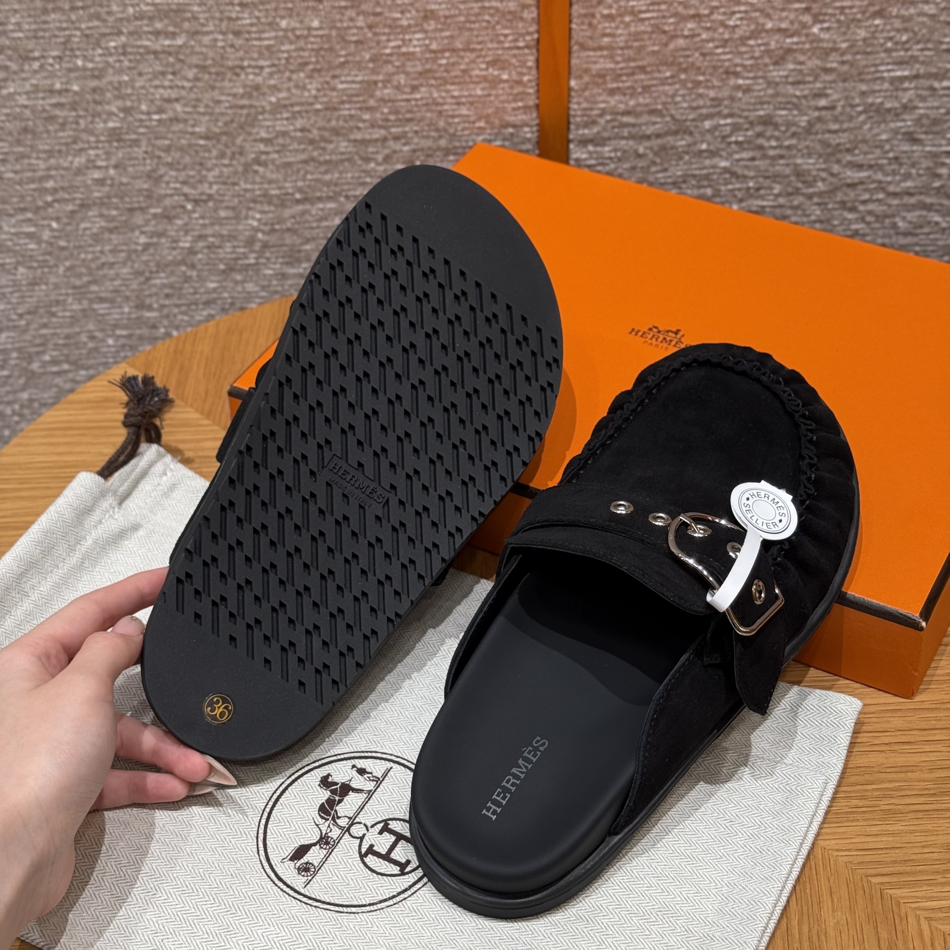 NIGO Hermes Women's Key Mule Shoes Suede Rubber Sole Silver Buckle Round Toe Slippers Summer Solid Color Casual Shoes Ngvp #nigo2129