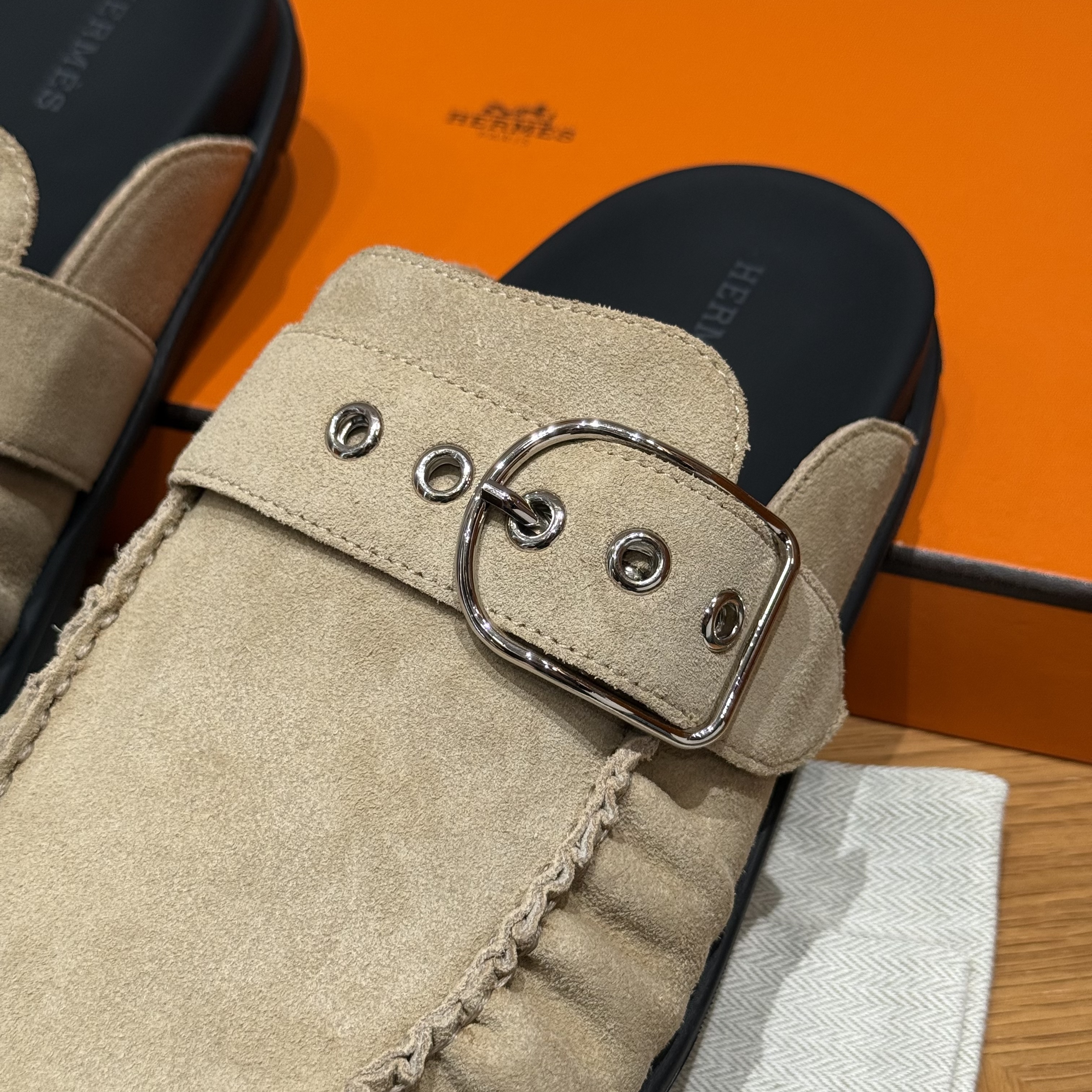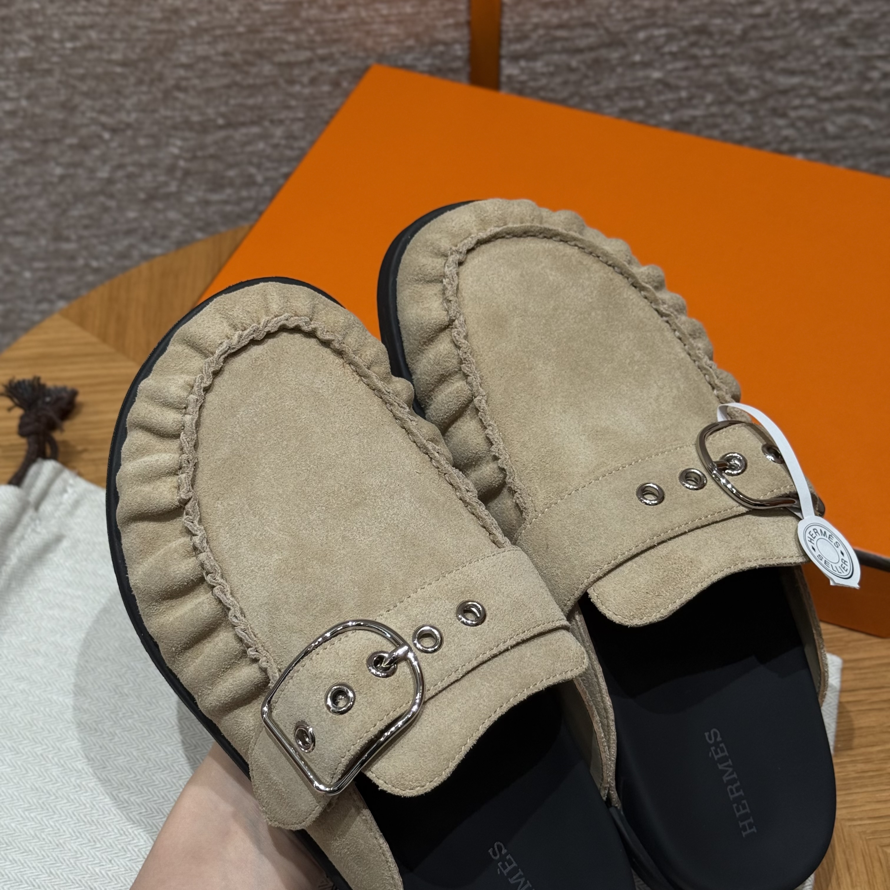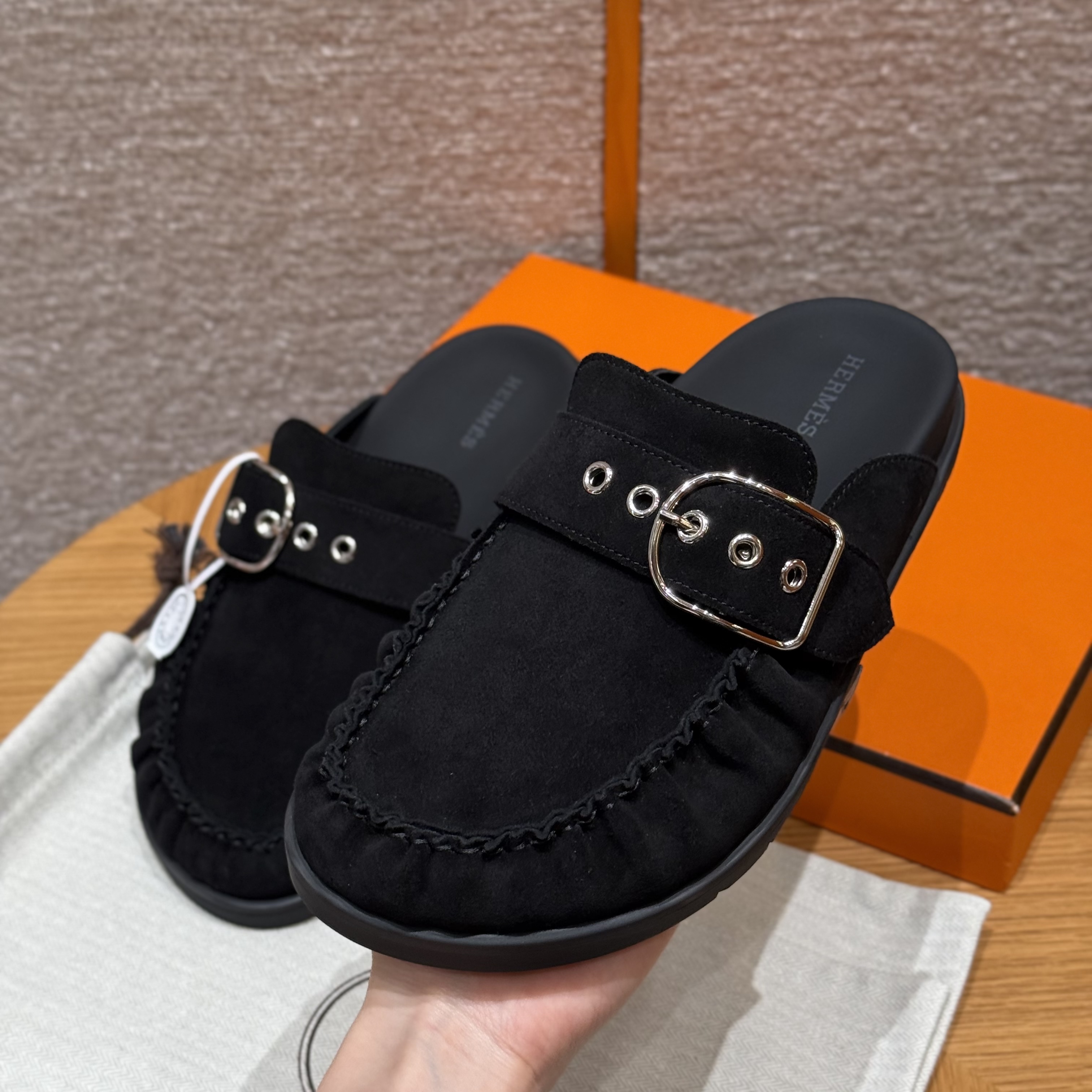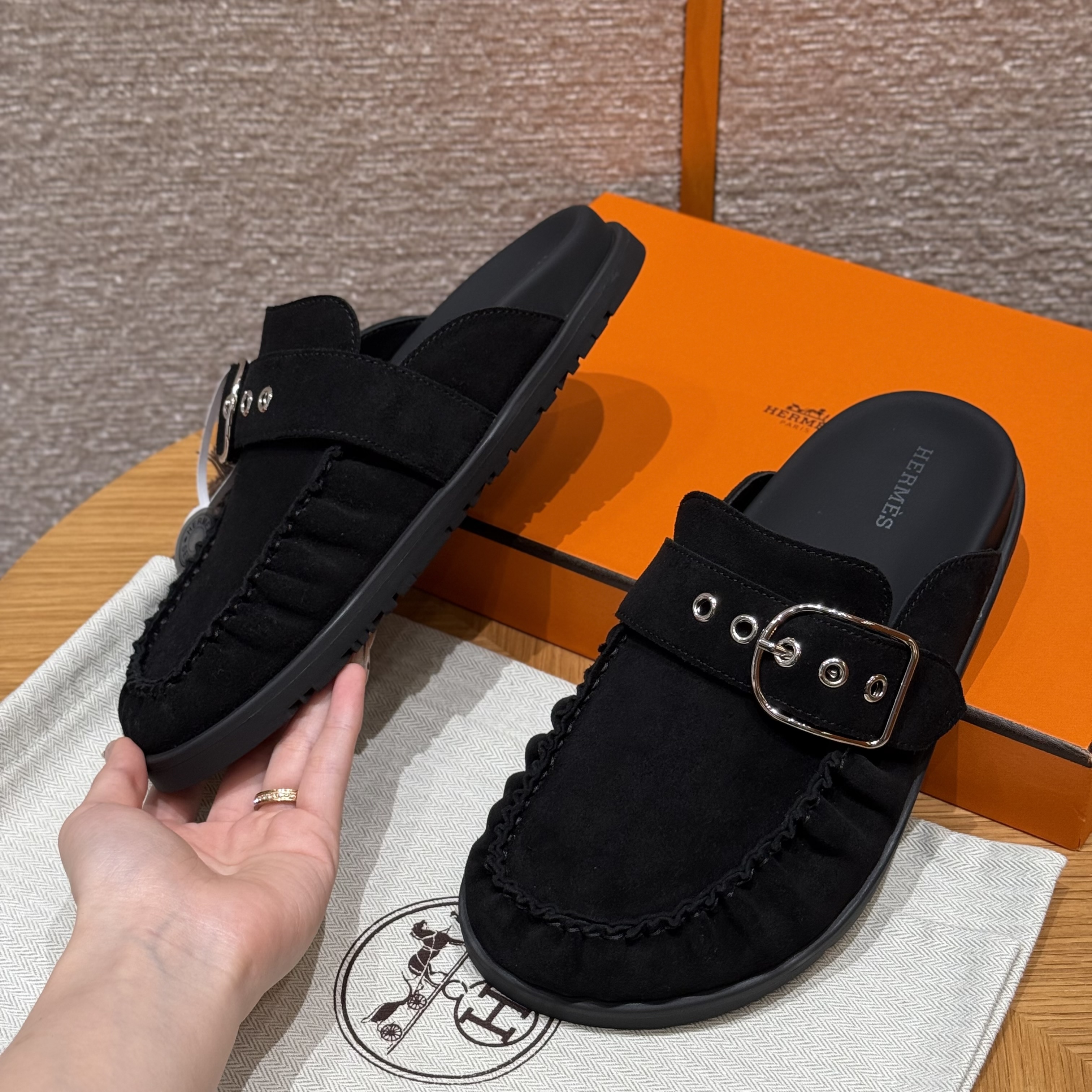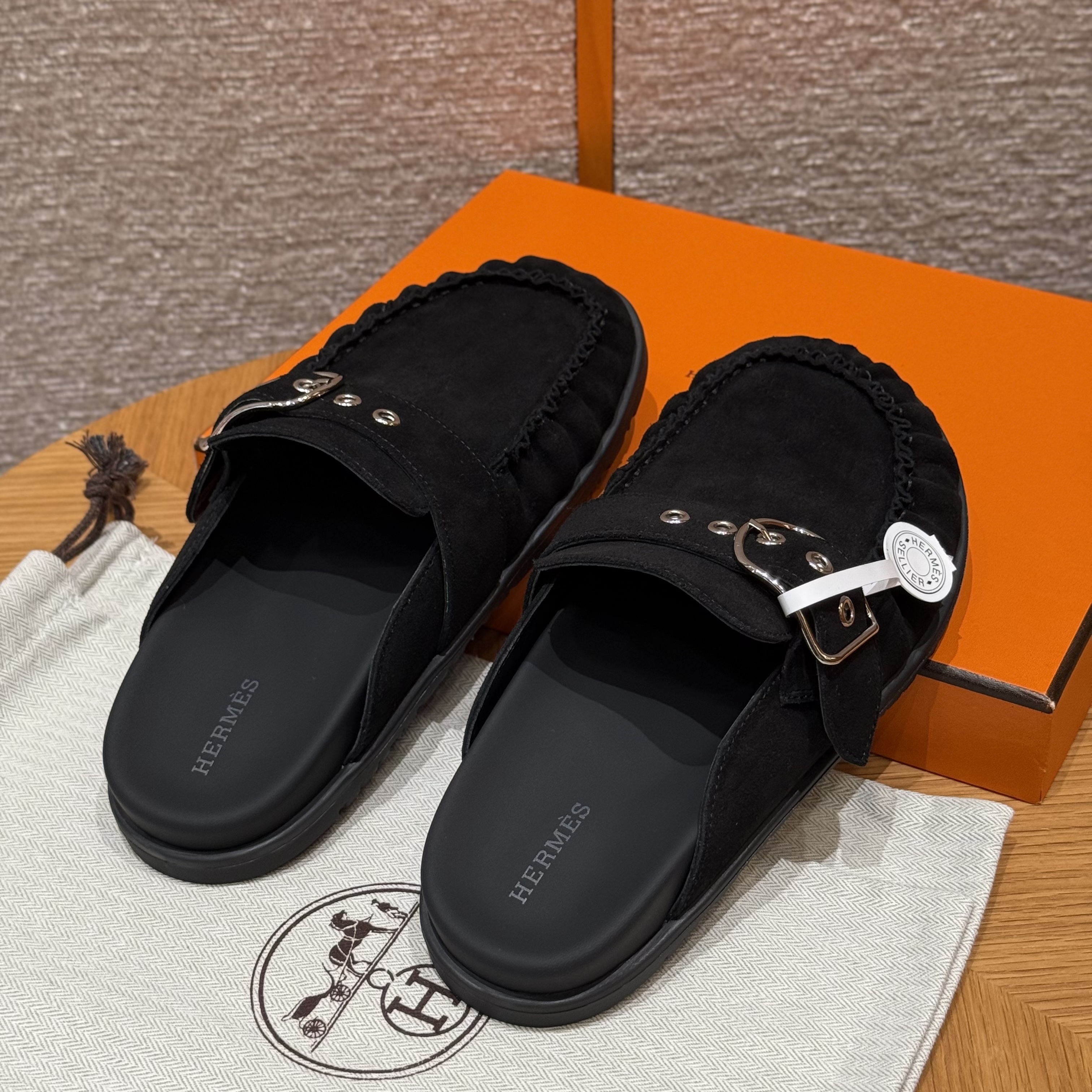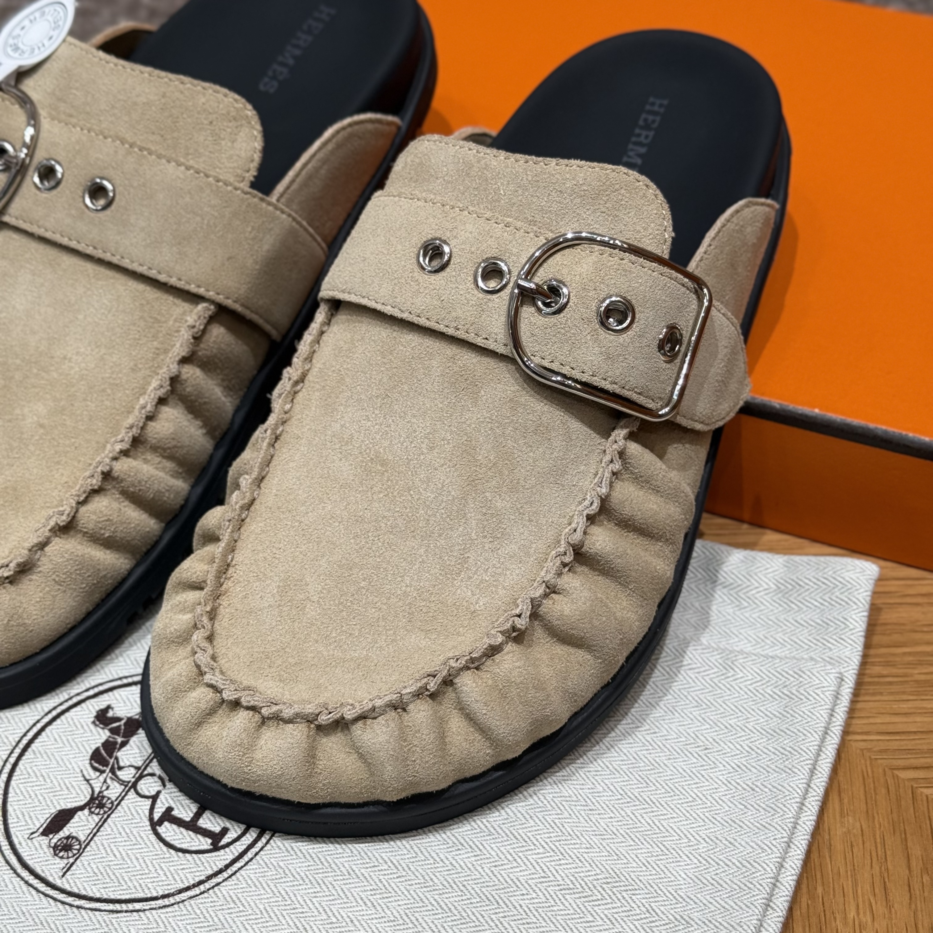 NIGO Hermes Women's Key Mule Shoes Suede Rubber Sole Silver Buckle Round Toe Slippers Summer Solid Color Casual Shoes Ngvp #nigo2129