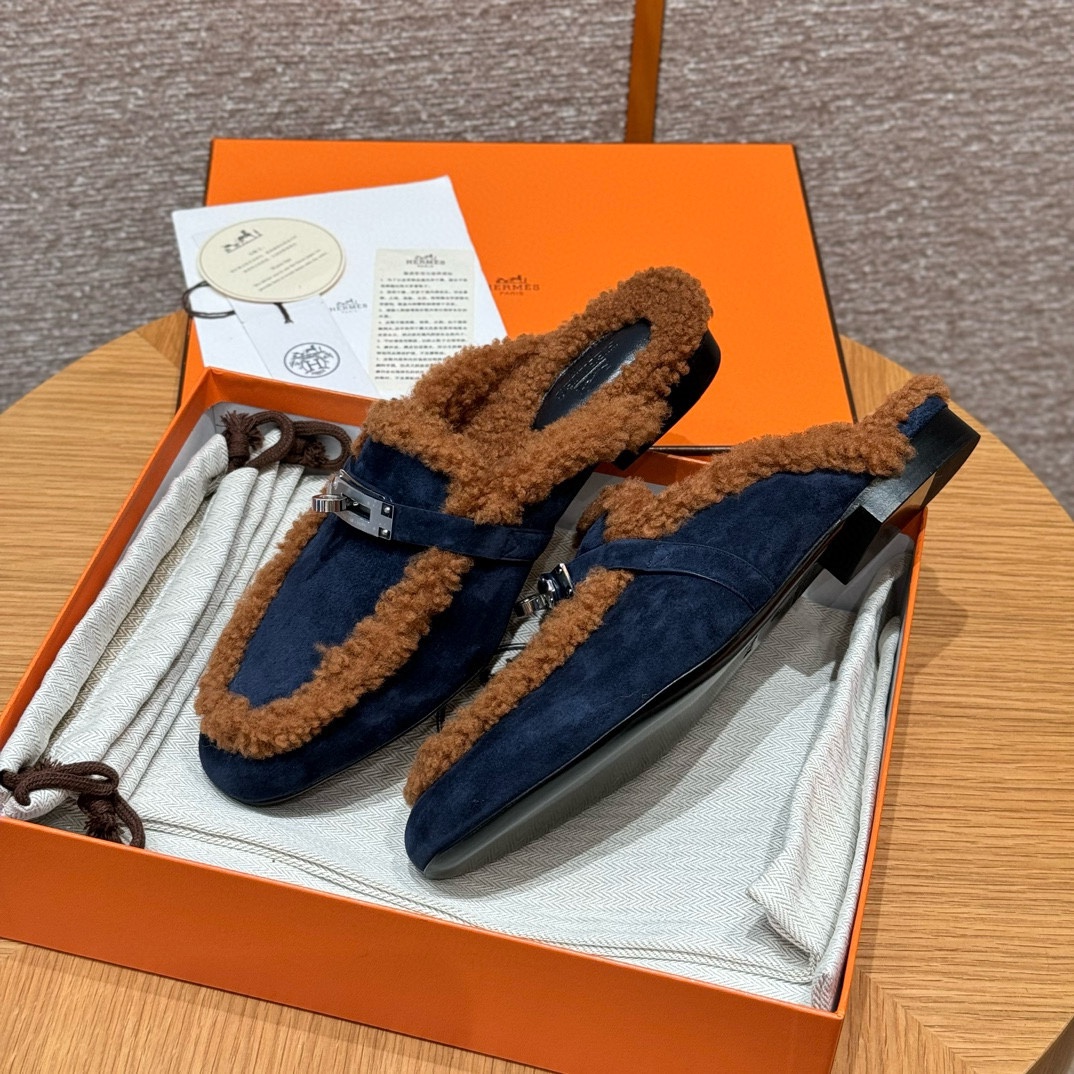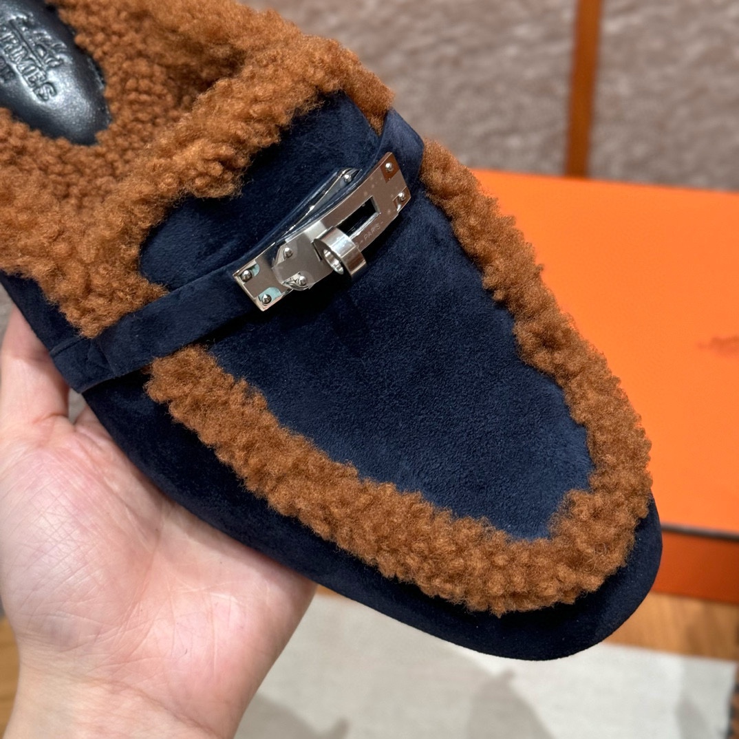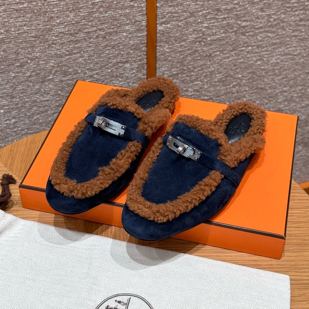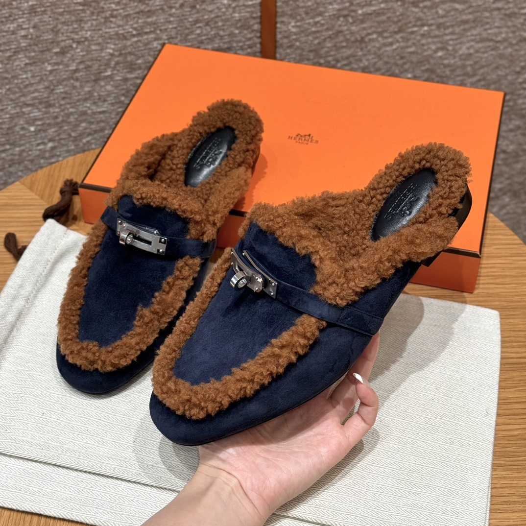 NIGO Hermes Women's Solid Color Suede Round Toe Flat Mule Shoes Slippers #nigo74233