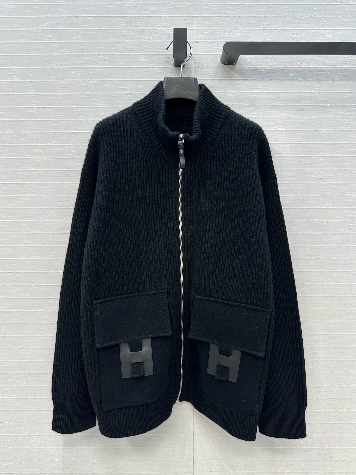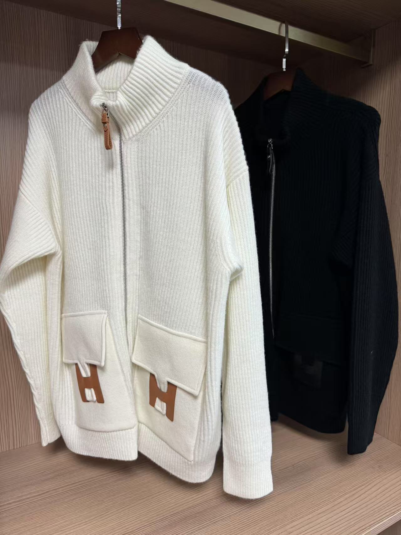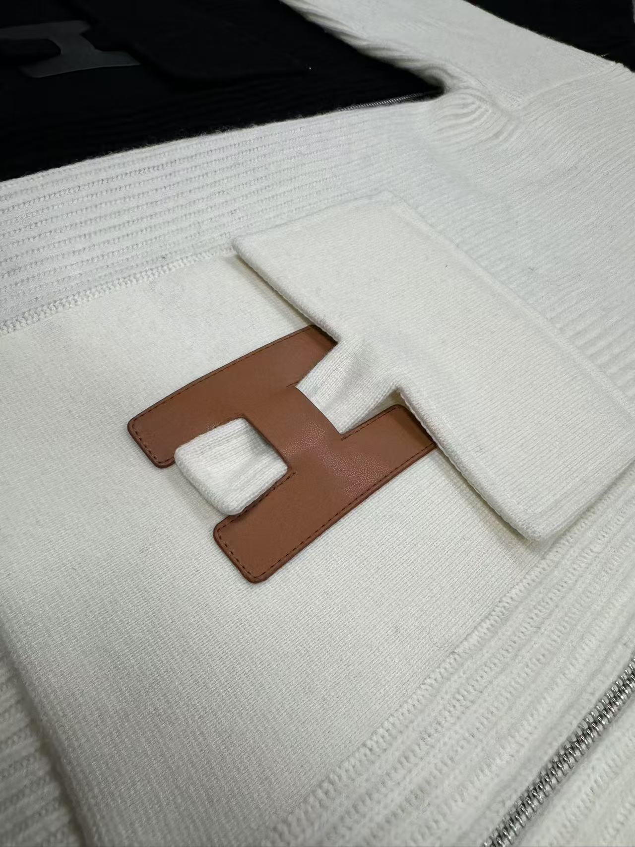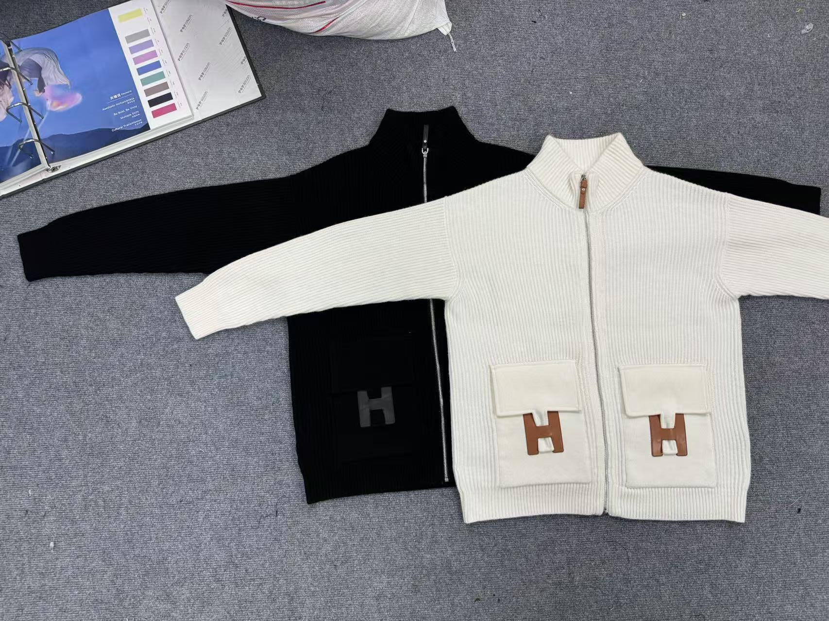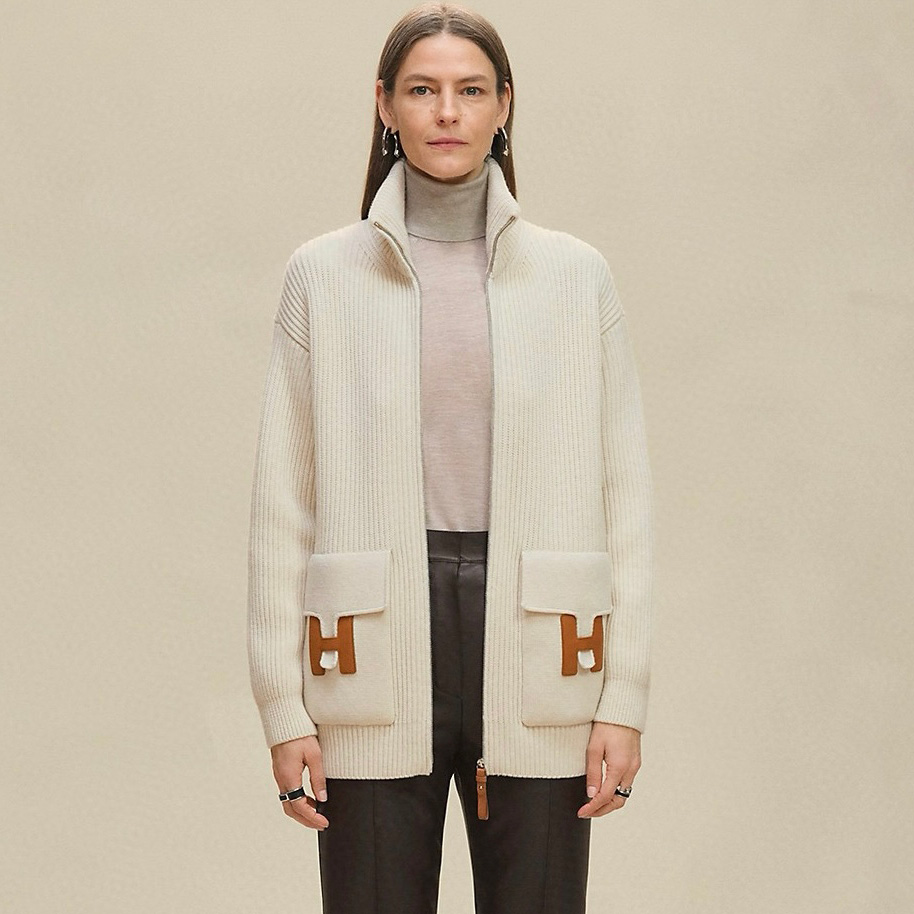 NIGO Hermes Women's Spring/summer Casual Fashion Solid Color Stand Up Collar Zipper Leather H-shaped Pocket Wool Knit Mid Length Coat Jacket #nigo78292