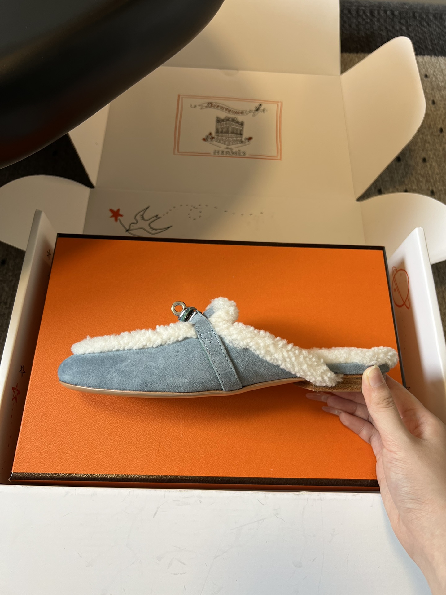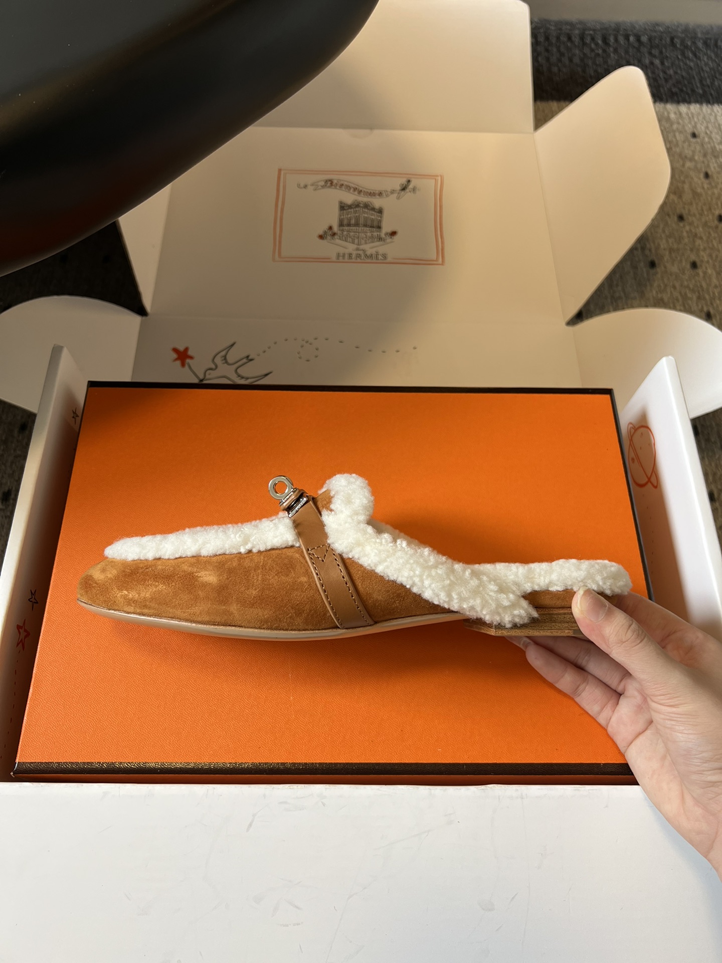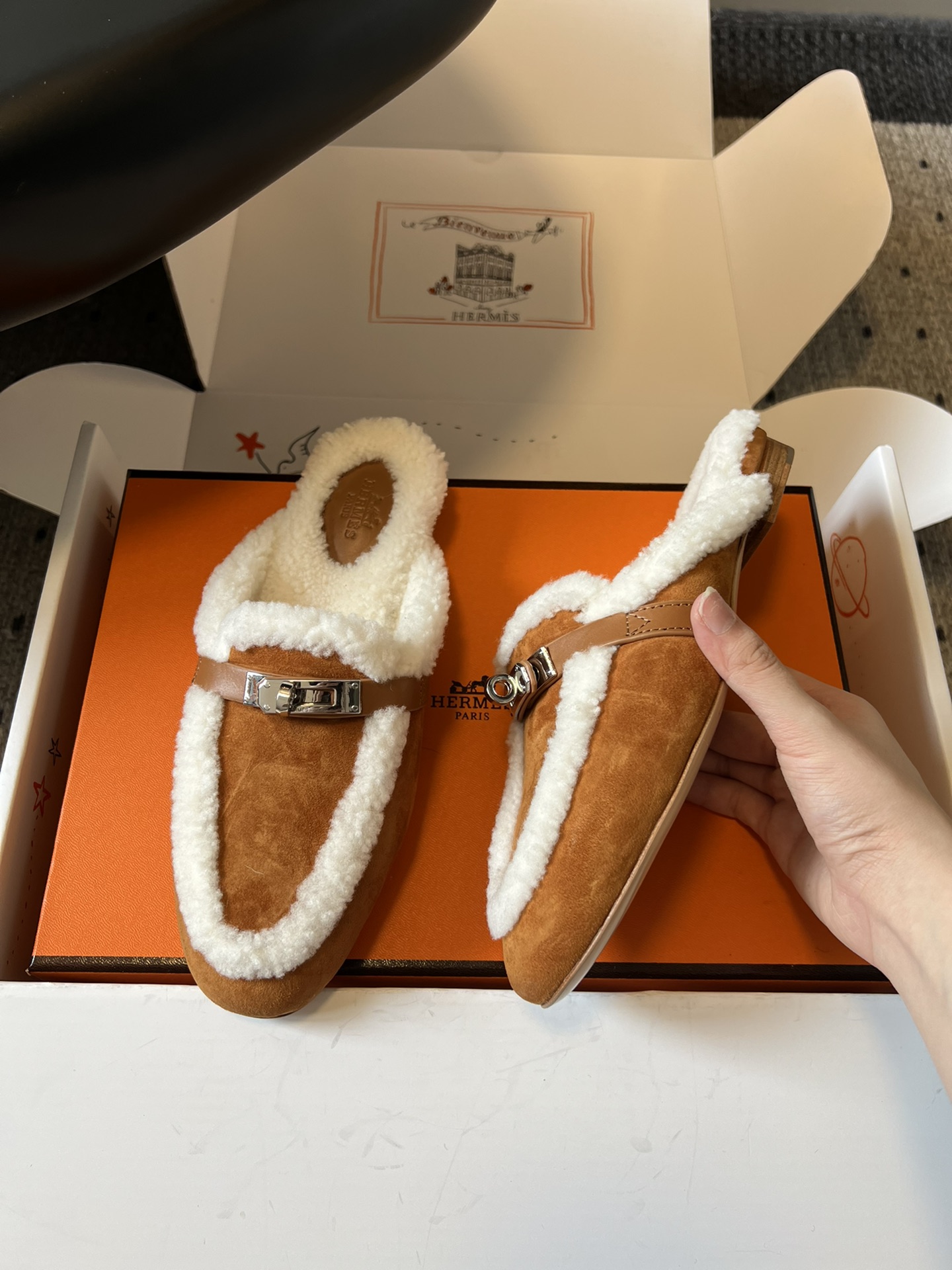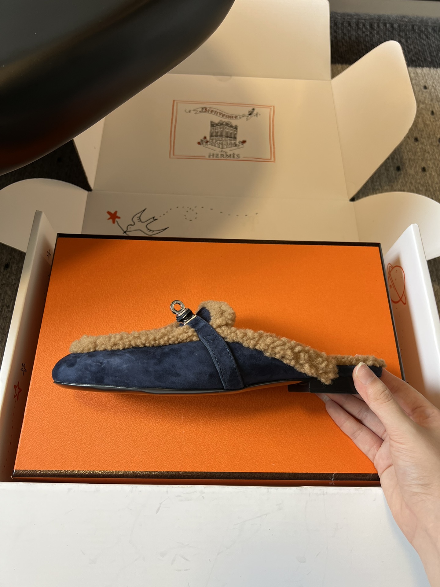NIGO Hermes Women's Winter Suede Round-Toe Flat Half-Slip-On Shoes, Casual Solid Color Slip-On Slippers #nigo81517