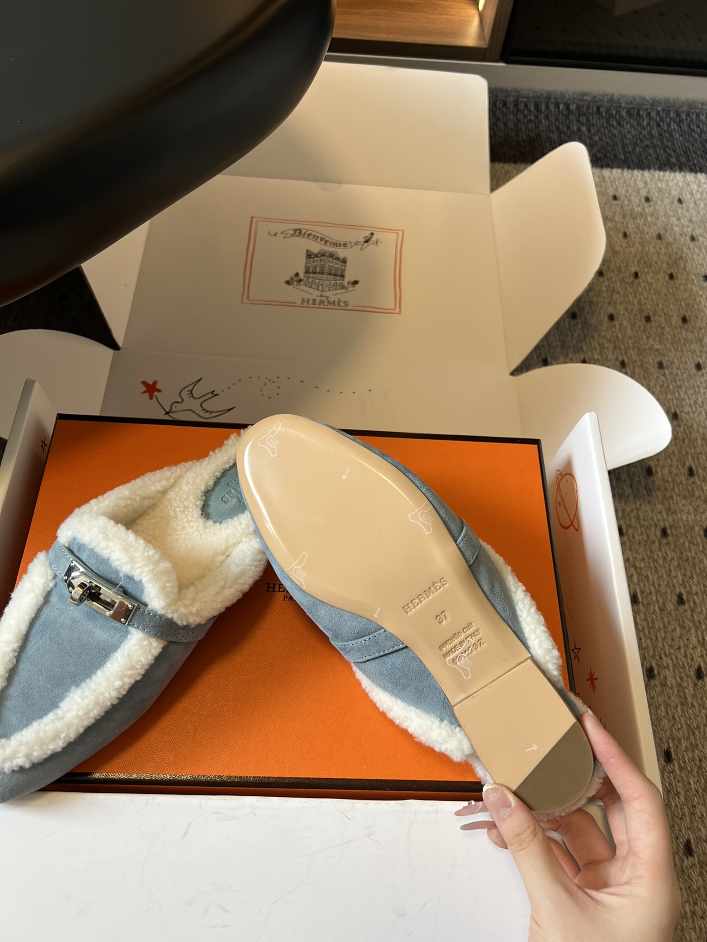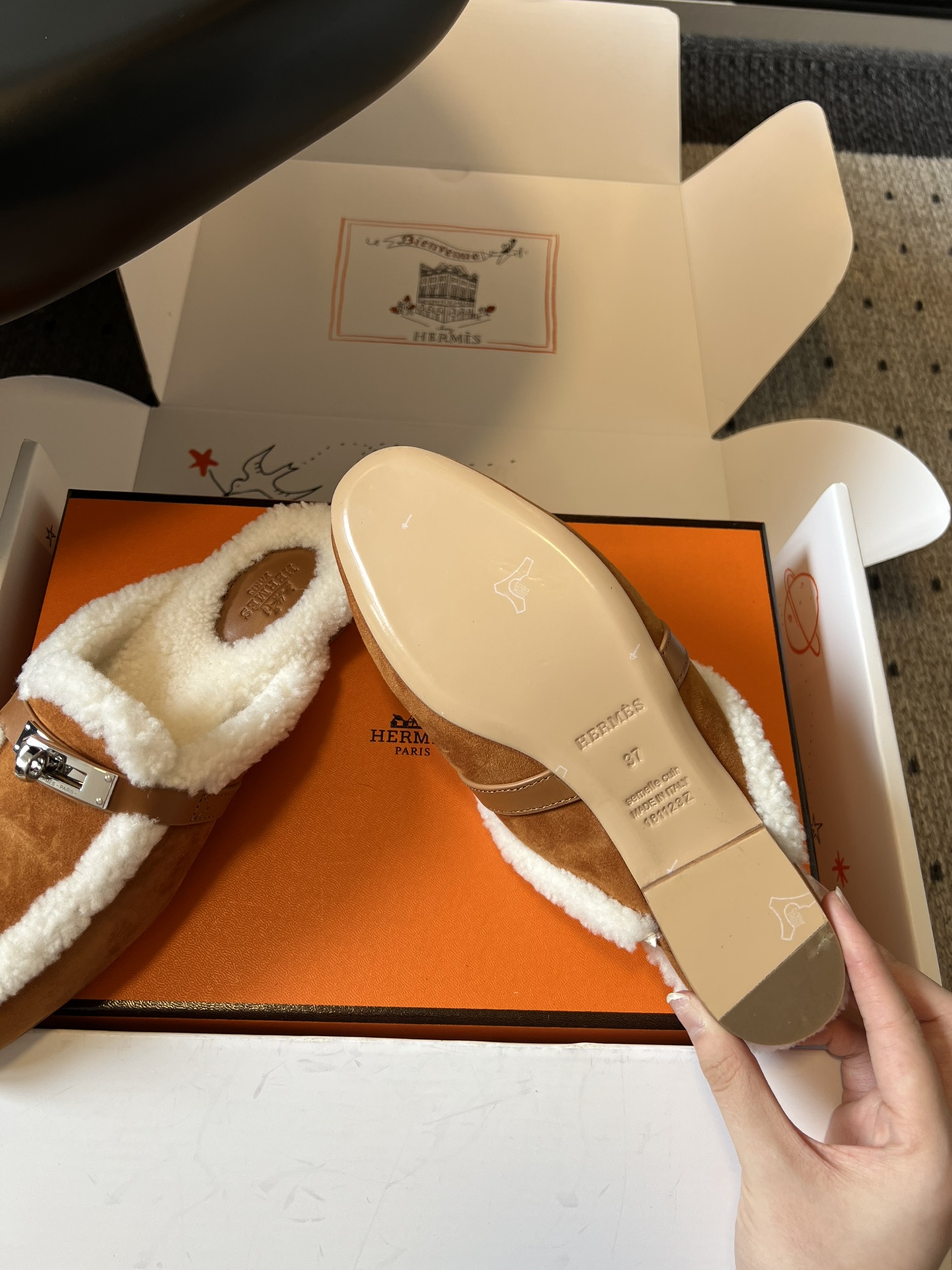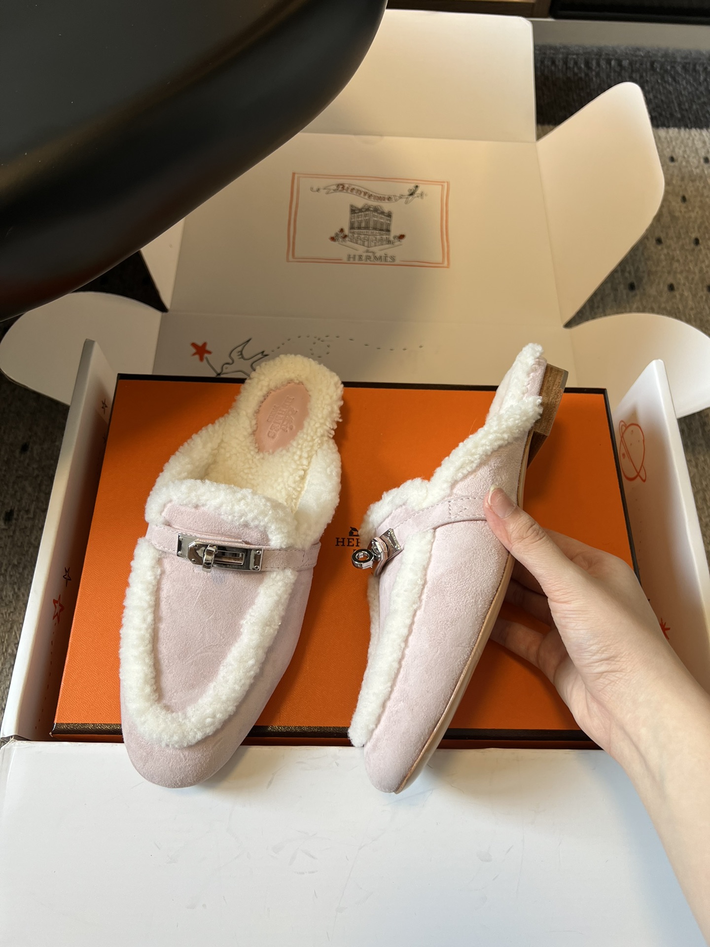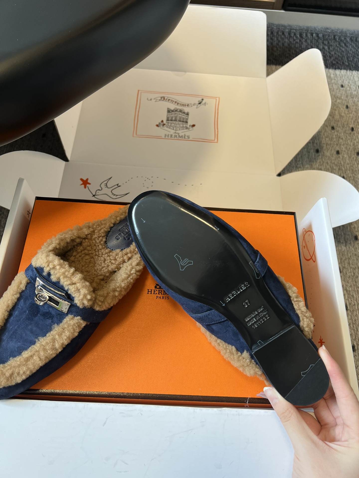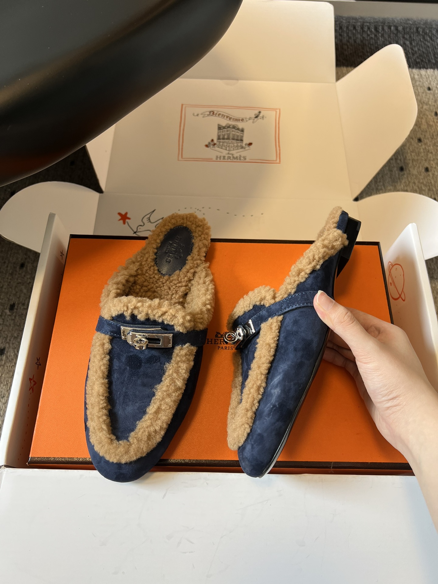 NIGO Hermes Women's Winter Suede Round-Toe Flat Half-Slip-On Shoes, Casual Solid Color Slip-On Slippers #nigo81517
