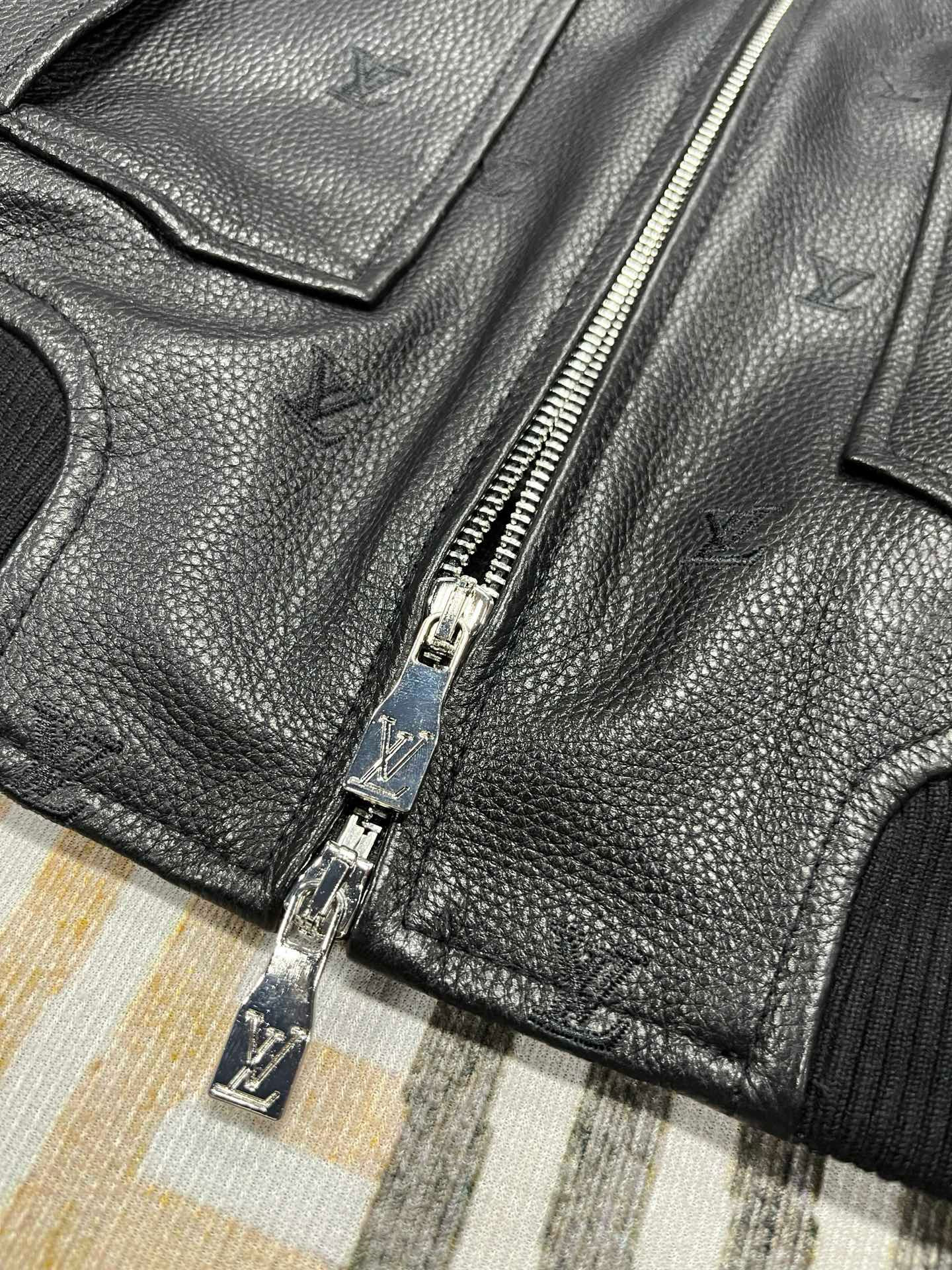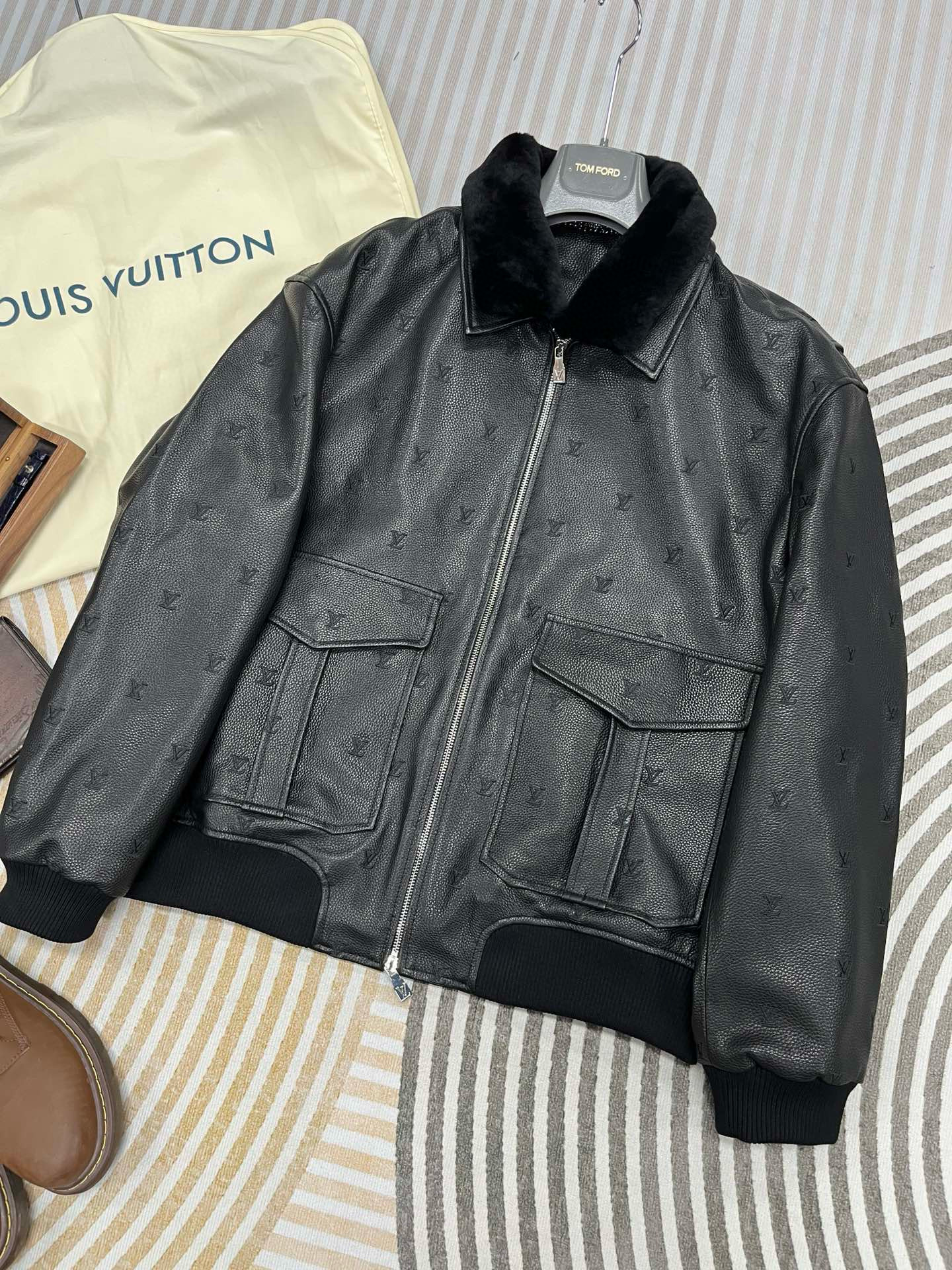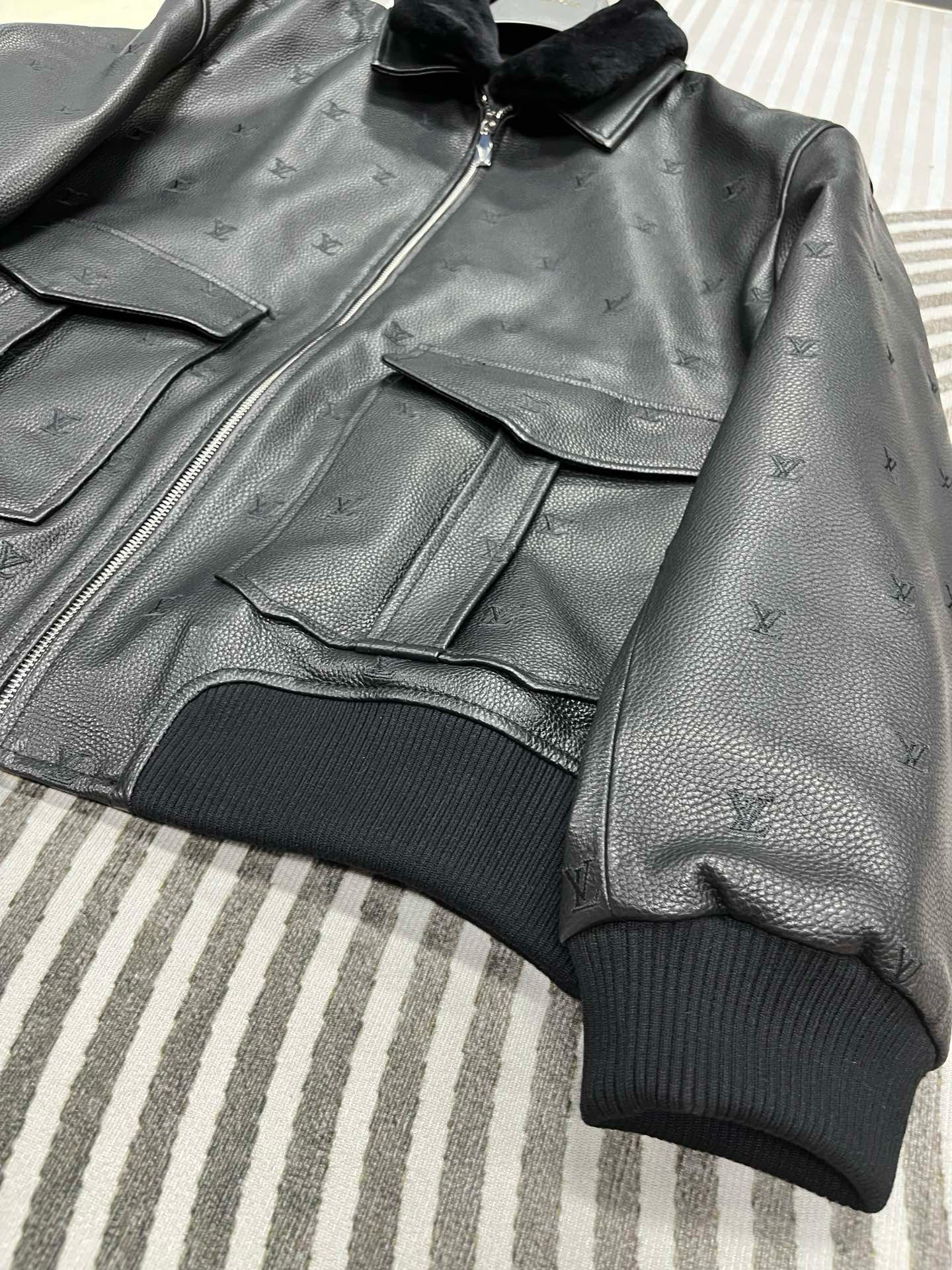 NIGO Louis Vuitton Men's Fall/winter Pilot Drawstring Jacket Solid Color Logo Jacquard Hair Collar Colorblocking Leather Jacket Back With Vents #nigo73354