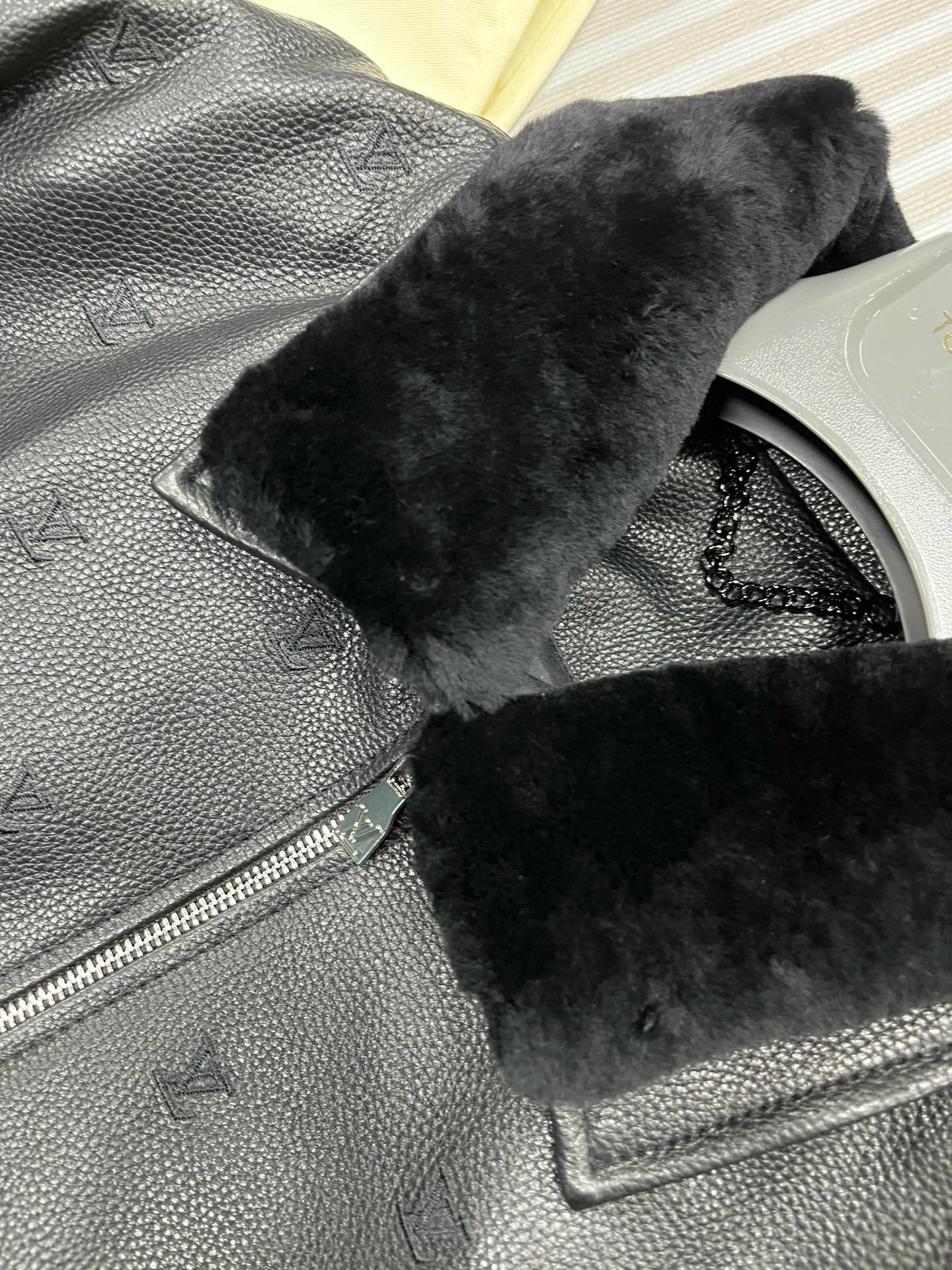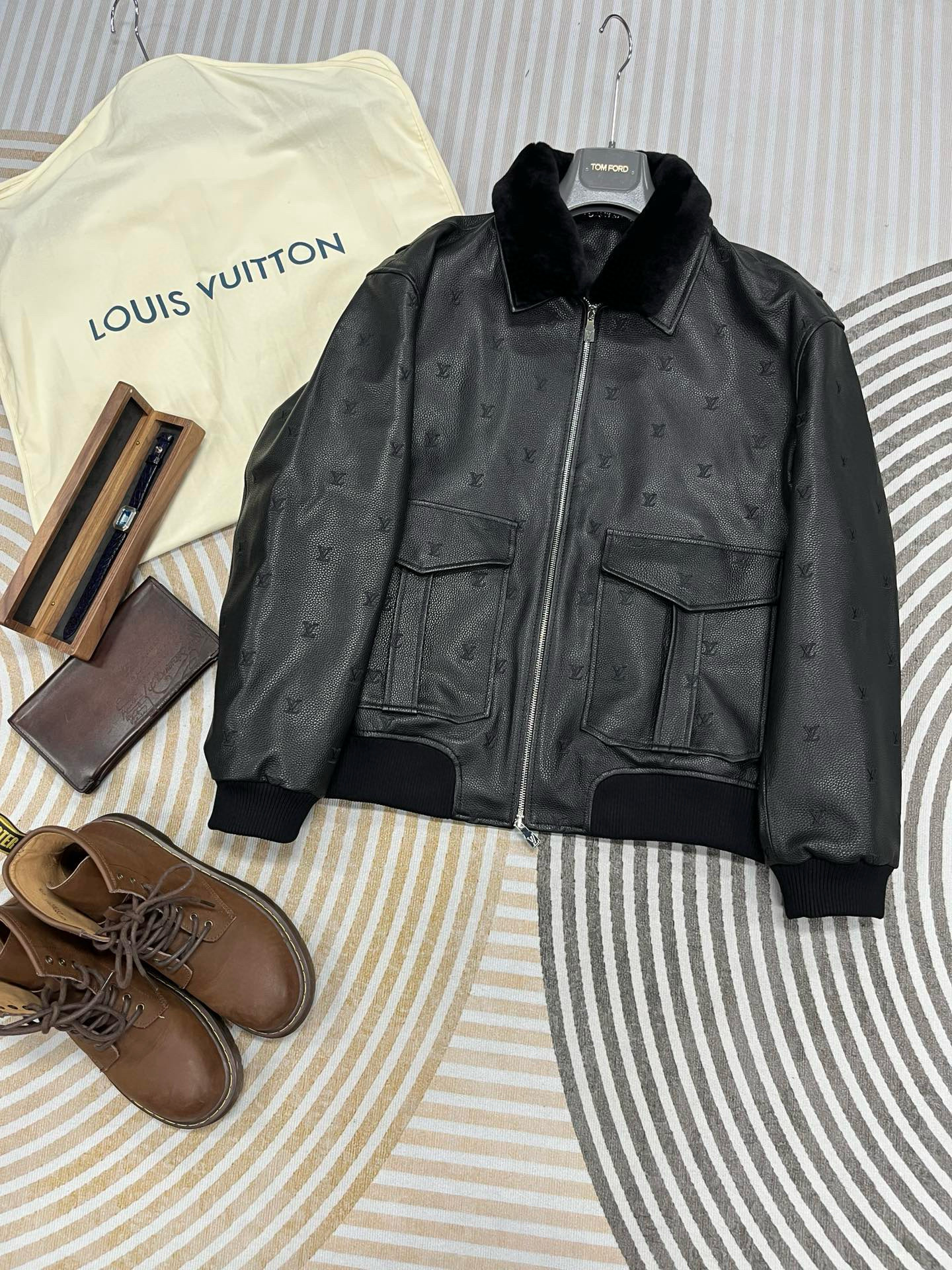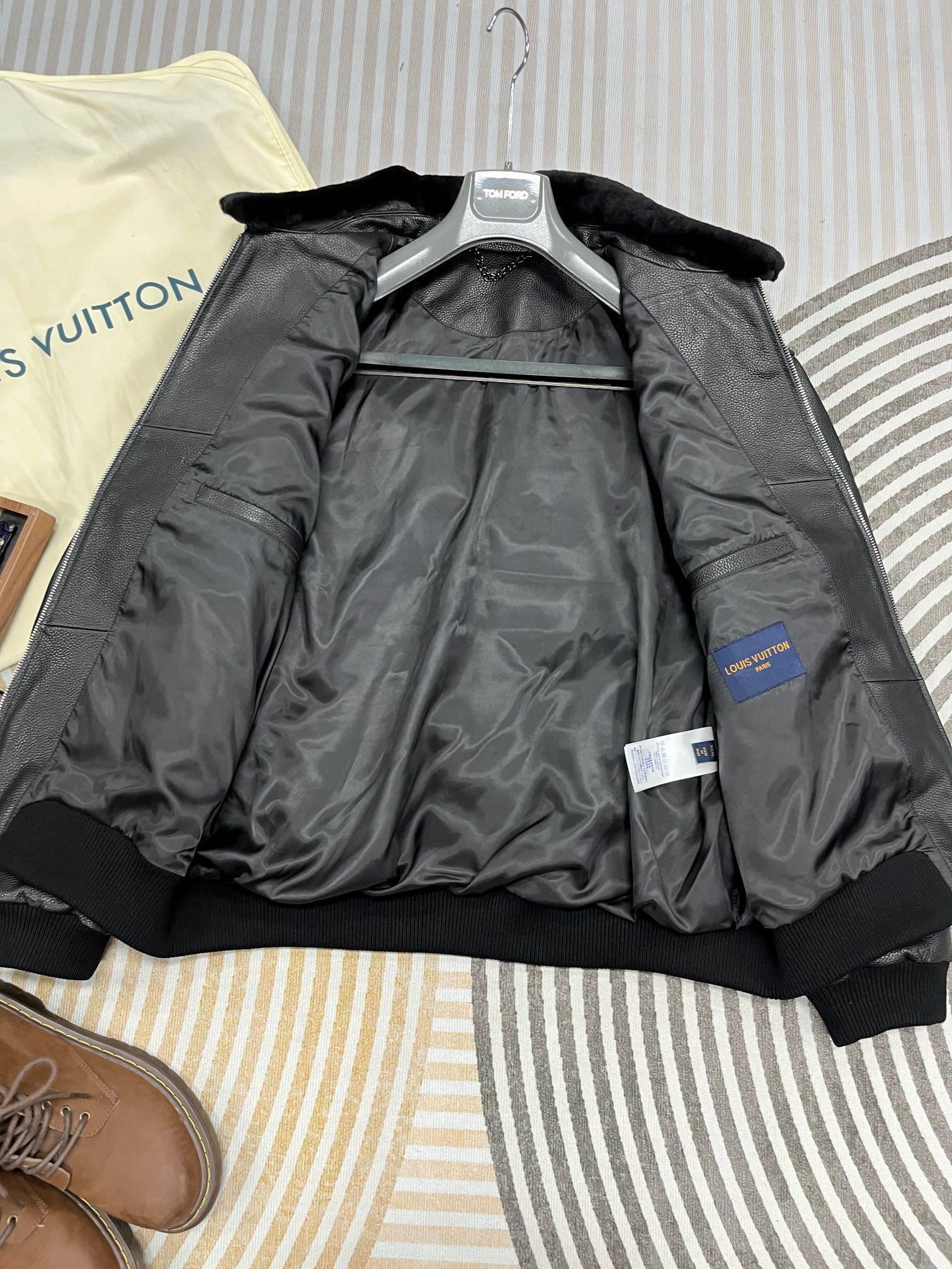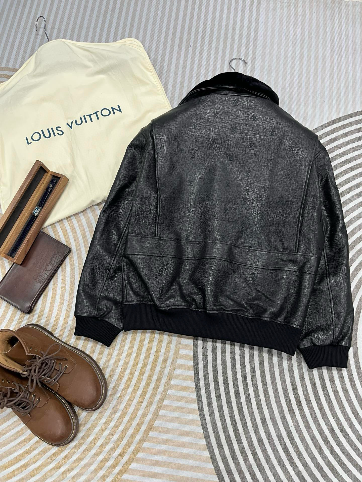 NIGO Louis Vuitton Men's Fall/winter Pilot Drawstring Jacket Solid Color Logo Jacquard Hair Collar Colorblocking Leather Jacket Back With Vents #nigo73354