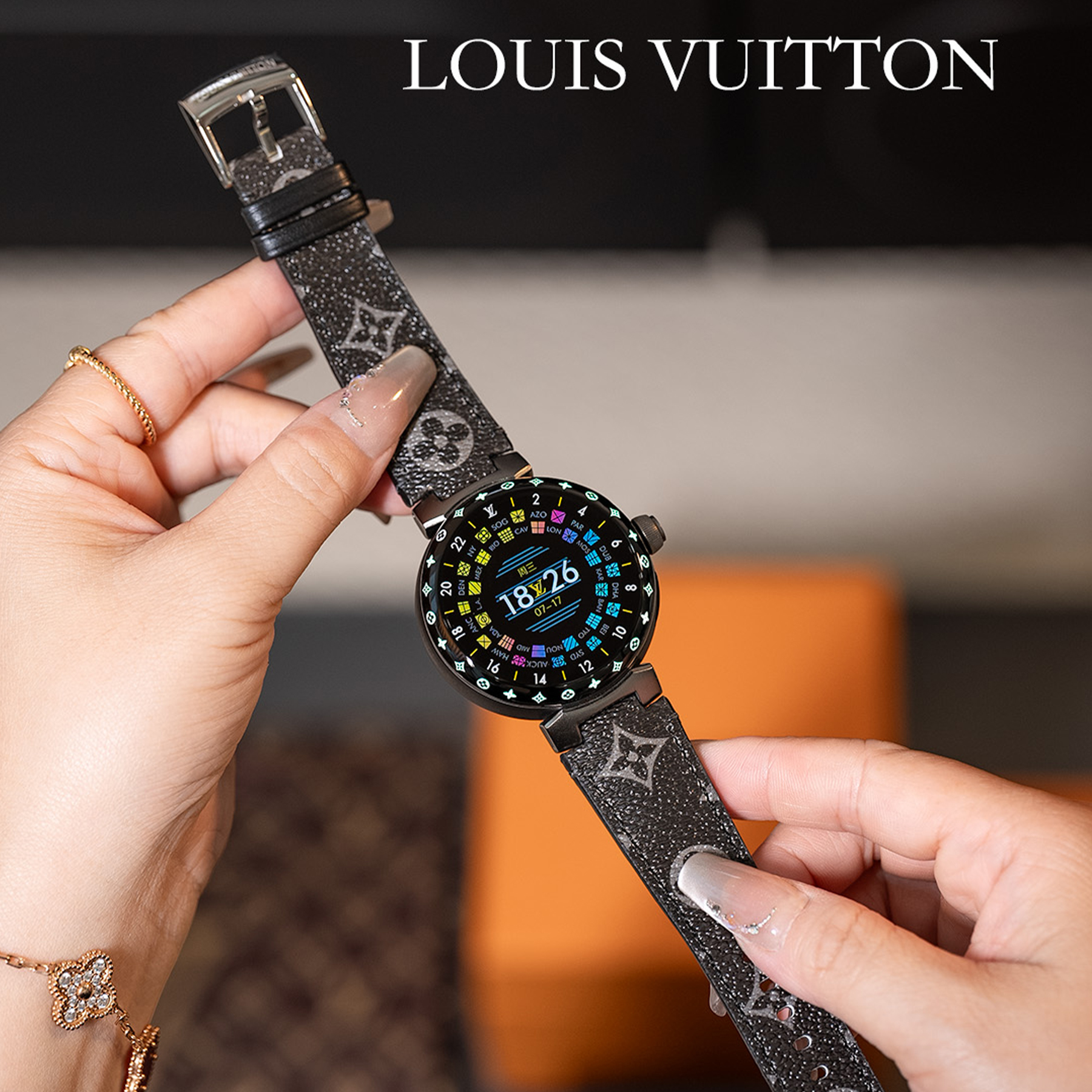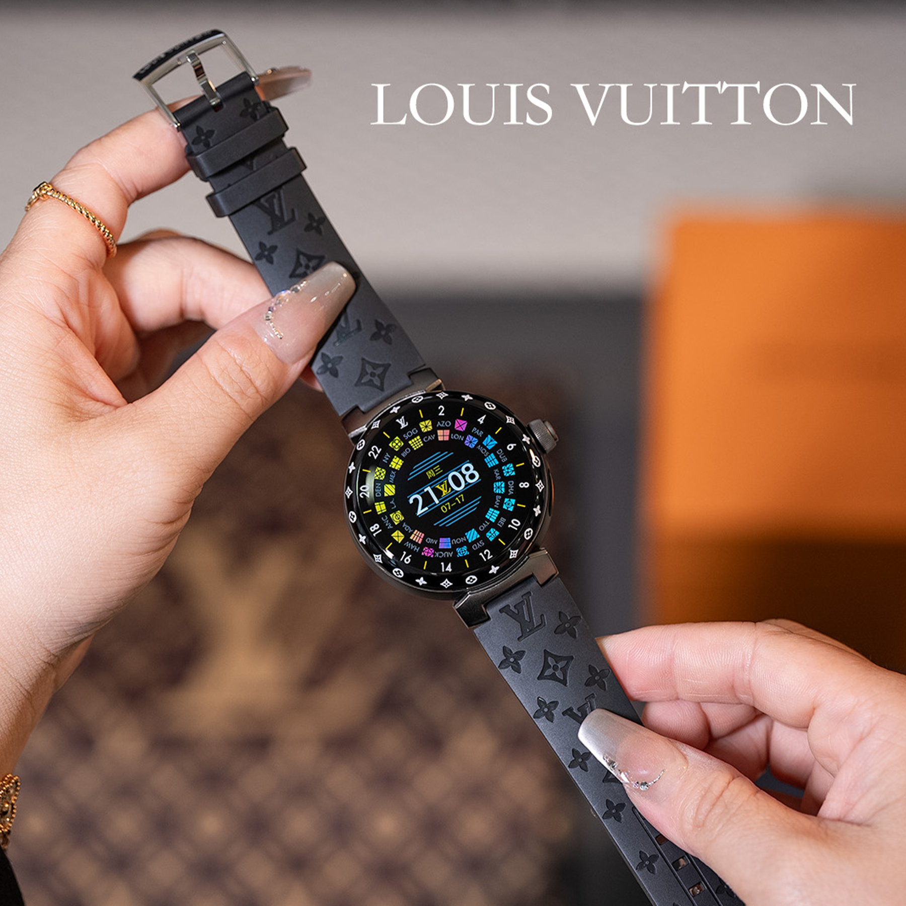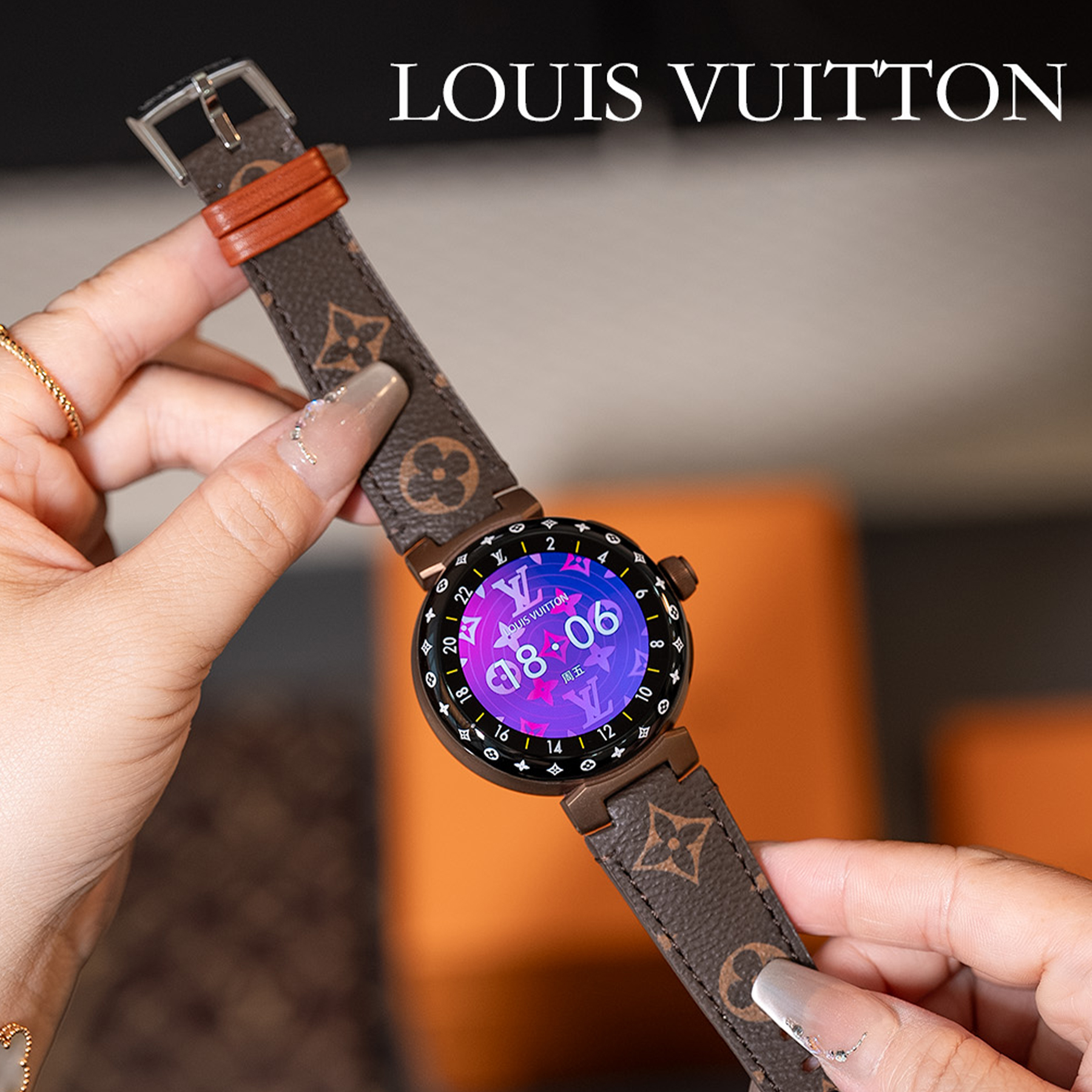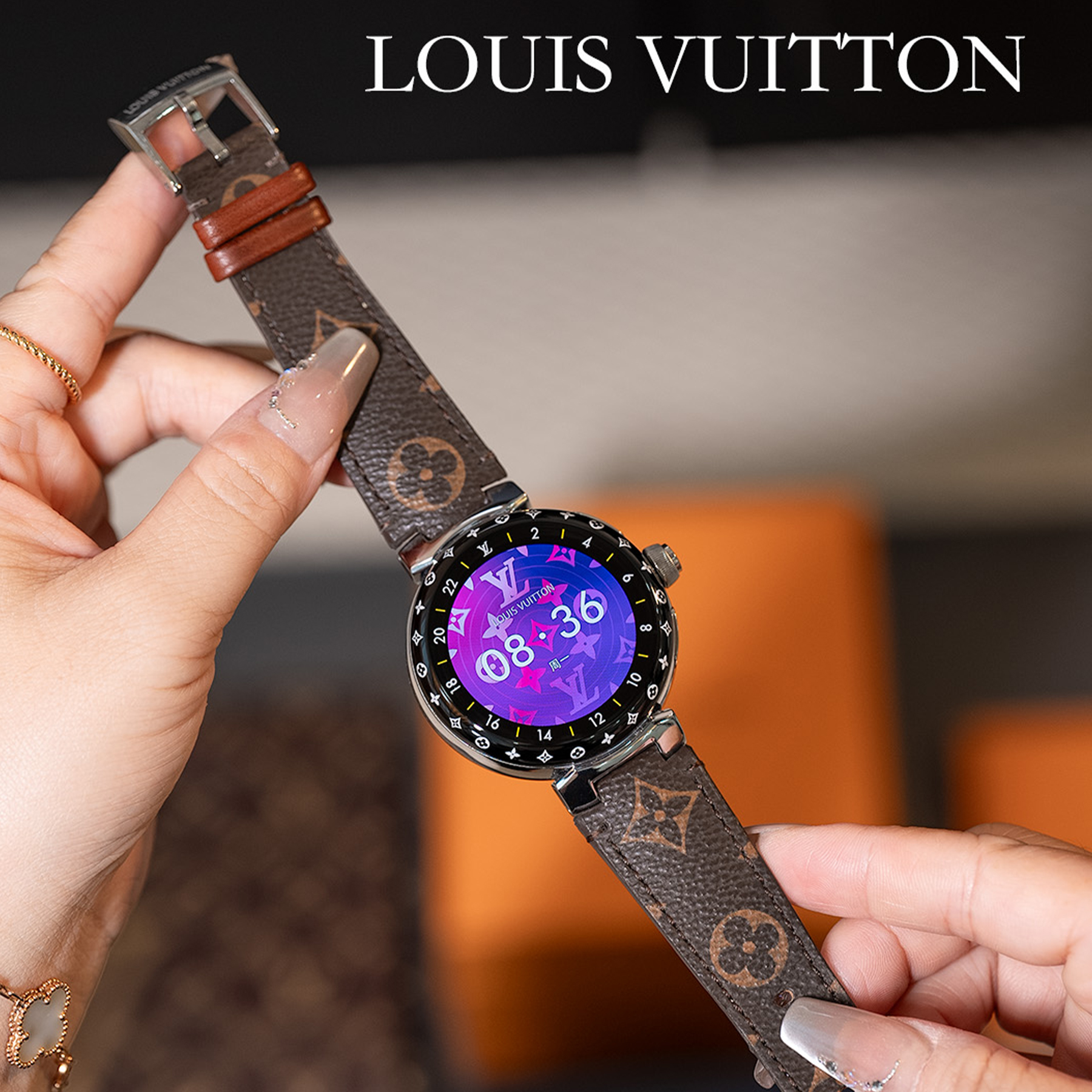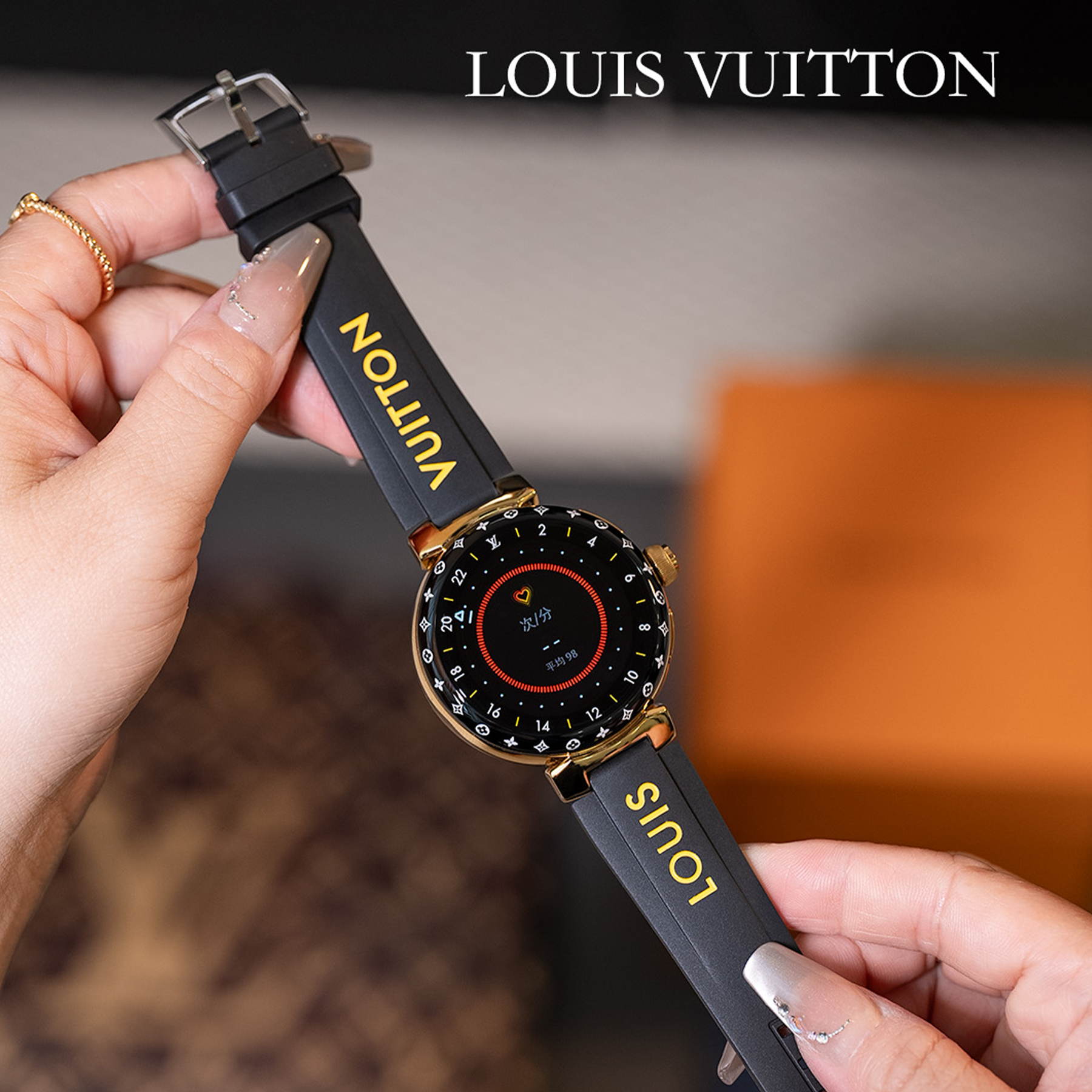 NIGO Louis Vuitton Tambour Horizon Light Up Connected Watch Men's Women's Fashion Accessories Diameter 44mm1.2 Inch Round Amoled Full Touch Screen Resolution 390*390 Sensor Actuator Life Waterproof Smart Watch #nigo81447