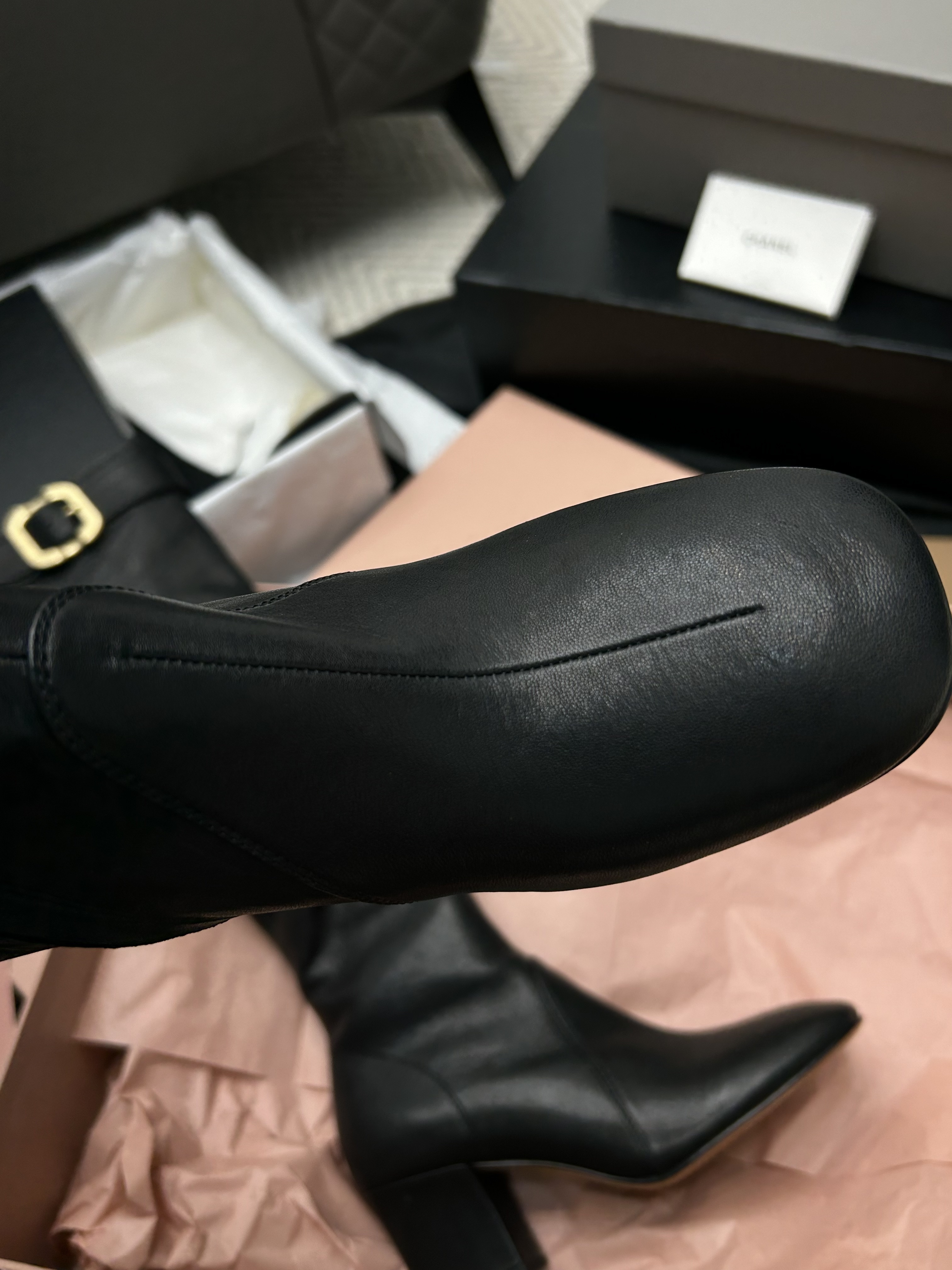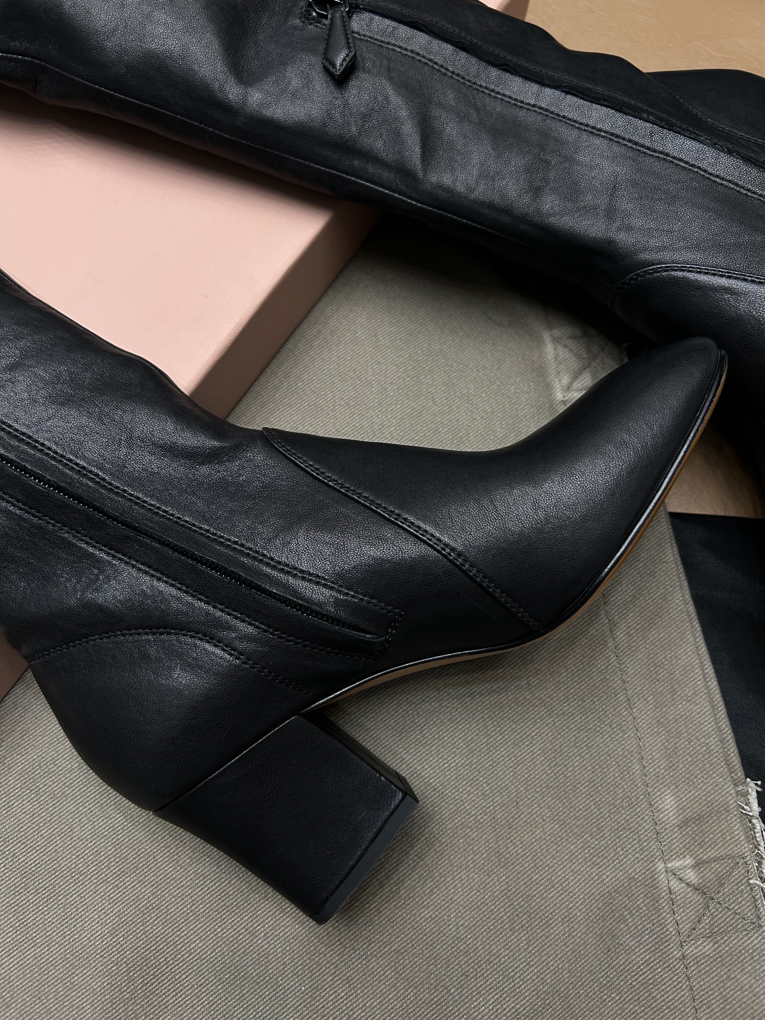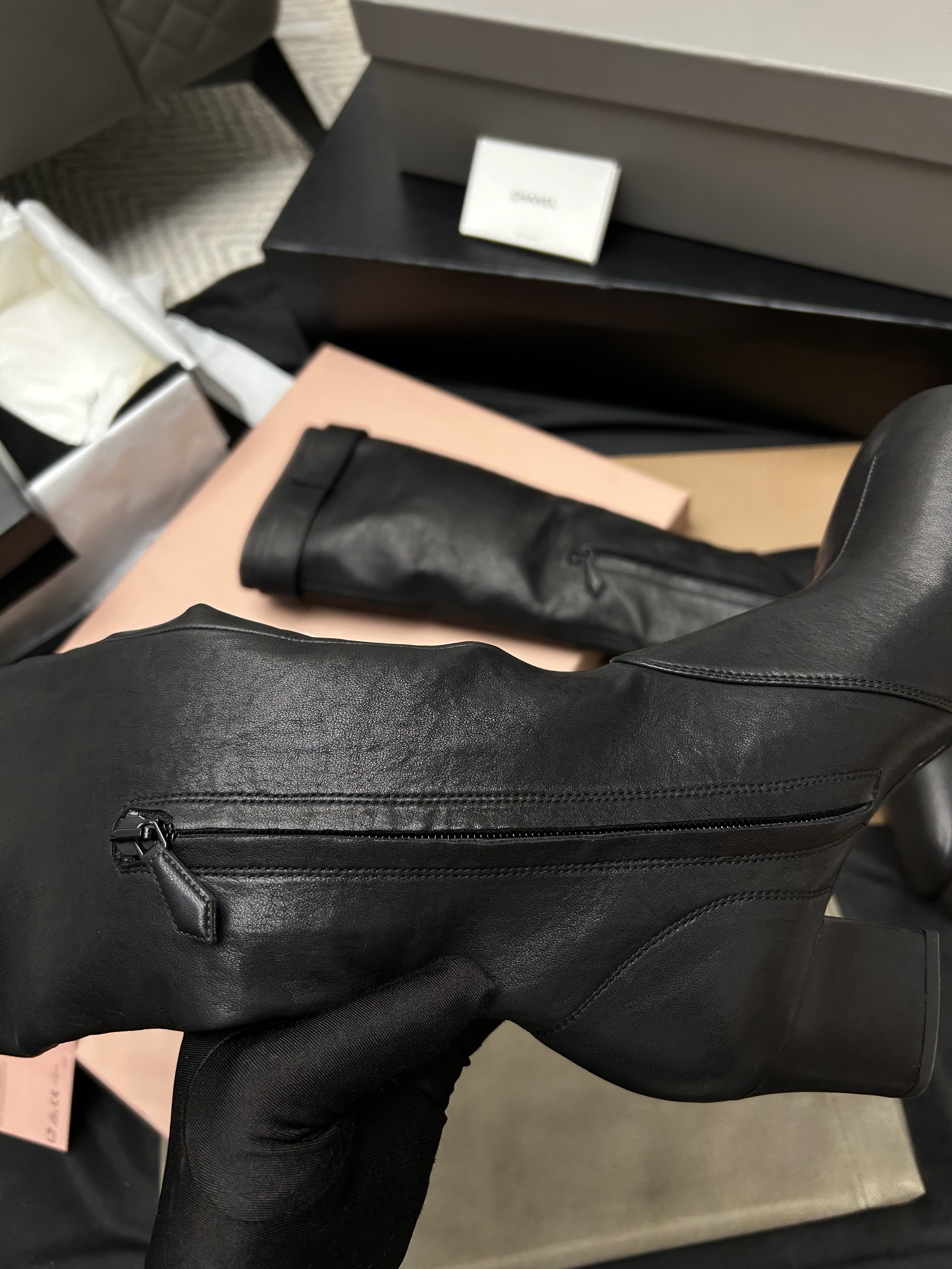 NIGO MiuMiu Women's Fall/Winter Fashion Classic Solid Color Leather Round Toe Sleeve Style Zipper Buckle Elastic Bare Leather Boots High Top Boots Shoes #nigo79238