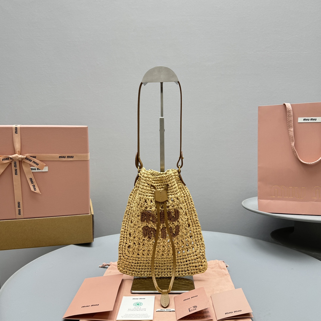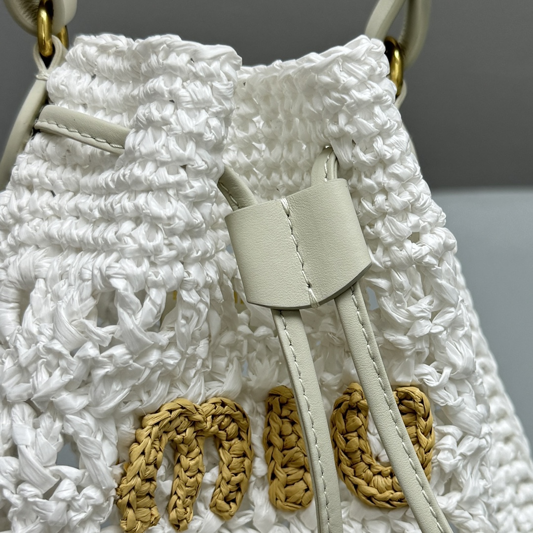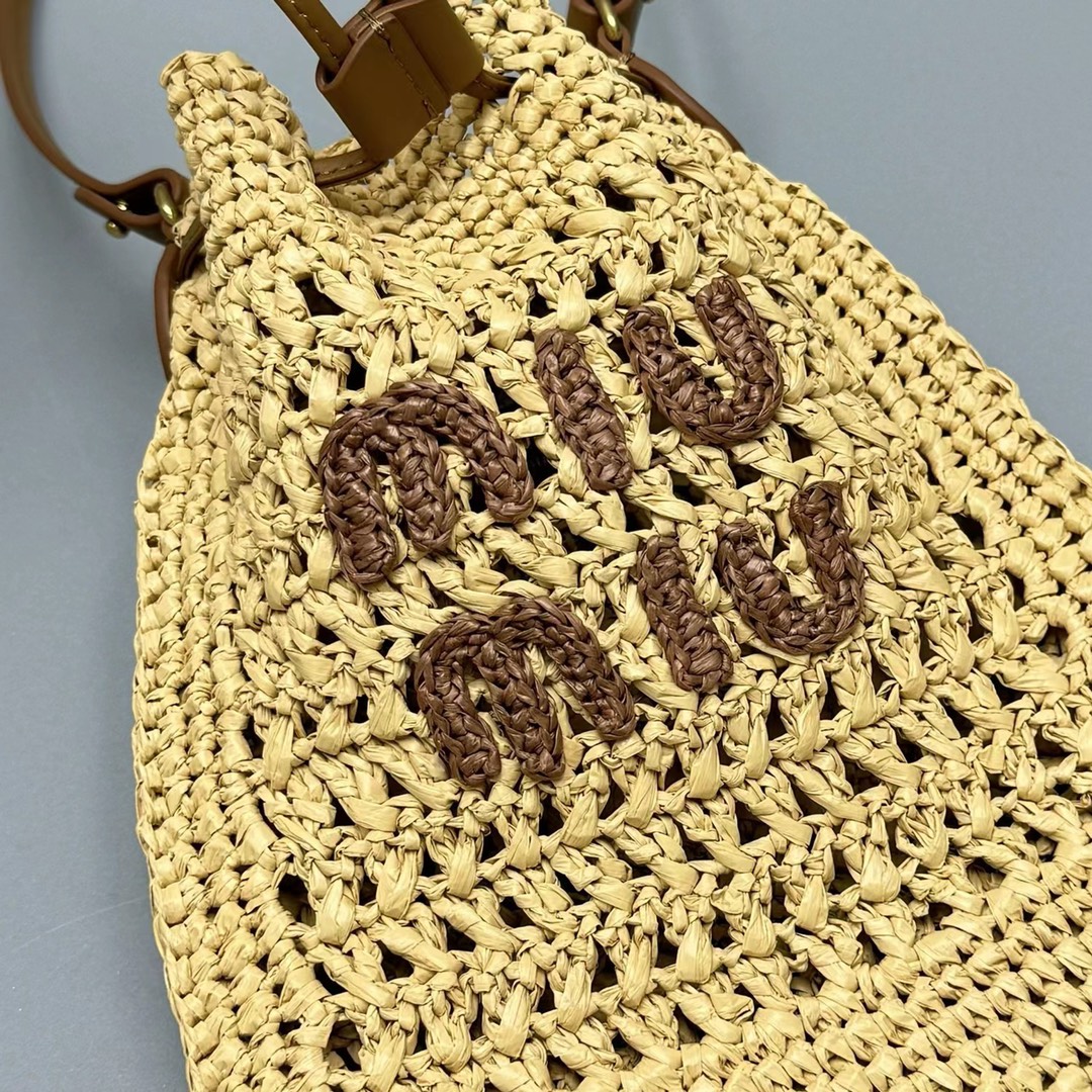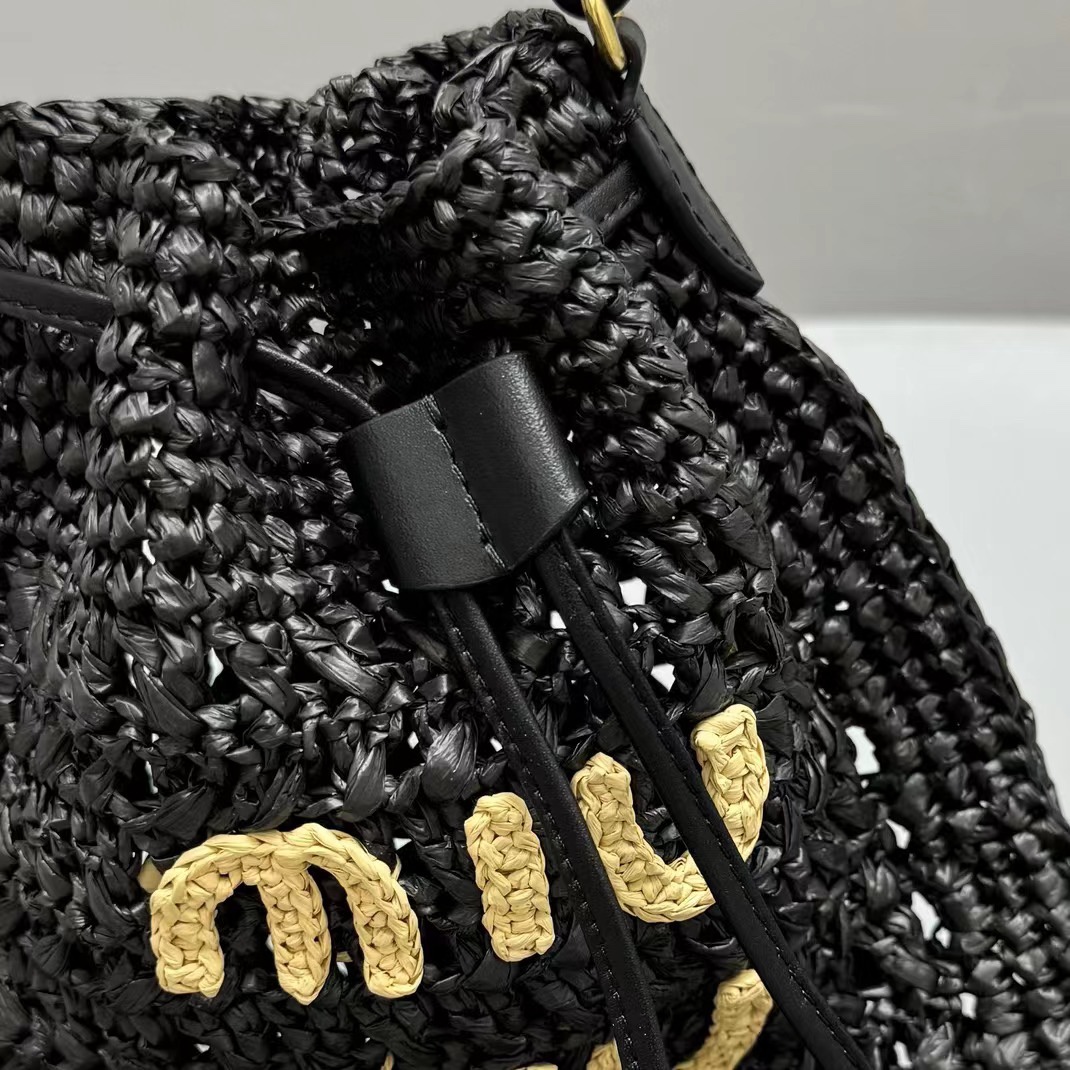NIGO MiuMiu Women‘s Solid Color Embroidered Letter Logo Drawstring Closure Raffia Patch Leather Tote Shoulder Bag Bags #nigo99777