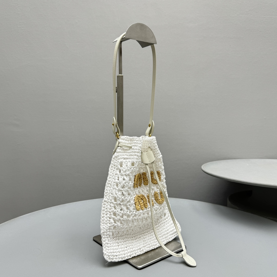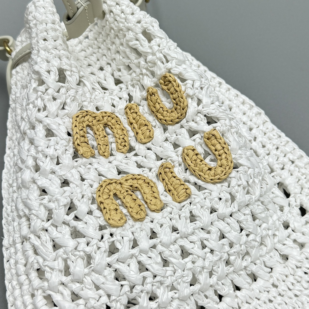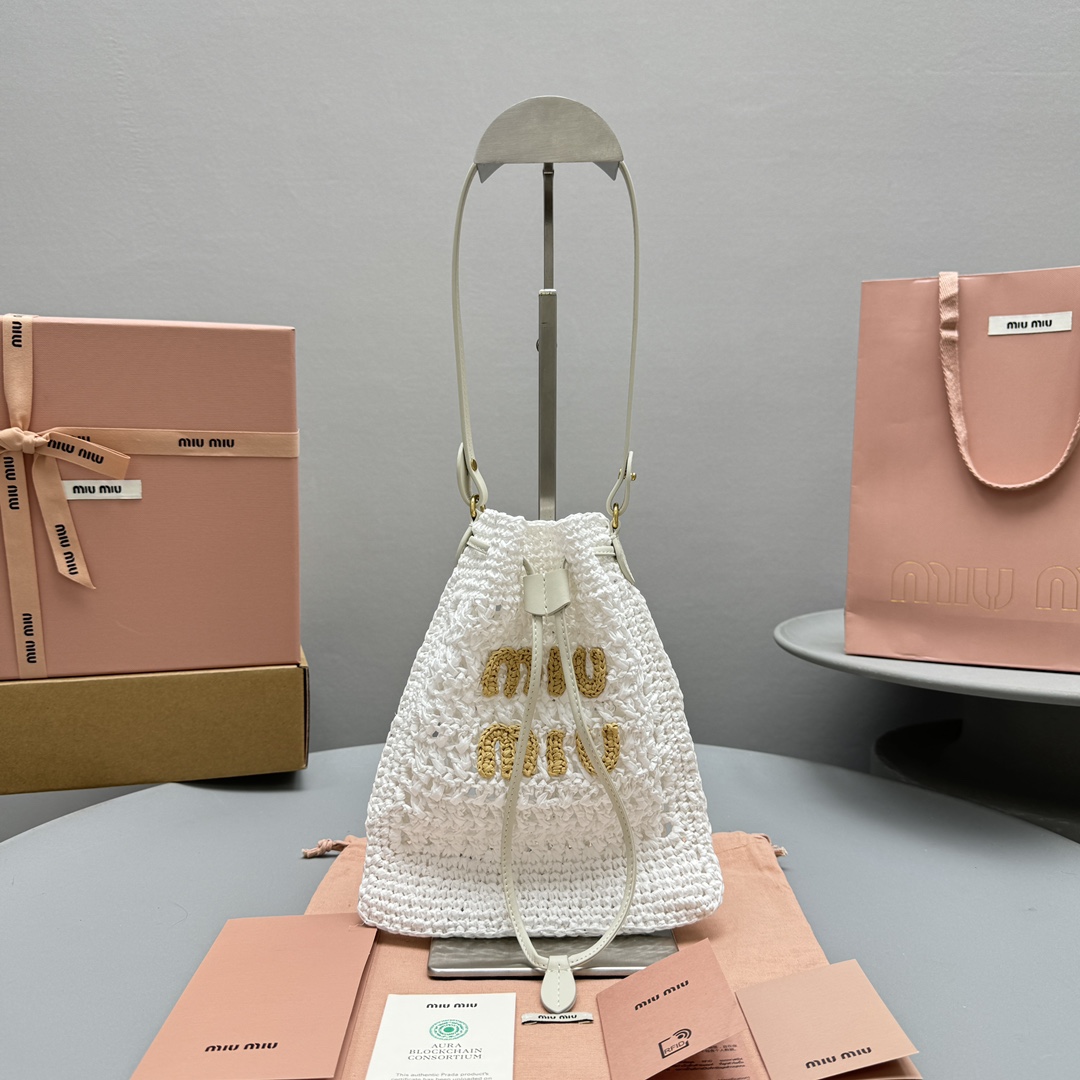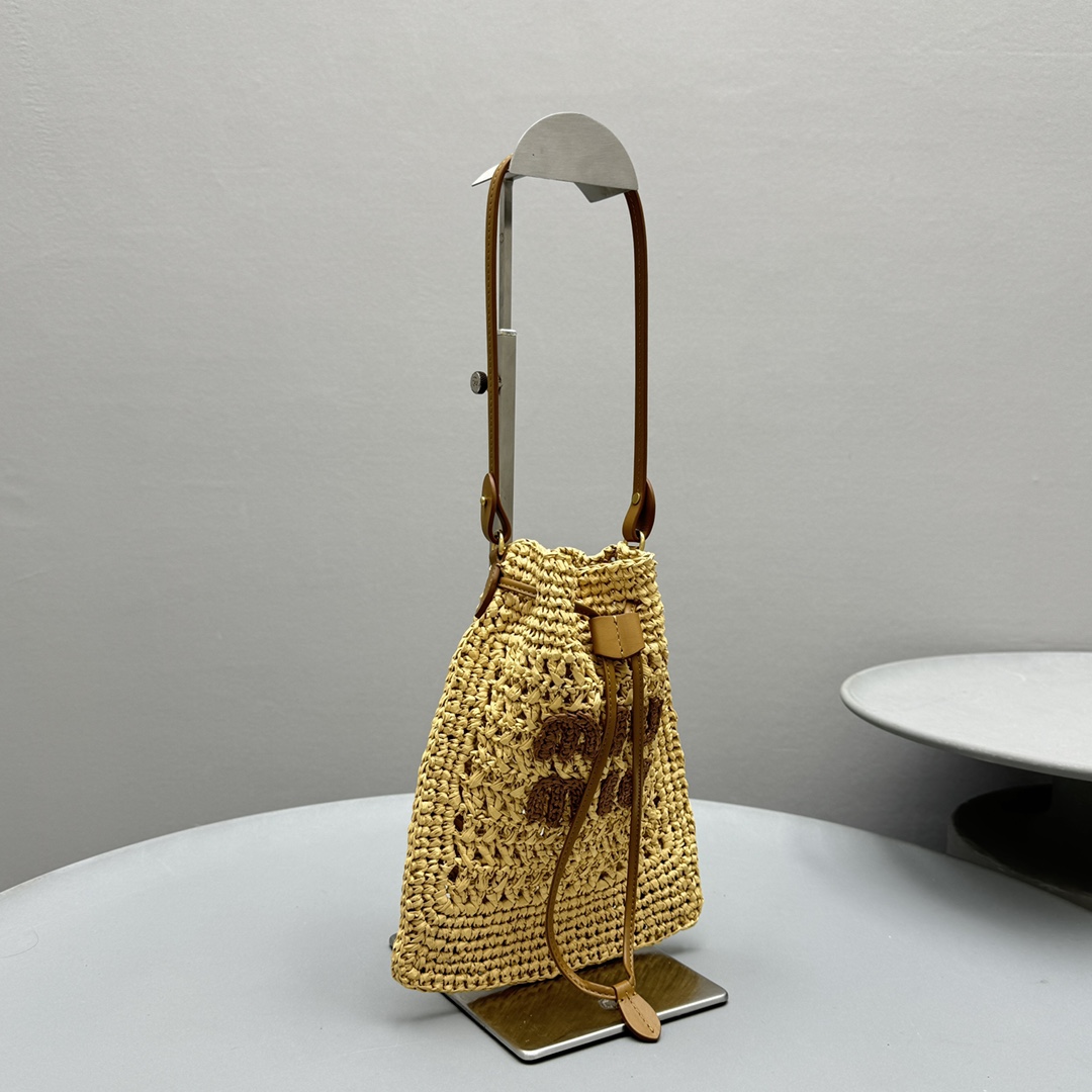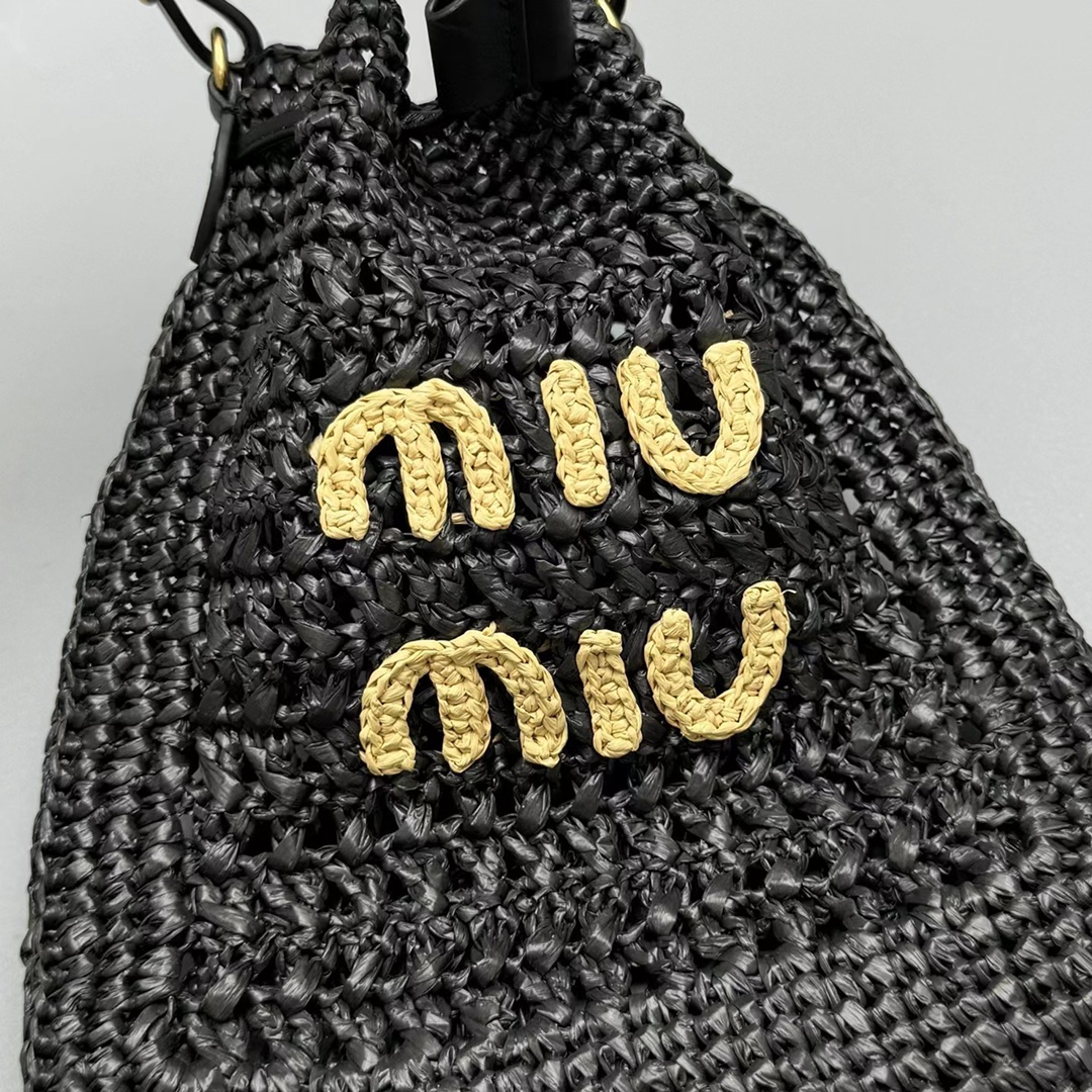 NIGO MiuMiu Women‘s Solid Color Embroidered Letter Logo Drawstring Closure Raffia Patch Leather Tote Shoulder Bag Bags #nigo99777