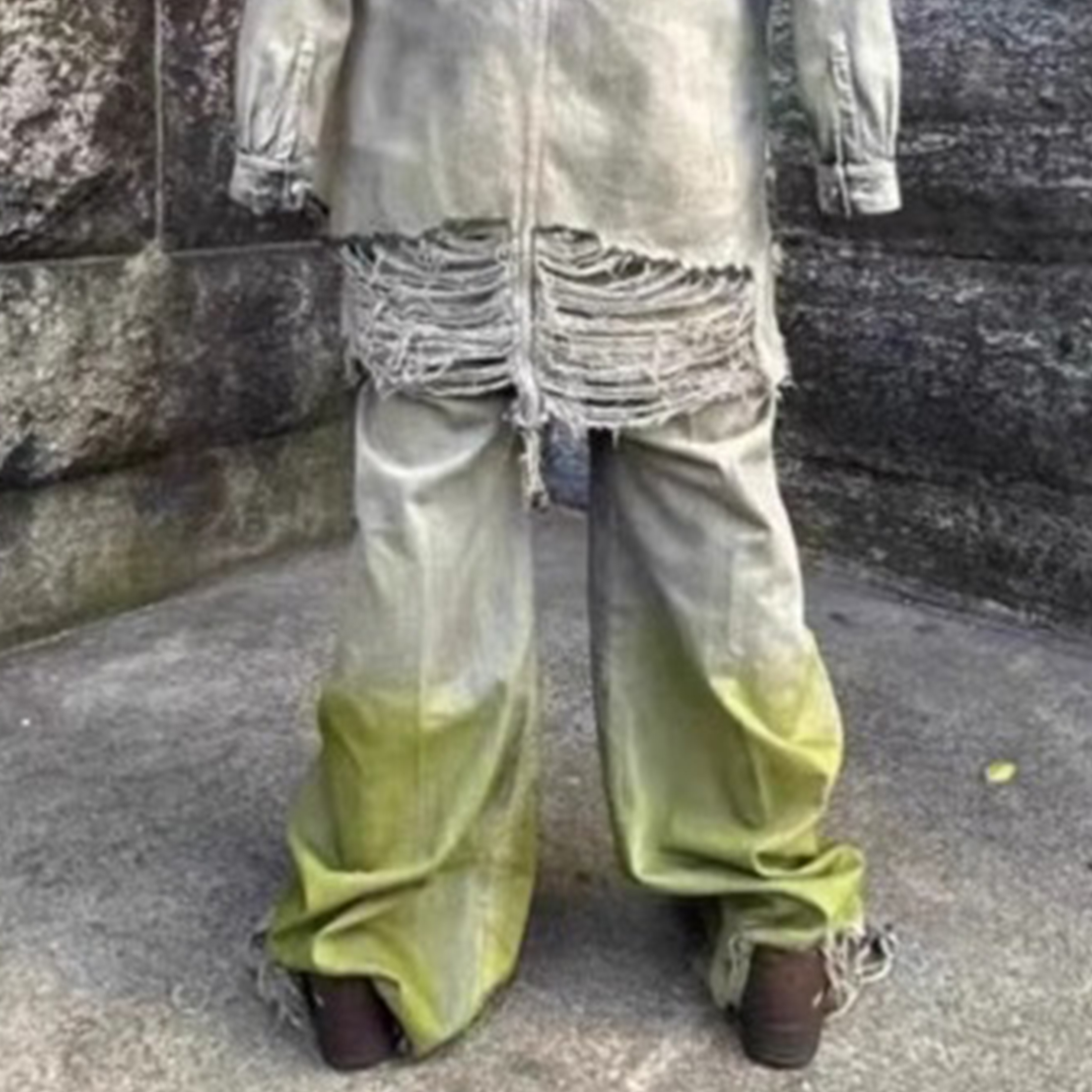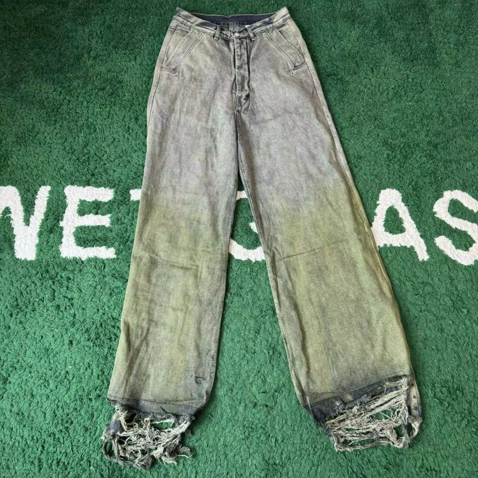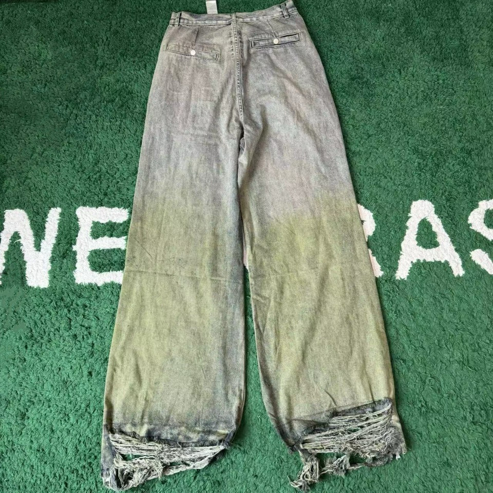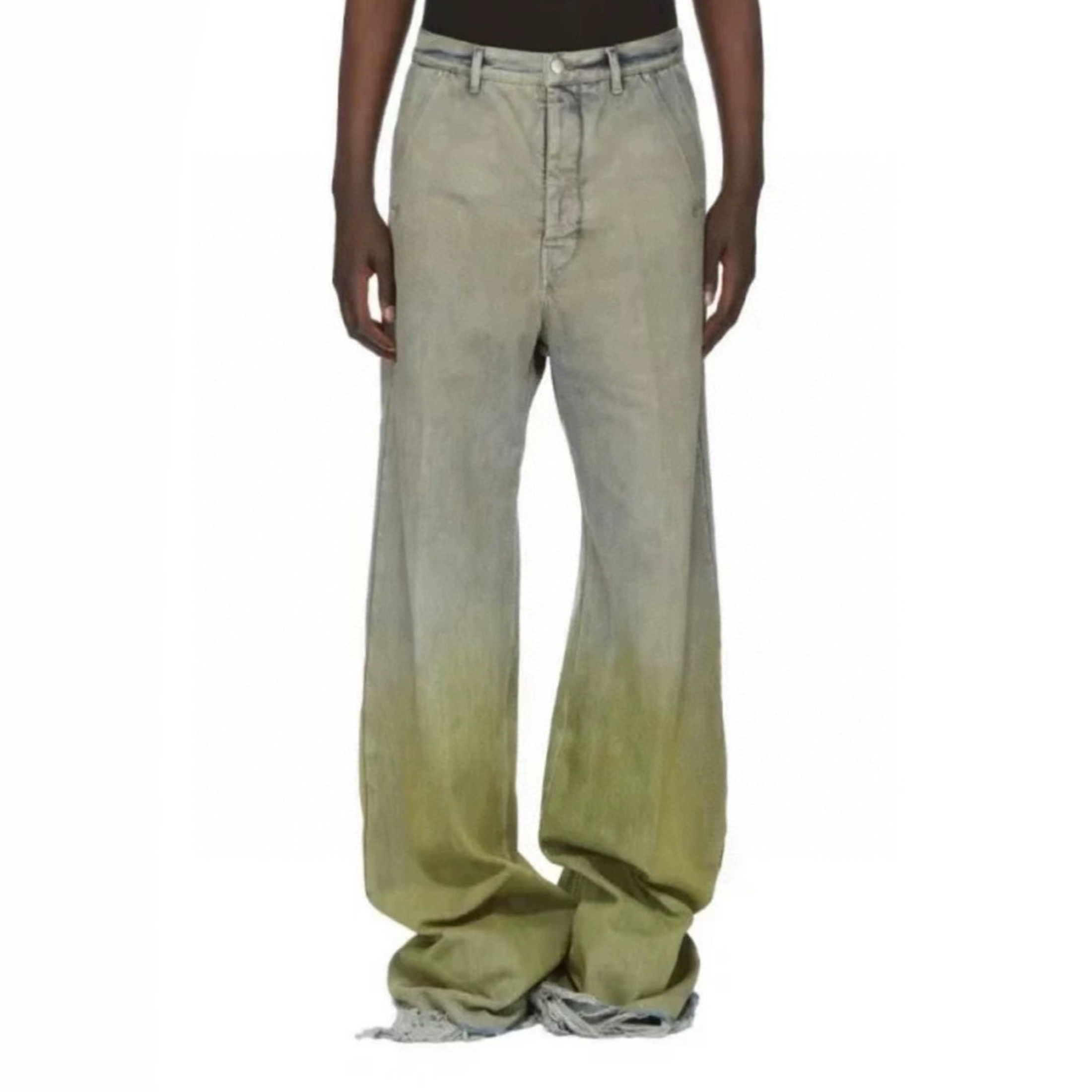 NIGO Rick Owens Men's Women's Four Seasons Gradient Yellow Green Washed Vintage Hole Breaking Wide Leg Denim Long Pants Ngvp #nigo8192