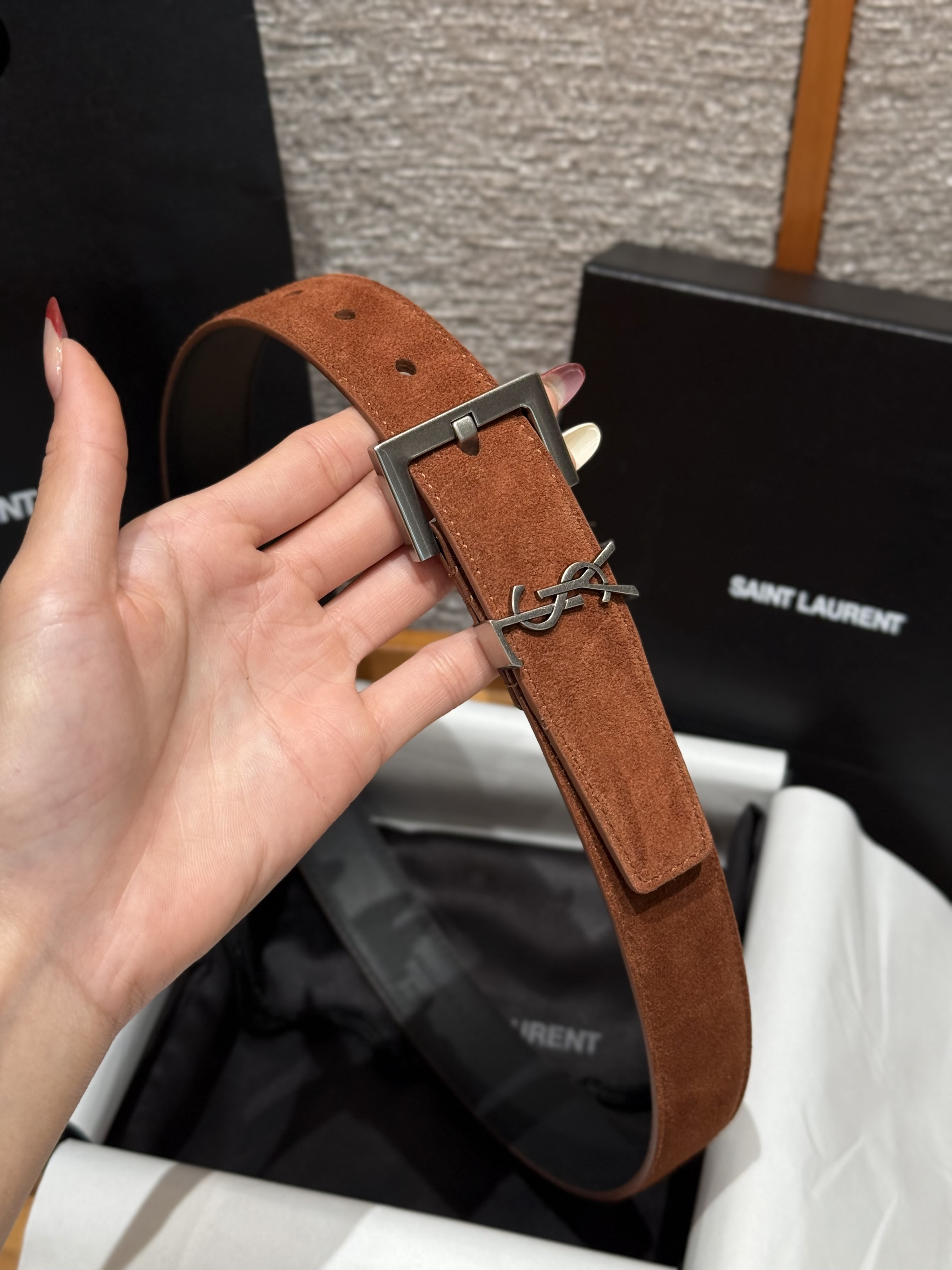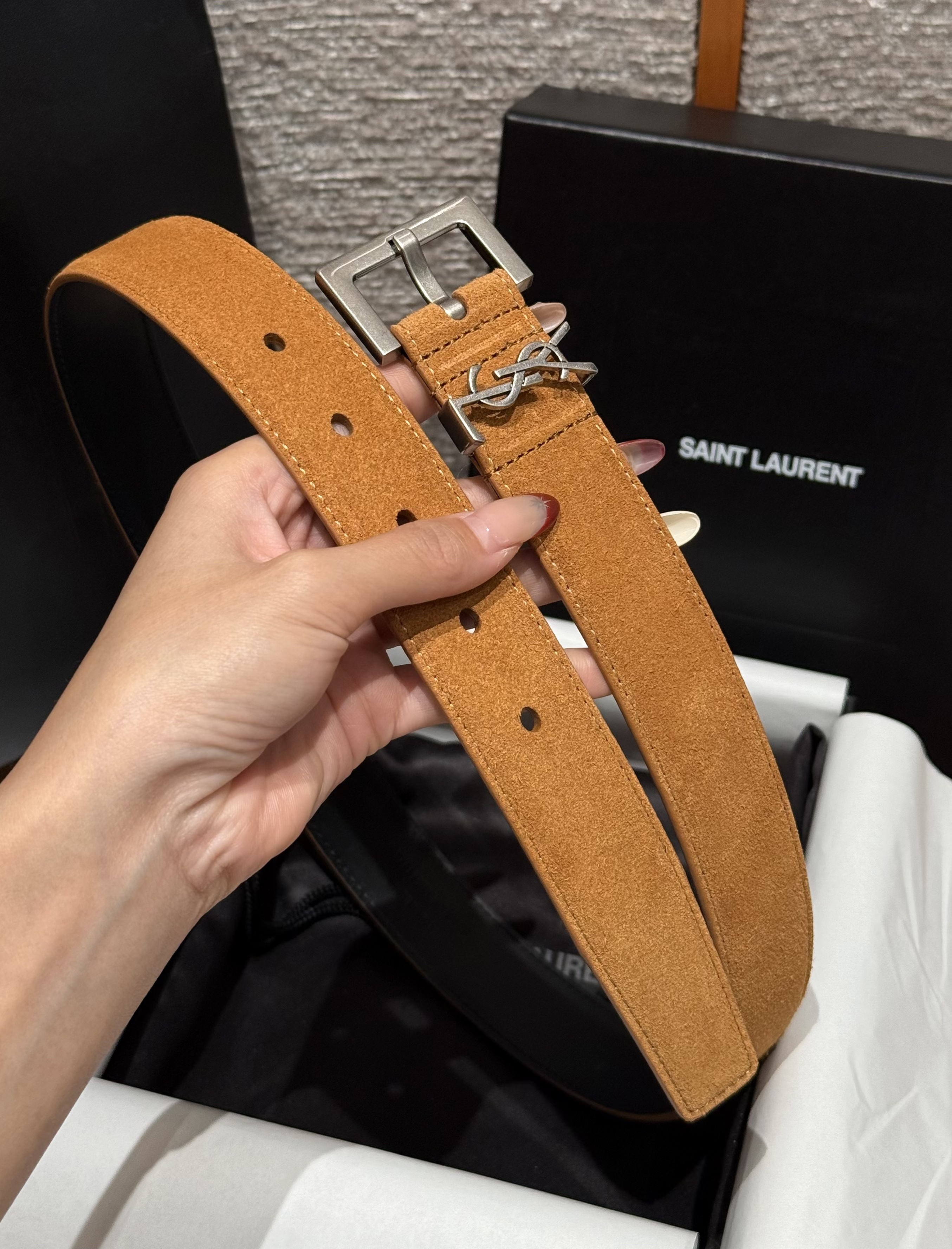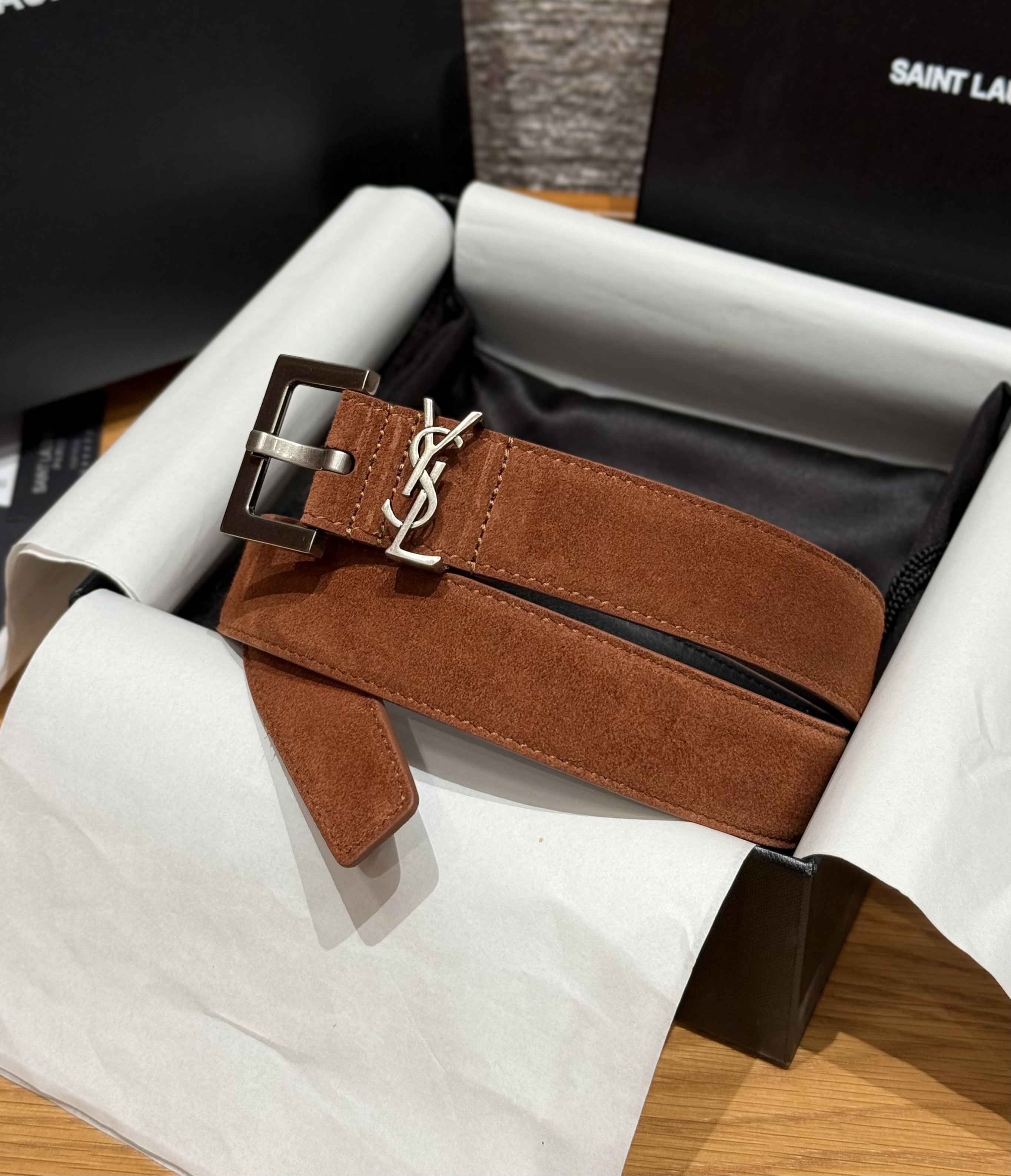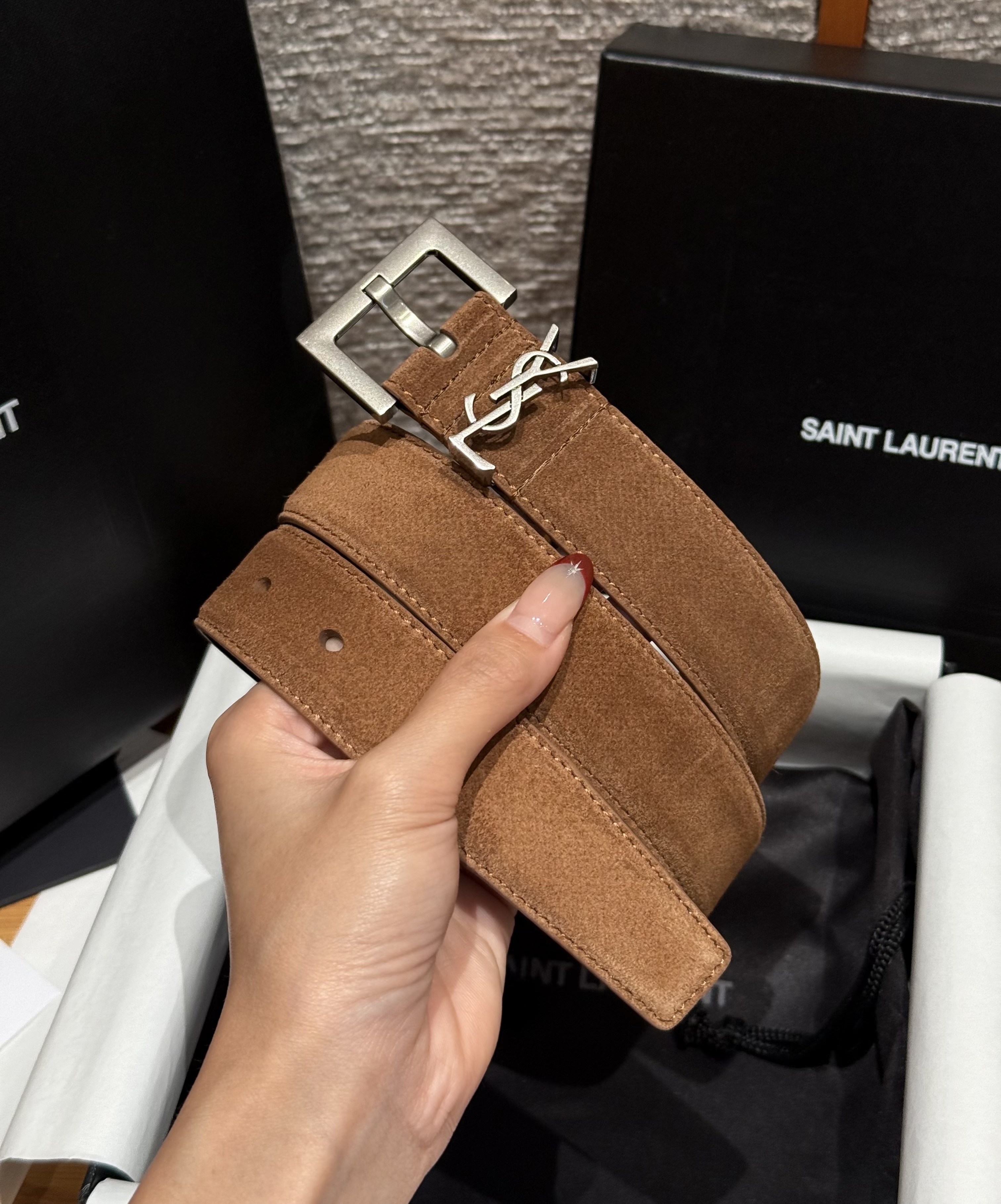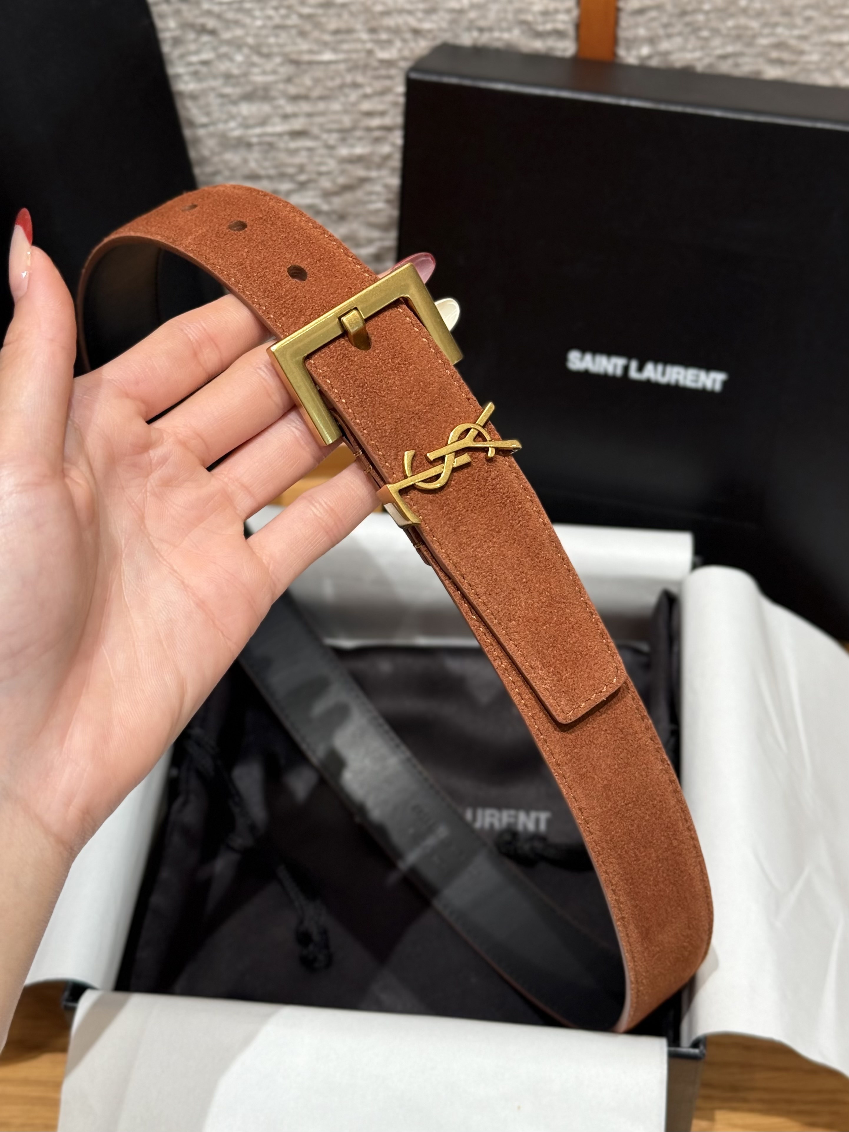 This Saint Laurent belt showcases the brand's exceptional craftsmanship and attention to detail. Crafted from premium suede, this piece combines timeless luxury with modern style.