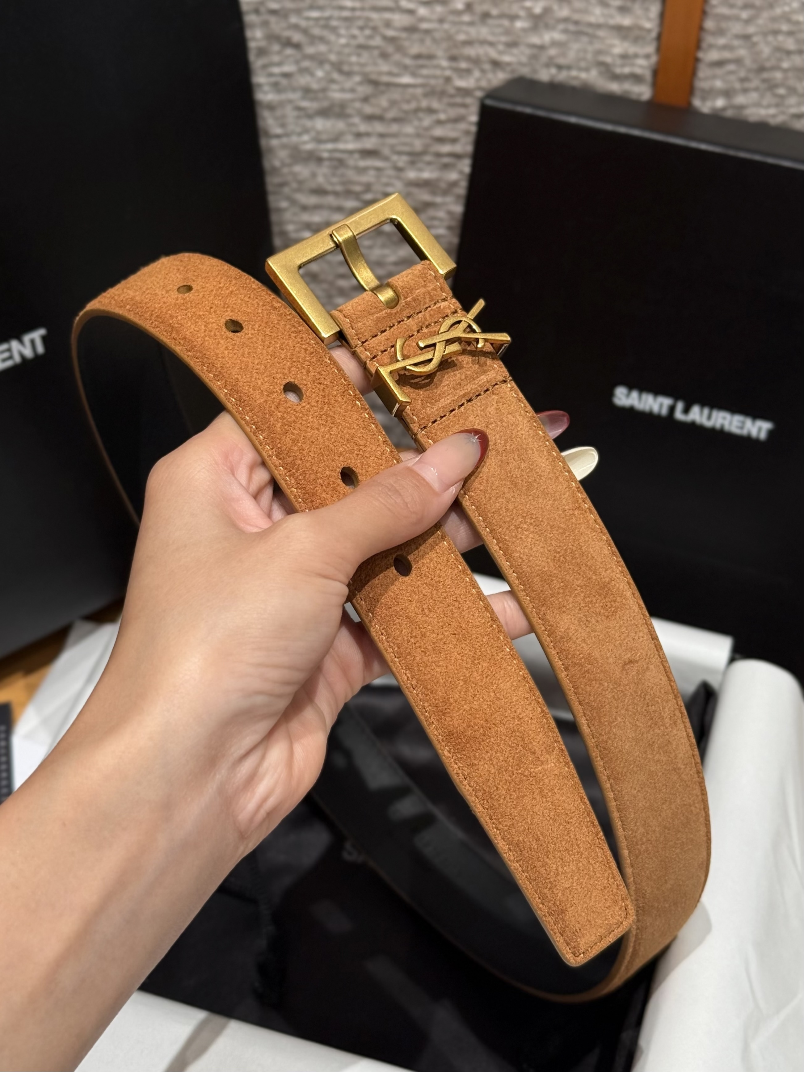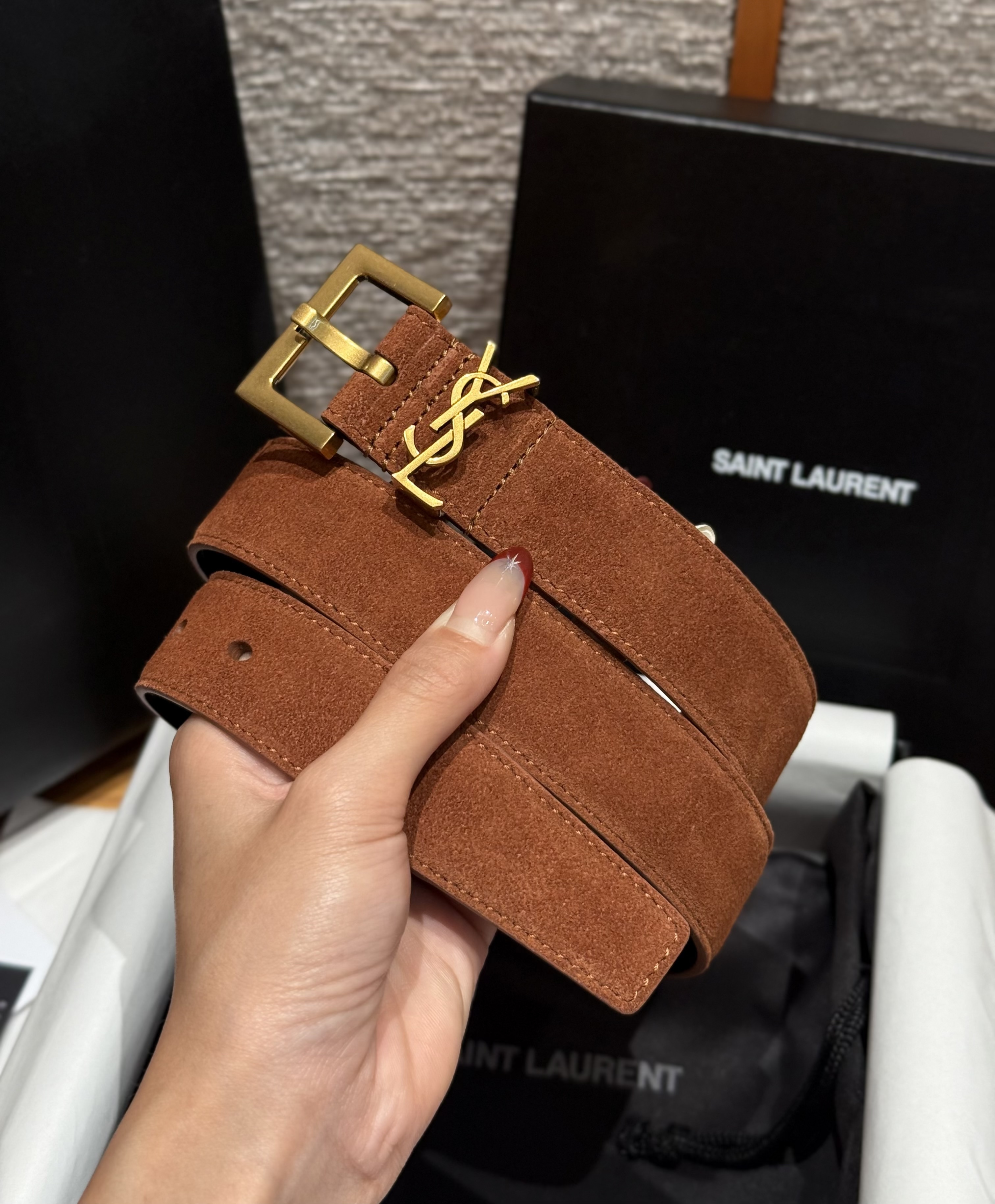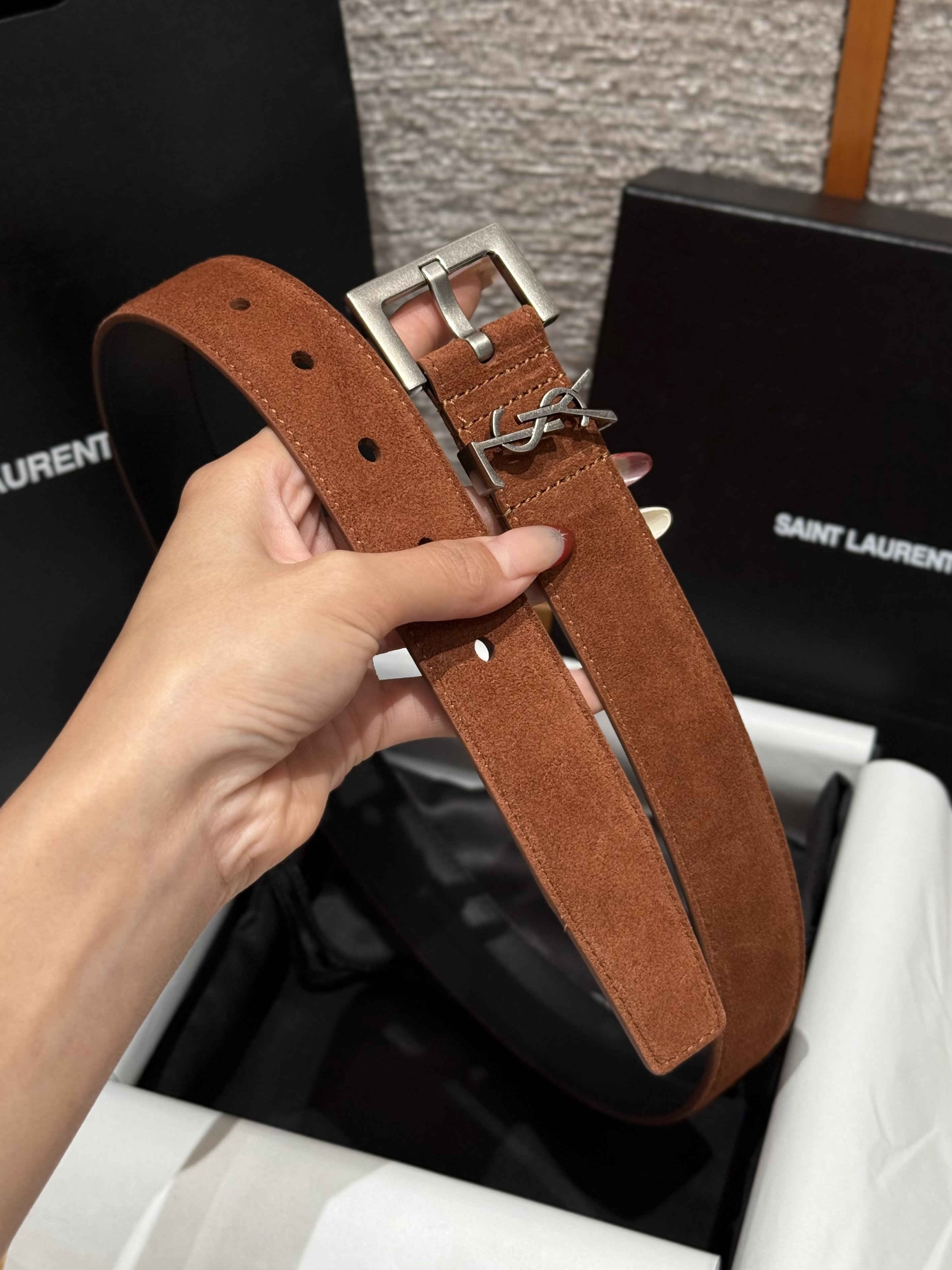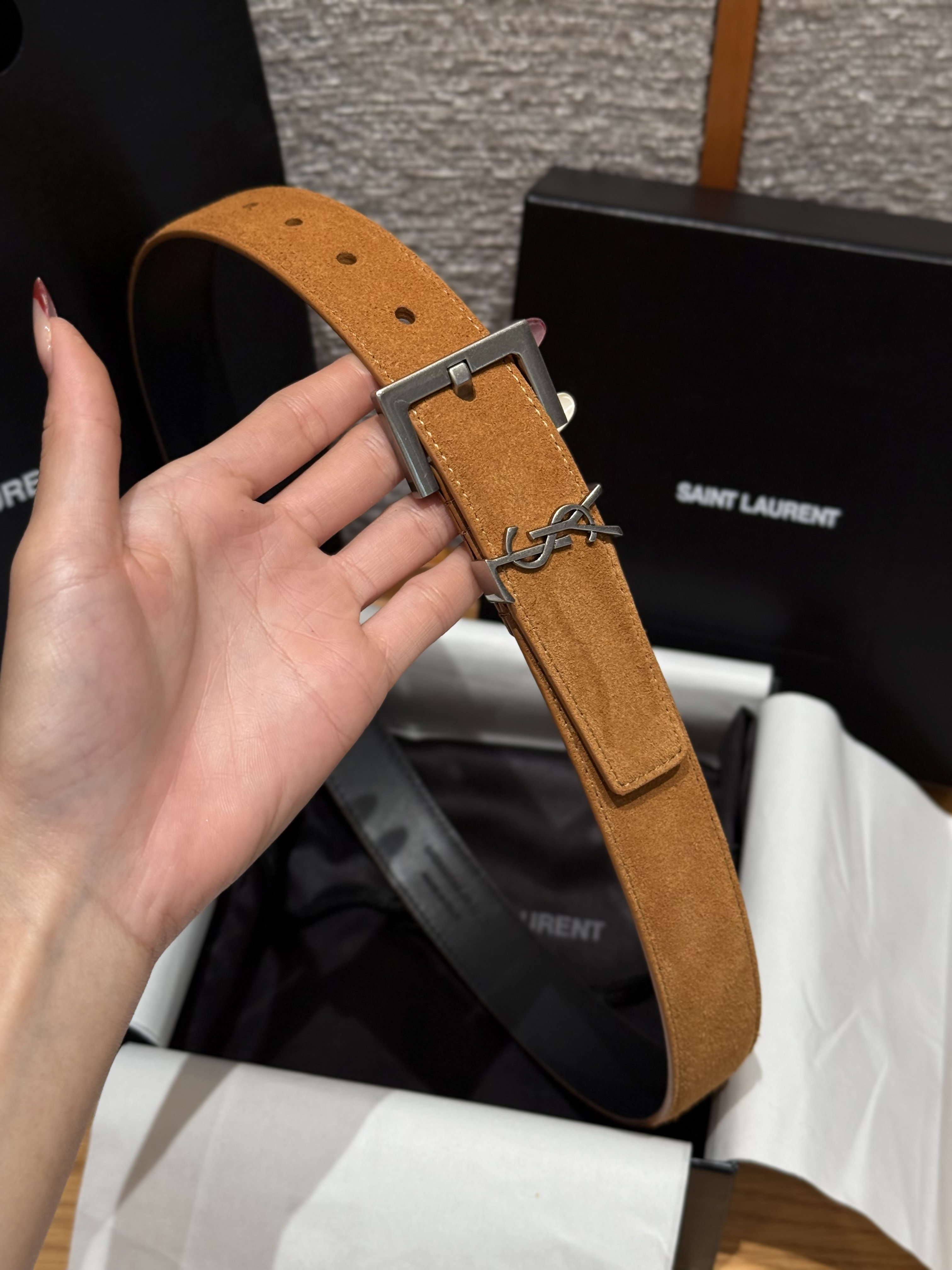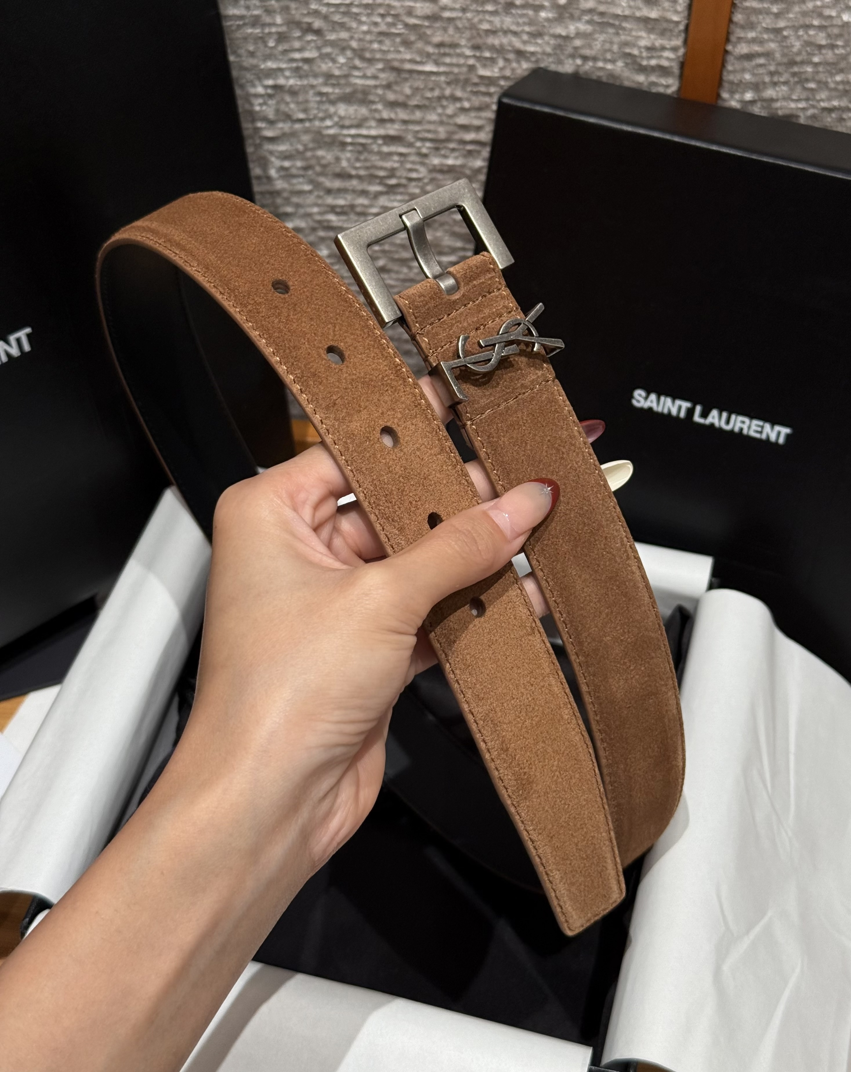 This Saint Laurent belt showcases the brand's exceptional craftsmanship and attention to detail. Crafted from premium suede, this piece combines timeless luxury with modern style.