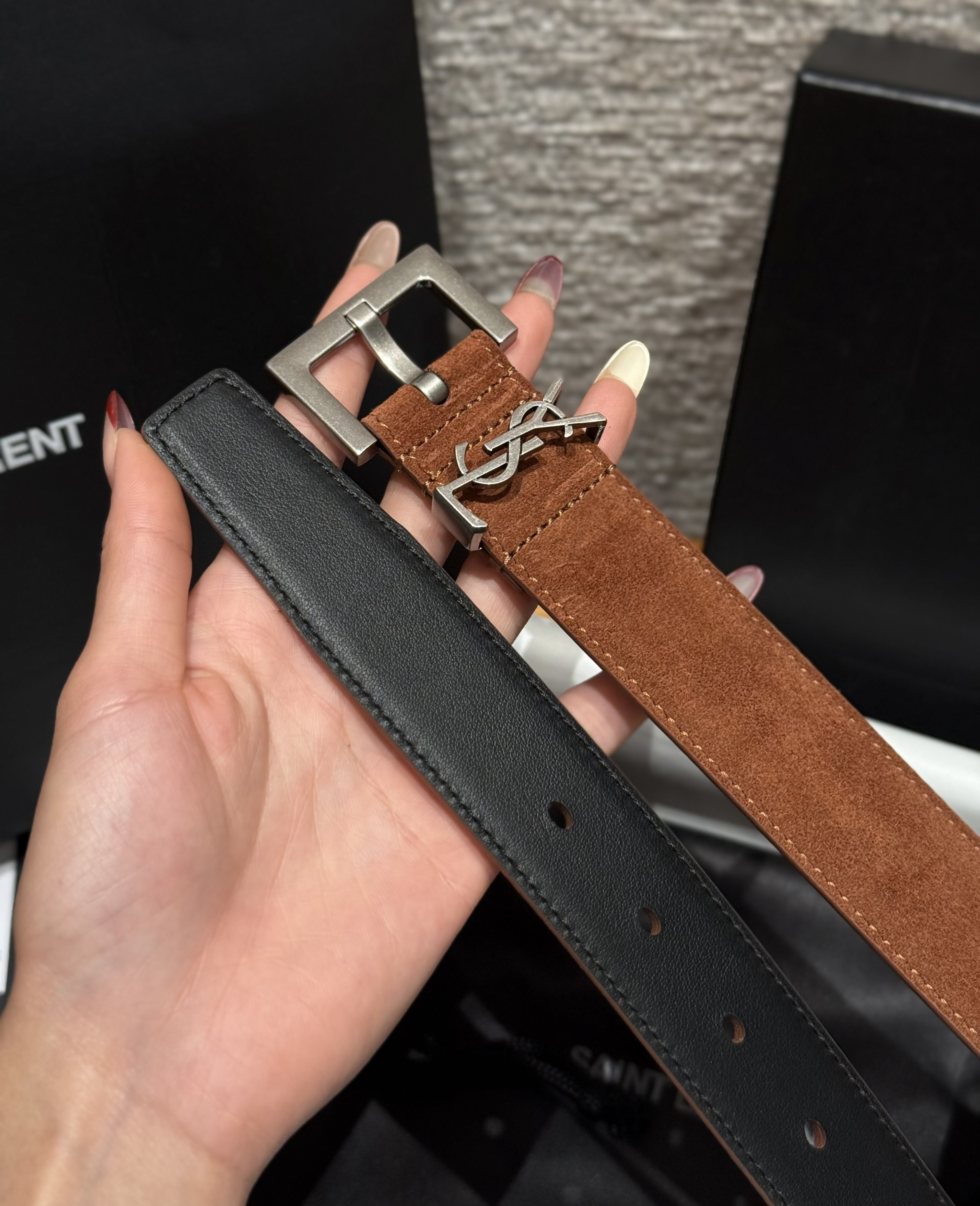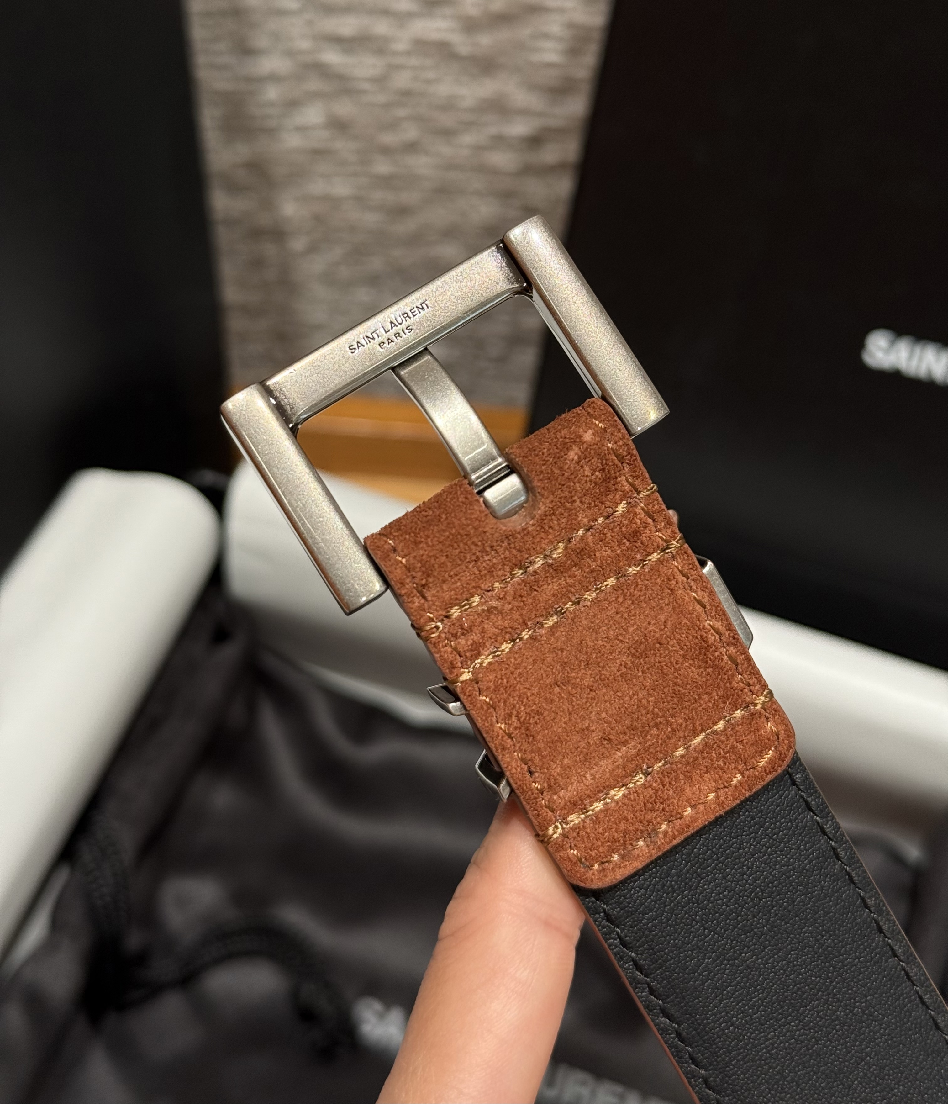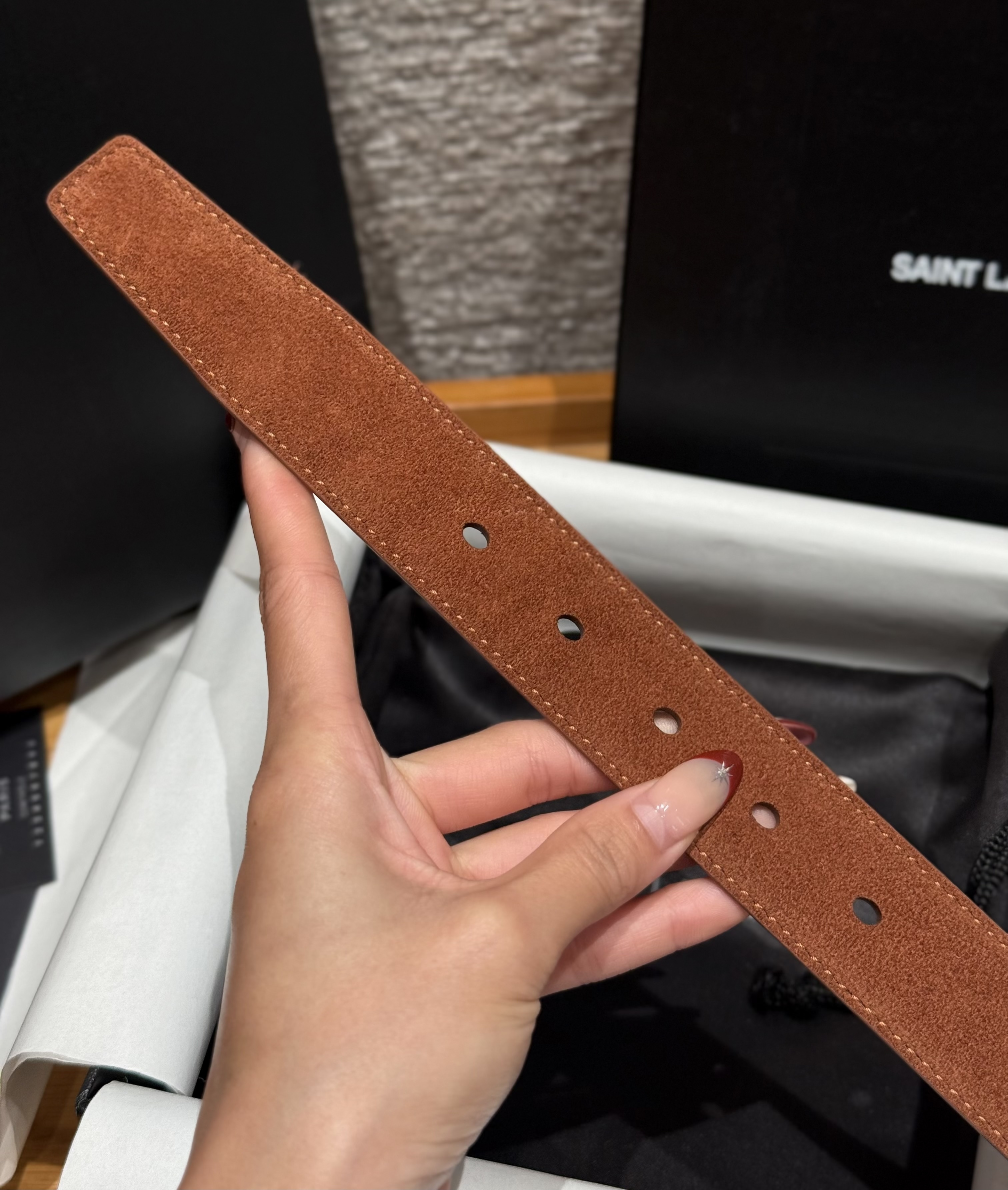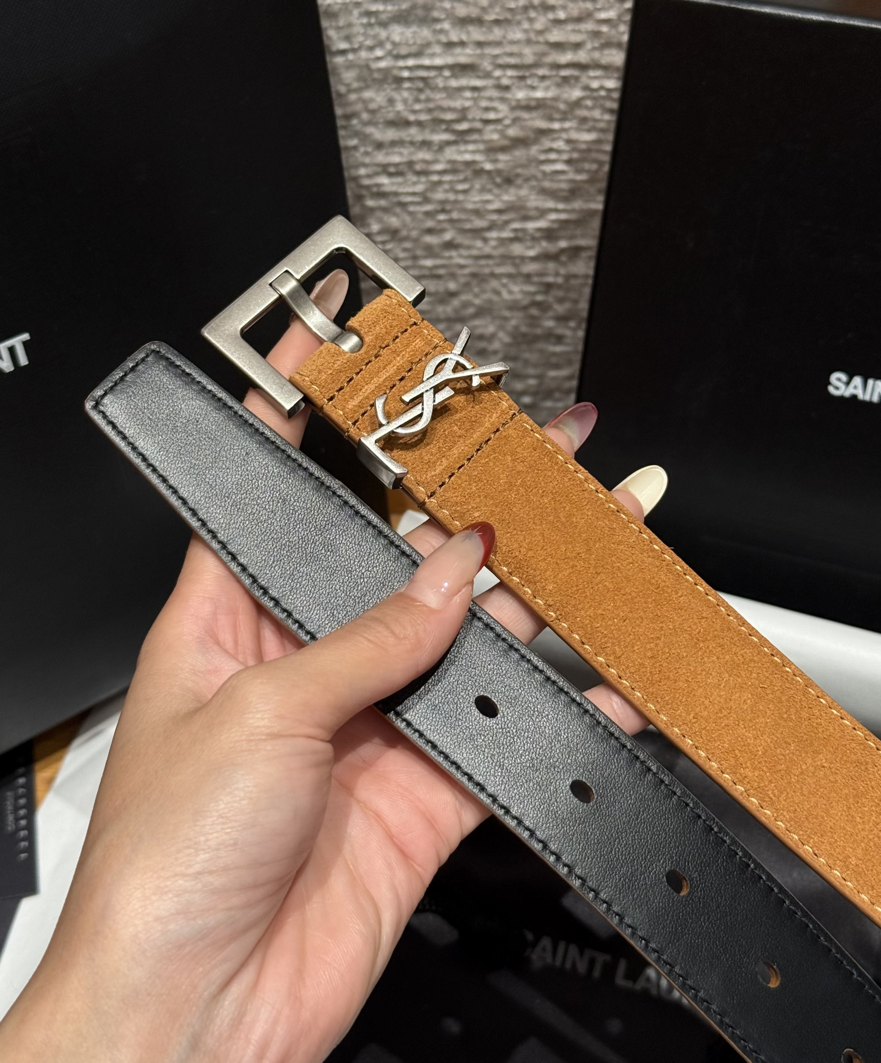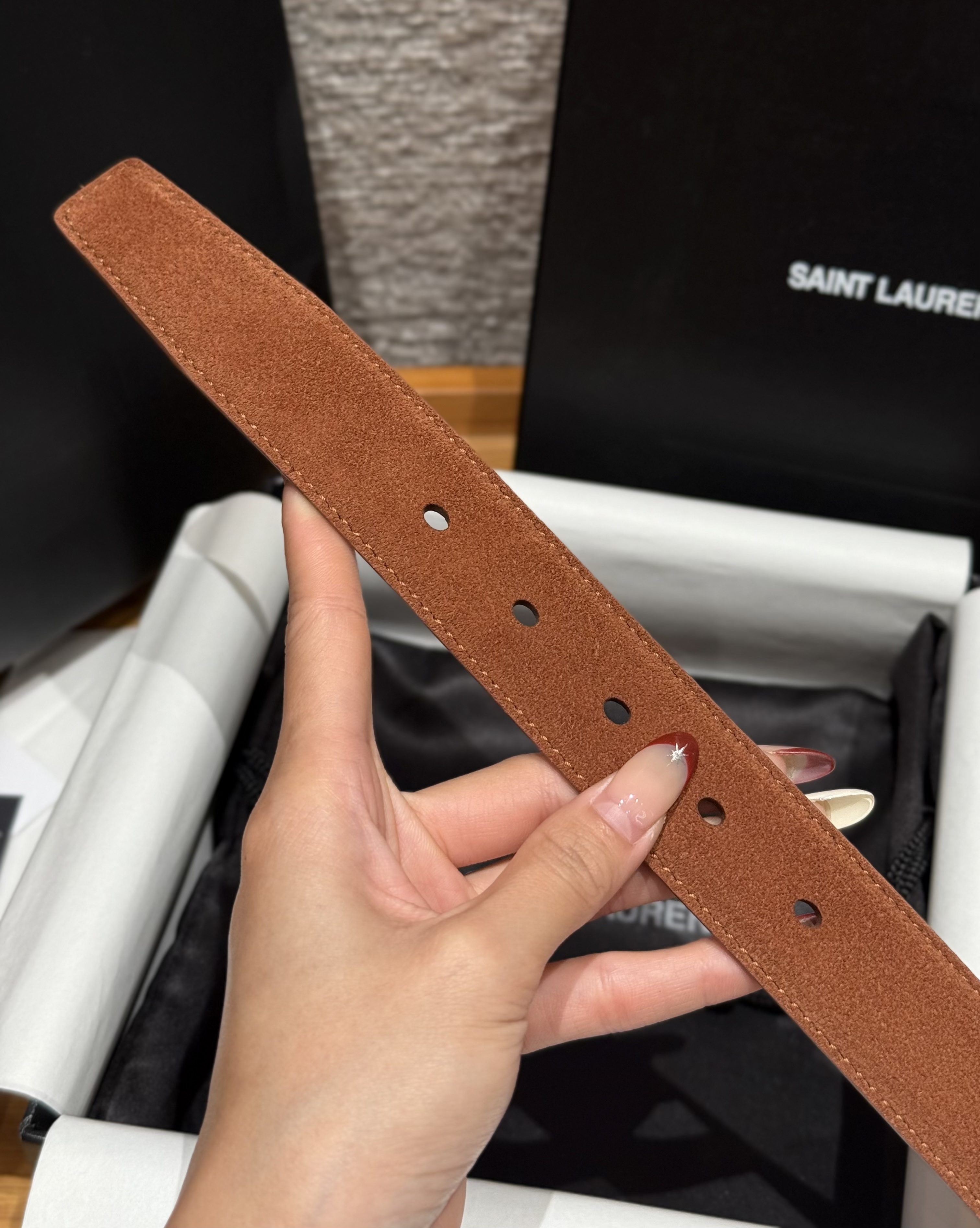 This Saint Laurent belt showcases the brand's exceptional craftsmanship and attention to detail. Crafted from premium suede, this piece combines timeless luxury with modern style.