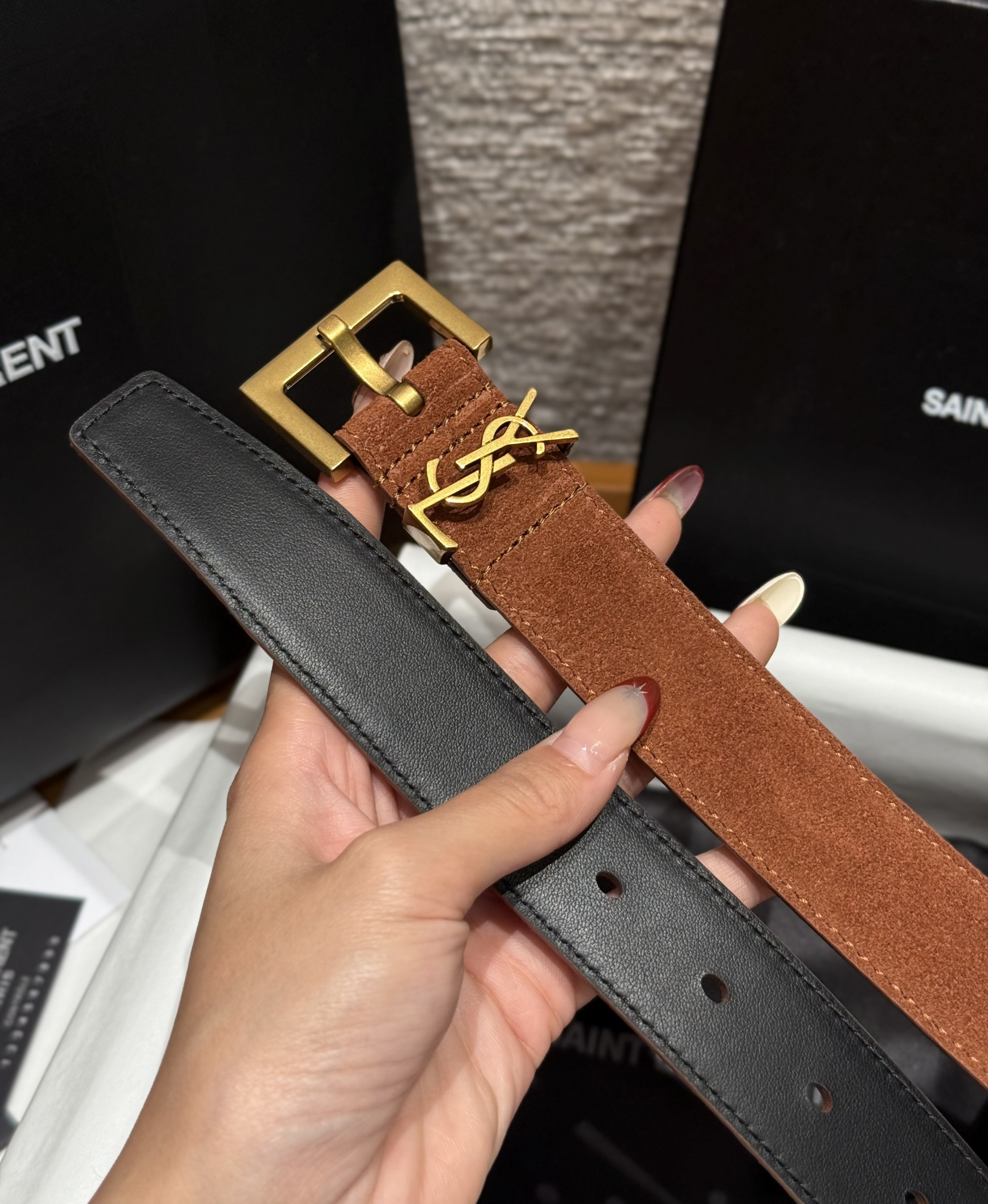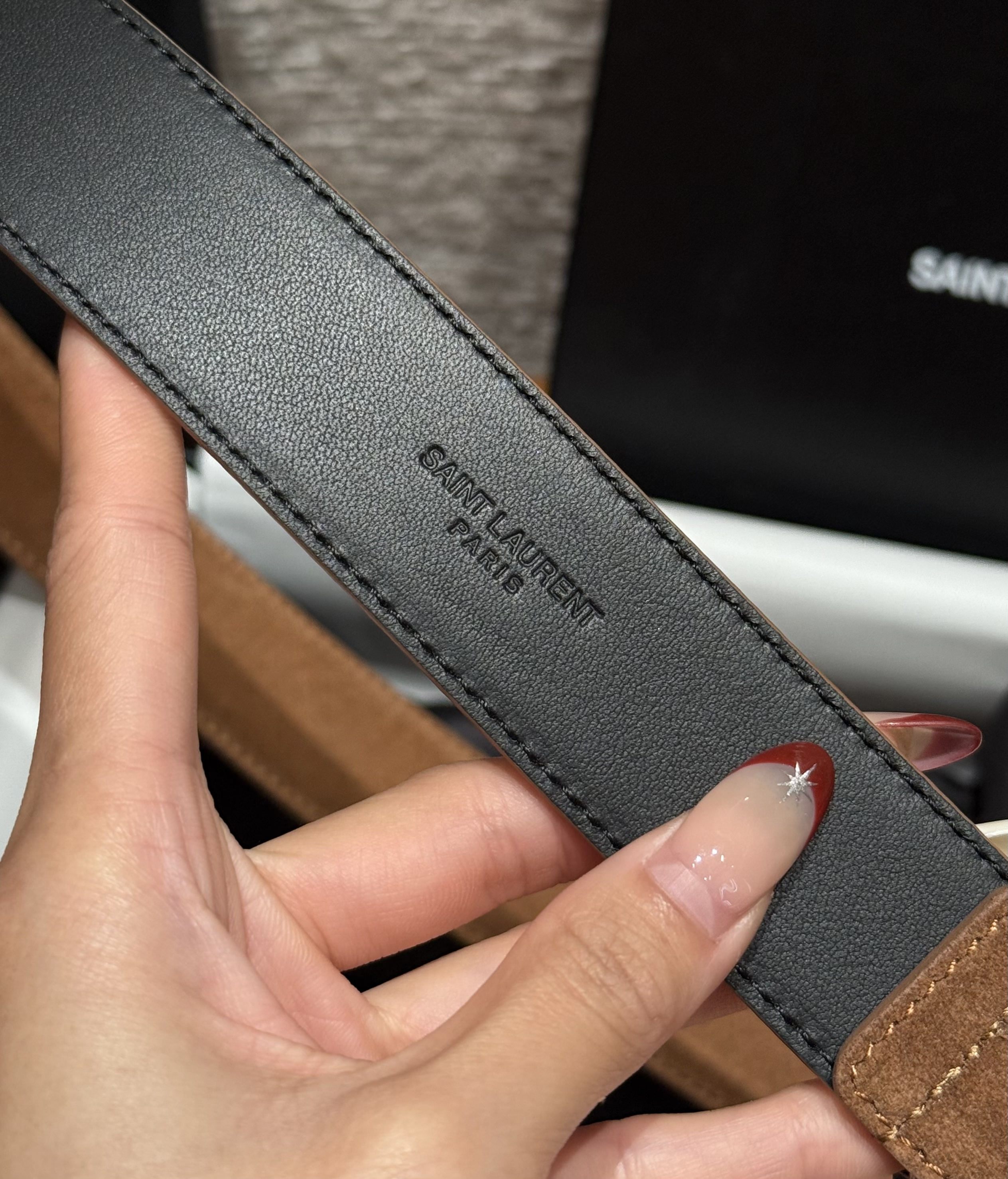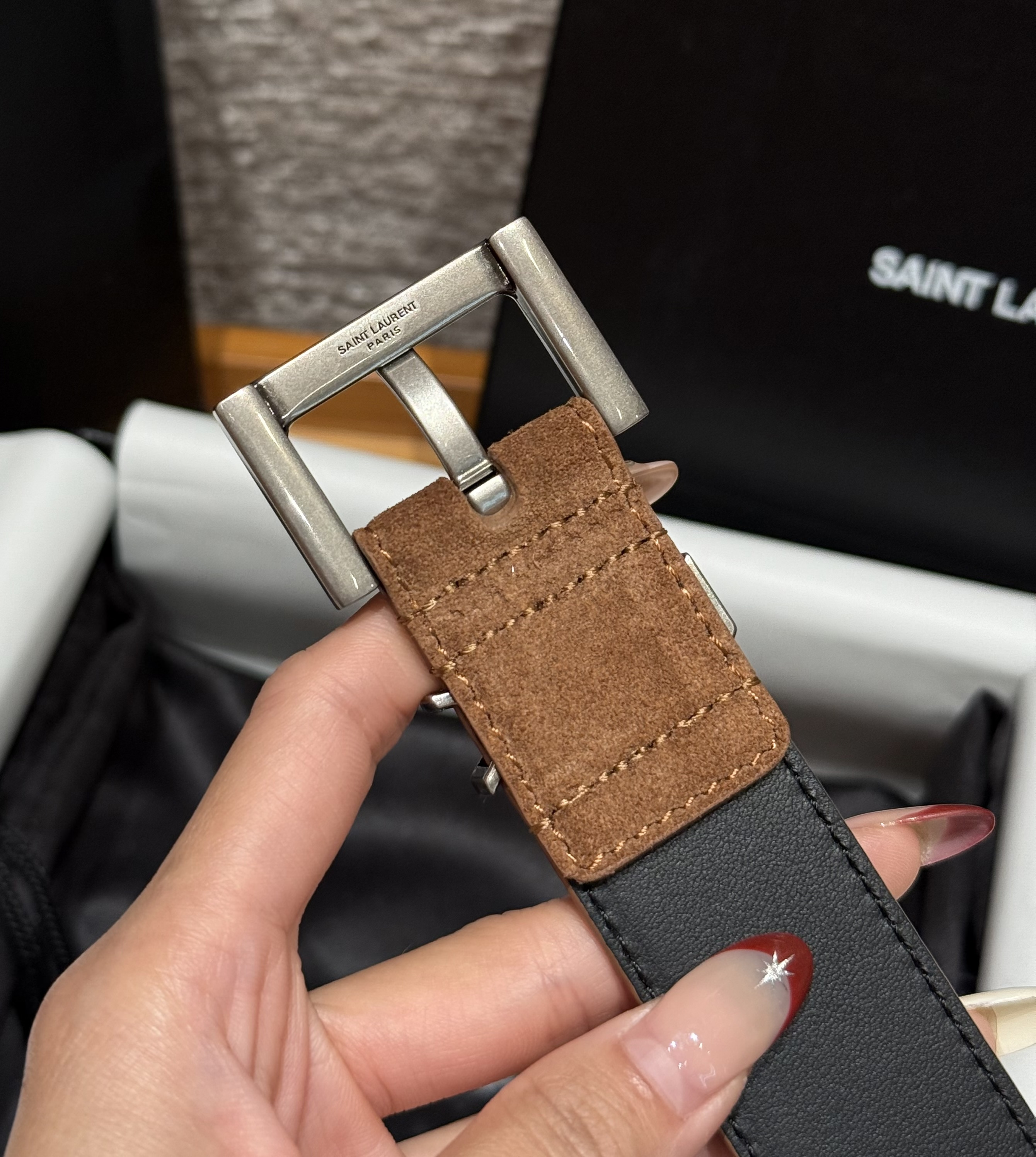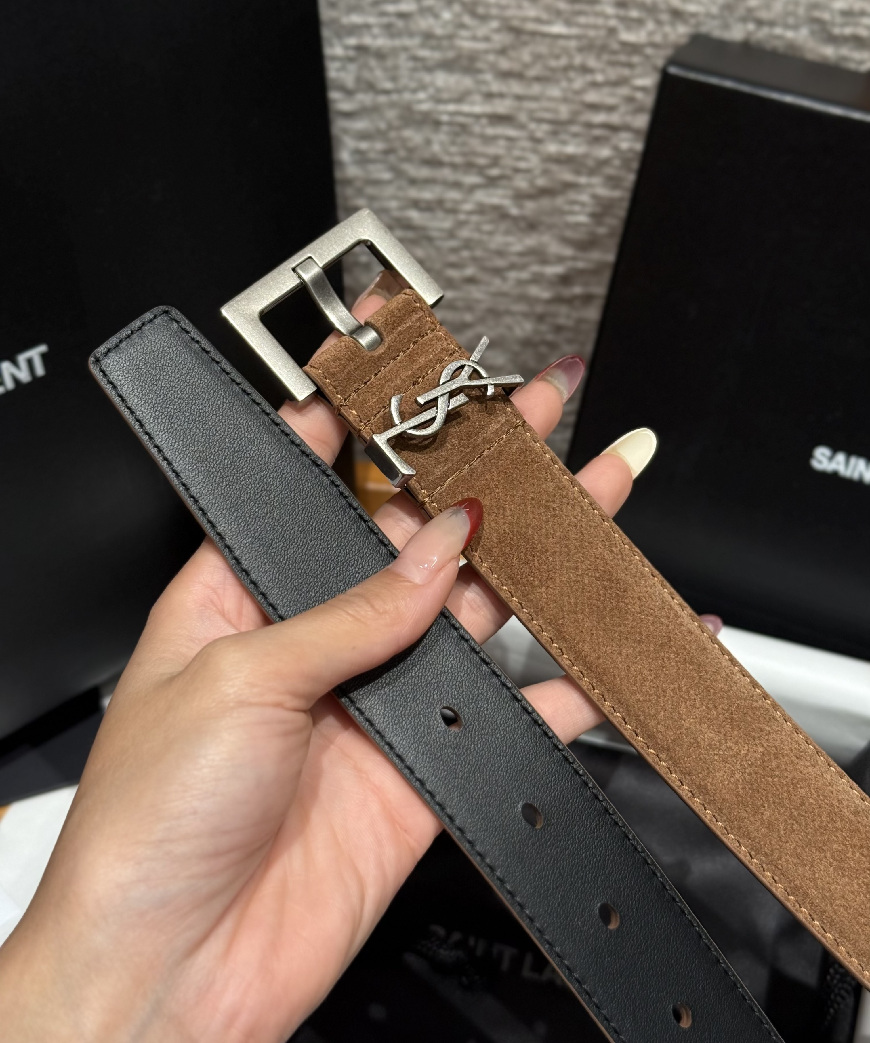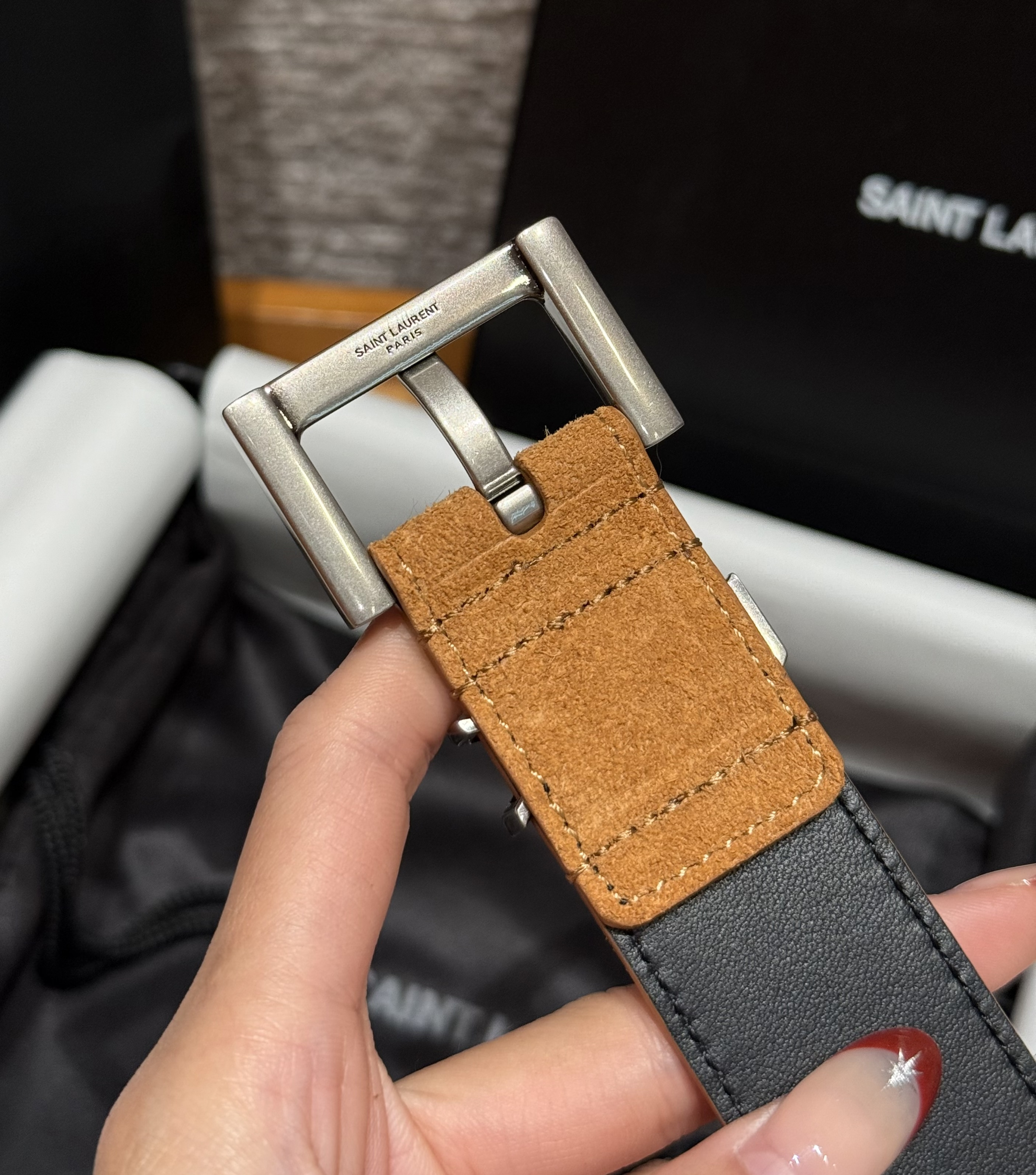 This Saint Laurent belt showcases the brand's exceptional craftsmanship and attention to detail. Crafted from premium suede, this piece combines timeless luxury with modern style.