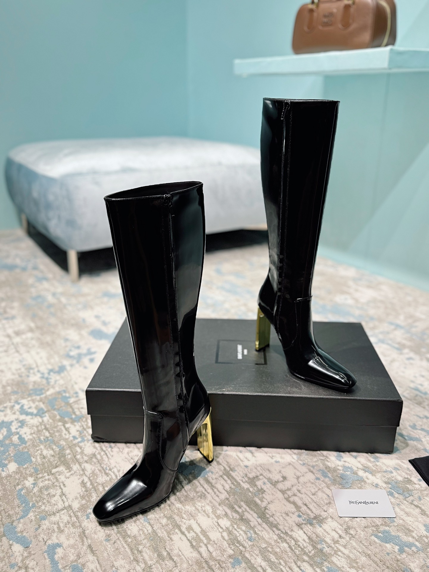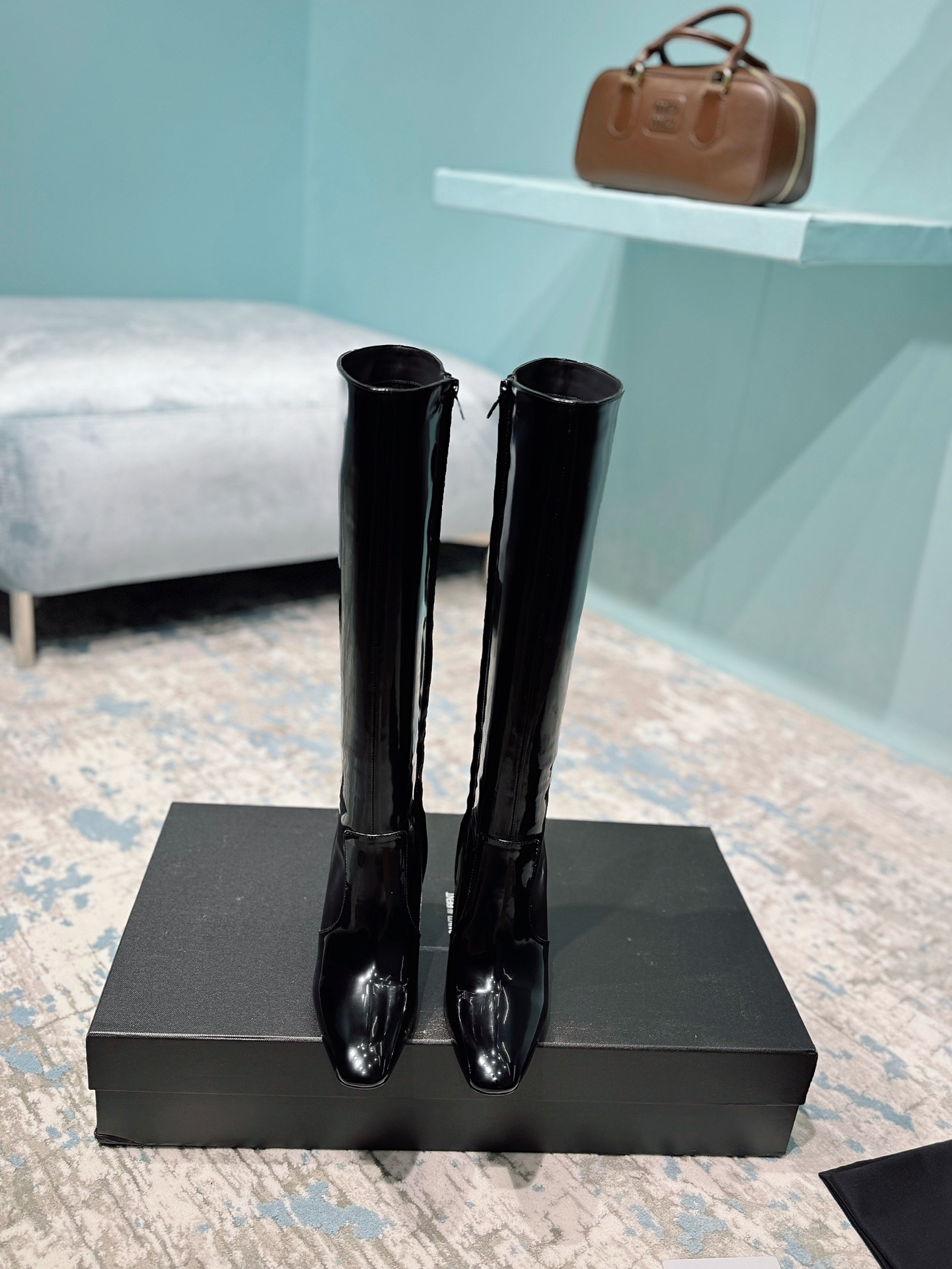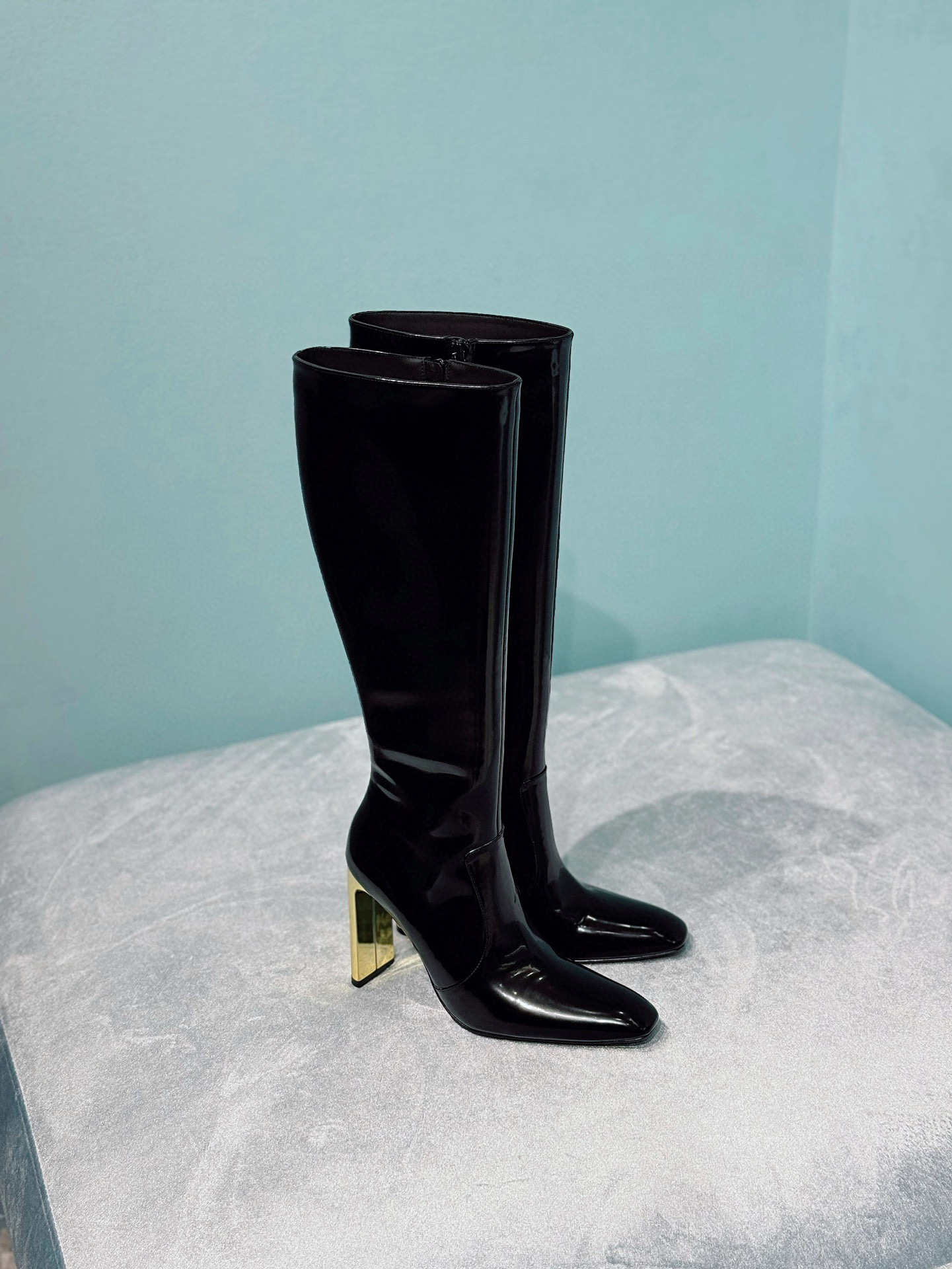 NIGO Saint Laurent Women's Autumn/Winter Leather Square Toe High Boots Solid Color Zipper Retro Chunky Heel High Heels Heel Height 11cm #nigo81491