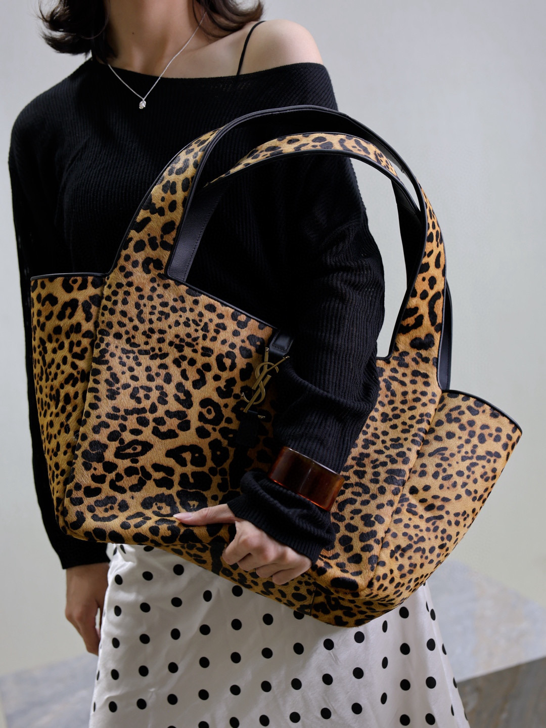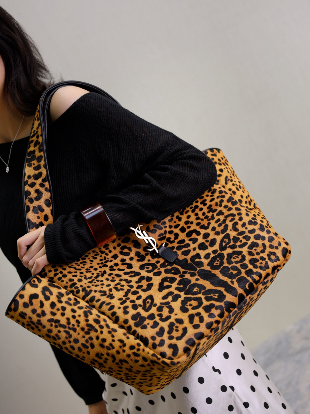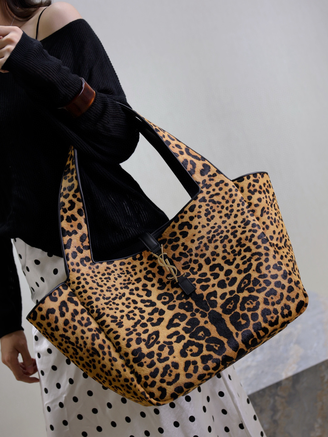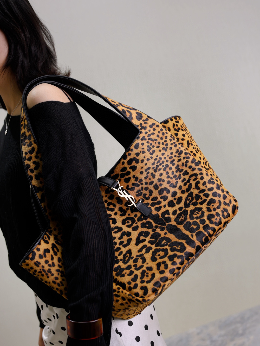 NIGO SAINT LAURENT Women's Leopard Print Design Pony Hair Patchwork Leather Tote Shoulder Bag Bags #nigo74968
