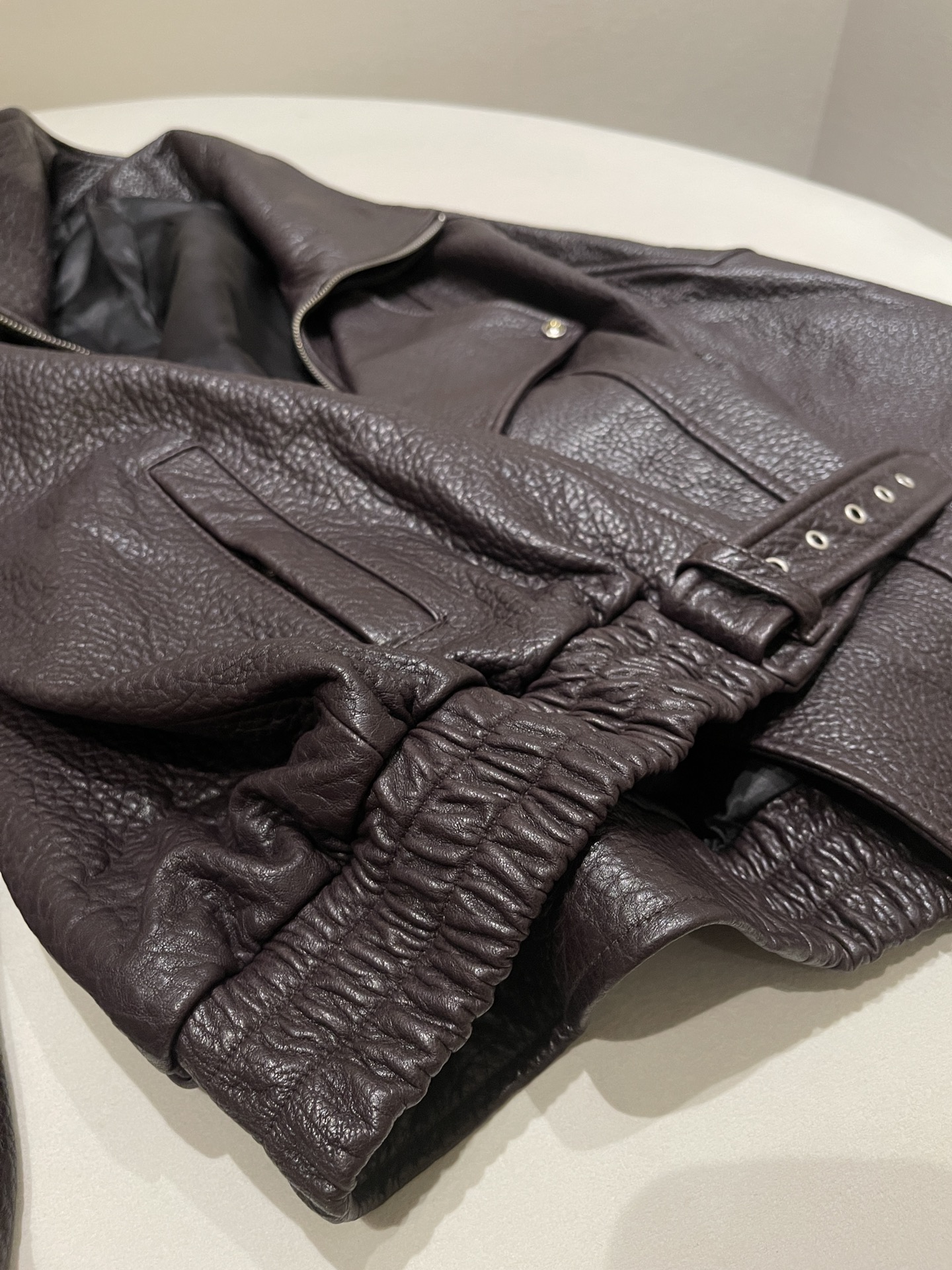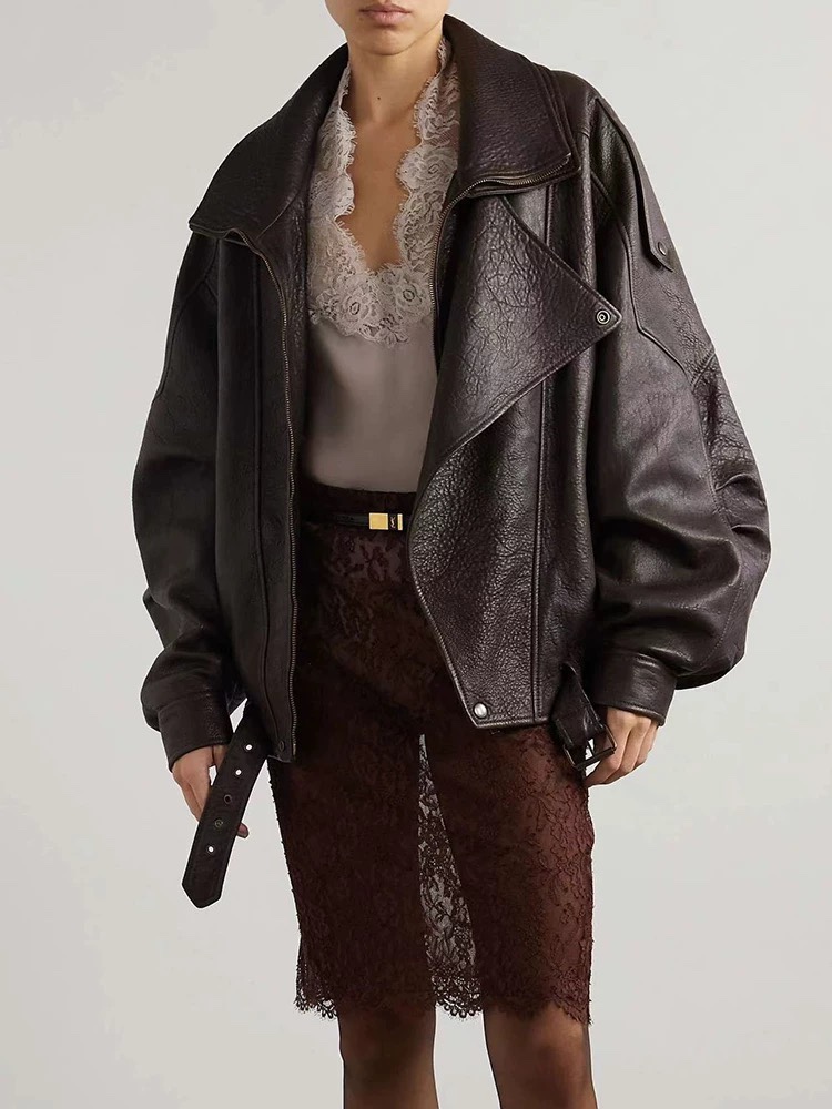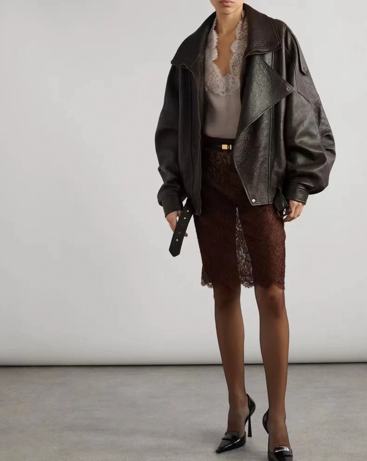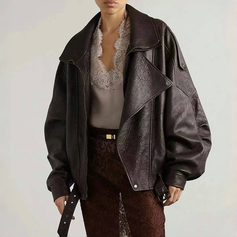 NIGO SAINT LAURENT Women's Spring, Autumn And Winter Retro Solid Color Lapel Zipper Long Sleeve Sheepskin Genuine Leather Motorcycle Jacket Ngvp #nigo9288