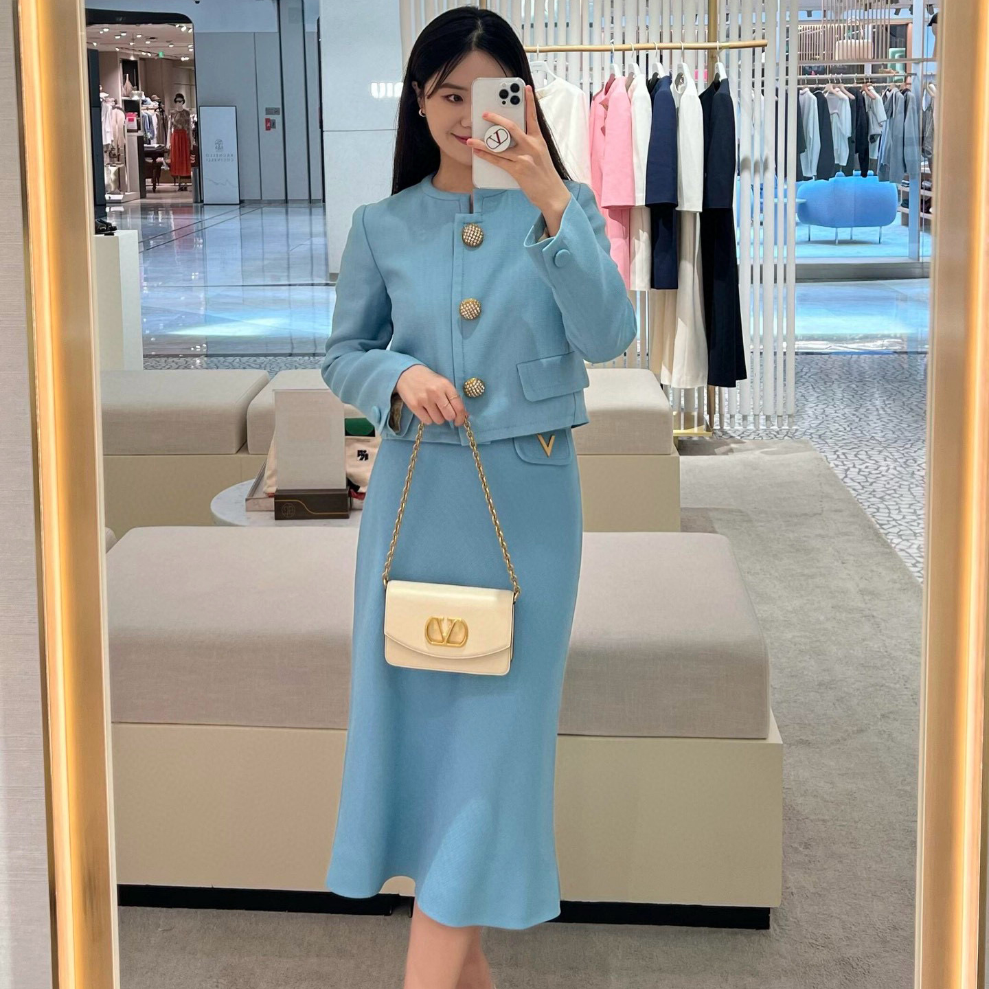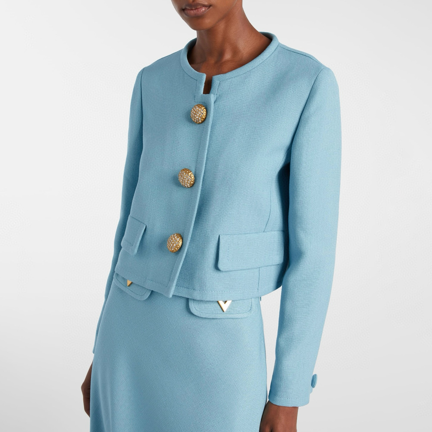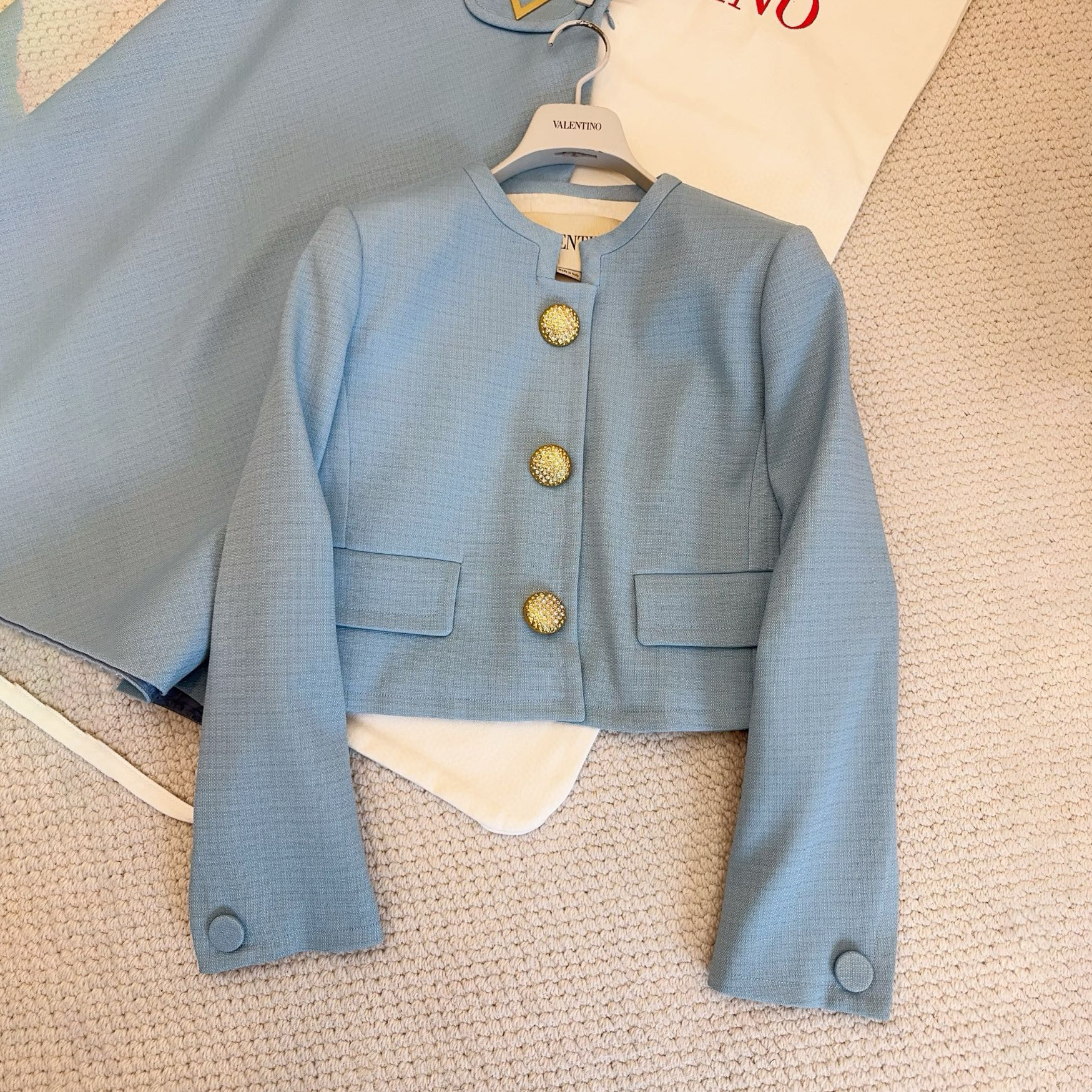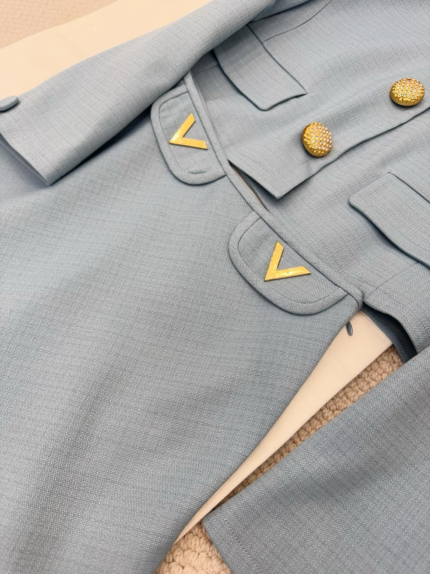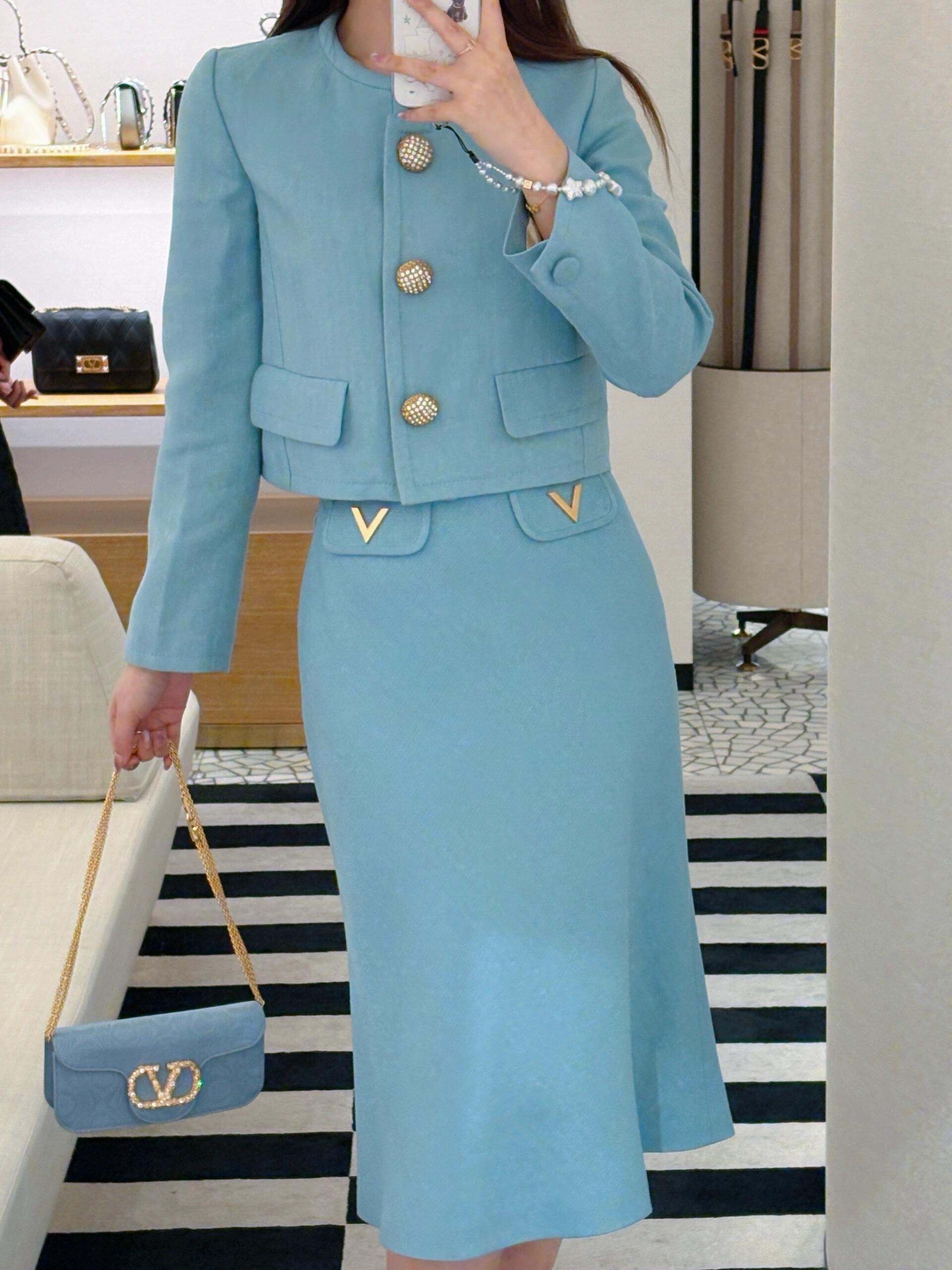 NIGO Valentino Women's Fall/winter Fashion Minimalist Classic Crew Neck Solid Color Single Button Short Jacket Classic Minimalist V-shaped Button Design Skirt Suit Set #nigo79194