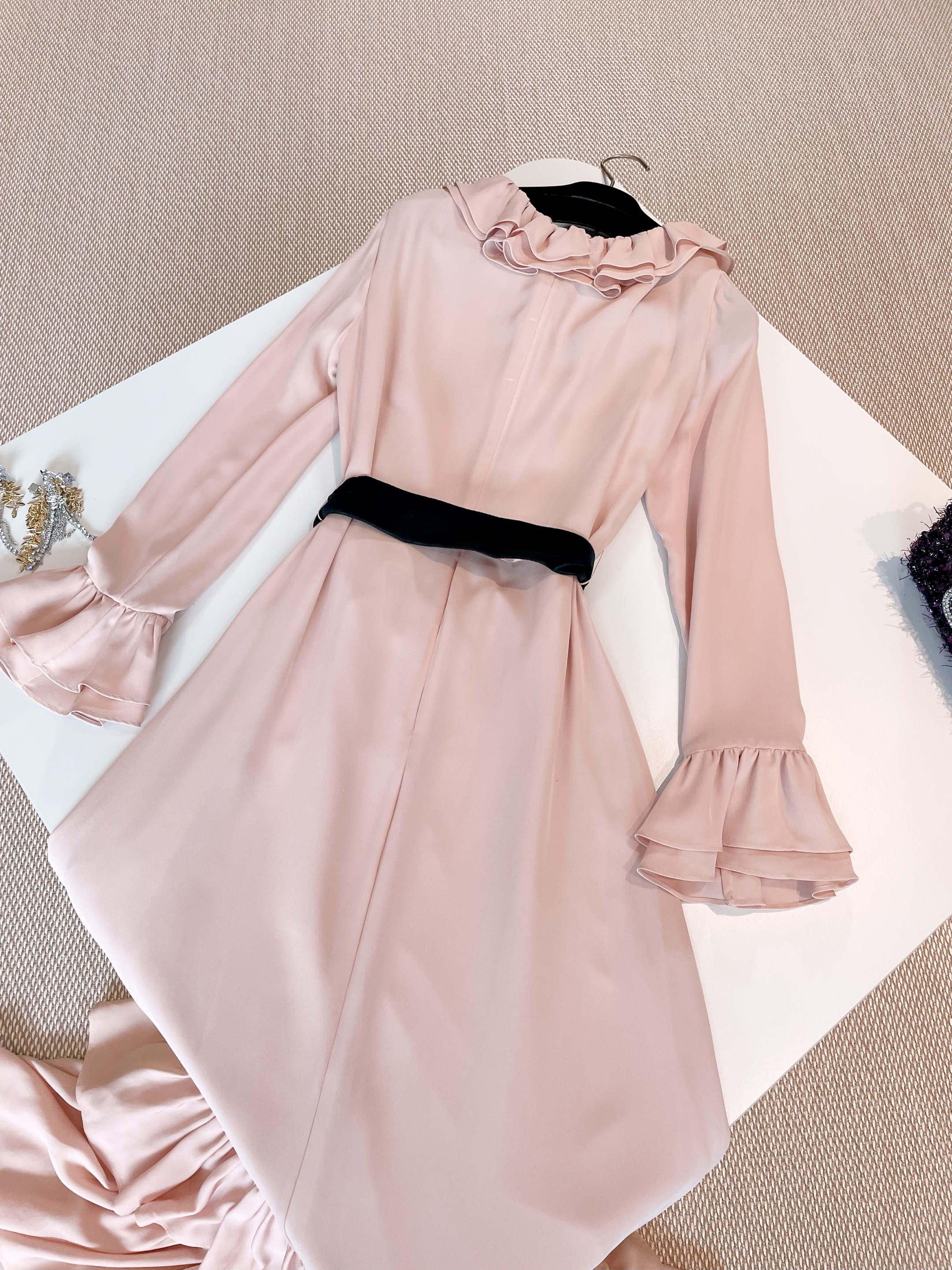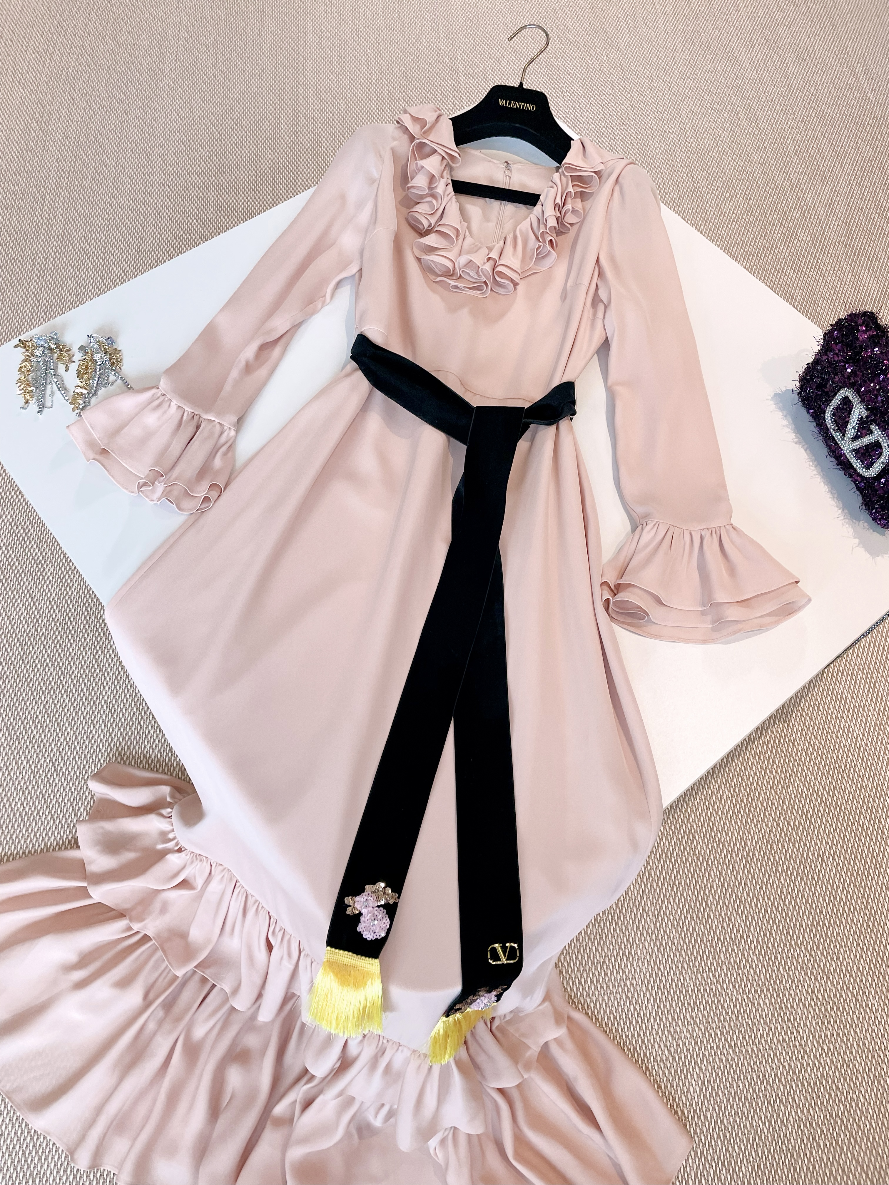 NIGO Valentino Women's Spring And Autumn Tassel Belt V-Neck Pleated Side Long Silk Solid Color Dresses Ngvp #nigo1252